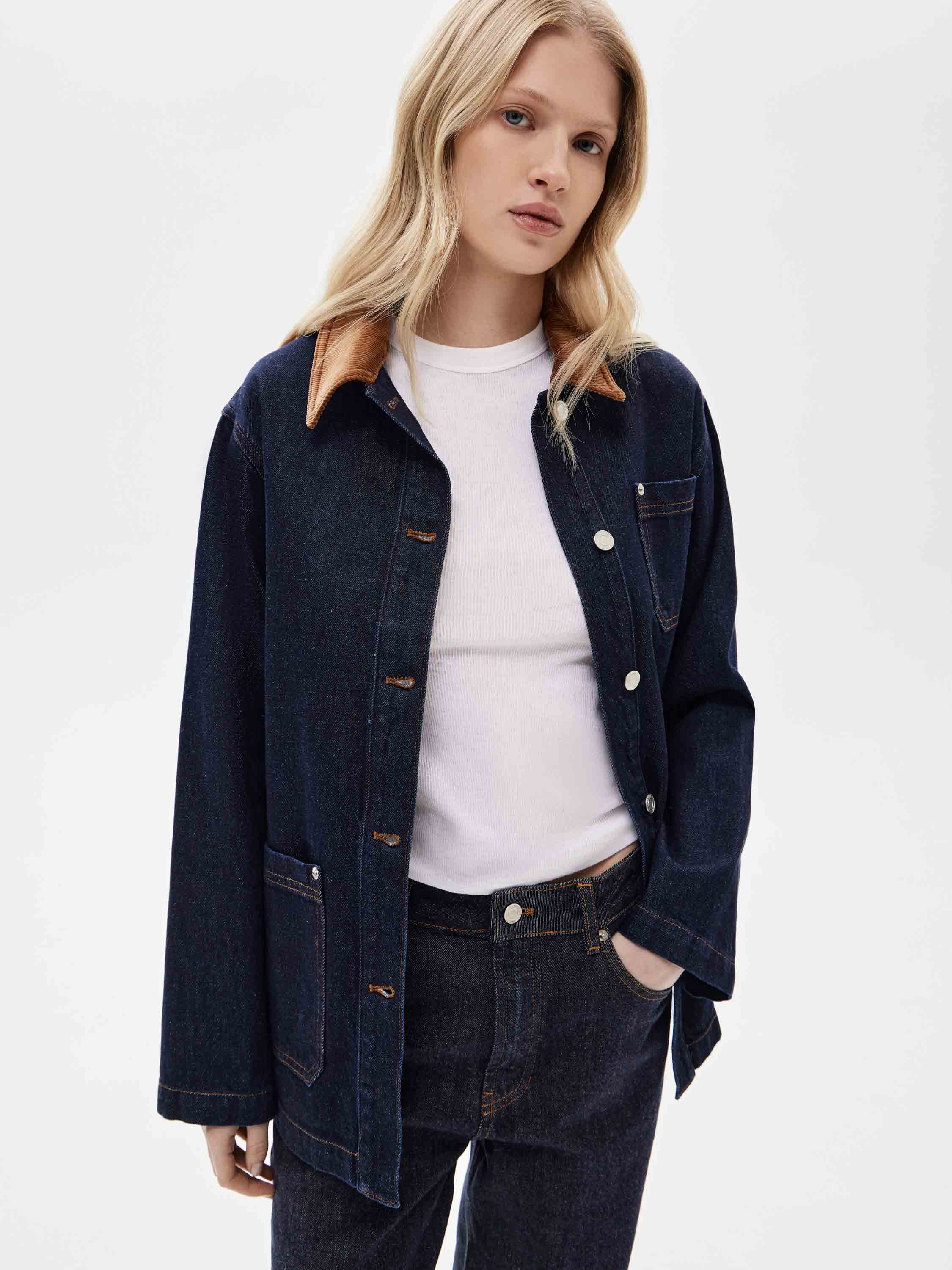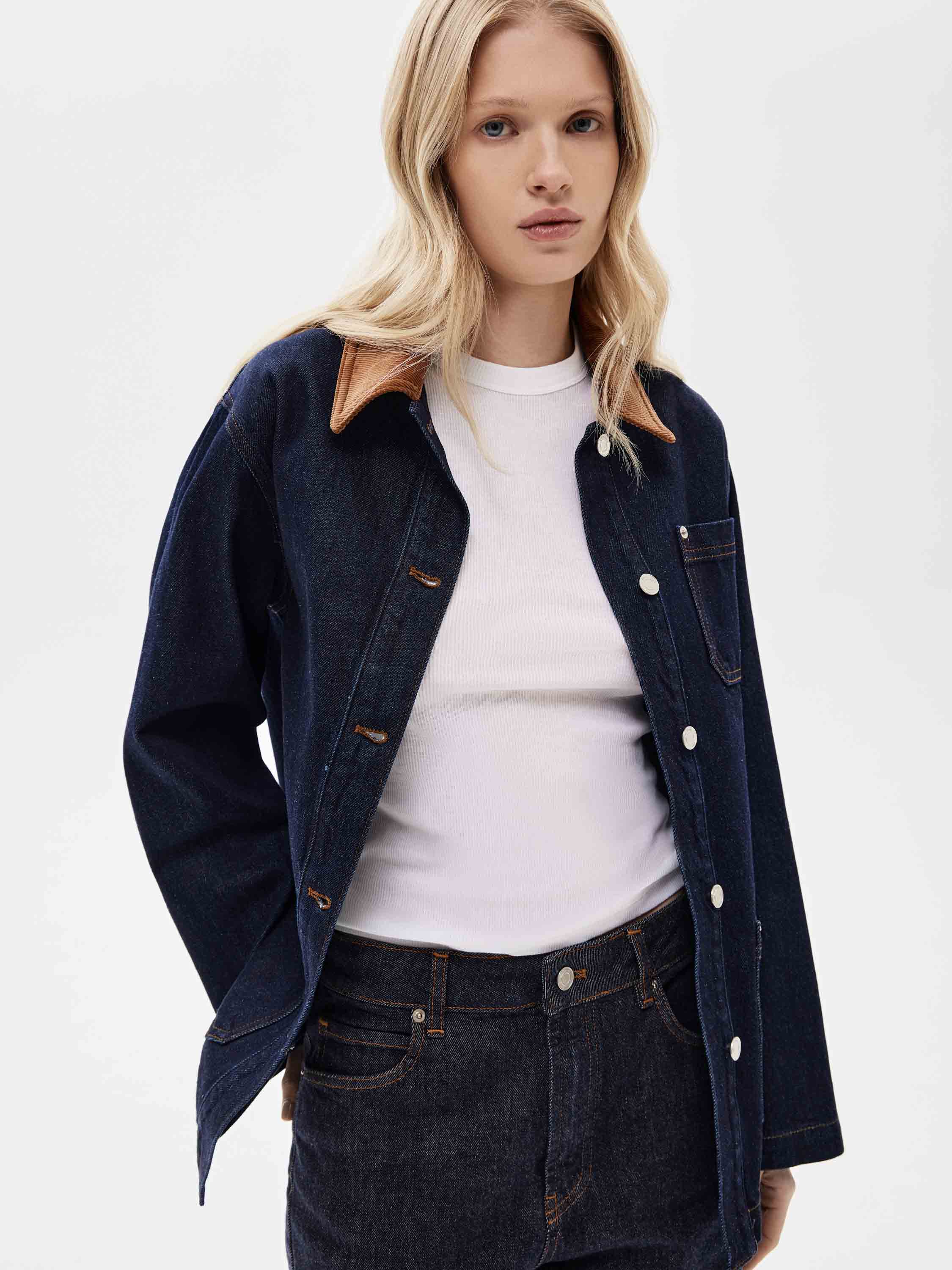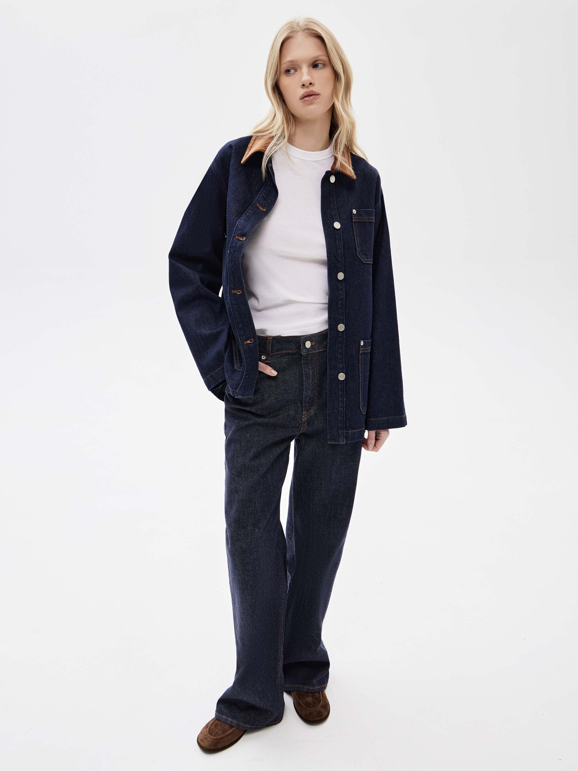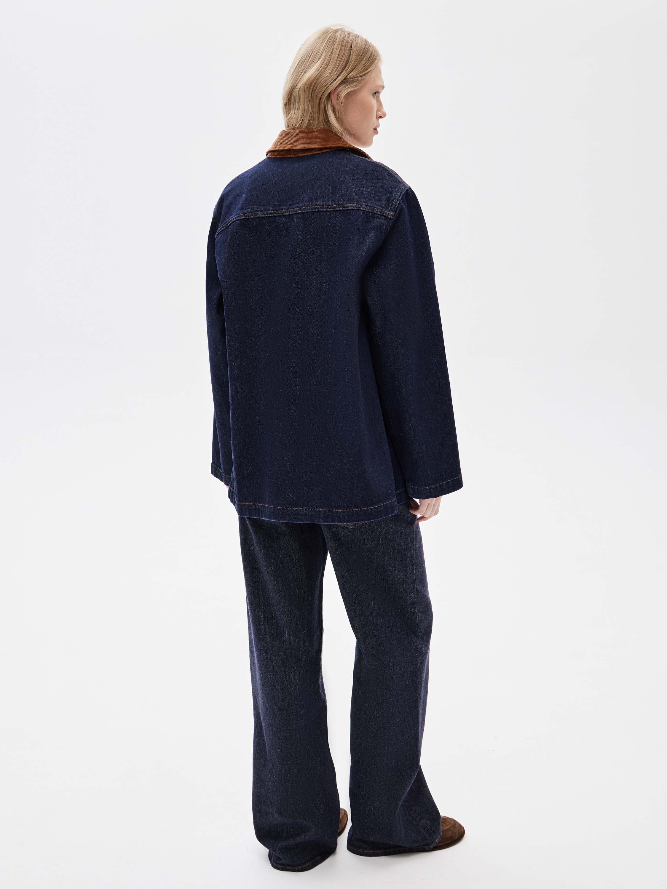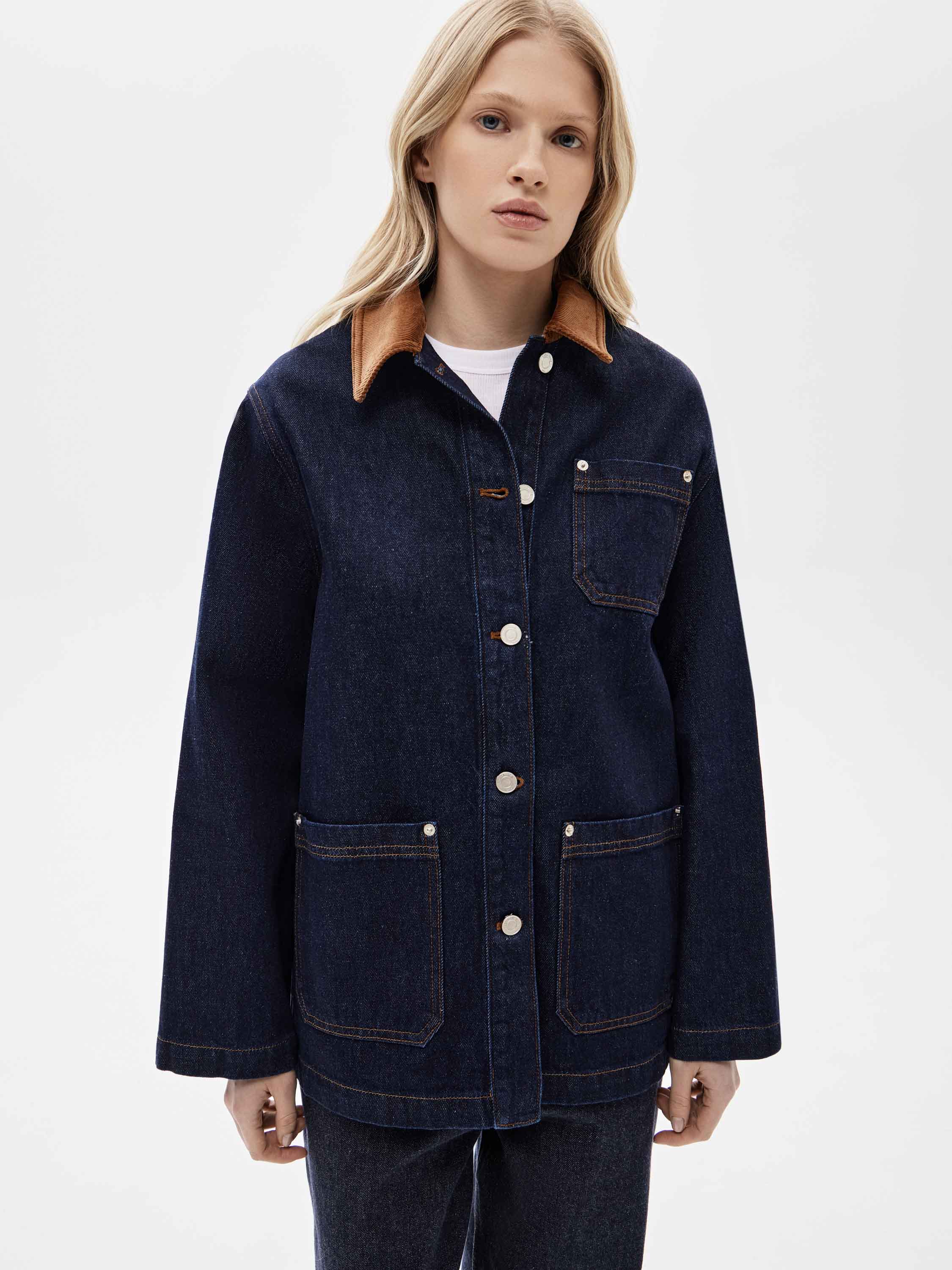 Жакет выполнен из плотного хлопкового денима в глубоком цвете индиго с четкой, устойчивой структурой, рассчитанной на активное повседневное ношение. Материал комфортен при движении и хорошо сохраняет форму. Силуэт прямой, удлиненный, без приталивания и избыточного объема. Крой рубашечного типа с отложным воротником и центральной застежкой на пуговицы задает сдержанный характер модели. Накладные карманы спереди усиливают функциональность и поддерживают сдержанную и функциональную эстетику. Жакет сочетается с денимом, брюками из костюмных тканей, базовыми топами и трикотажем, органично вписываясь в продуманный повседневный гардероб.
