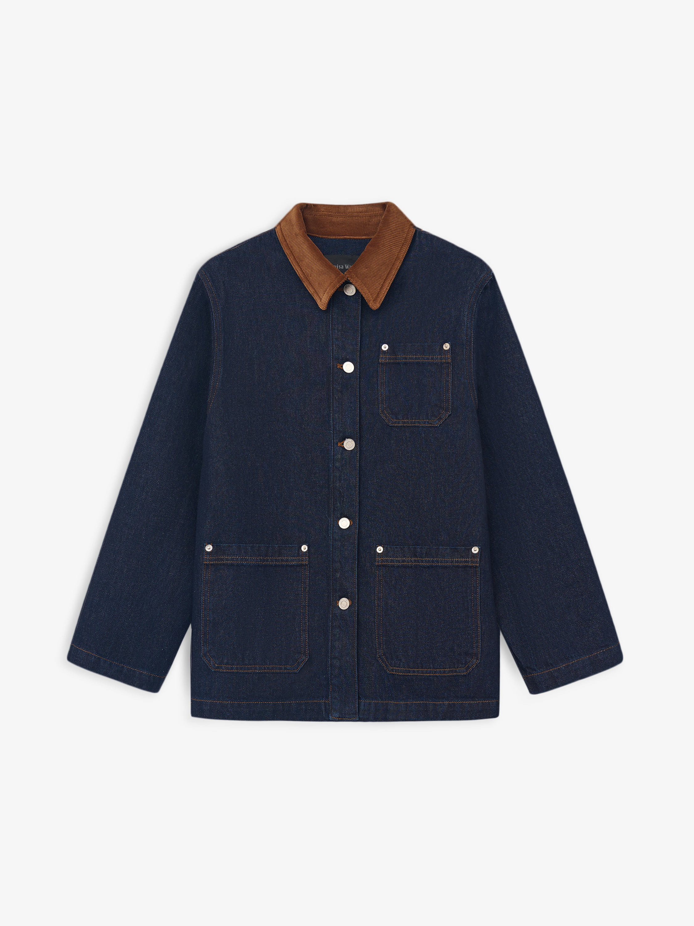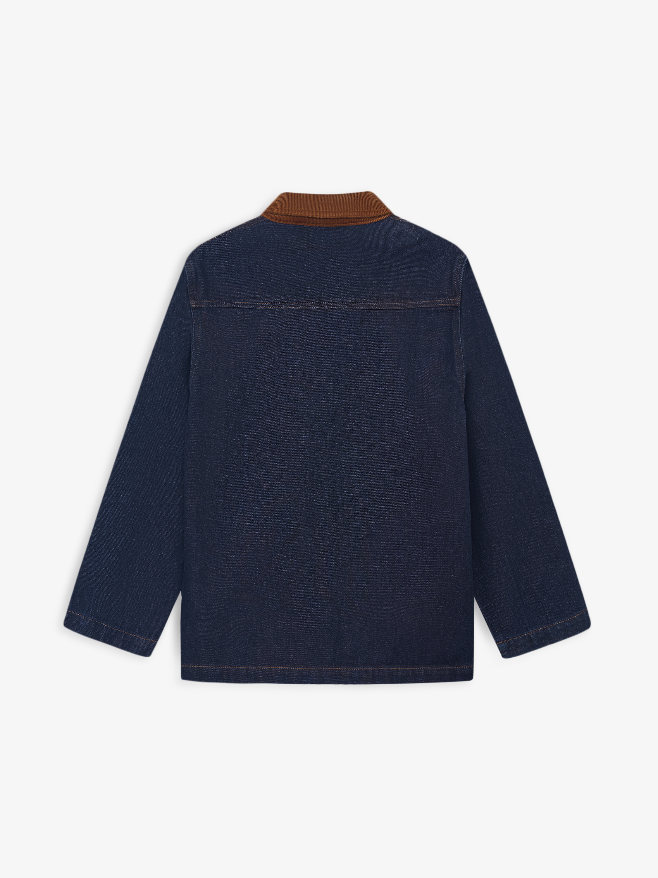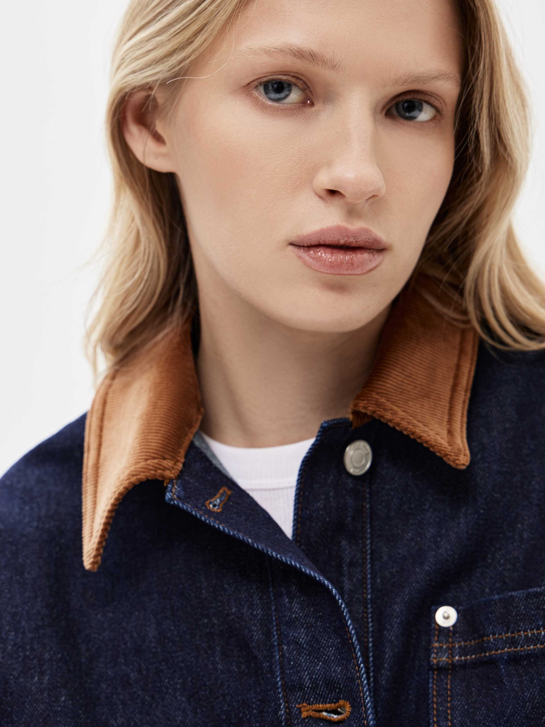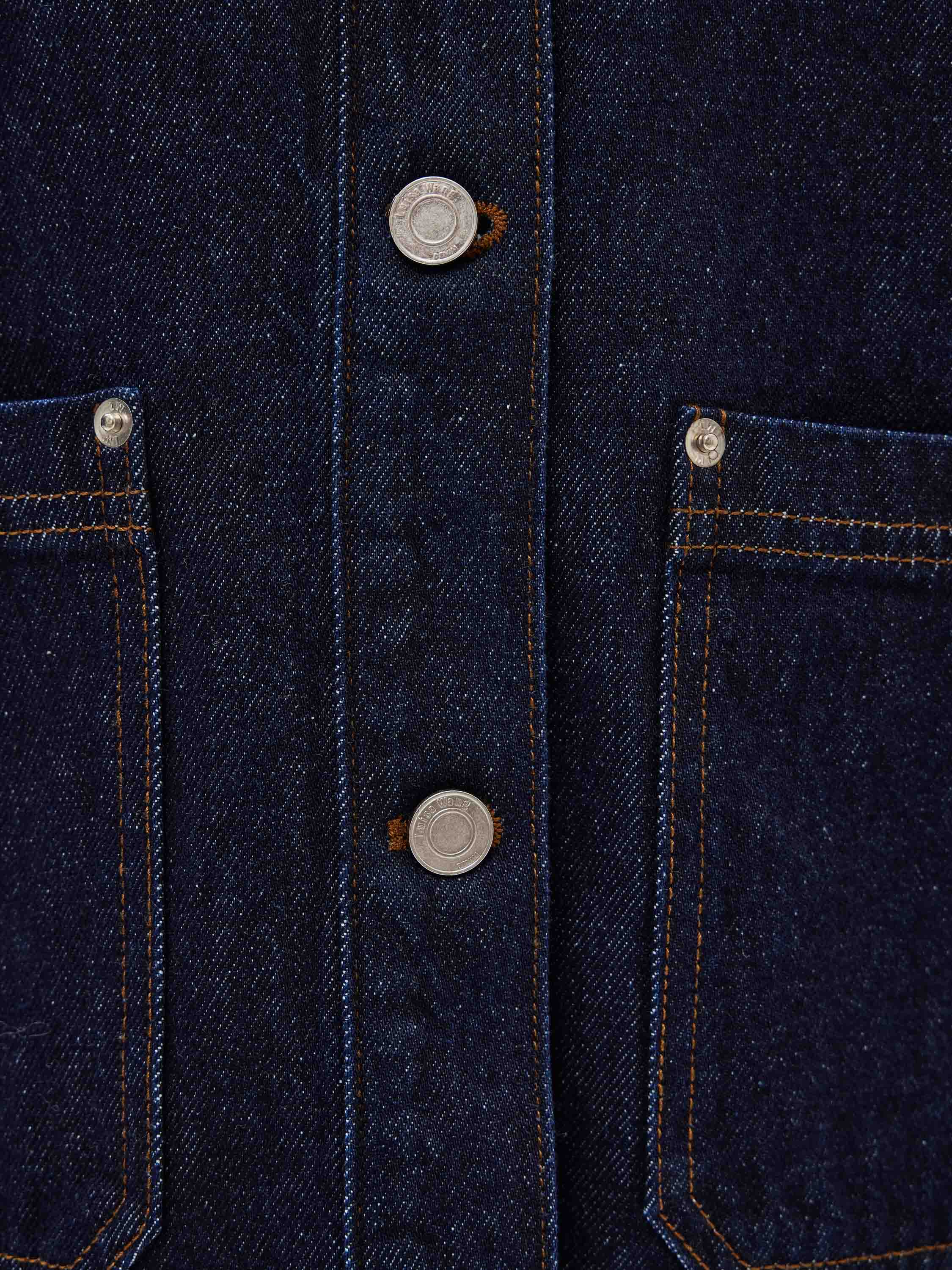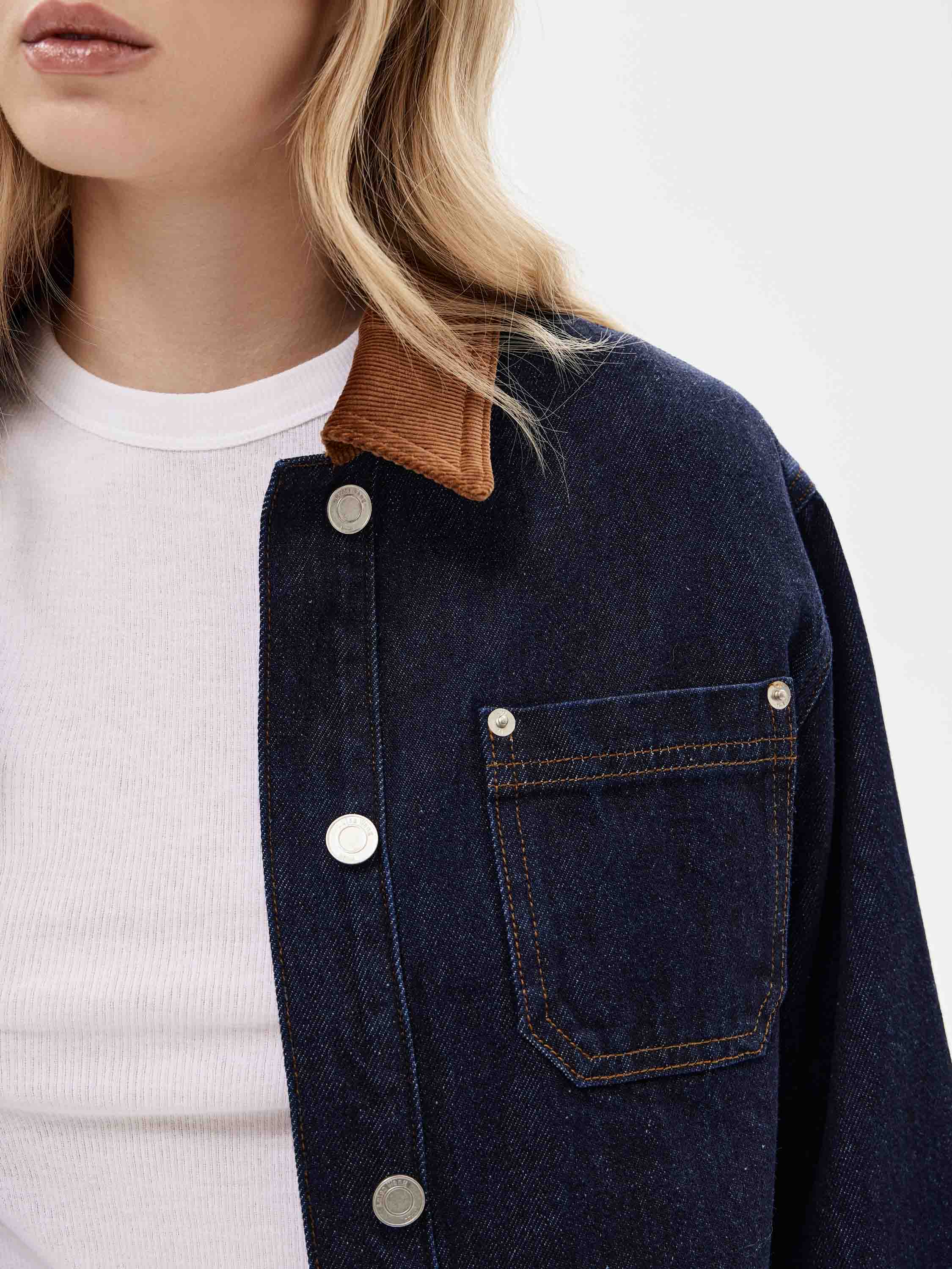 Жакет выполнен из плотного хлопкового денима в глубоком цвете индиго с четкой, устойчивой структурой, рассчитанной на активное повседневное ношение. Материал комфортен при движении и хорошо сохраняет форму. Силуэт прямой, удлиненный, без приталивания и избыточного объема. Крой рубашечного типа с отложным воротником и центральной застежкой на пуговицы задает сдержанный характер модели. Накладные карманы спереди усиливают функциональность и поддерживают сдержанную и функциональную эстетику. Жакет сочетается с денимом, брюками из костюмных тканей, базовыми топами и трикотажем, органично вписываясь в продуманный повседневный гардероб.