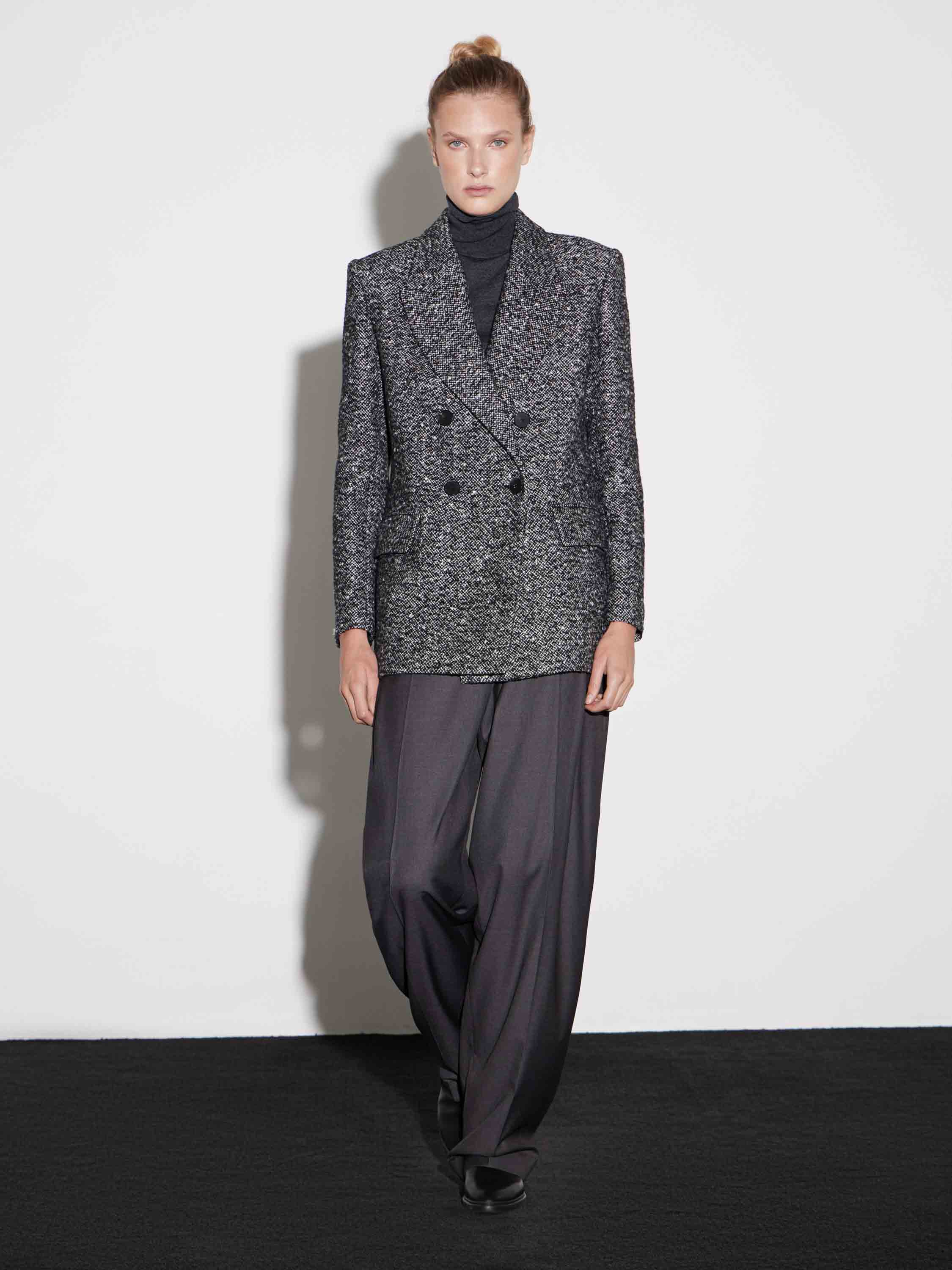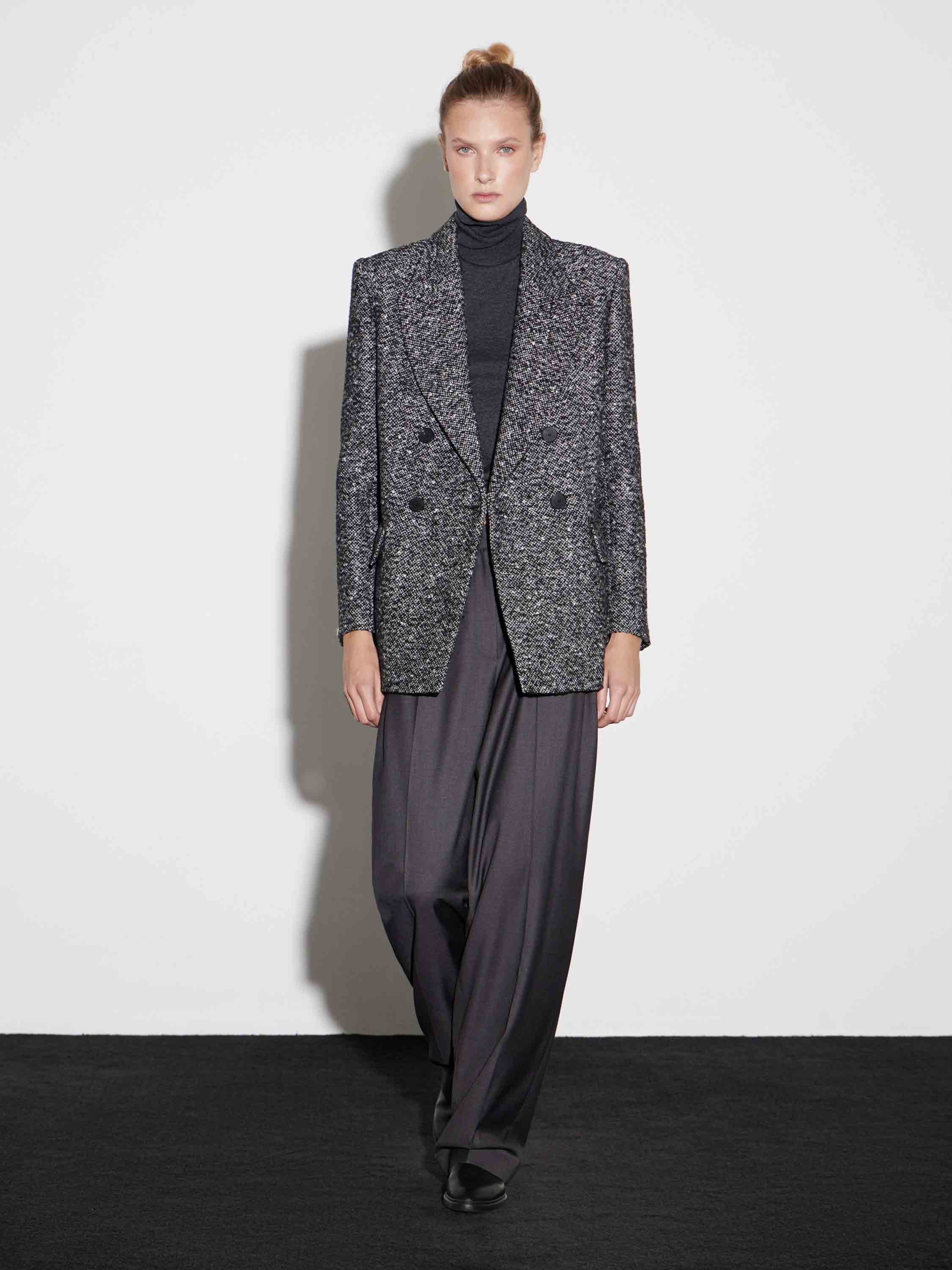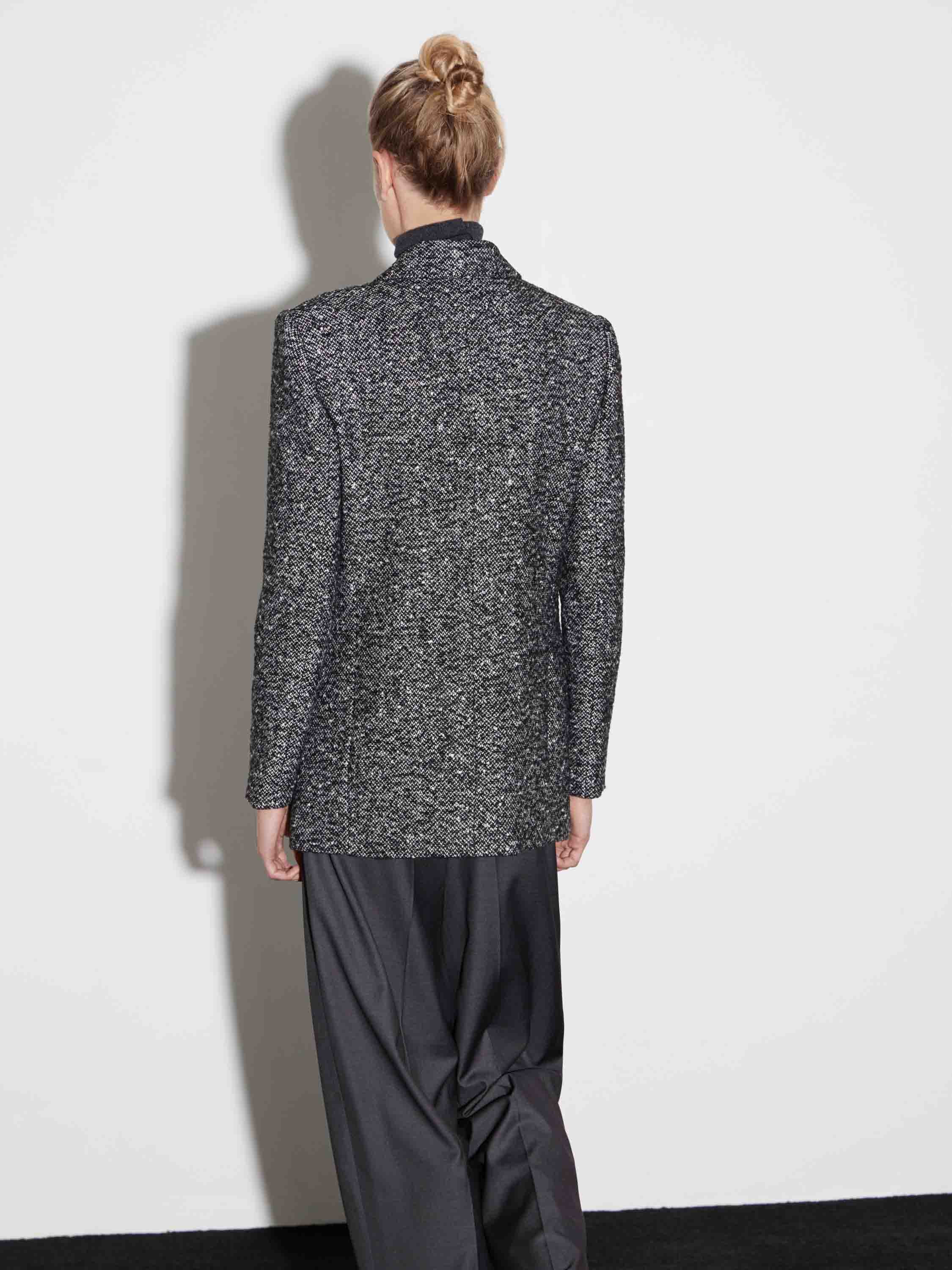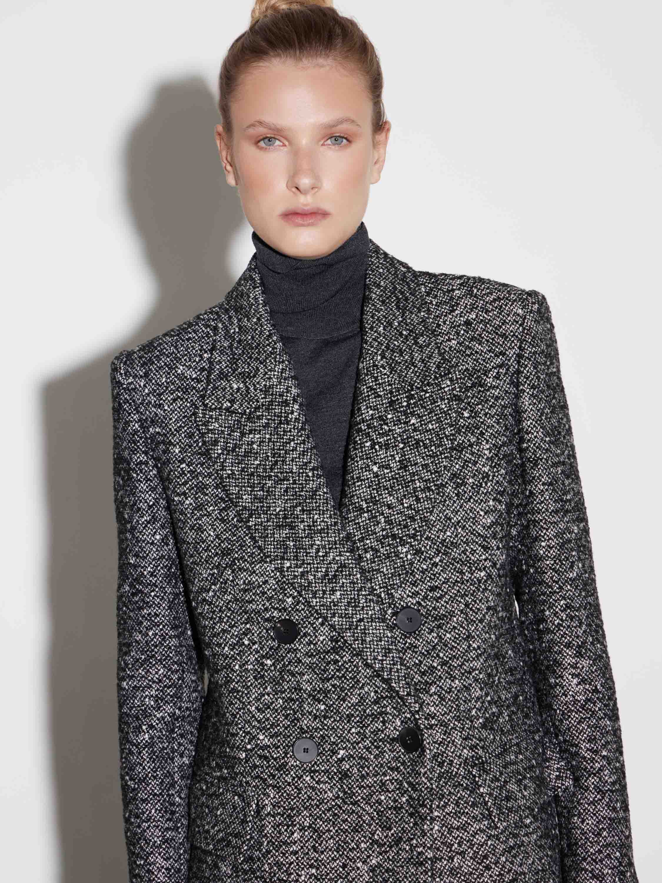 Жакет из твидового полотна с добавлением шерсти выполнен в удлиненном силуэте с двойной застежкой. Материал плотный, фактурный, с меланжевым рисунком, который добавляет глубины и делает модель визуально насыщенной. Линия плеч структурирована, что формирует четкий силуэт и поддерживает вертикаль. Классические лацканы оформлены аккуратно, карманы с клапанами уравновешивают нижнюю часть. Посадка прямая, без излишнего объема, позволяет сочетать жакет с тонким трикотажем и широкими брюками. Модель подходит для собранных повседневных образов и формальных комплектов.