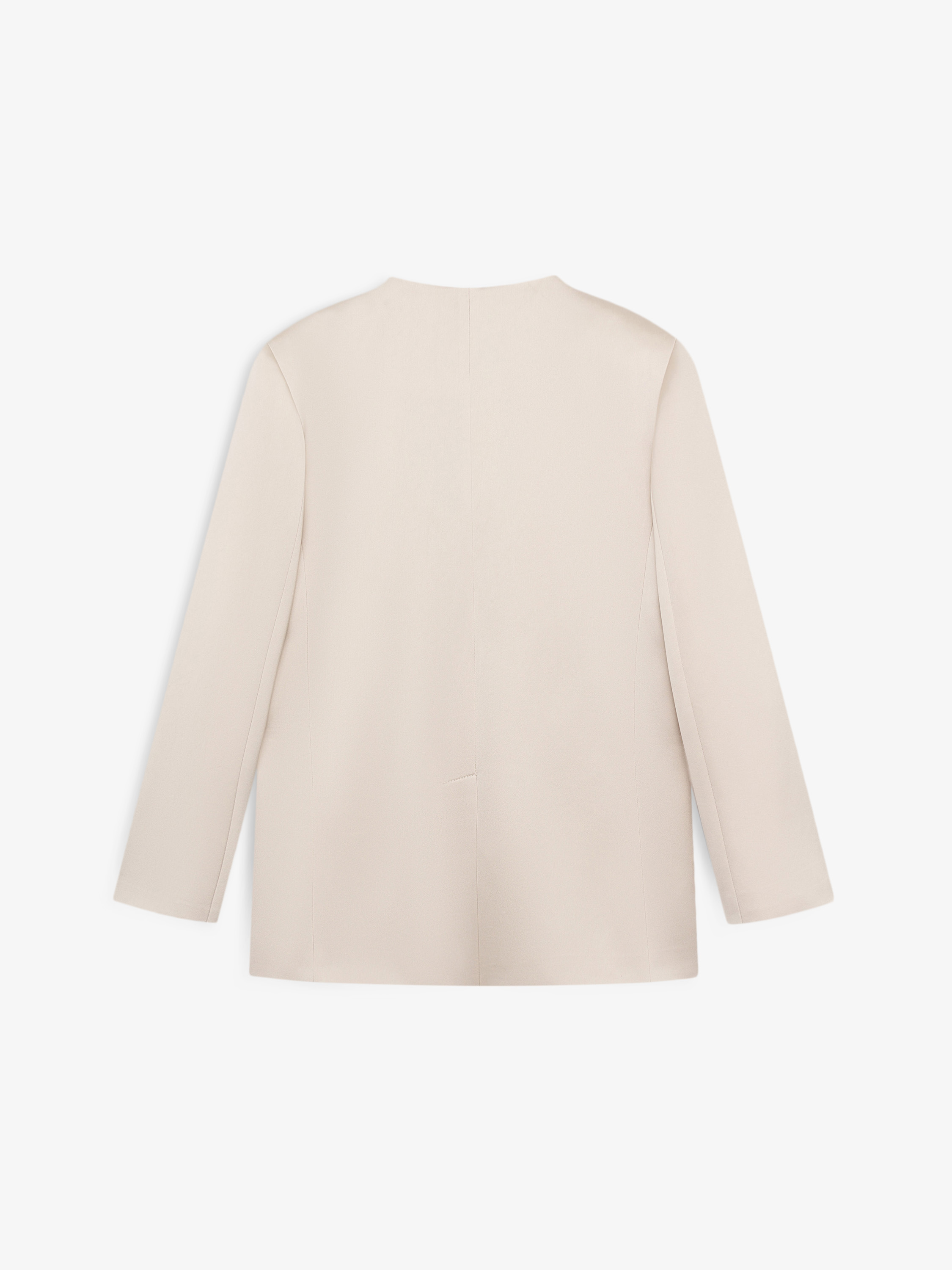 Жакет прямого силуэта с мягкой посадкой и четко оформленной линией плеча. Конструкция облегченная: глубокий V-образный вырез без воротника, асимметричная линия запаха фиксируется тонкими завязками на талии, за счет чего формируется аккуратный объем и сохраняется четкость силуэта. Рукава длинные, прямые, без лишнего объема. Карманы прорезные, интегрированы в конструкцию и не утяжеляют форму. Смесовый материал на основе ацетата отличается гладкой поверхностью и легкой пластикой, держит форму и сохраняет чистоту линий. Светлый оттенок делает модель универсальной и легко сочетаемой с базовым гардеробом.
