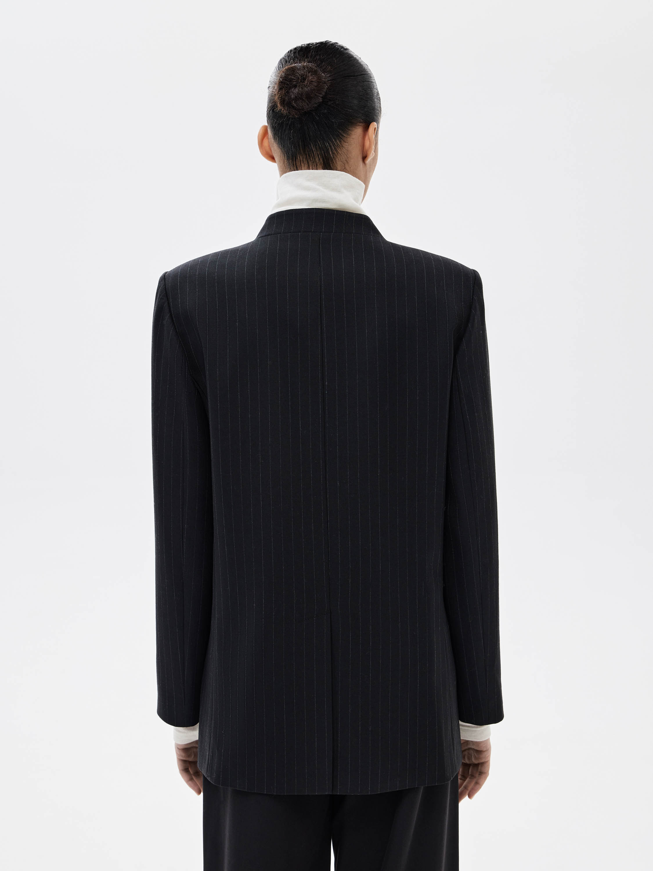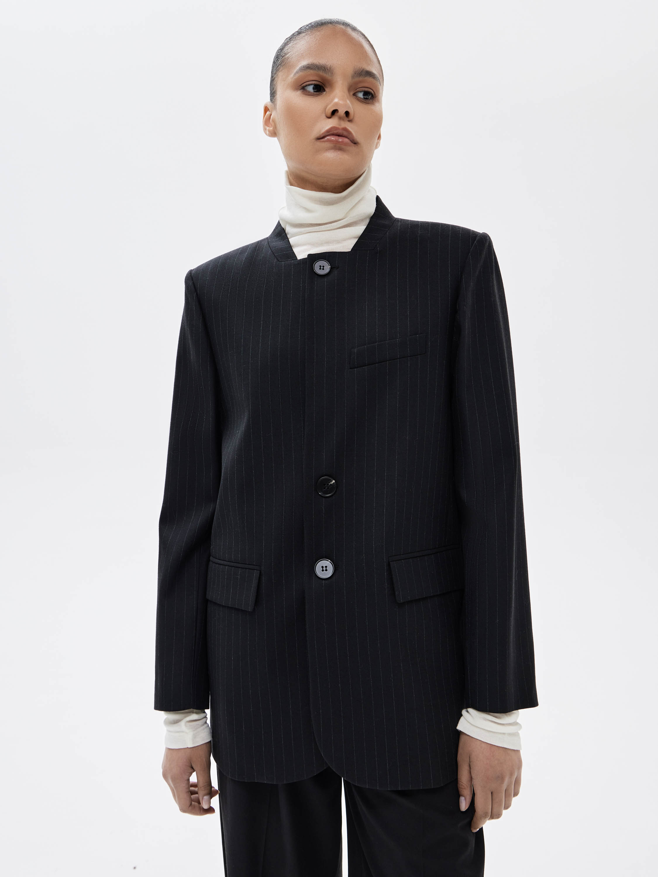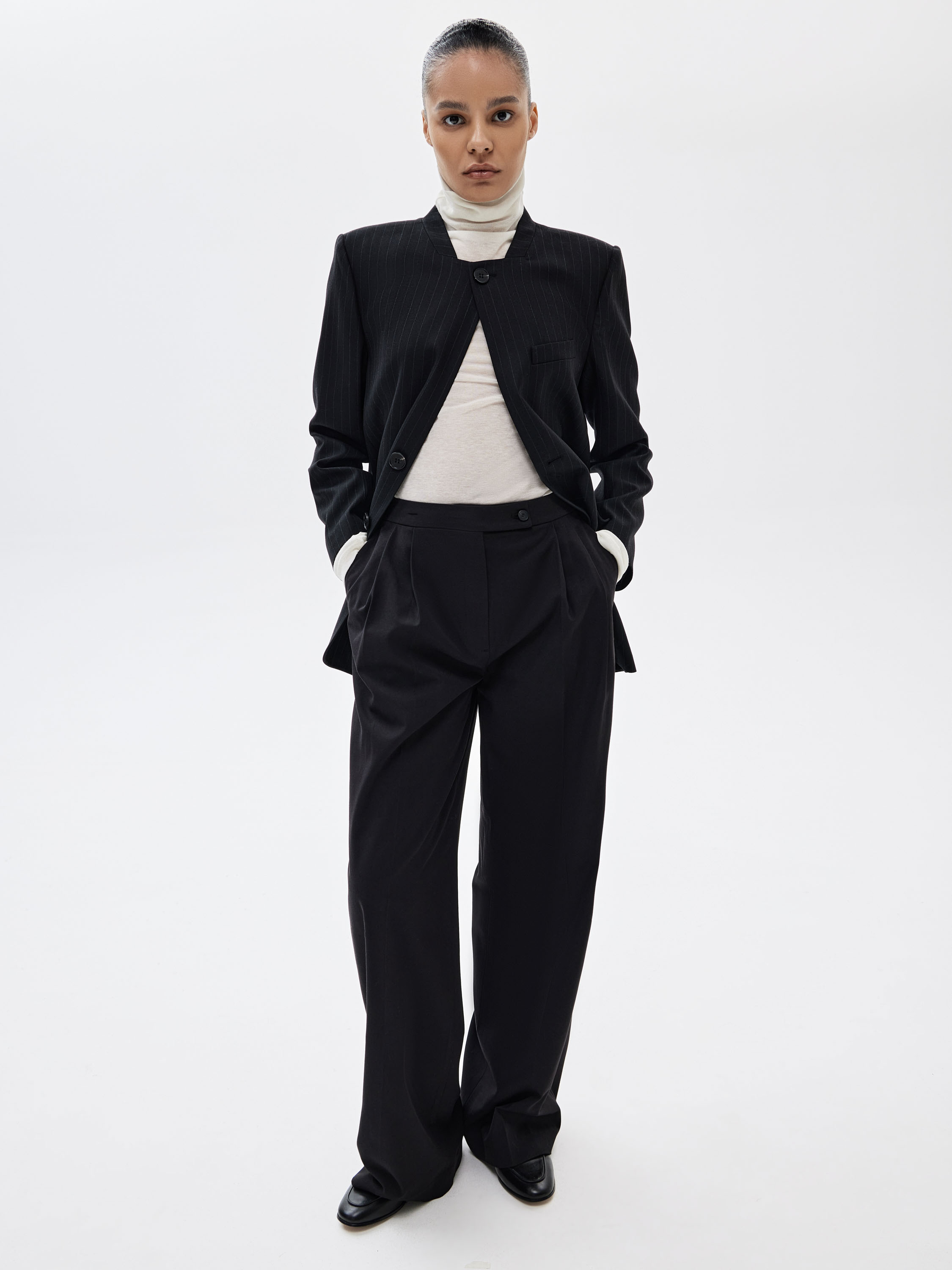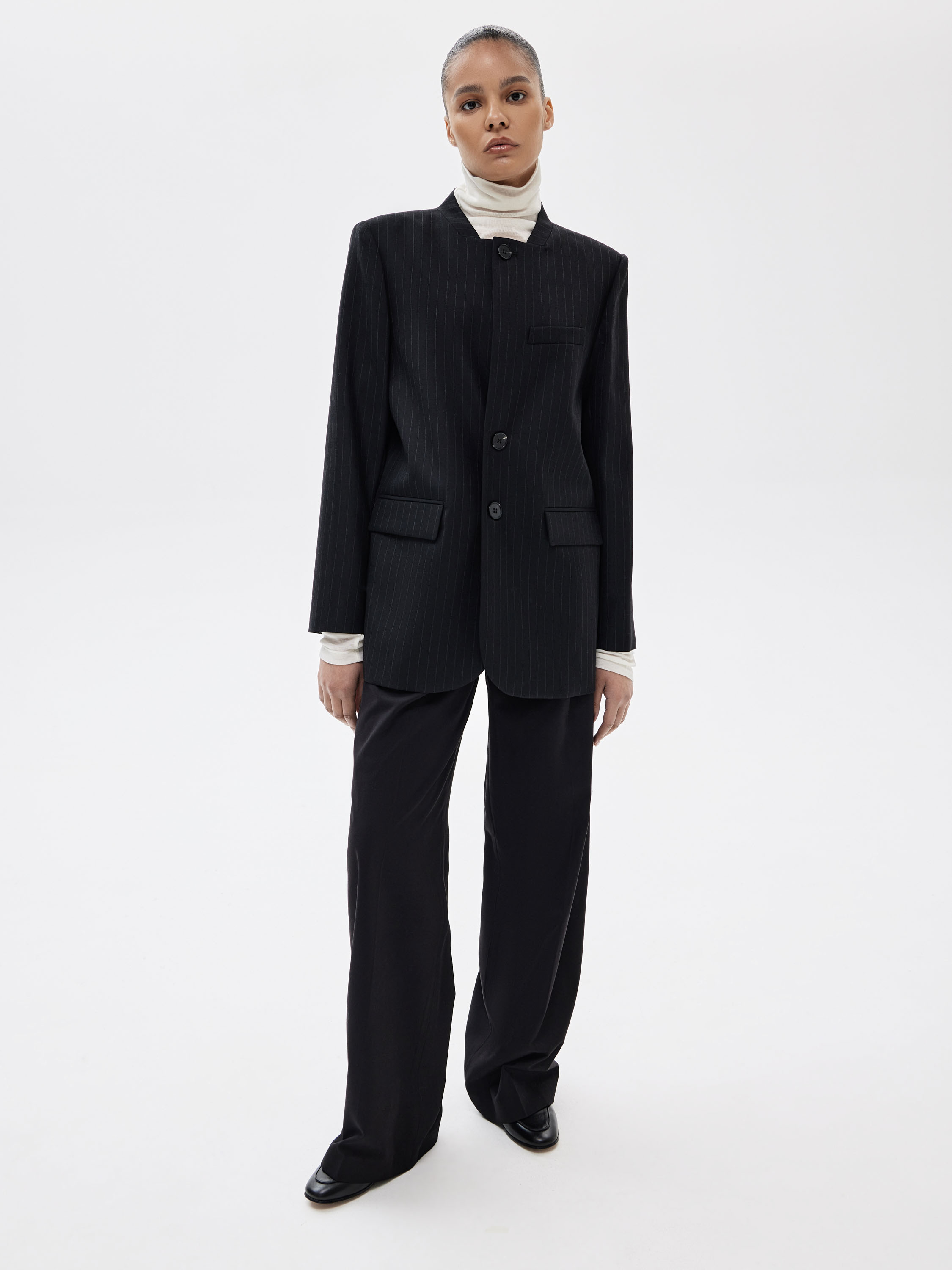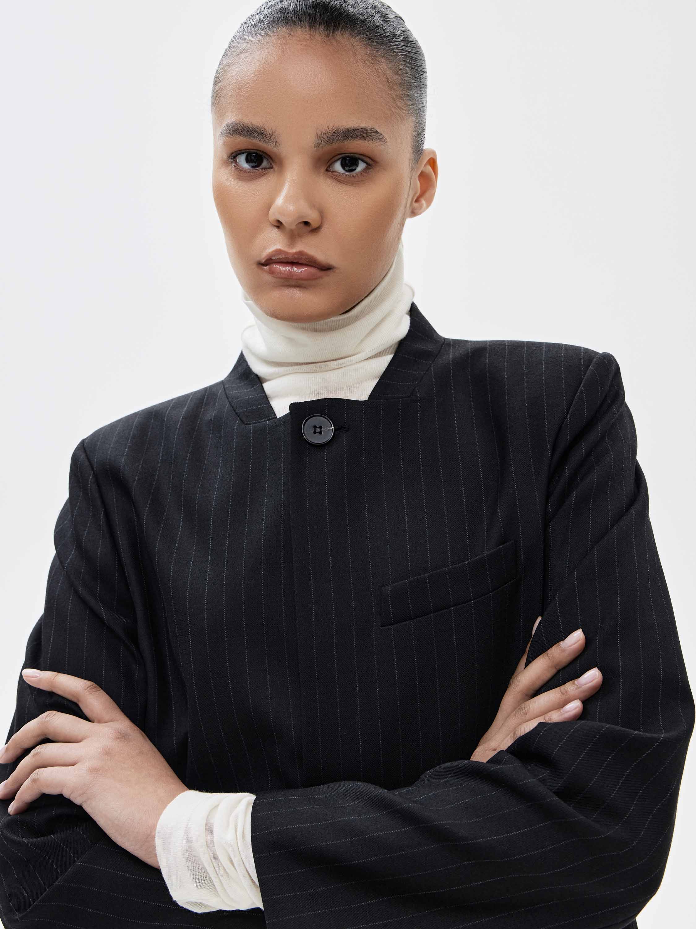 Жакет выполнен из костюмного смесового полотна с добавлением шерсти, с гладкой поверхностью и тонкой вертикальной полоской. Материал плотный, пластичный, хорошо держит заданную форму за счет эластана в составе. Цвет — глубокий графитовый с деликатным контрастом полоски, выглядит сдержанно и универсально в деловом и повседневном контексте. Силуэт прямой, вытянутый, с четко выстроенной линией плеч. Крой без лацканов, с коротким воротником-стойкой в виде ленты и застежкой на пуговицы формирует чистую фронтальную линию. Прорезные карманы с клапанами аккуратно интегрированы в конструкцию и не утяжеляют внешний вид. Жакет сочетается с брюками из комплекта, юбками, тонким трикотажем и базовыми топами, органично вписываясь в продуманный гардероб.
