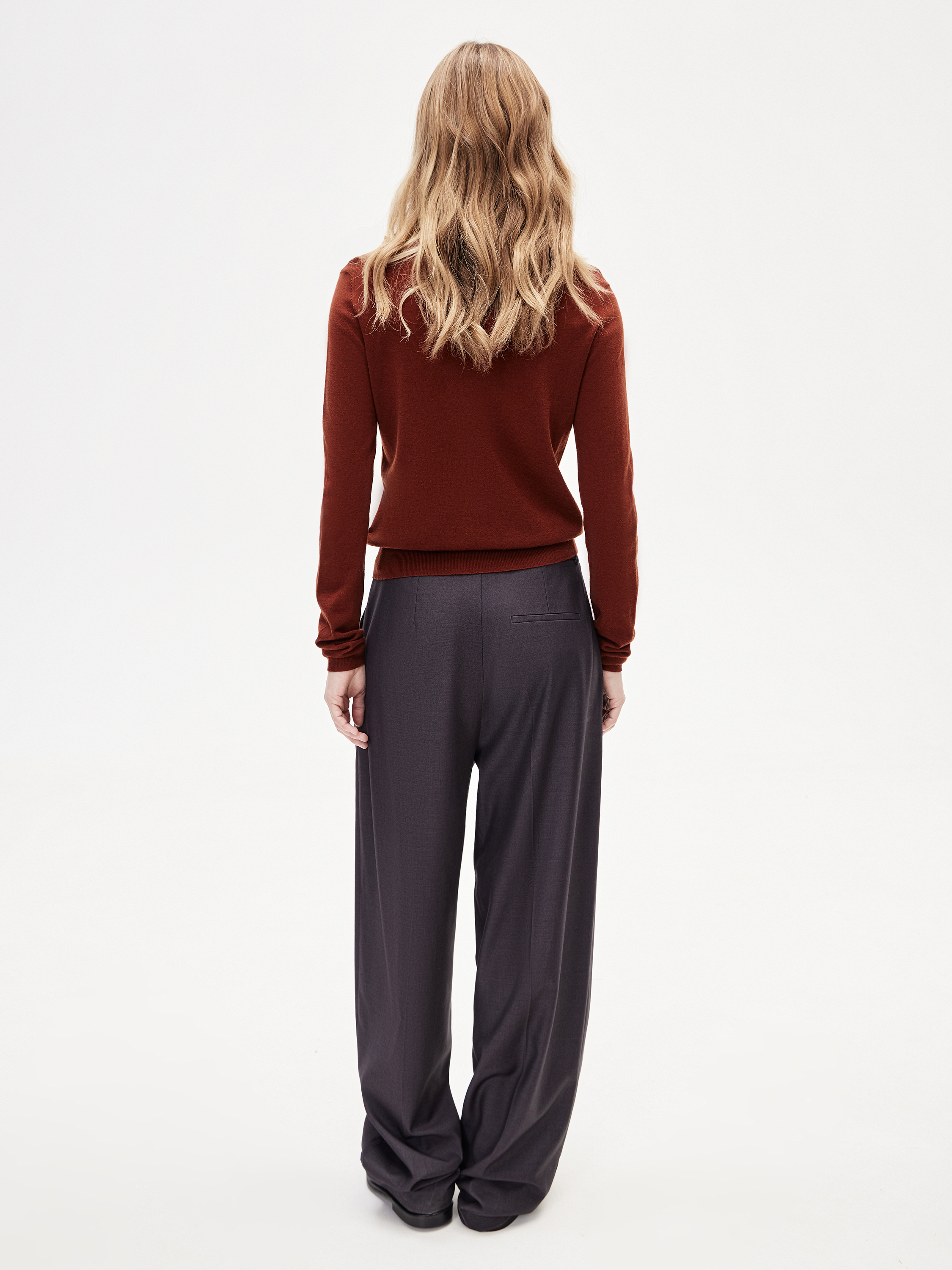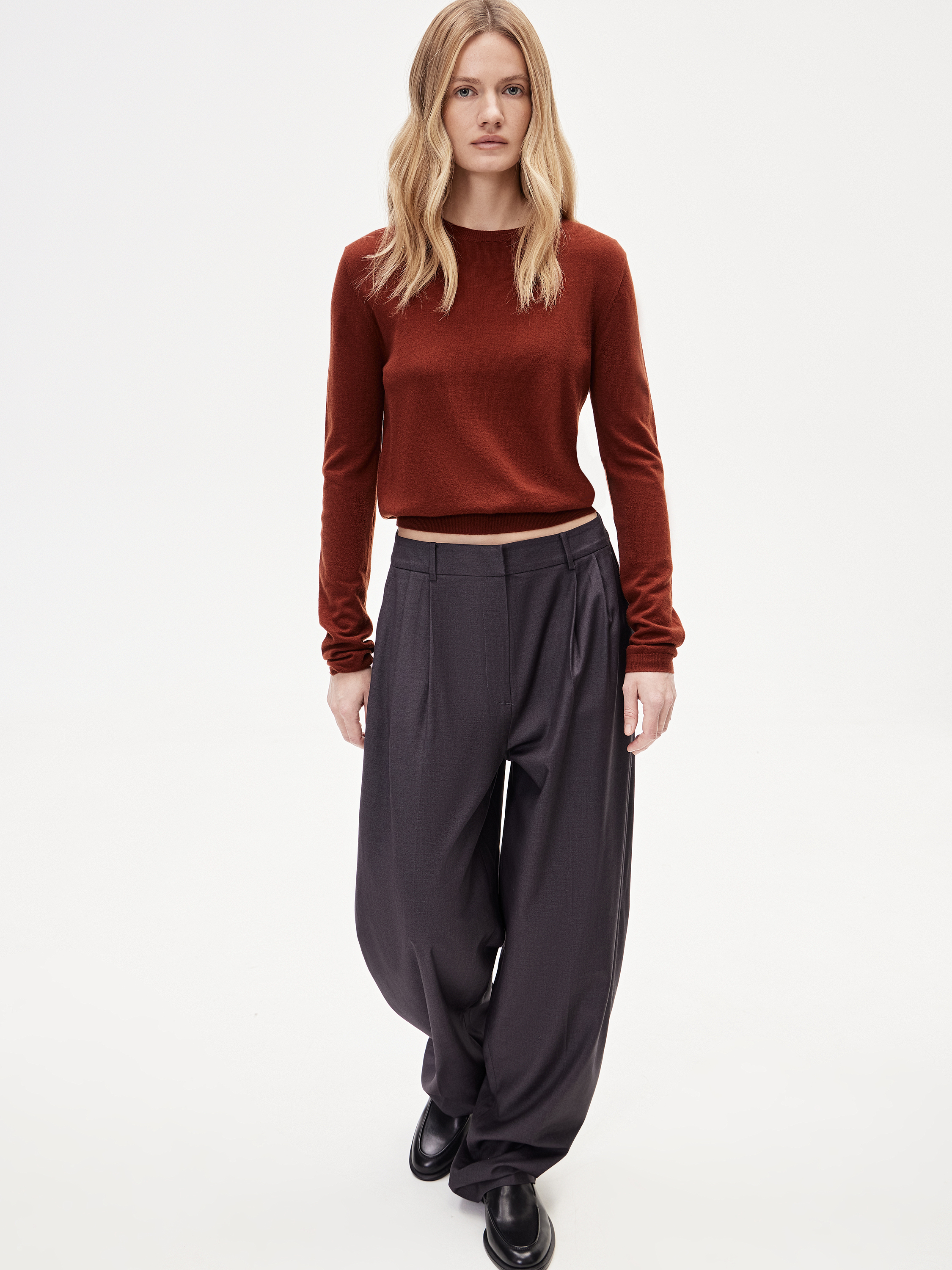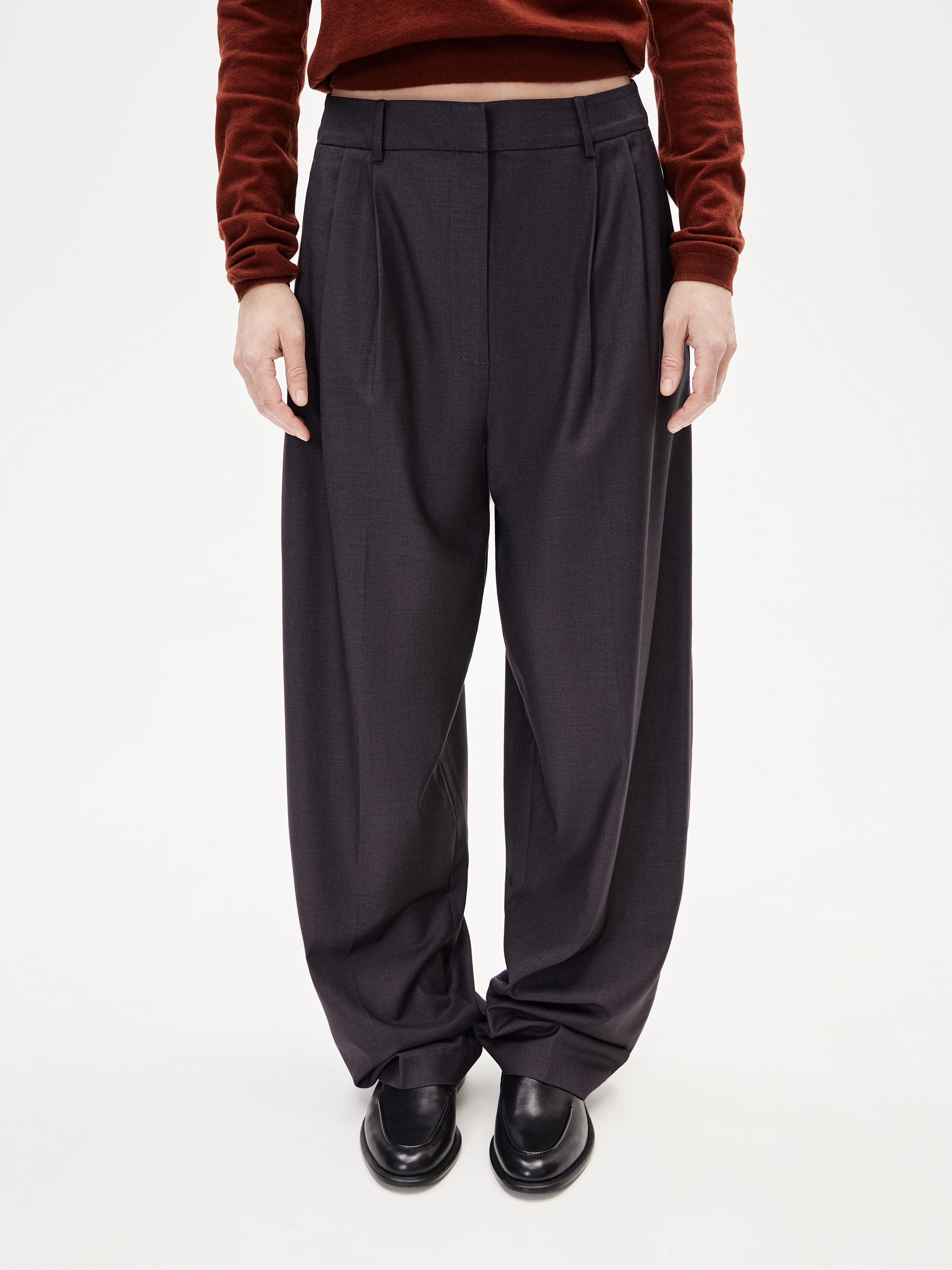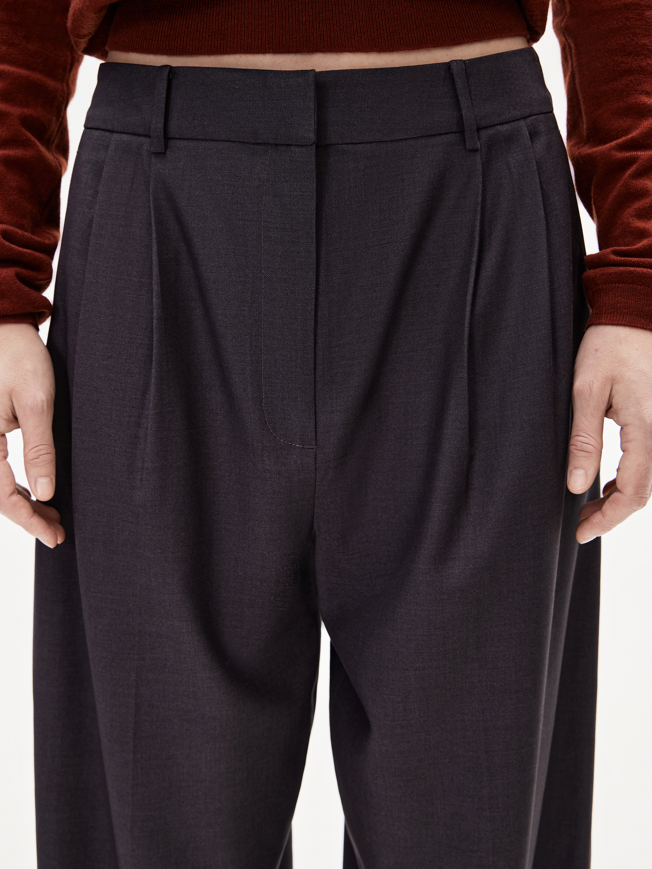 Брюки свободного кроя с мягкой линией талии и выразительными складками спереди формируют современный силуэт с объемом в верхней части и плавным сужением книзу. Благодаря этому пропорции выглядят вытянутыми и аккуратными. Смесовое полотно с добавлением вискозы и шерсти отличается плотностью и пластичностью, хорошо держит форму и остается комфортным в течение дня. Вискоза придает ткани мягкость и легкий матовый оттенок, шерсть добавляет глубину фактуры. Ткань выглядит благородно и долго сохраняет аккуратный внешний вид. Серый цвет универсален и легко вписывается как в деловой, так и в повседневный гардероб. Модель выполнена с притачным поясом, застежкой и боковыми карманами. Носите с жакетом из комплекта, лаконичным трикотажем или базовым топом.