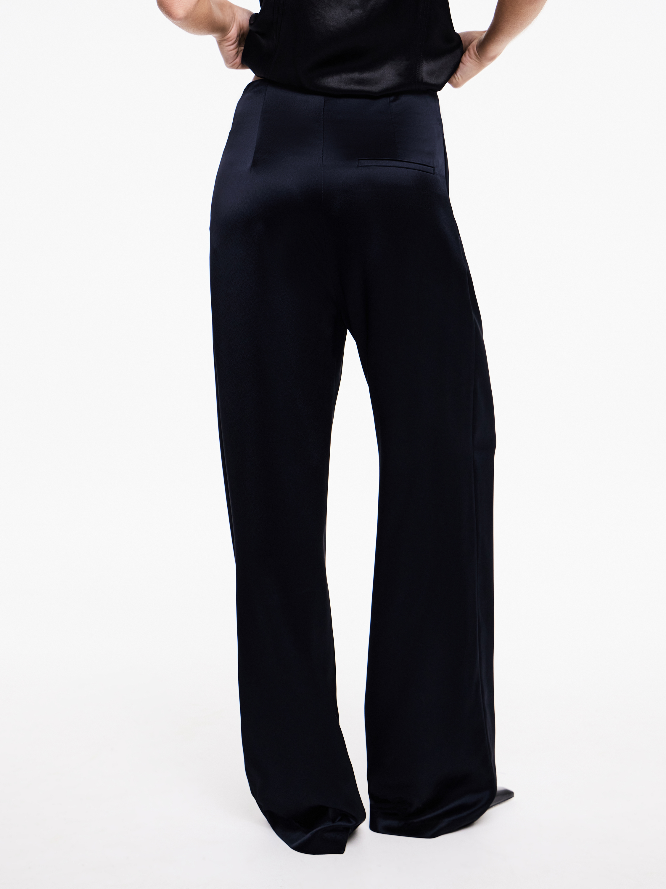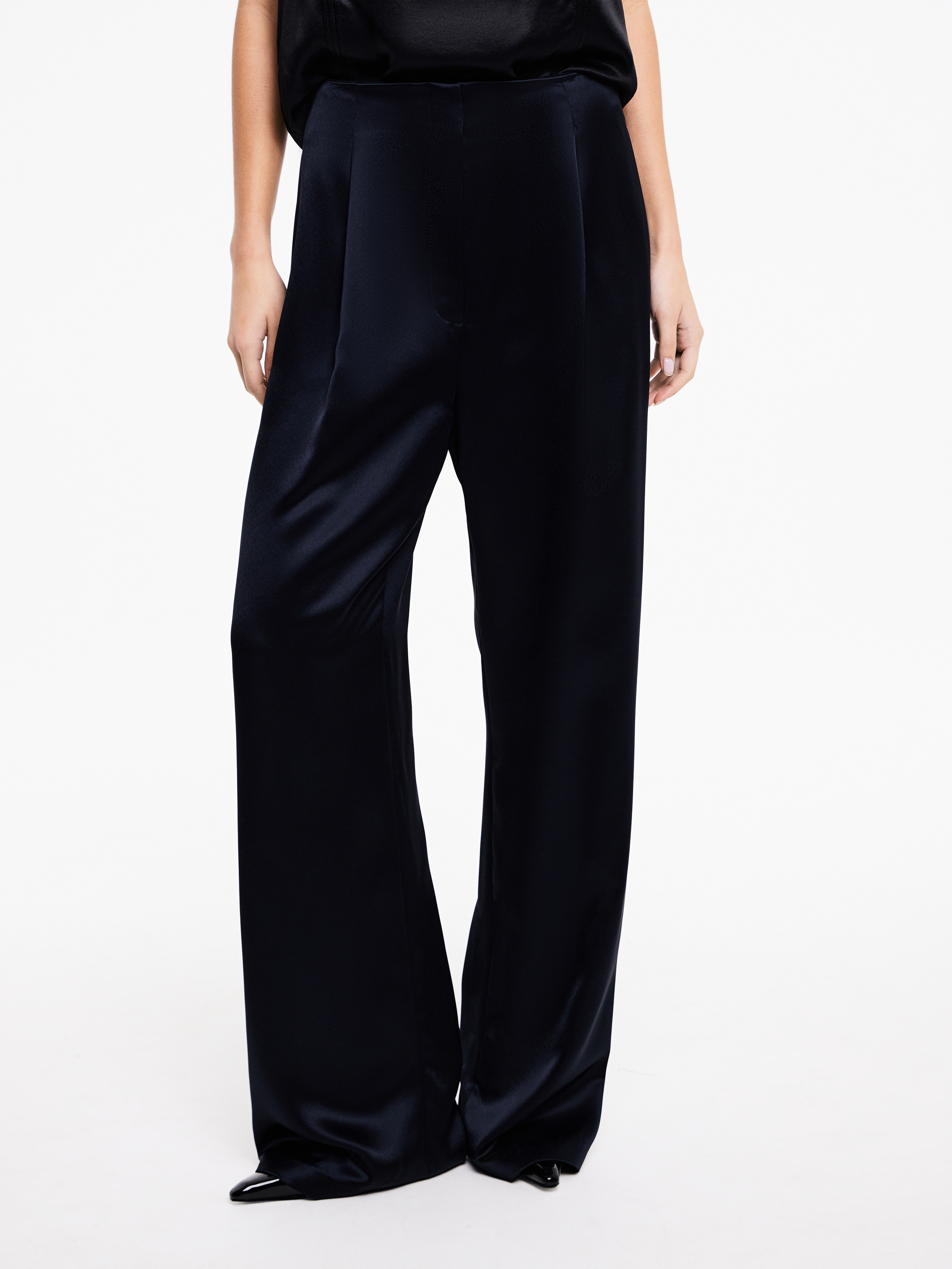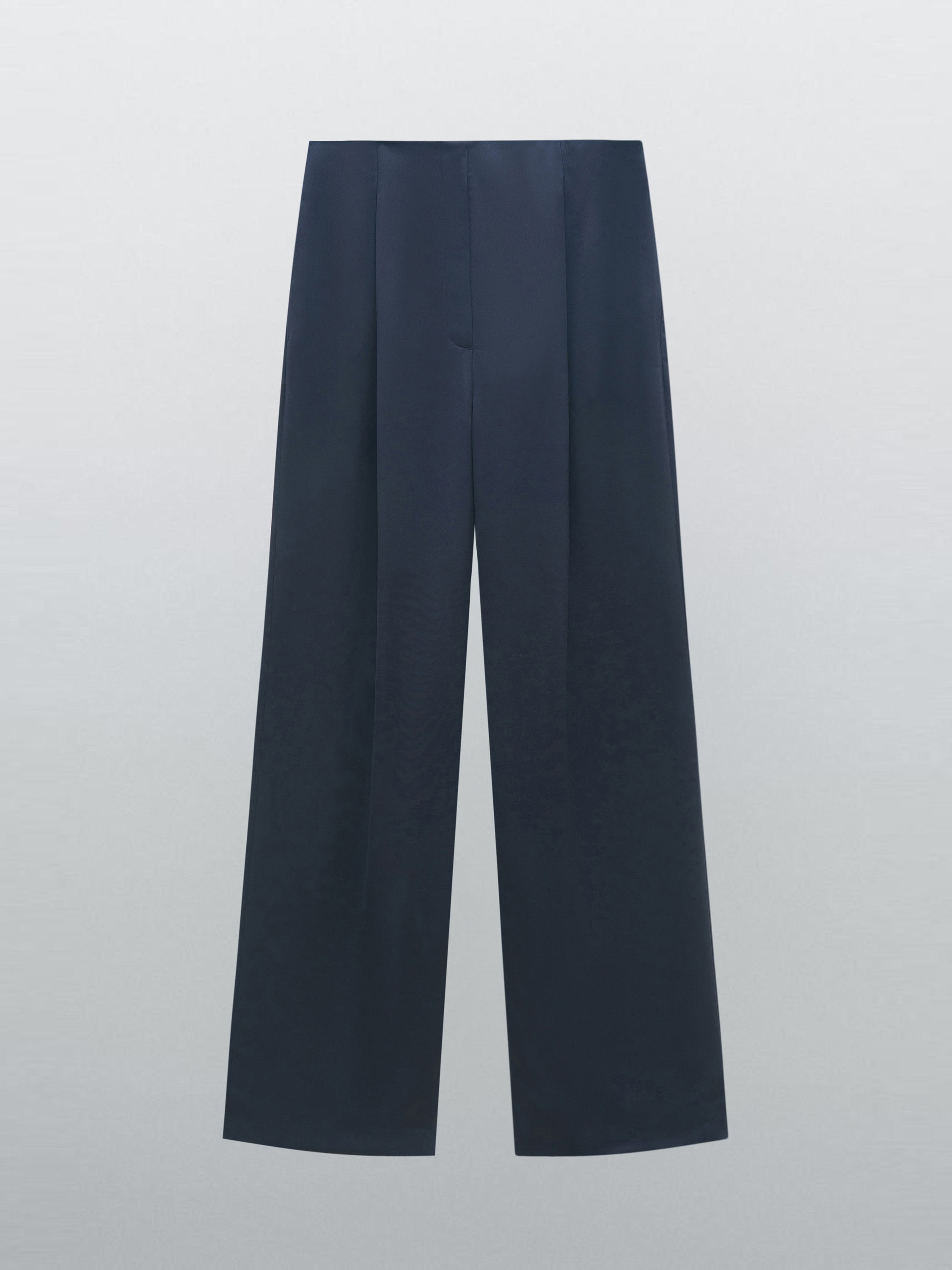 Широкие брюки из района с выразительным сатиновым блеском. Модель выполнена с высокой посадкой, что создает чистый, аккуратный силуэт. Передние и задние вытачки формируют мягкий объем и безупречную линию по талии. Прямые, свободные брючины дополнены стрелками, которые визуально вытягивают силуэт. Легкая, гладкая ткань красиво драпируется и мягко движется при ходьбе, подчеркивая текучесть формы. Универсальный крой позволяет носить брюки как с базовыми топами и рубашками, так и в комплекте с жакетом из той же ткани для создания цельного образа.