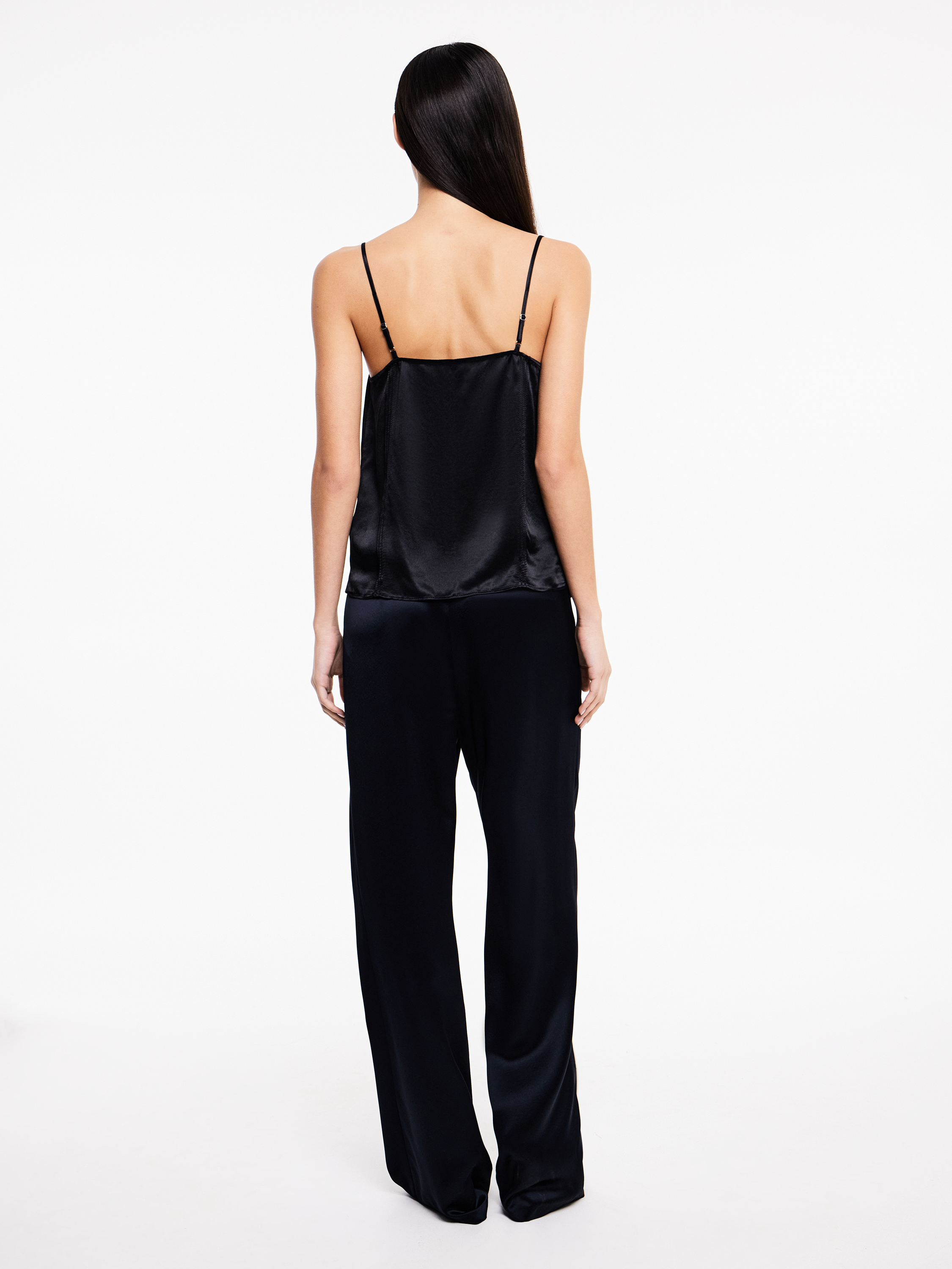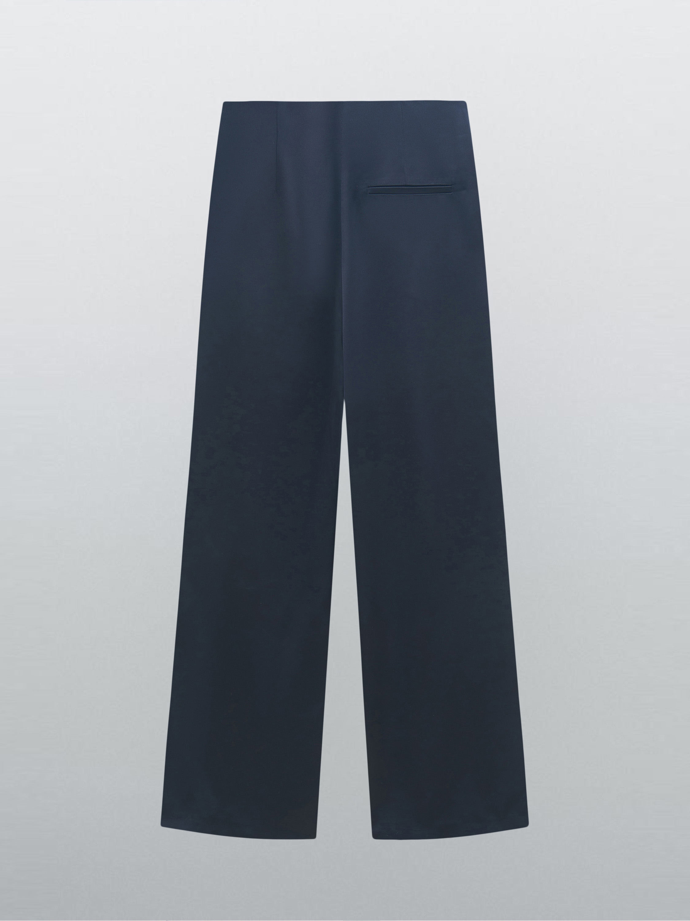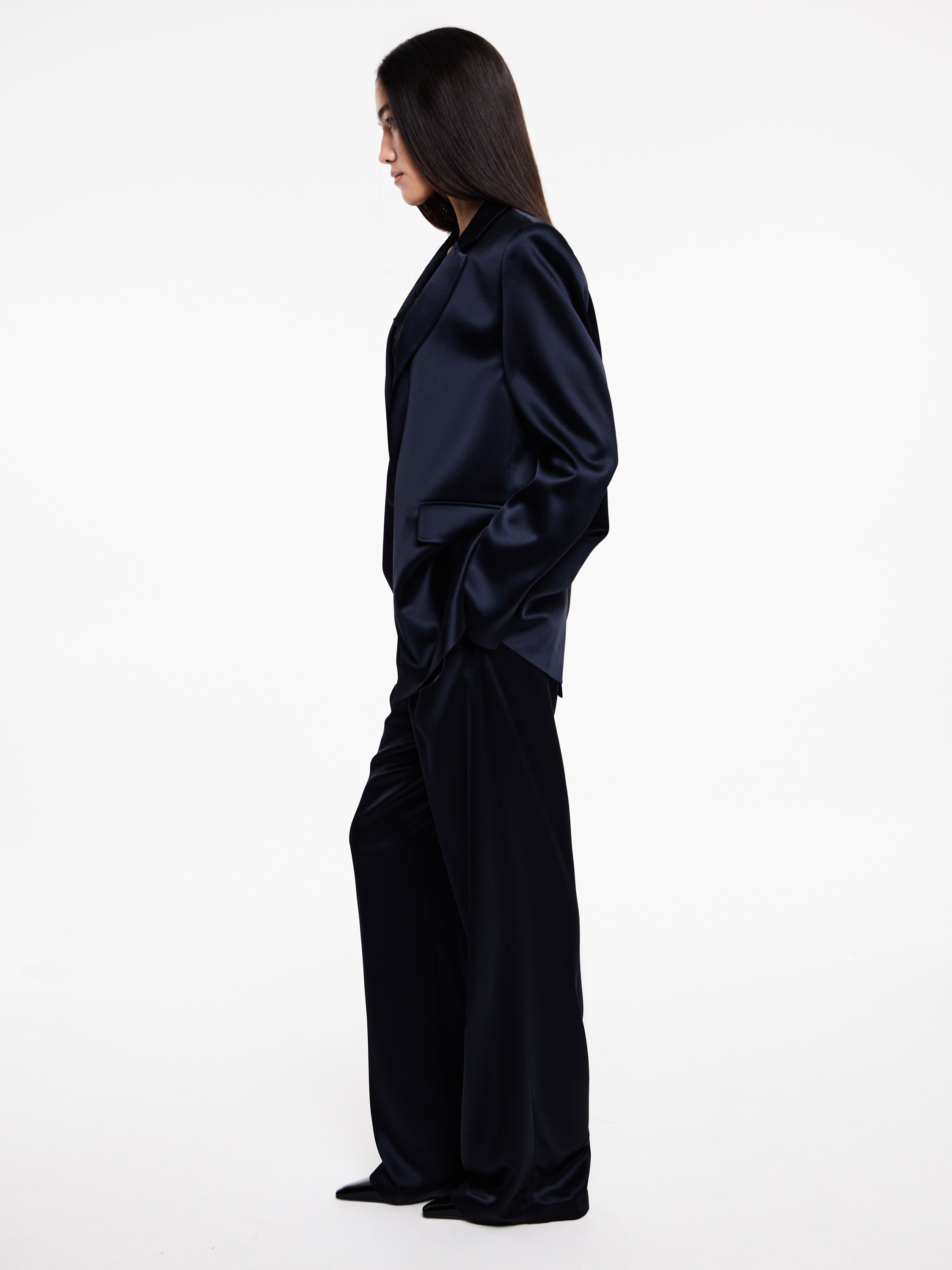 Широкие брюки из района с выразительным сатиновым блеском. Модель выполнена с высокой посадкой, что создает чистый, аккуратный силуэт. Передние и задние вытачки формируют мягкий объем и безупречную линию по талии. Прямые, свободные брючины дополнены стрелками, которые визуально вытягивают силуэт. Легкая, гладкая ткань красиво драпируется и мягко движется при ходьбе, подчеркивая текучесть формы. Универсальный крой позволяет носить брюки как с базовыми топами и рубашками, так и в комплекте с жакетом из той же ткани для создания цельного образа.