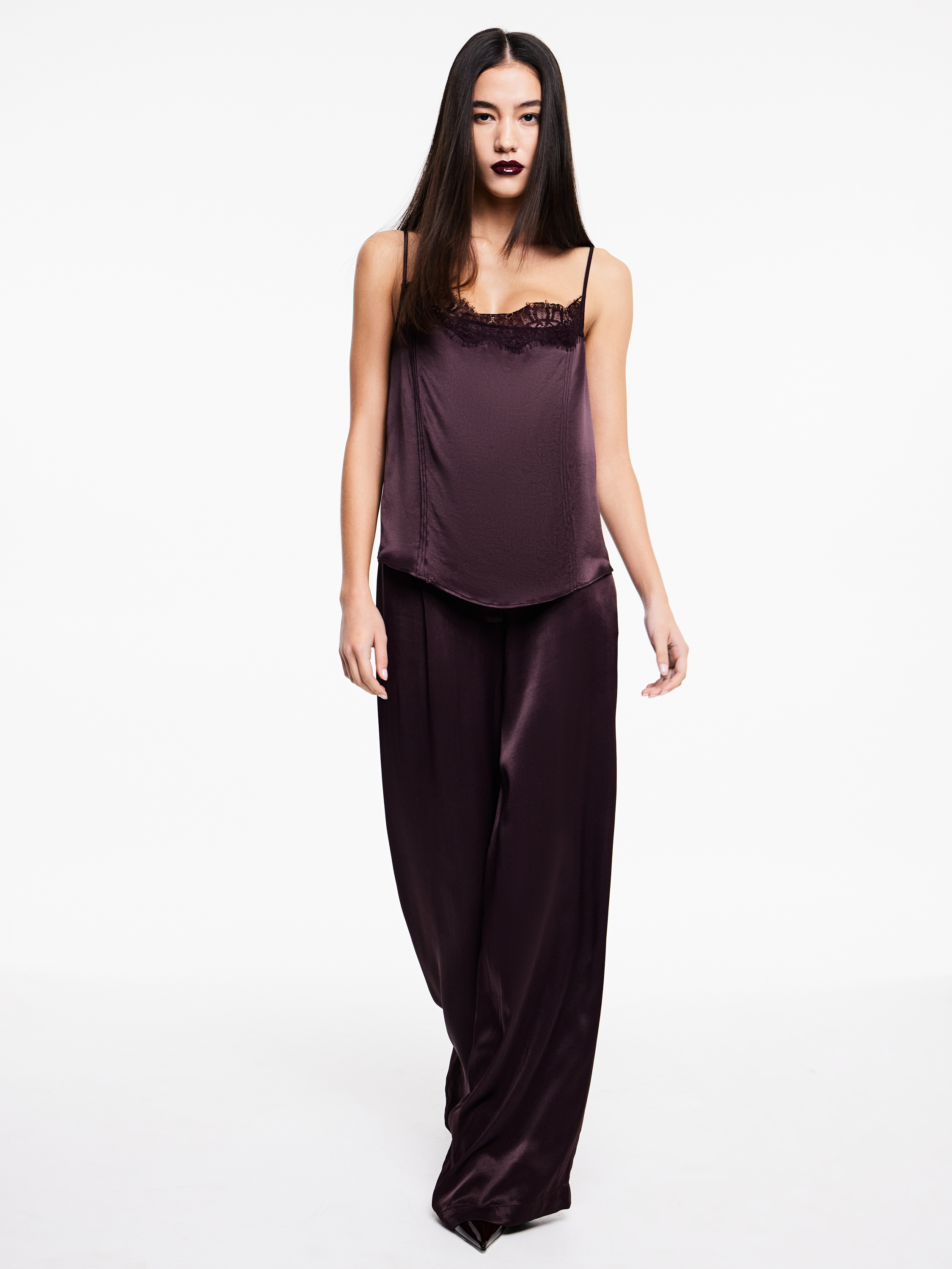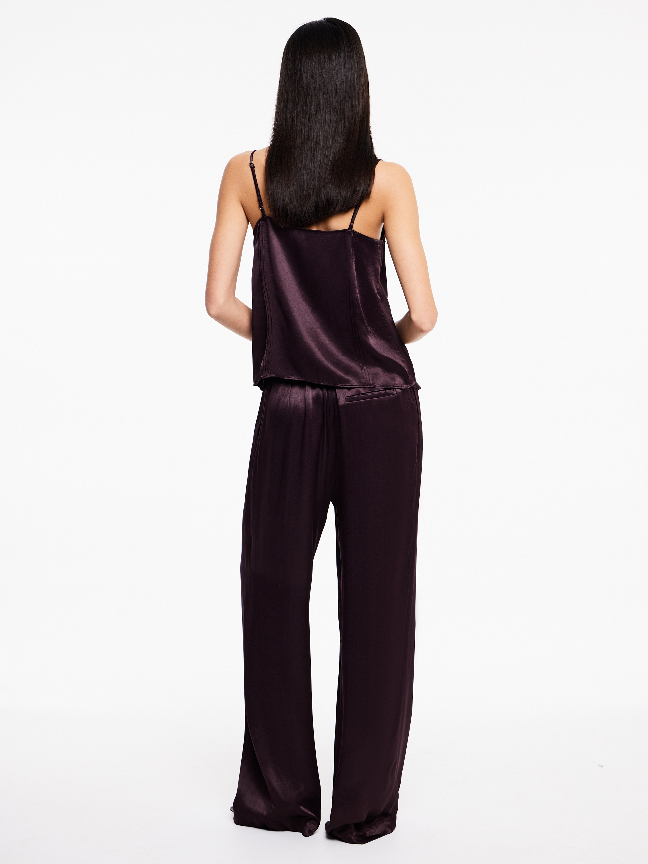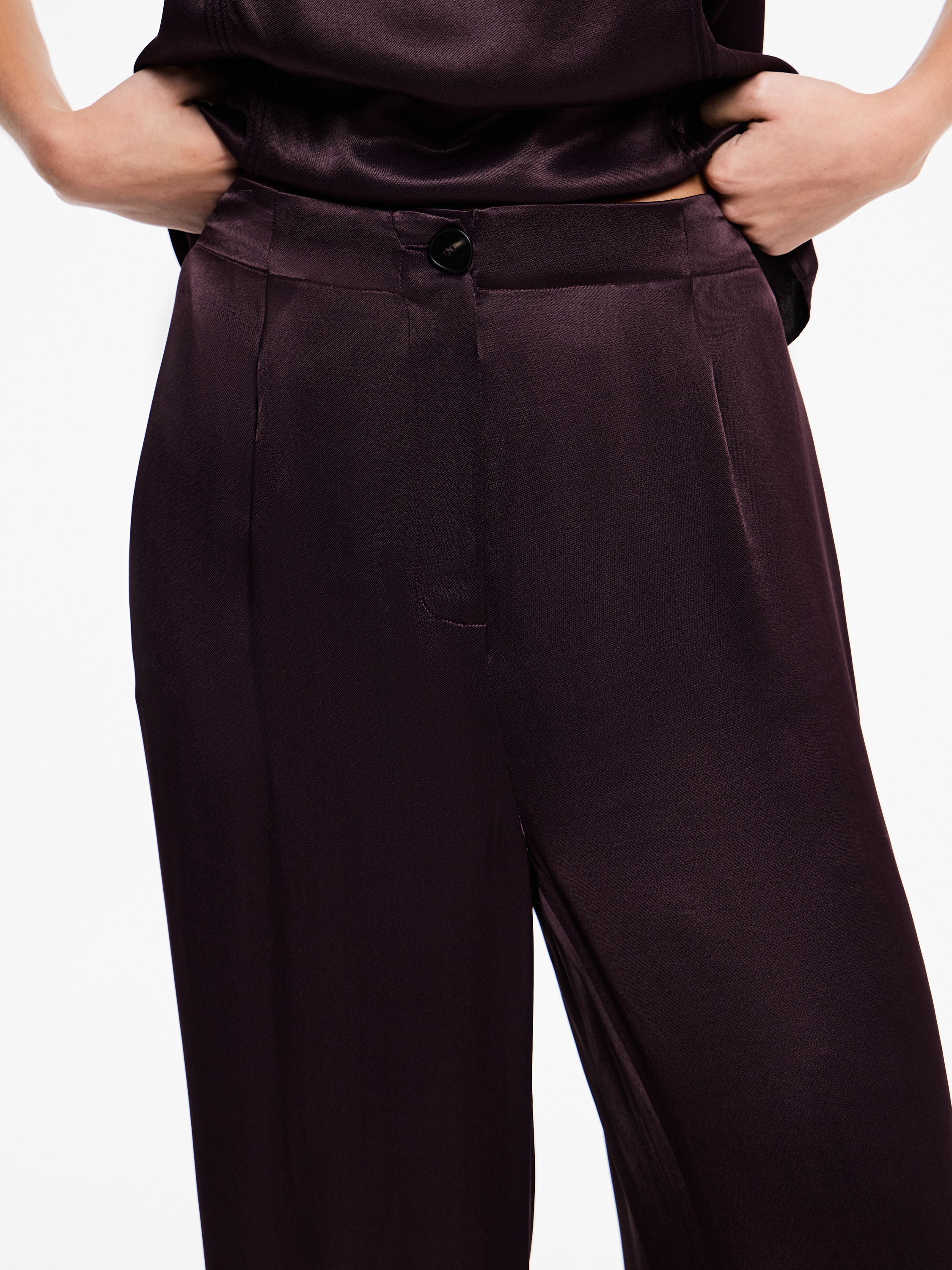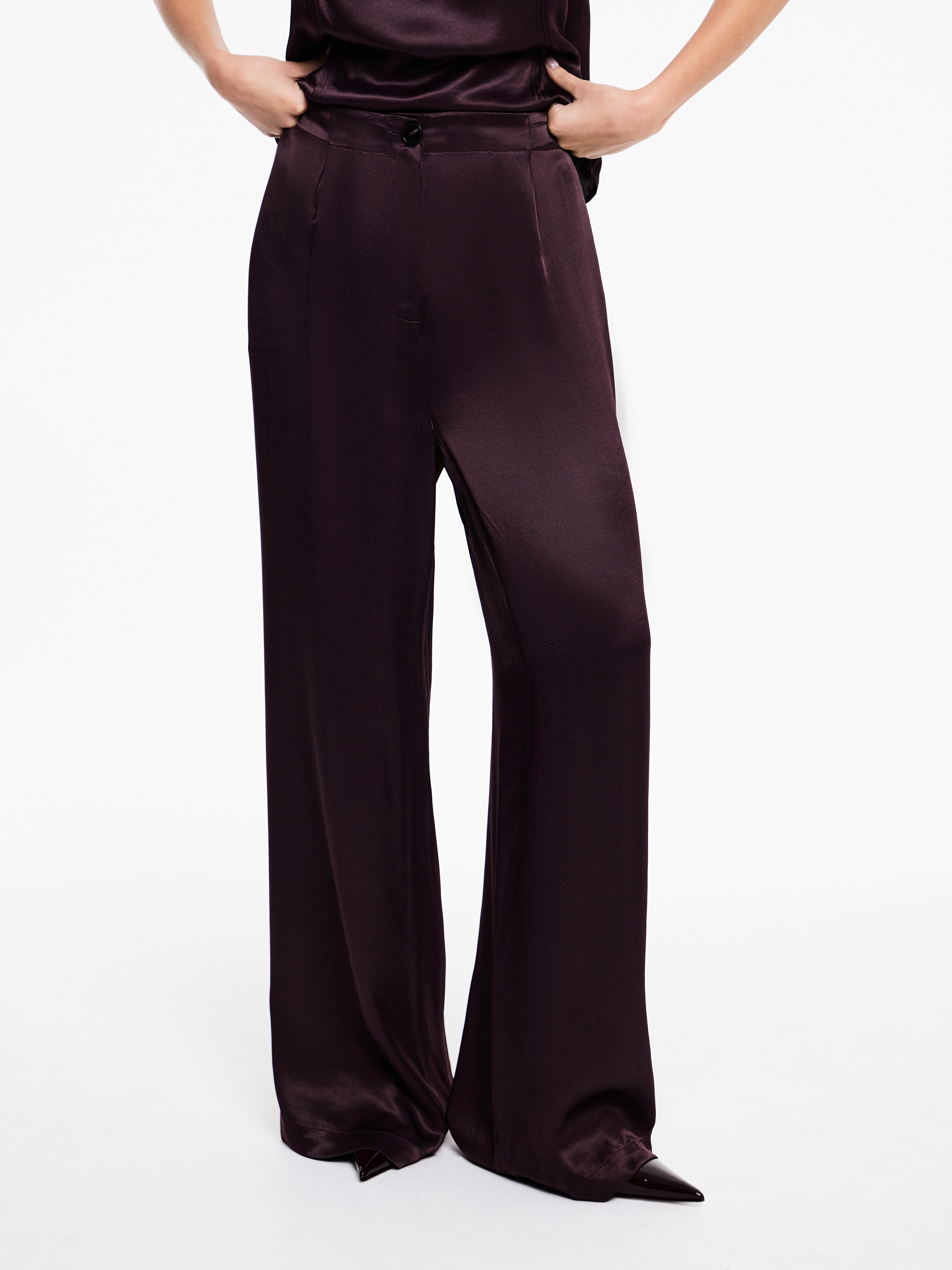 Широкие брюки из района с выразительным сатиновым блеском. Модель выполнена с высокой посадкой и цельнокроеным поясом, что создает чистый, аккуратный силуэт. Передние и задние вытачки формируют мягкий объем и безупречную линию по талии. Прямые, свободные брючины дополнены стрелками, которые визуально вытягивают силуэт. Легкая, гладкая ткань красиво драпируется и мягко движется при ходьбе, подчеркивая текучесть формы. Универсальный крой позволяет носить брюки как с базовыми топами и рубашками, так и в комплекте с жакетом из той же ткани для создания цельного образа.