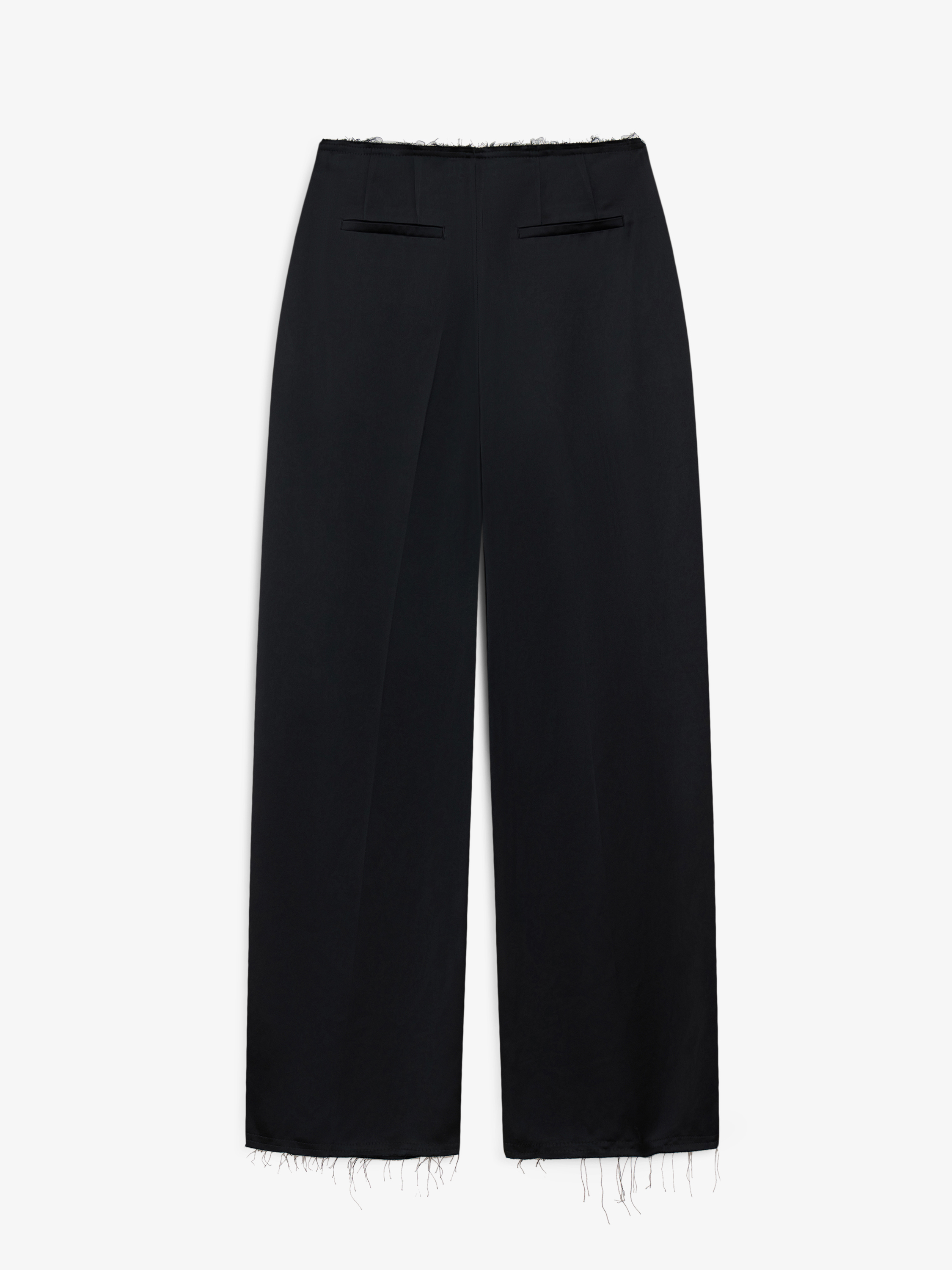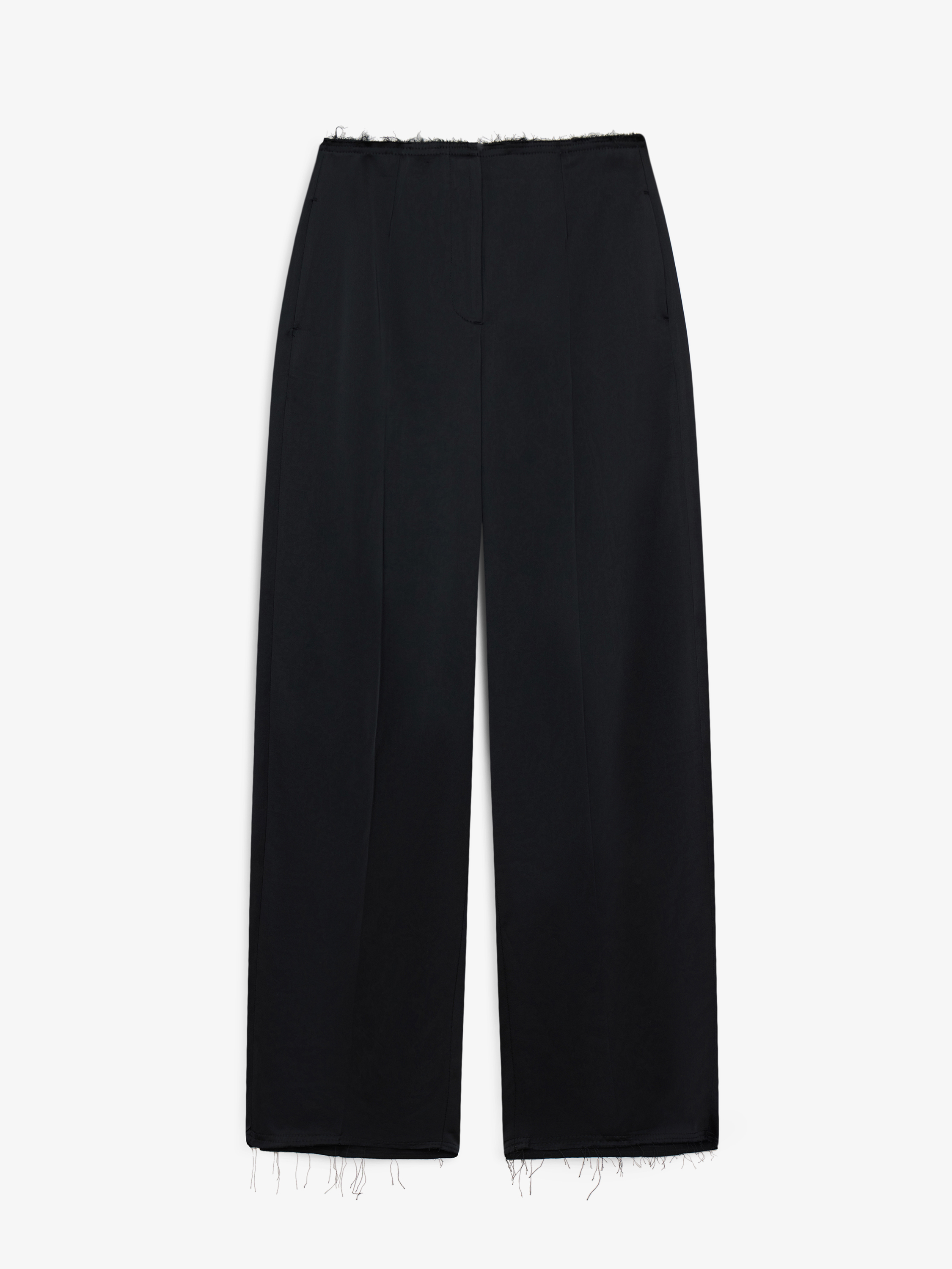 Брюки из смесового полотна с ровной, матовой поверхностью и выраженной пластикой. Материал плотный, хорошо держит форму и задает четкую геометрию силуэта. Посадка выстроена по талии, линия пояса подчеркнута и визуально собрана, без декоративной фурнитуры и лишних деталей. Силуэт прямой, вытянутый, с акцентом на вертикали. Низ оформлен необработанным краем, что создает ощущение легкой небрежности и контрастирует с строгой линией кроя. Этот прием добавляет образу современность и делает модель менее формальной. Брюки подходят для повседневных и более собранных сочетаний, хорошо смотрятся с лаконичными топами, рубашками и жакетами, сохраняя баланс между структурой и расслабленной подачей.