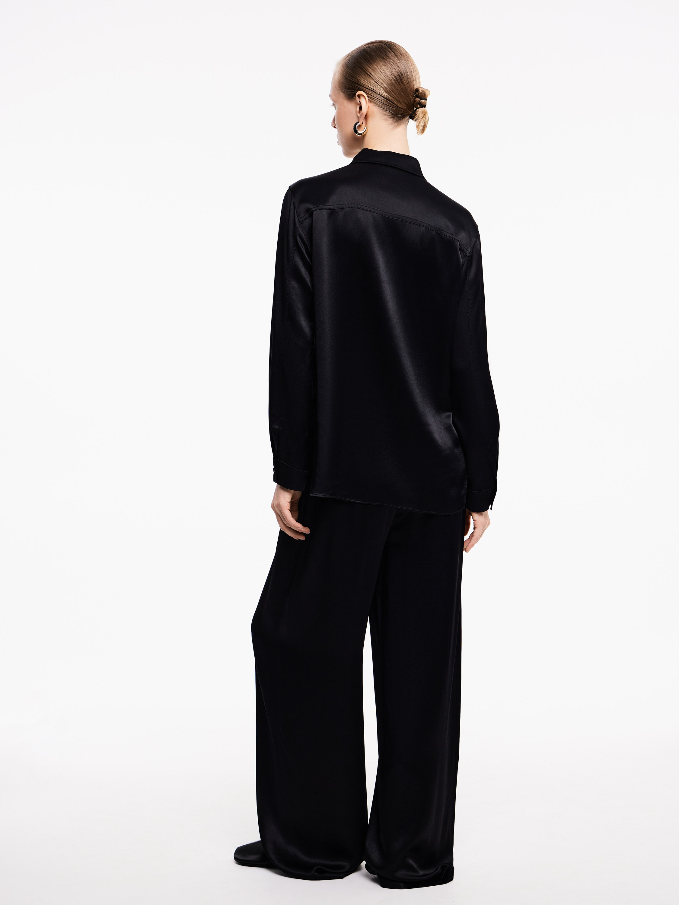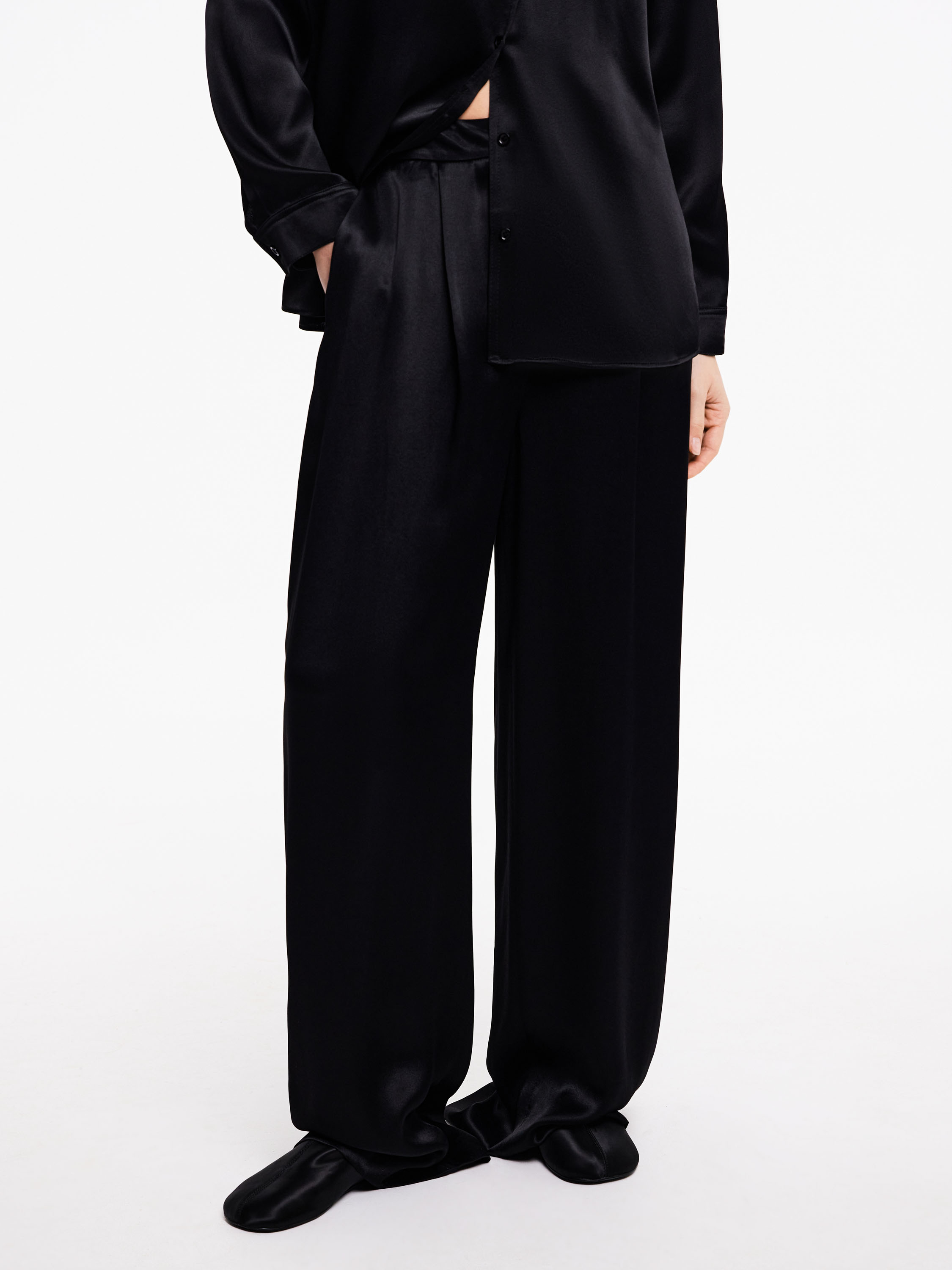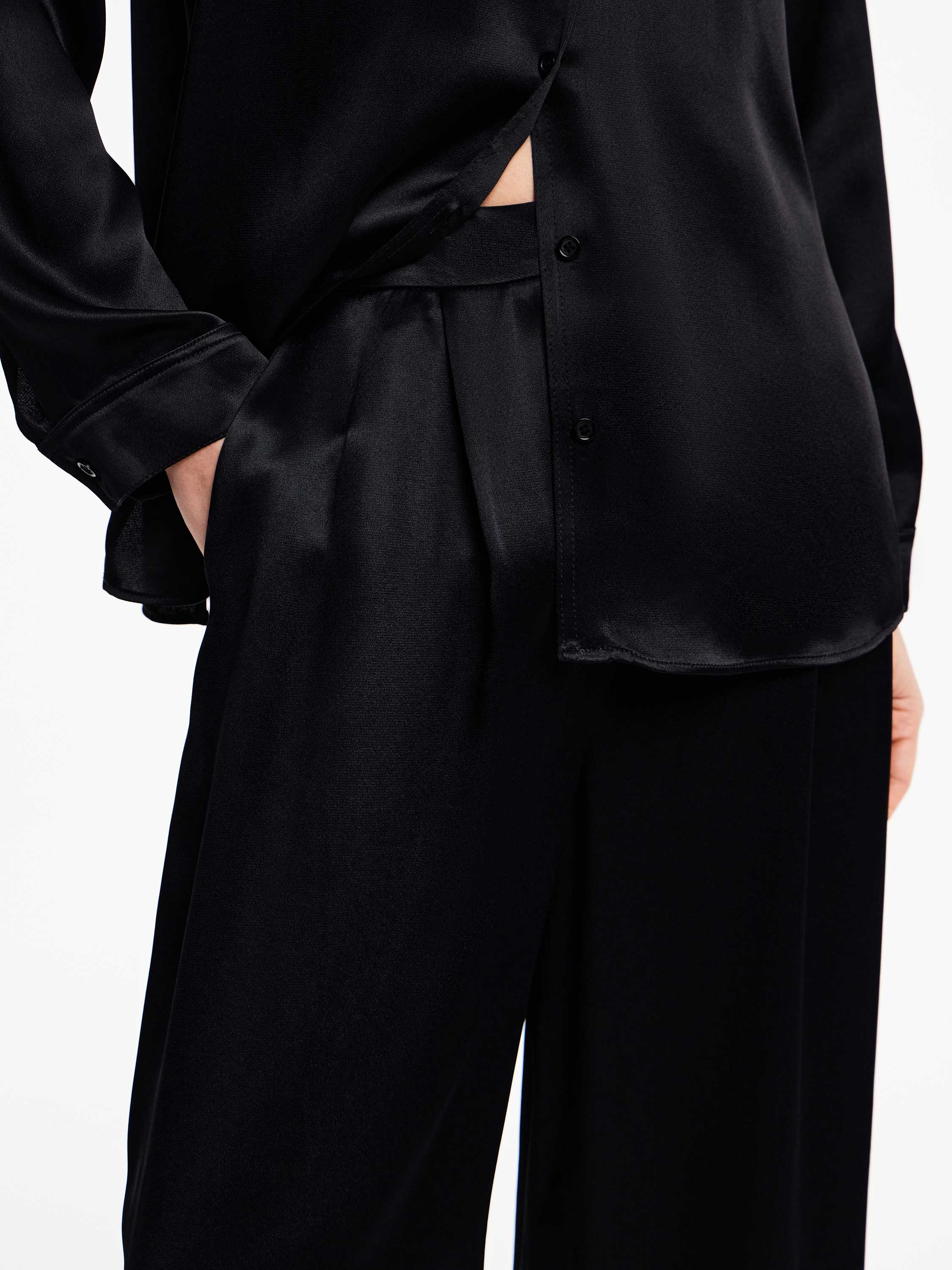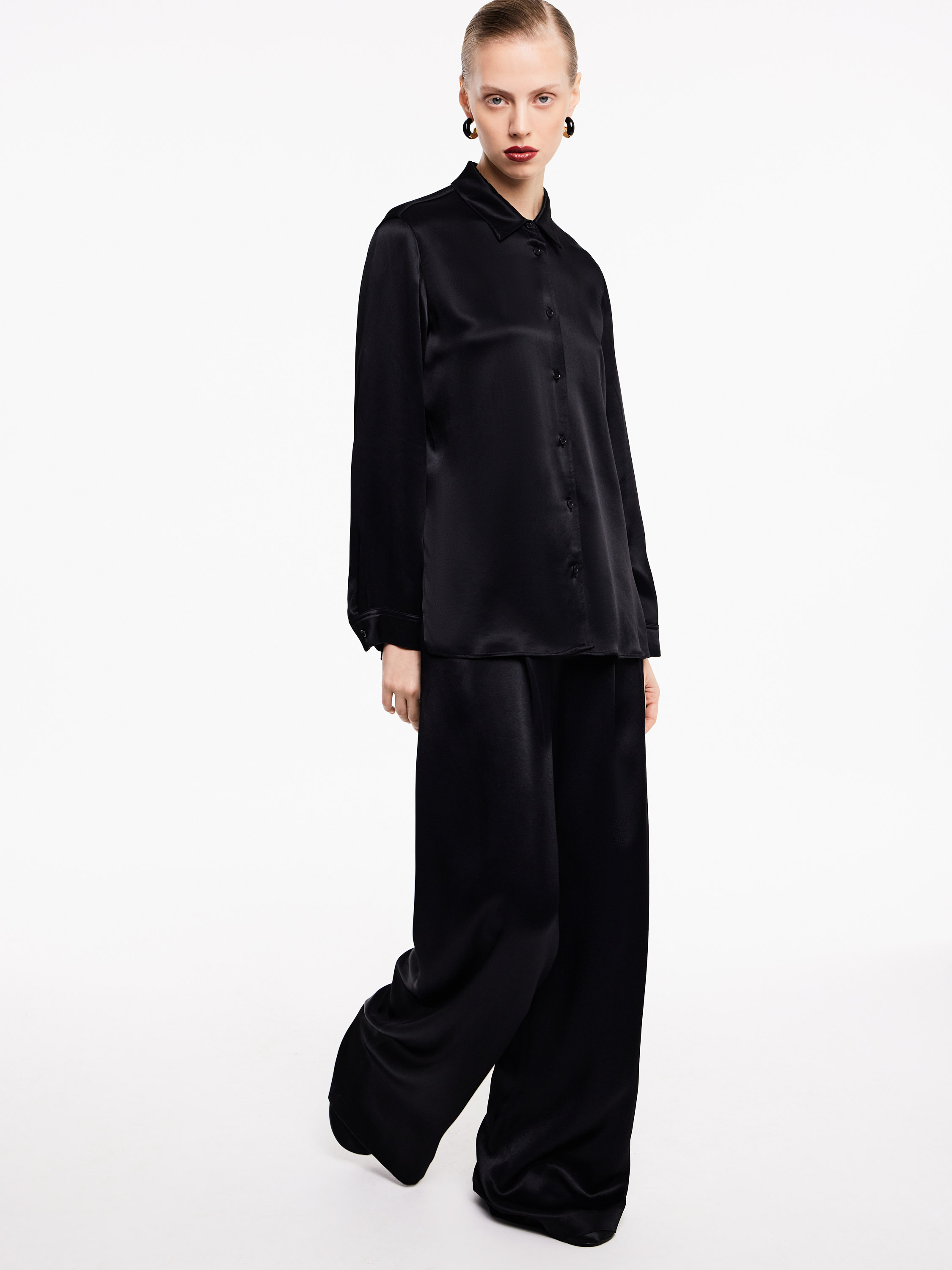 Широкие брюки из гладкой ткани район с мягким сатиновым отливом в благородном кремовом оттенке. Свободный прямой силуэт с удлиненной линией брюк красиво струится и визуально вытягивает фигуру. Посадка средняя, у пояса — аккуратные защипы, которые придают объем по линии бедер и формируют чистую вертикаль. Пластичное полотно приятно охлаждает кожу и мягко драпируется при движении. Эти брюки одинаково хорошо работают в тотал-луке айвори с рубашкой из района, в паре с темным шелковистым топом или с мягким трикотажем — от деловых сочетаний до расслабленного вечернего образа.