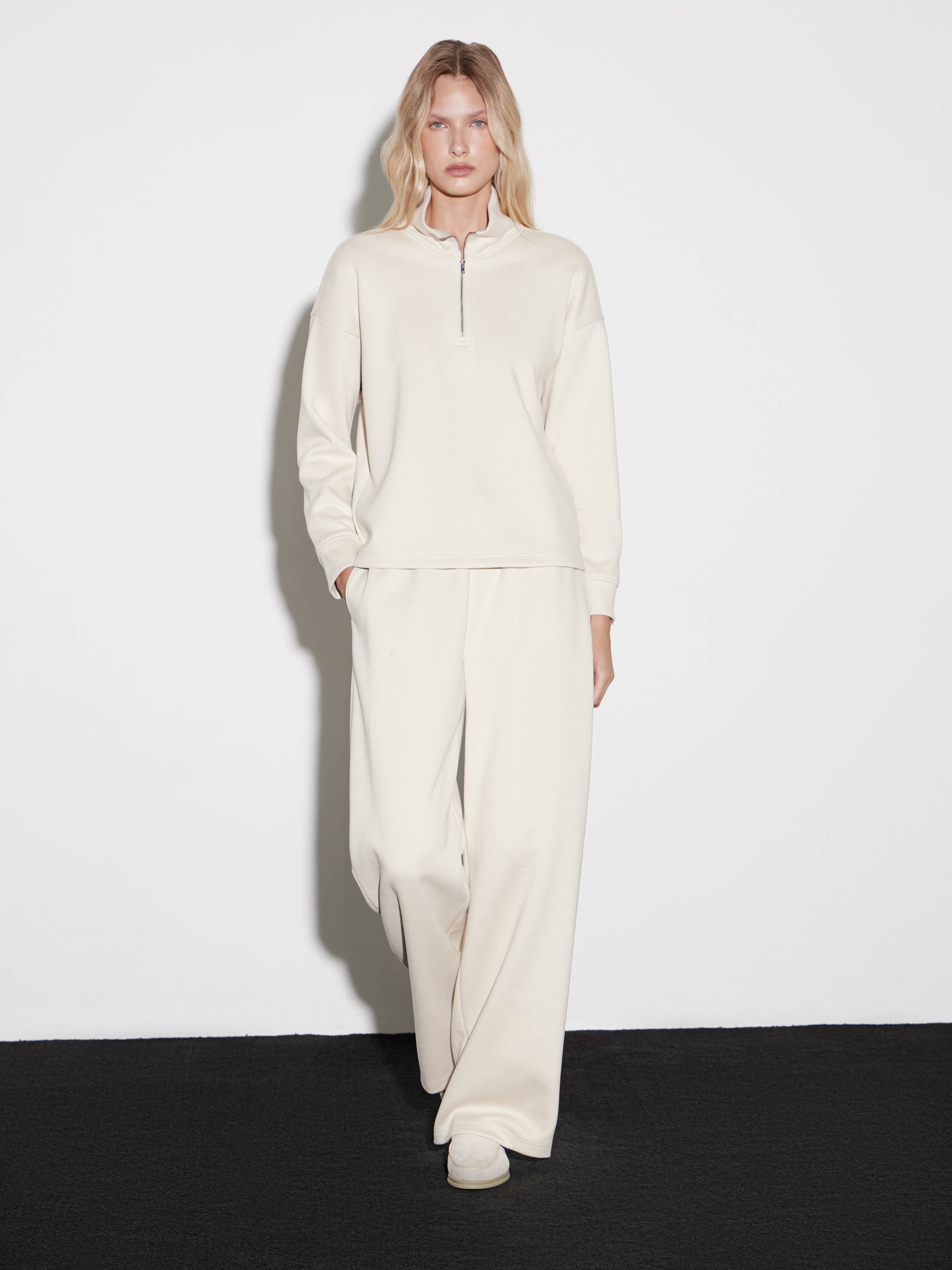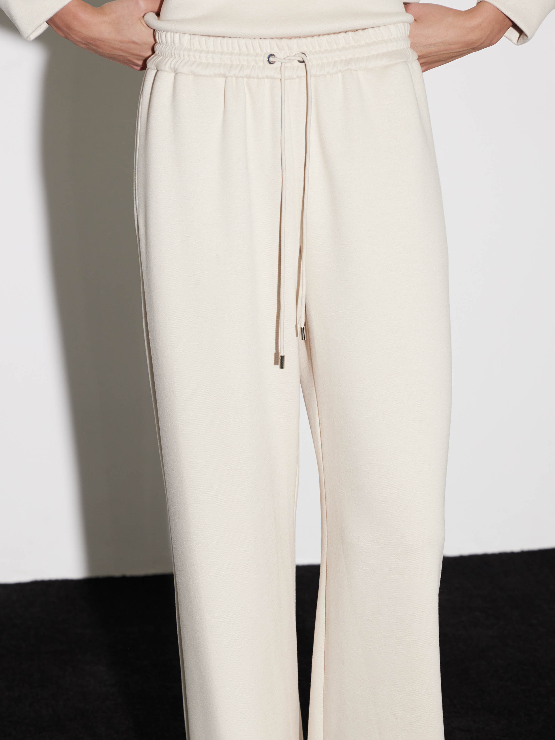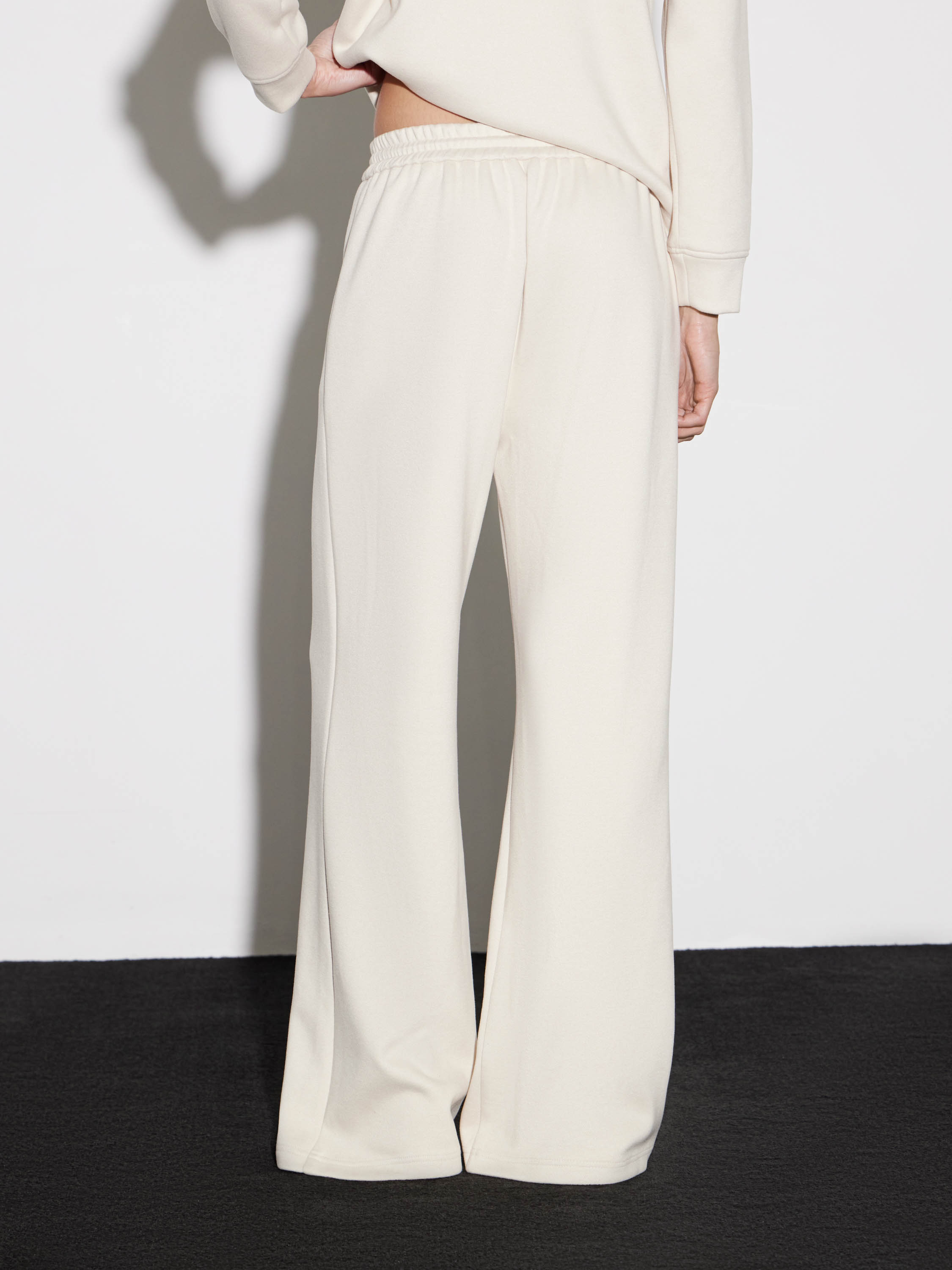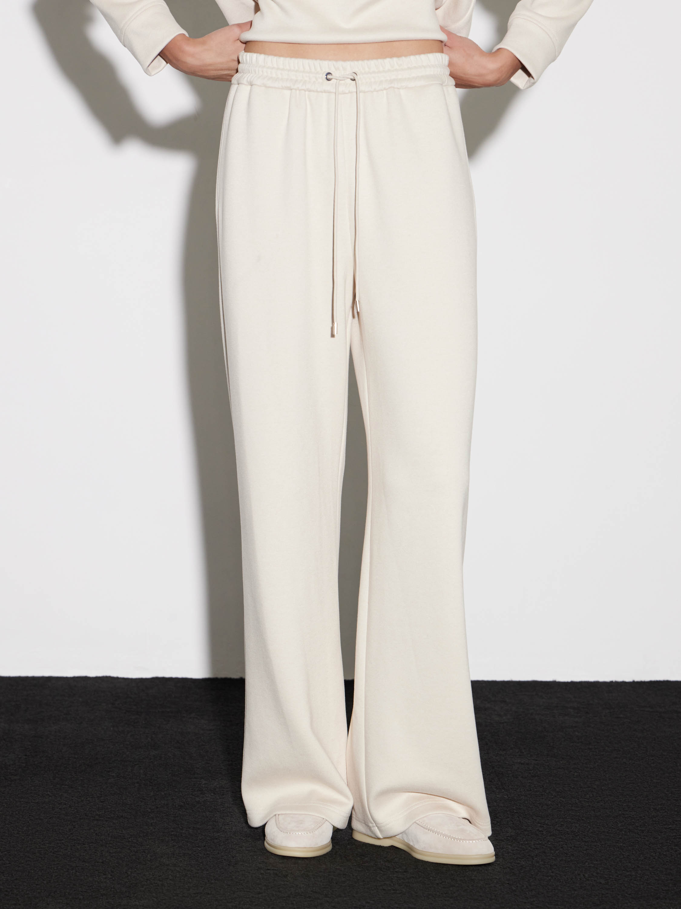 Брюки выполнены из мягкого смесового трикотажа, который приятно ощущается на коже и сохраняет аккуратный вид при носке. Свободный прямой силуэт дает комфорт и естественную пластику линии, а эластичный пояс со шнурком позволяет точно настроить посадку. Полотно имеет умеренную плотность, благодаря чему брюки хорошо держат форму по бедру и остаются подвижными к линии низа. Универсальный оттенок и лаконичный крой делают модель удобной основой для расслабленных комплектов с худи, трикотажем или длинными пальто.