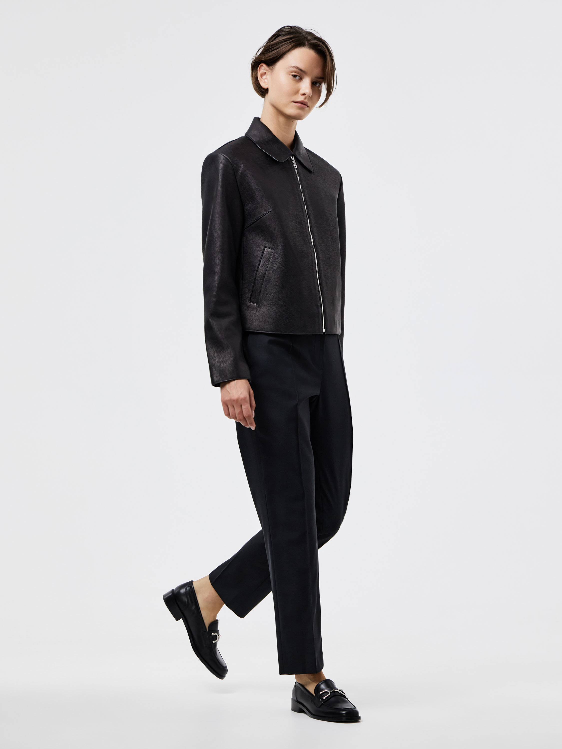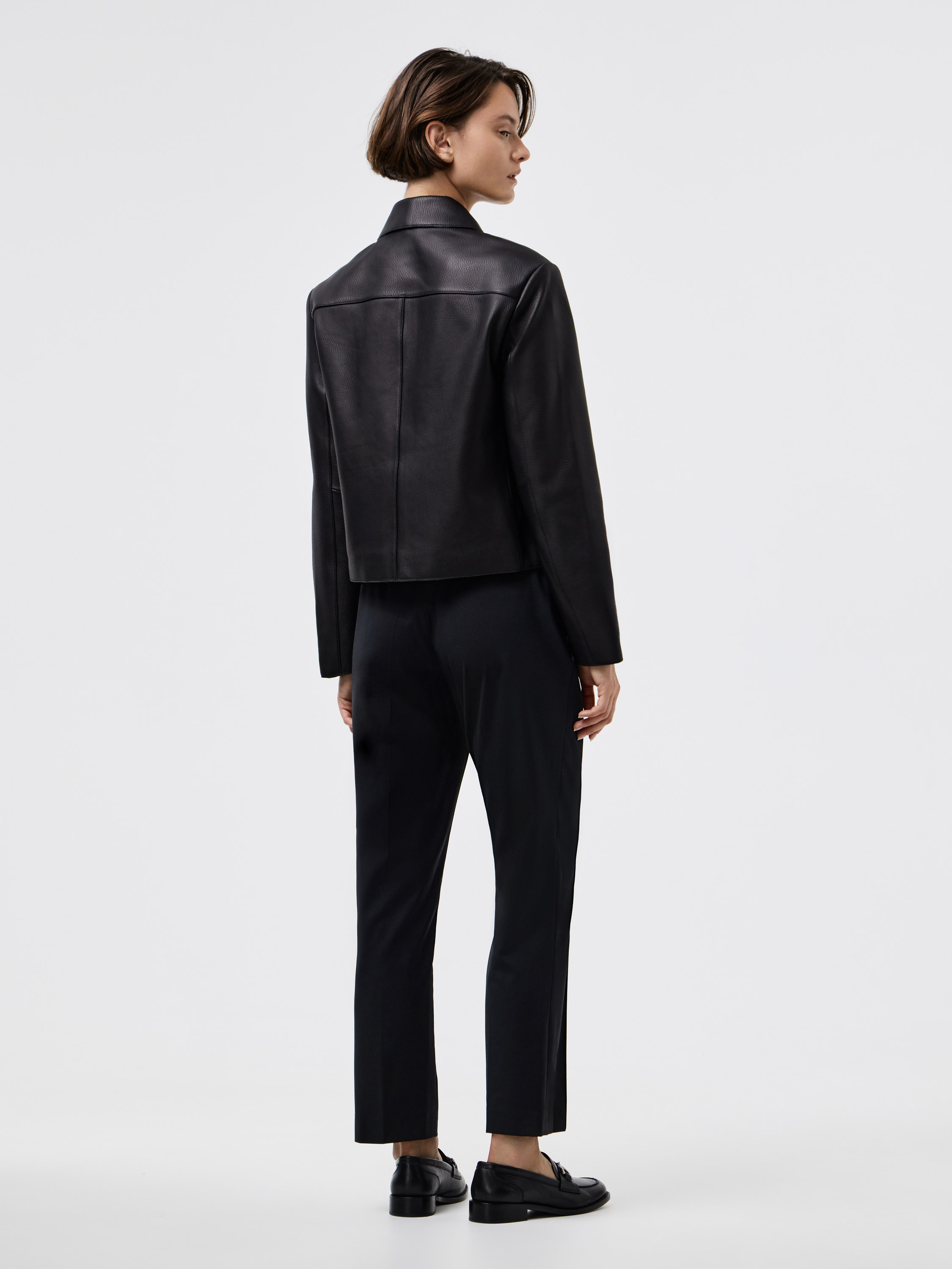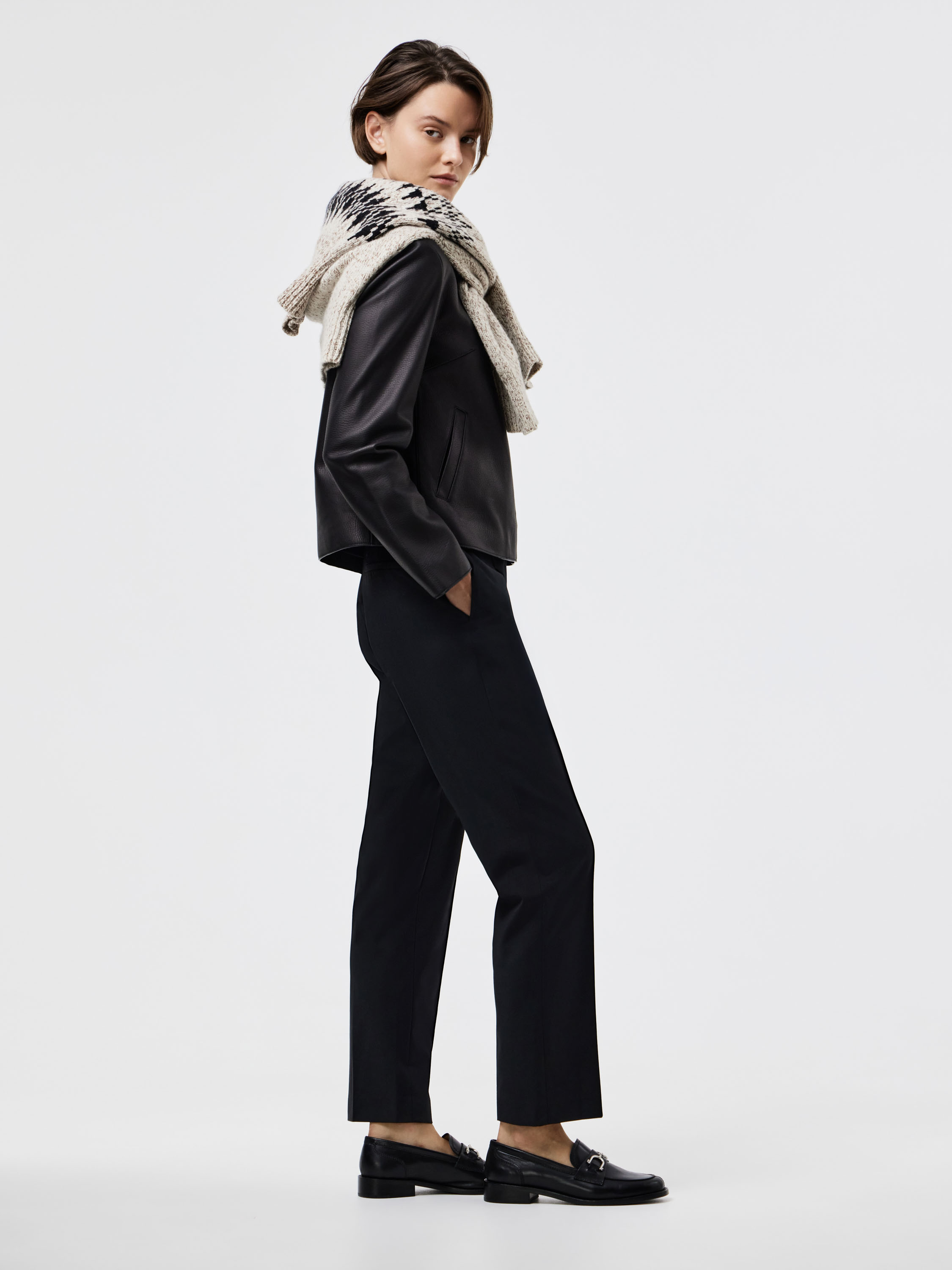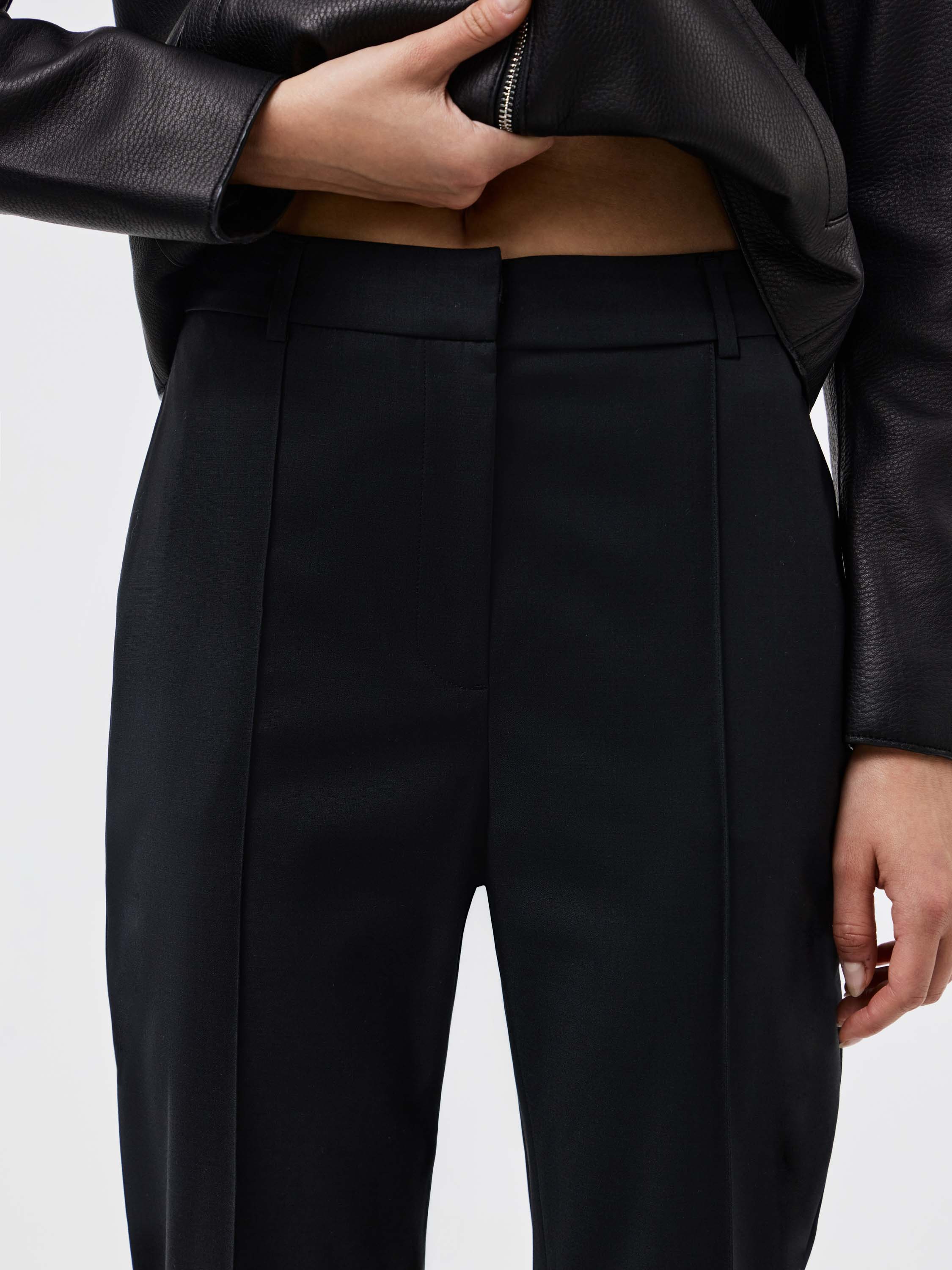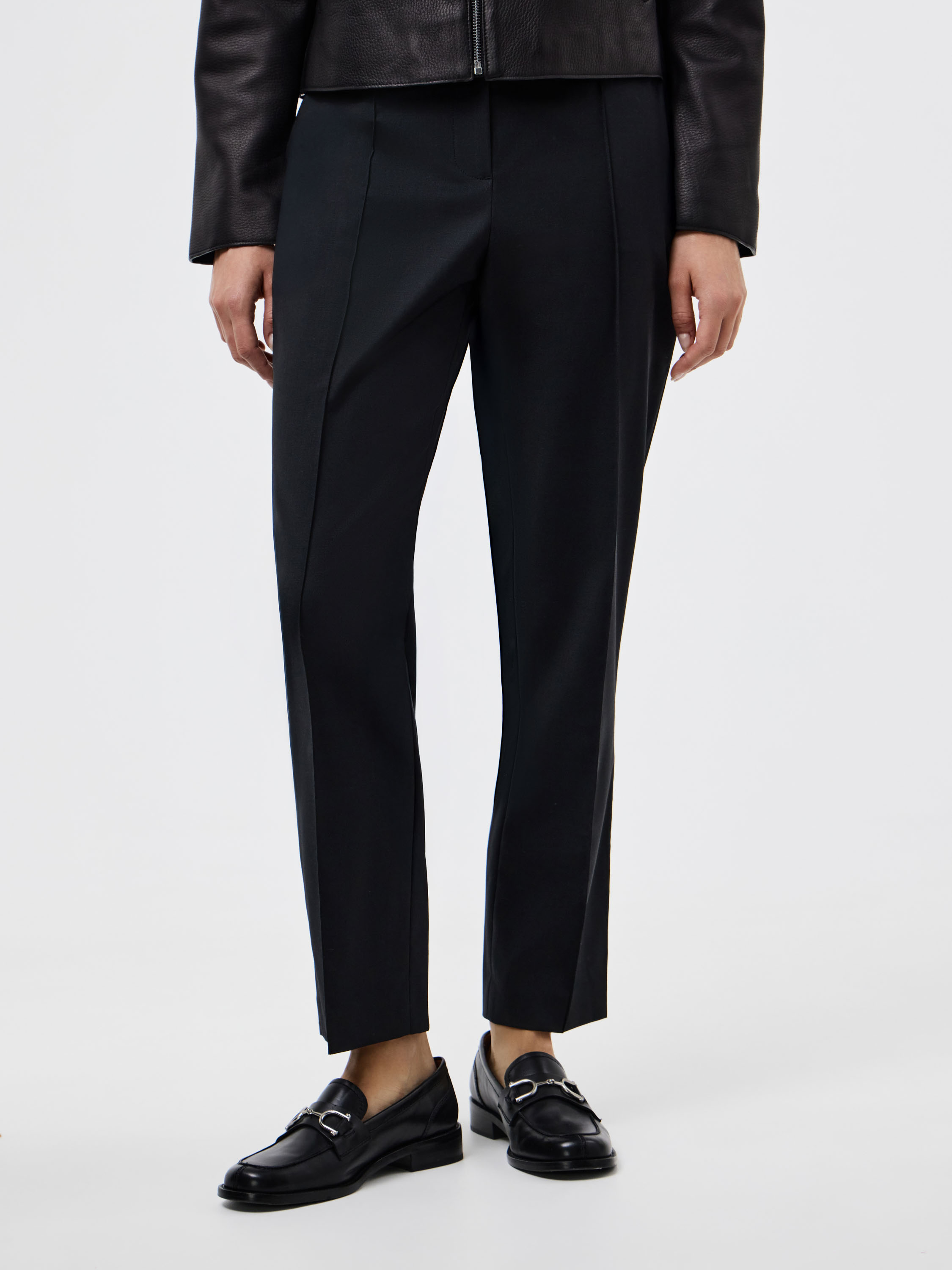 Брюки прямого кроя из смесовой ткани на основе шерсти. Плотный материал держит форму и подчеркивает четкость силуэта. Лаконичный дизайн дополнен стрелками, которые визуально вытягивают линию ноги и придают образу собранность. Универсальная длина позволяет сочетать модель как с классической обувью, так и с более расслабленными вариантами. Такой крой делает брюки базовым элементом гардероба, подходящим для деловых и повседневных сочетаний.