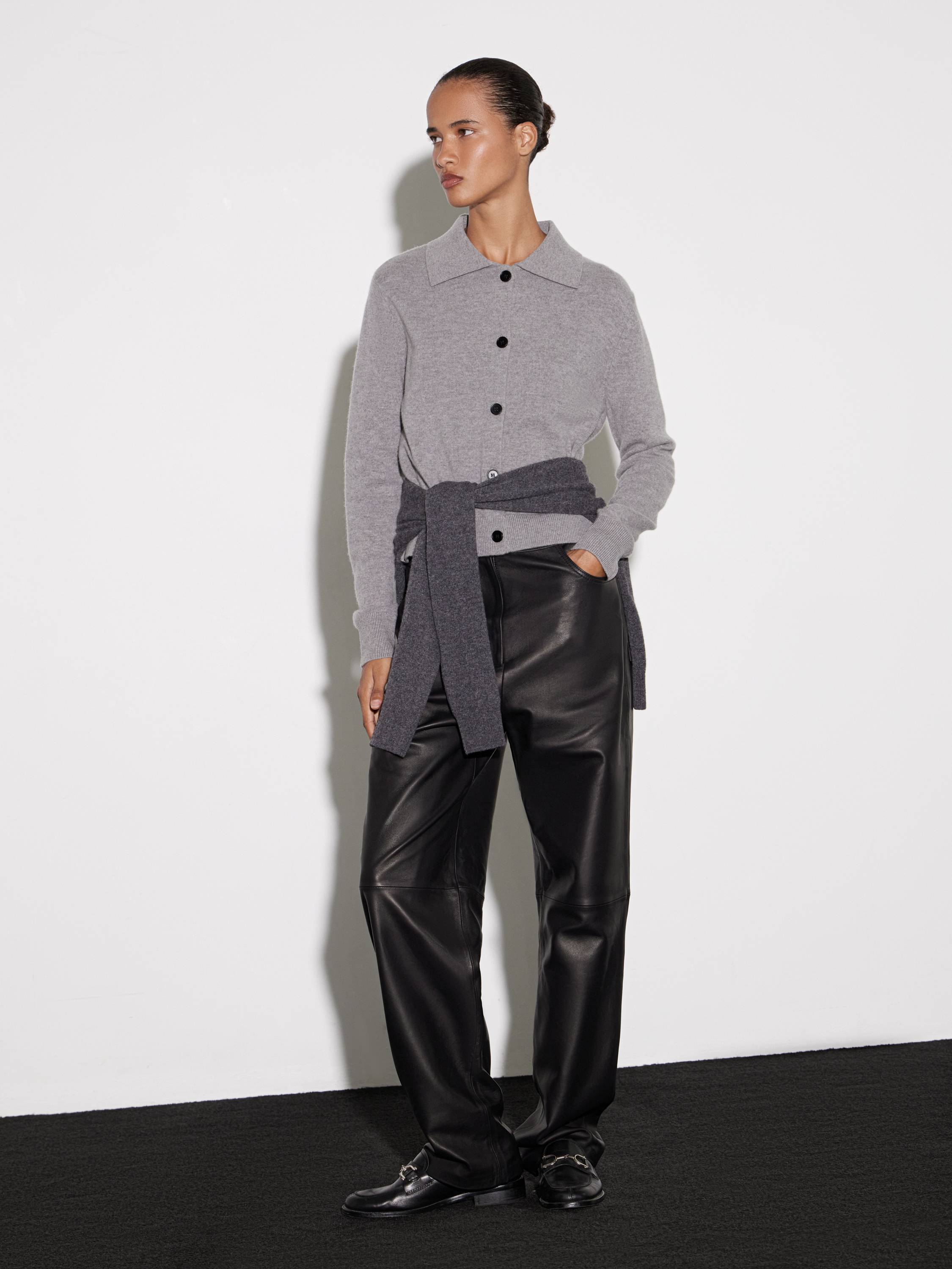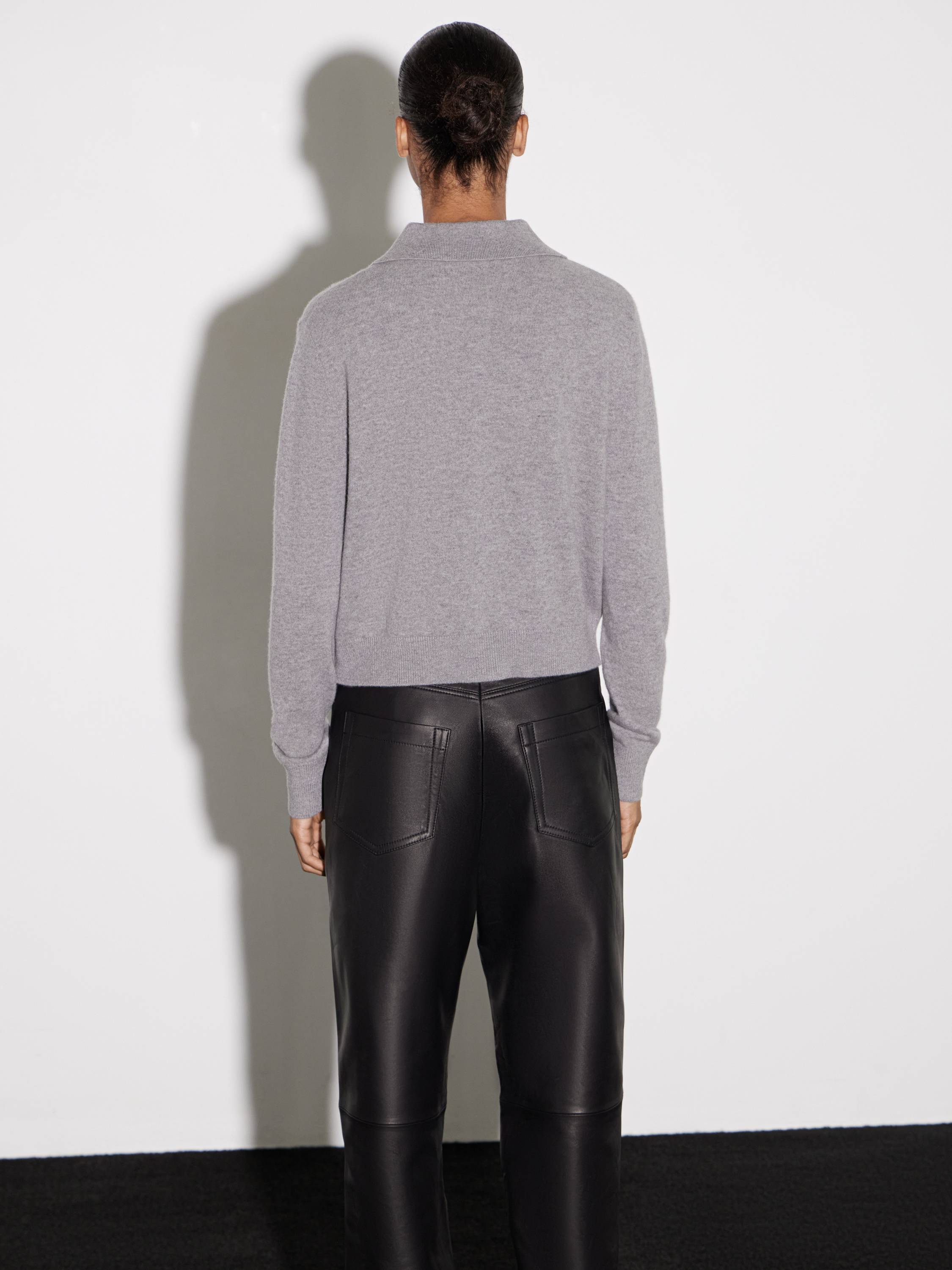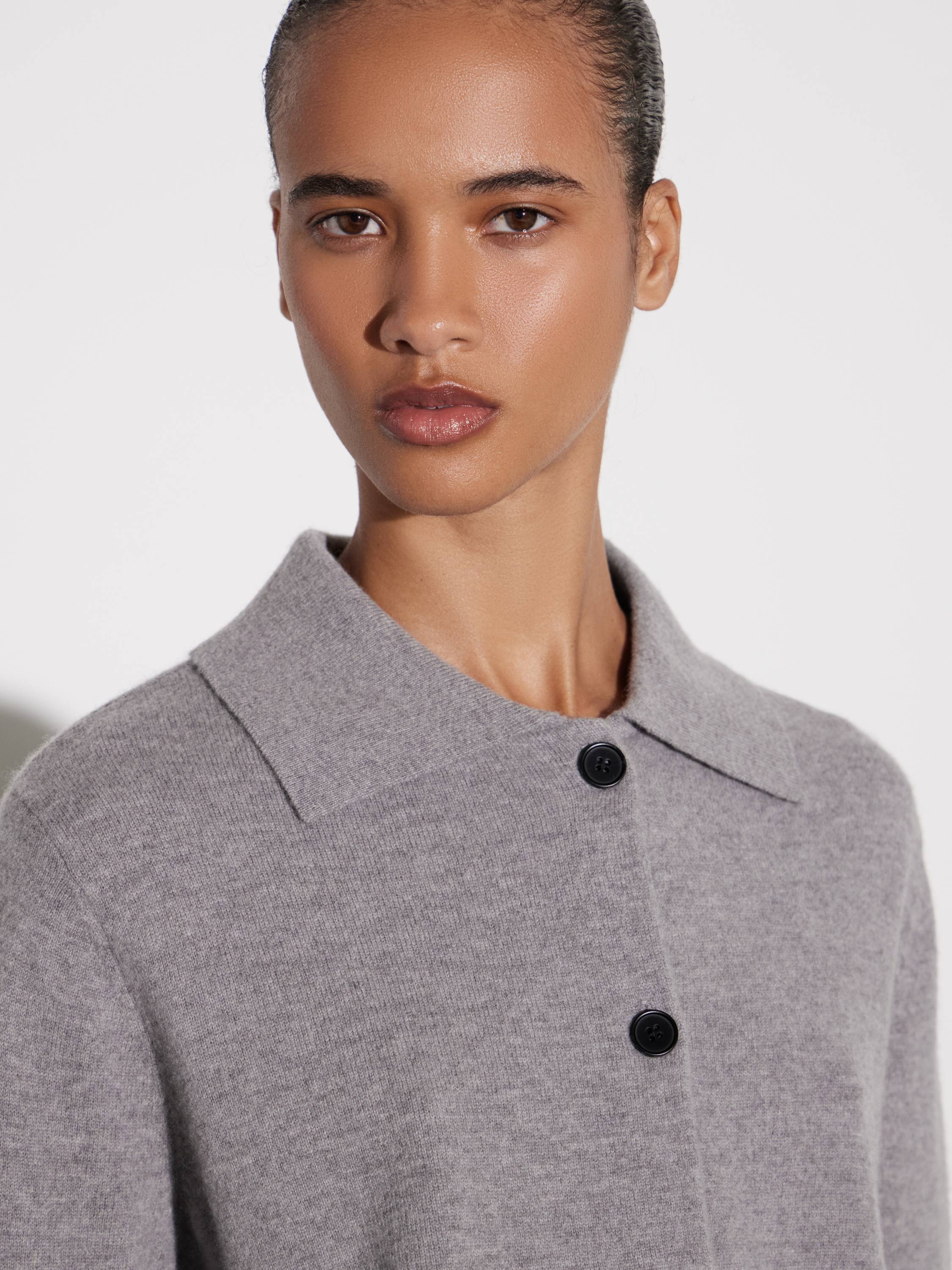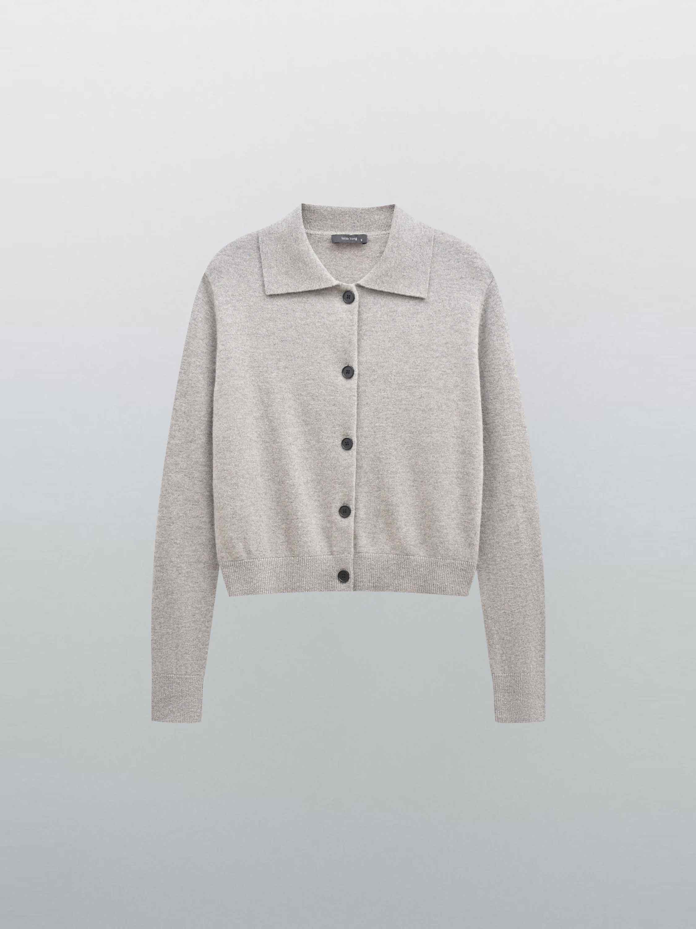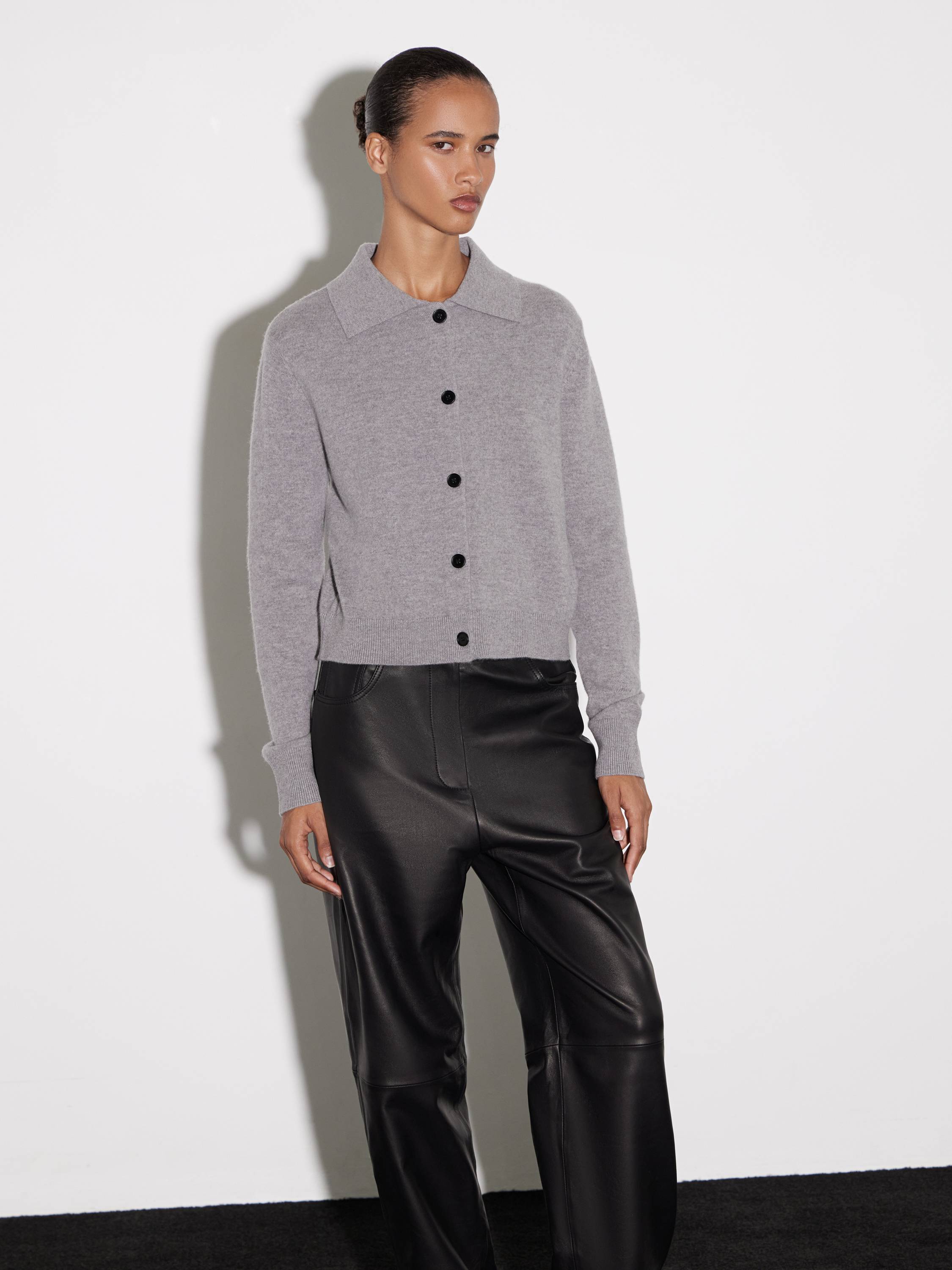 Кардиган из шерсти в молочном оттенке с отложным воротником. Материал мягкий, теплый, с однородной фактурой и тактильным комфортом. Крой прямой, длина укороченная, что делает модель универсальной для сочетаний с брюками и юбками. Застежка на контрастные пуговицы добавляет графичный акцент в минималистичный силуэт. Манжеты и низ оформлены аккуратной резинкой, поддерживающей форму изделия.