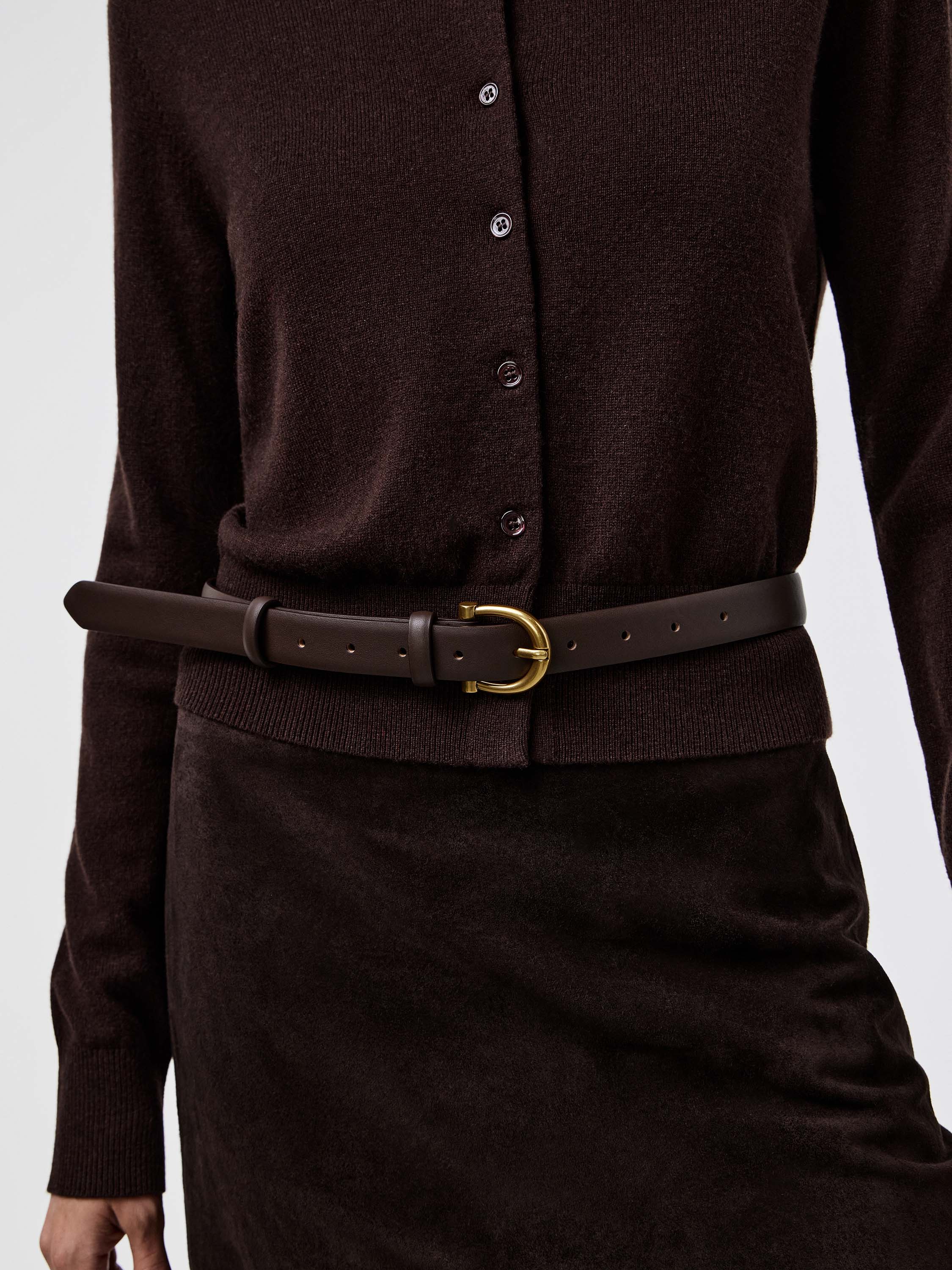 Ремень из натуральной кожи с гладкой фактурой и классической пряжкой лаконичной формы. Универсальная модель, которая акцентирует талию и вписывается как в повседневные, так и в более строгие образы. Сочетается с платьями, пальто и брюками, добавляя завершенность силуэту. Пряжка выполнена из металла с мягким блеском, а продуманная ширина ремня делает его удобным и гармоничным акцентом в комплекте.