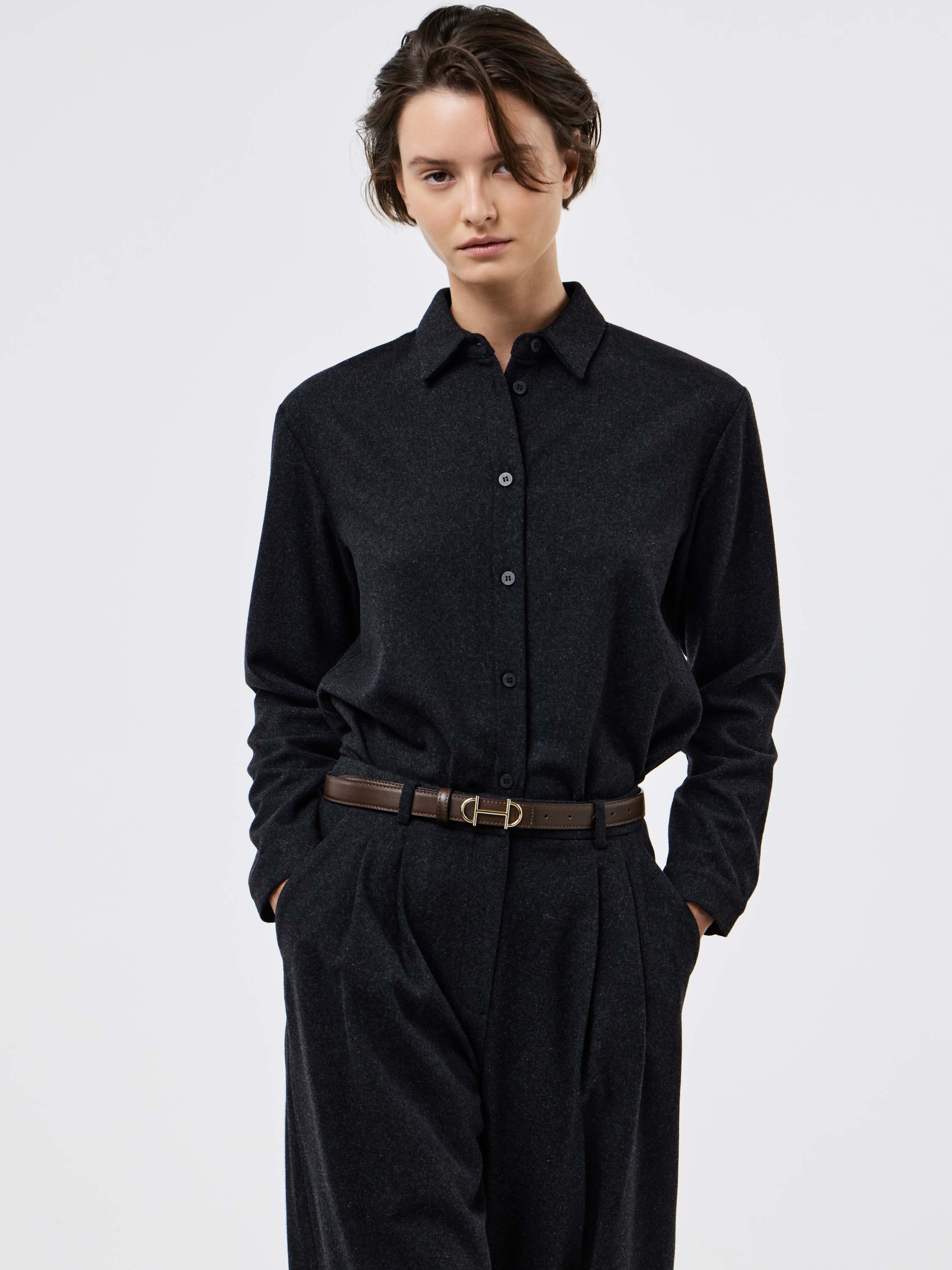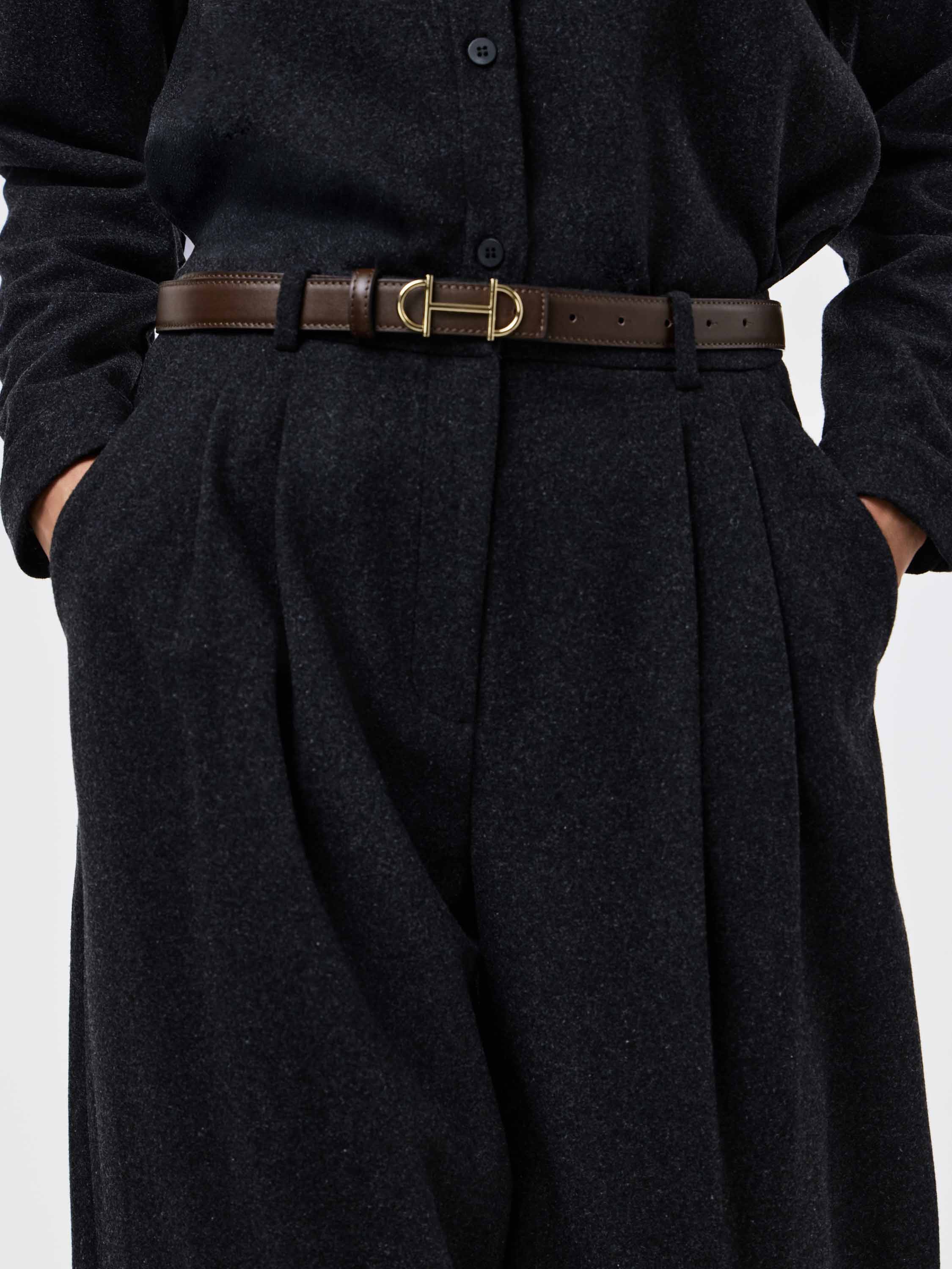 Ремень выполнен из гладкой натуральной кожи и дополнен классической металлической пряжкой с благородным матовым блеском. Лаконичный дизайн подчеркивает универсальность модели: ее можно носить как с джинсами и брюками, так и с юбками или платьями, акцентируя линию талии. Средняя ширина ремня позволяет использовать его в разных комплектах, а плотная кожа сохраняет форму и аккуратный силуэт при носке. Минималистичный характер аксессуара делает его актуальным на каждый день, органично вписываясь в современный гардероб.
