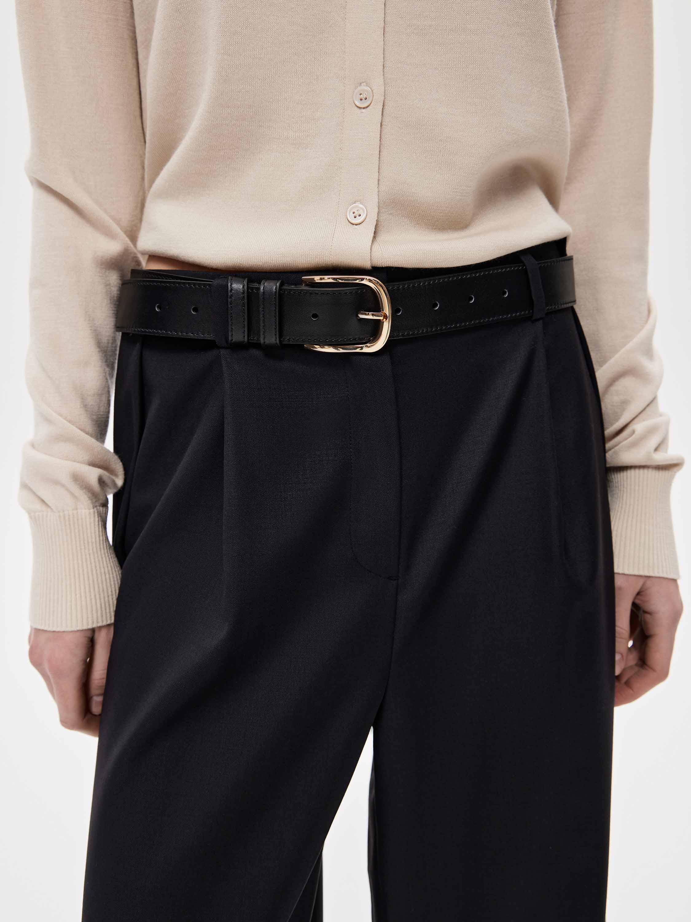 Ремень выполнен из гладкой мягкой кожи и дополнен классической пряжкой в благородном золотистом тоне. Чистый силуэт и ровная кожаная фактура подчеркивают сдержанную эстетику модели, а умеренная ширина делает ее универсальной в носке. Аксессуар органично вписывается в повседневный гардероб, сочетаясь с брюками из кожи, костюмными моделями и денимом, добавляя образу аккуратный, выверенный акцент.