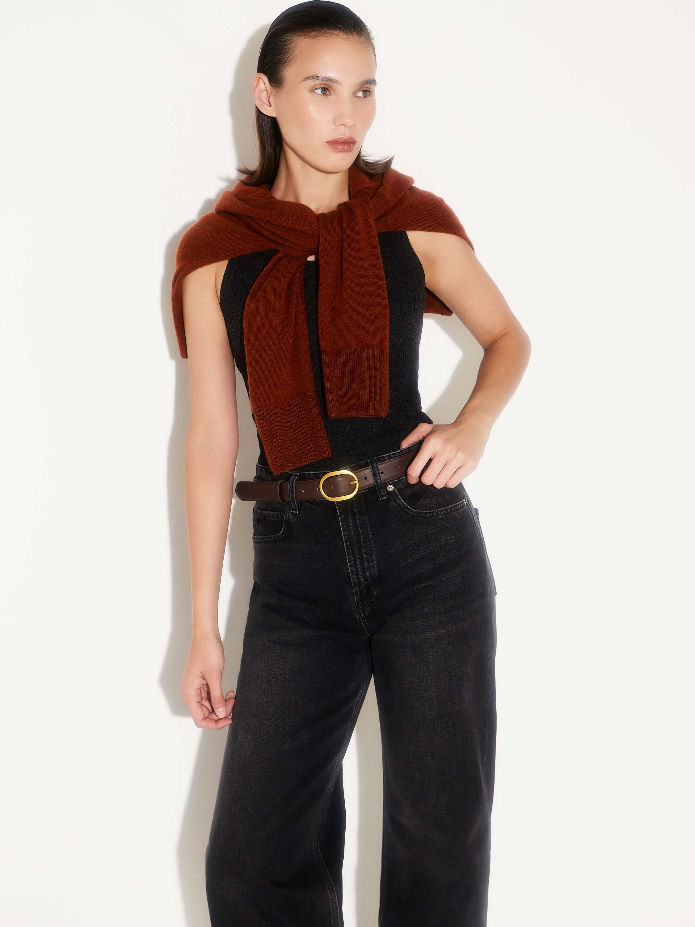 Ремень из плотной гладкой замши с овальной пряжкой в оттенке матового золота. Минимальные детали, выверенные пропорции, благородный блеск фурнитуры. Он добавляет четкость силуэту, работает как акцент и сохраняет лаконичность образа — будь то джинсы, костюмные брюки или платье из плотной ткани.