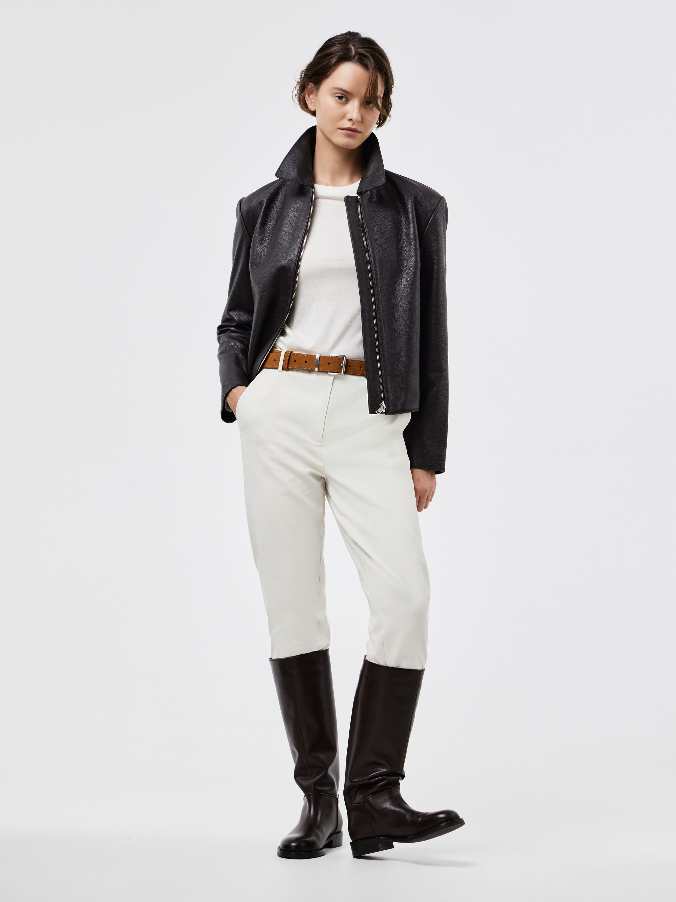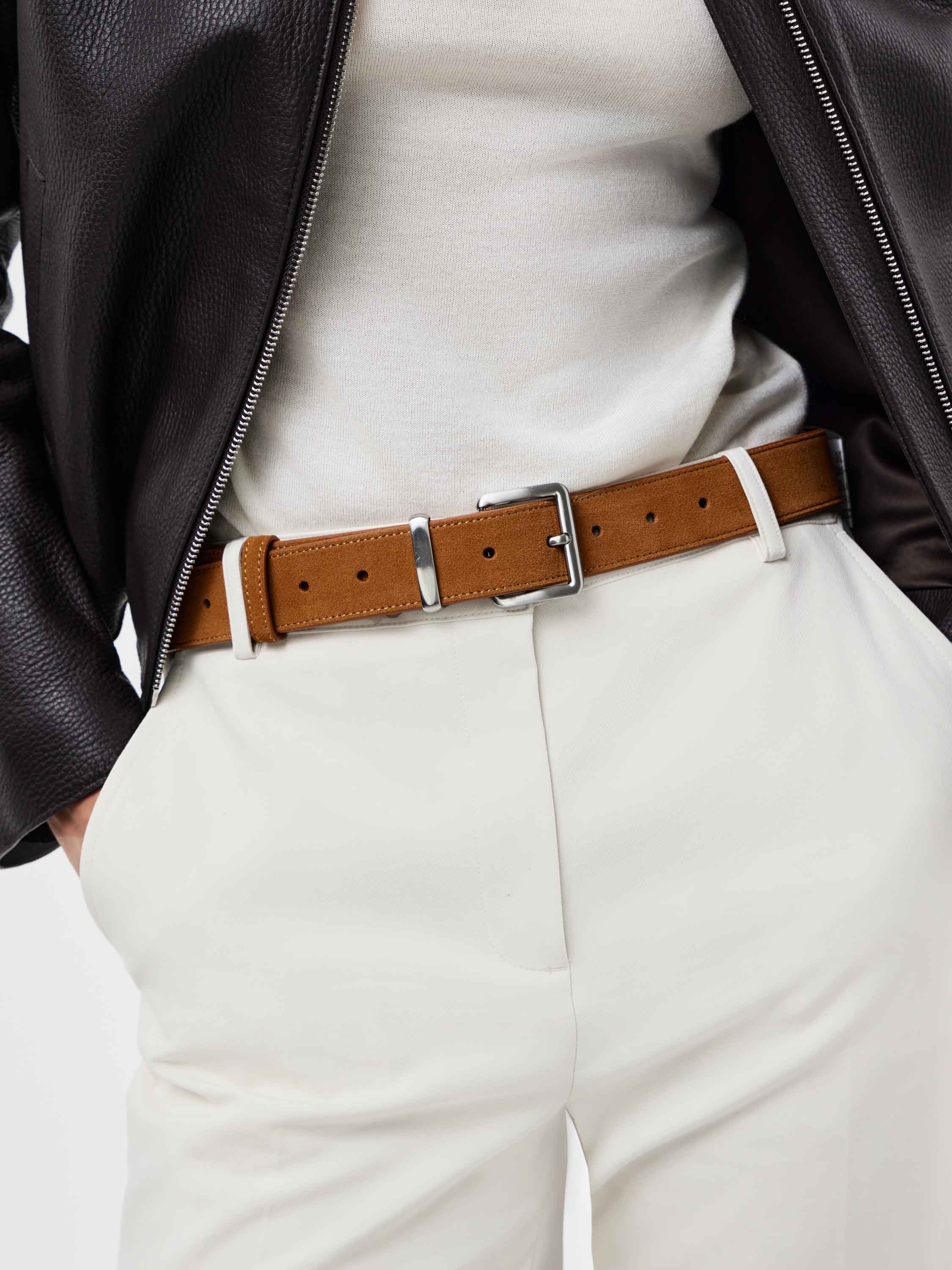 Ремень из мягкой замши с классической пряжкой — акцентный аксессуар, который легко вписывается в повседневный и деловой гардероб. Матовая фактура придает изделию глубину и выразительность, а лаконичный дизайн делает его универсальным решением для разных сочетаний — от брюк строгого кроя до джинсов. Теплый оттенок кожи подчеркивает современный характер и добавляет образу завершенности.