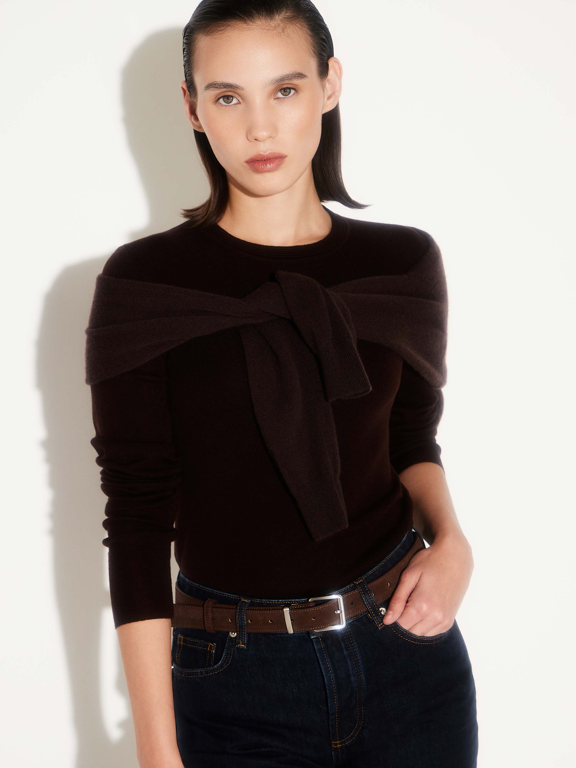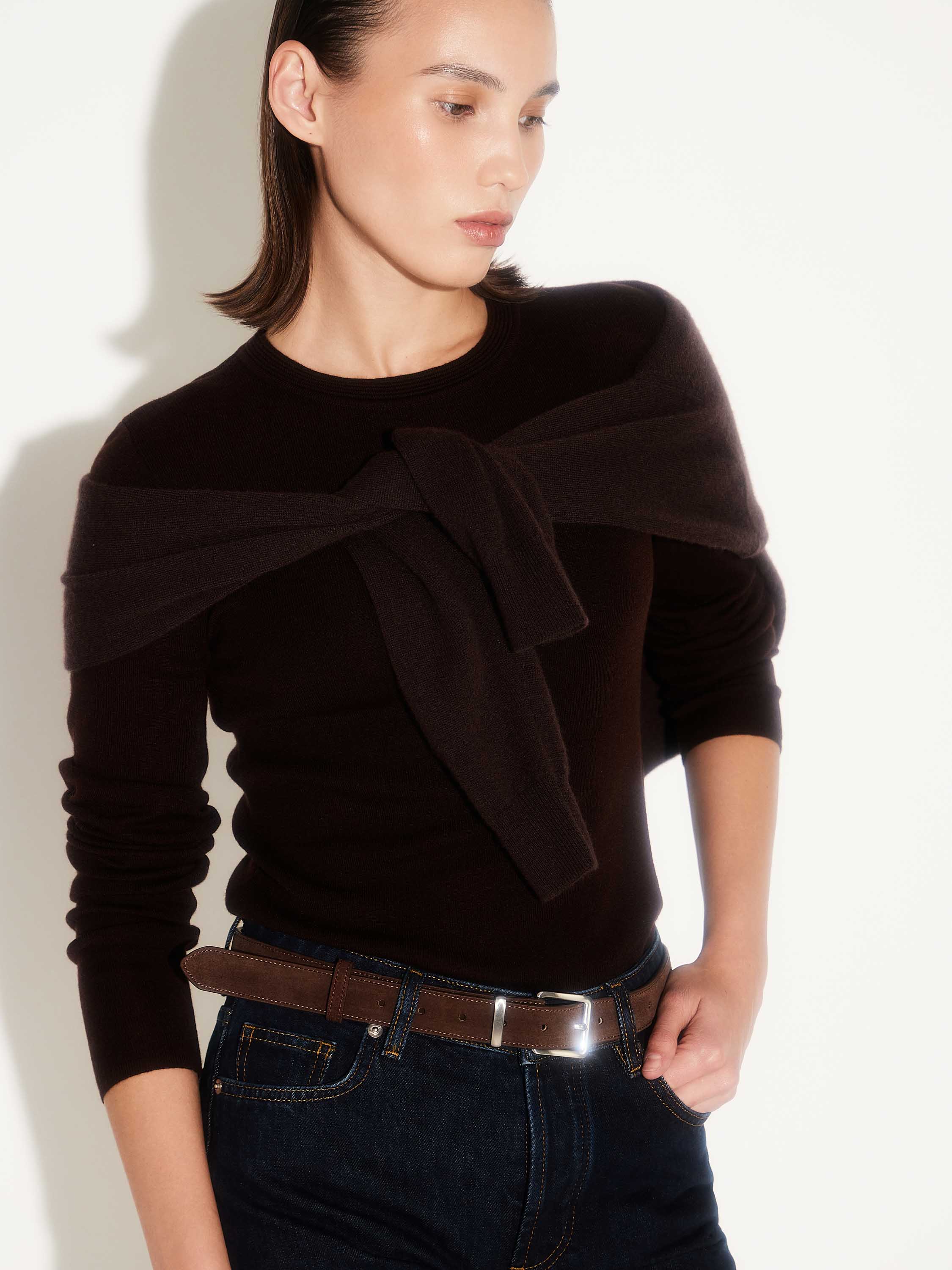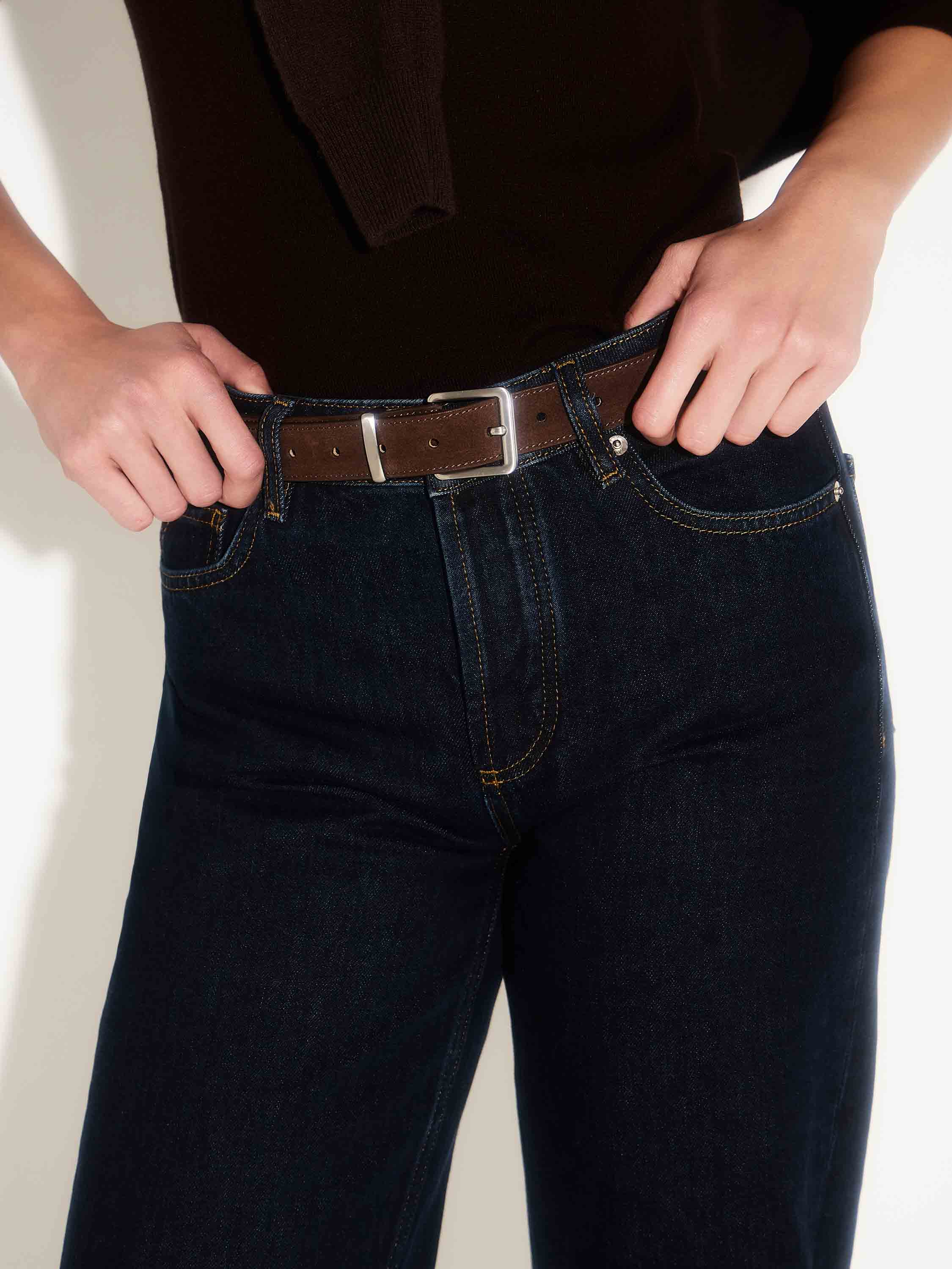 Ремень из мягкой замши с матовой фактурой и гладкой подкладкой из натуральной кожи. Классическая пряжка из полированного металла подчеркивает лаконичность и универсальность аксессуара. Благодаря умеренной ширине ремень подходит для джинсов, брюк и платьев, добавляя образу завершенность и аккуратный акцент.