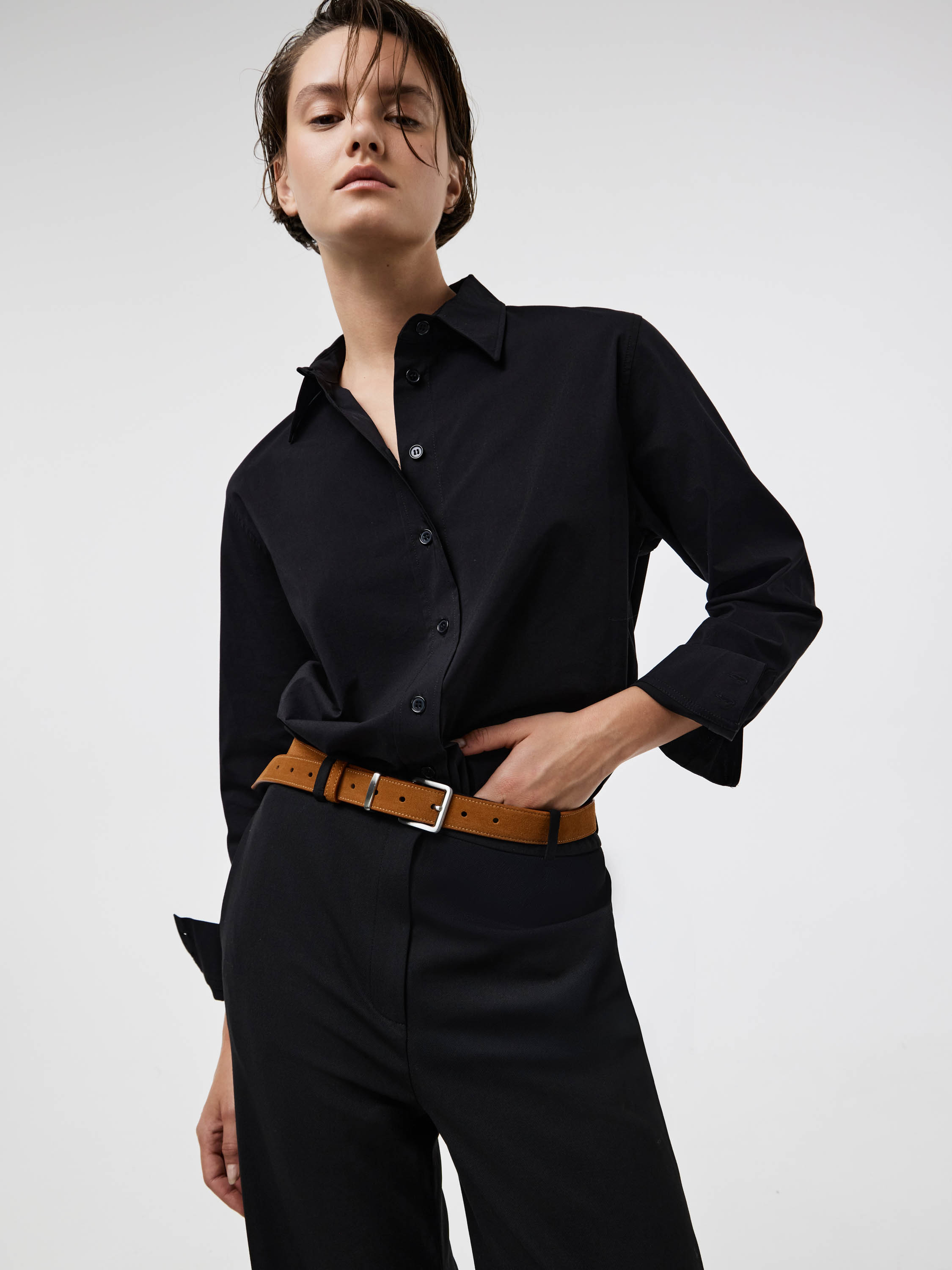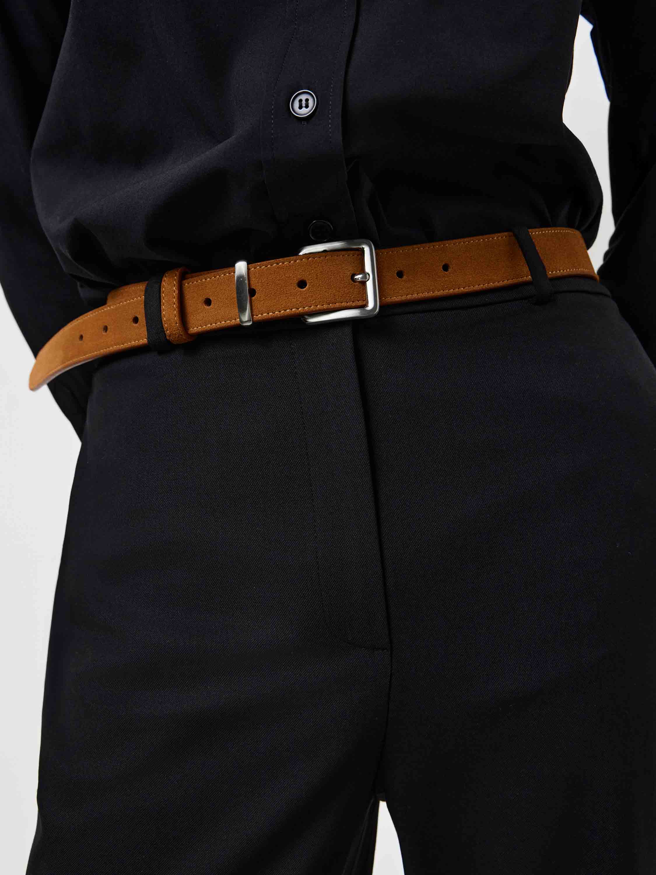 Ремень из мягкой замши с матовой фактурой и гладкой подкладкой из натуральной кожи. Классическая пряжка из полированного металла подчеркивает лаконичность и универсальность аксессуара. Благодаря умеренной ширине ремень подходит для джинсов, брюк и платьев, добавляя образу завершенность и аккуратный акцент.