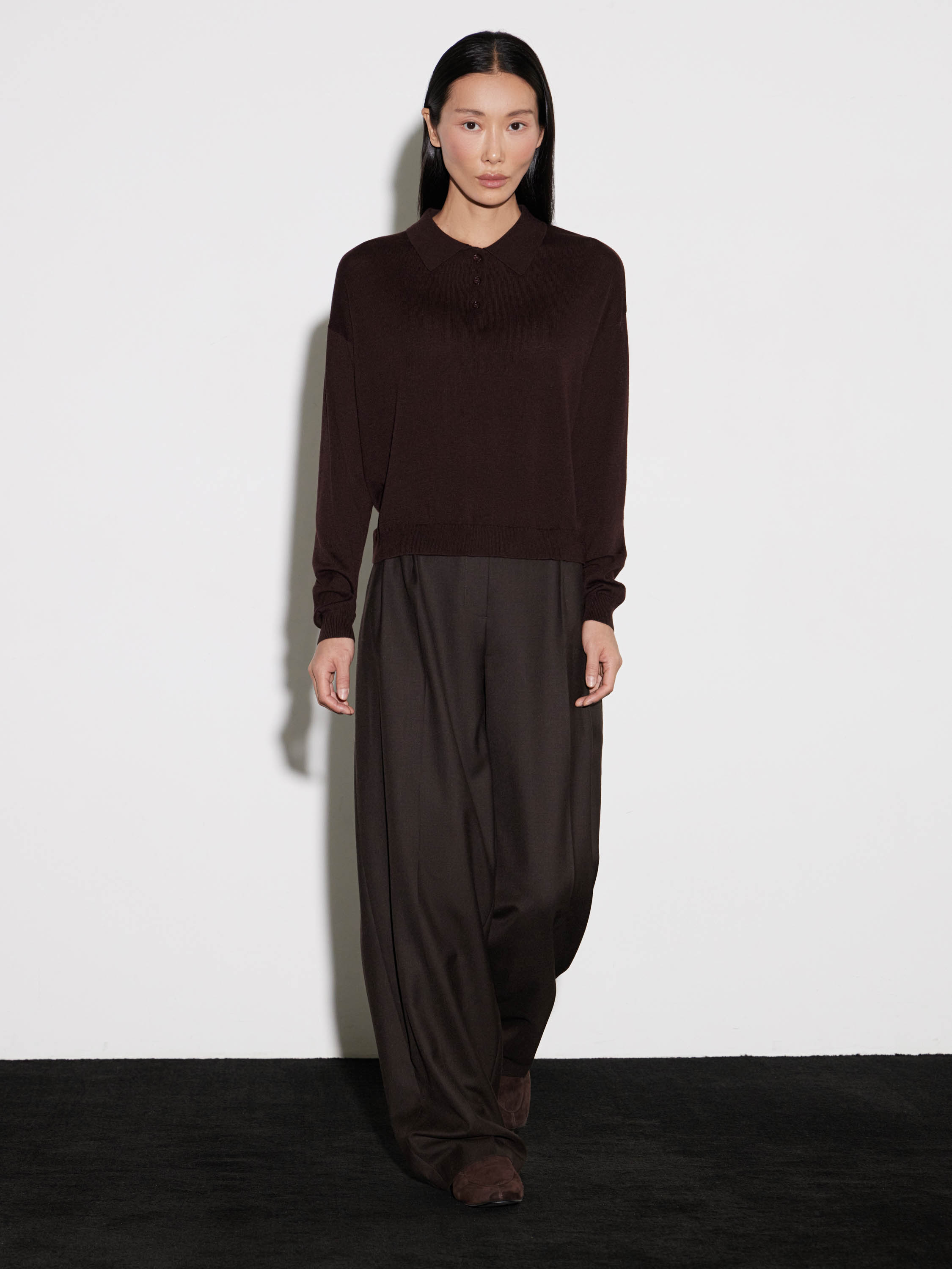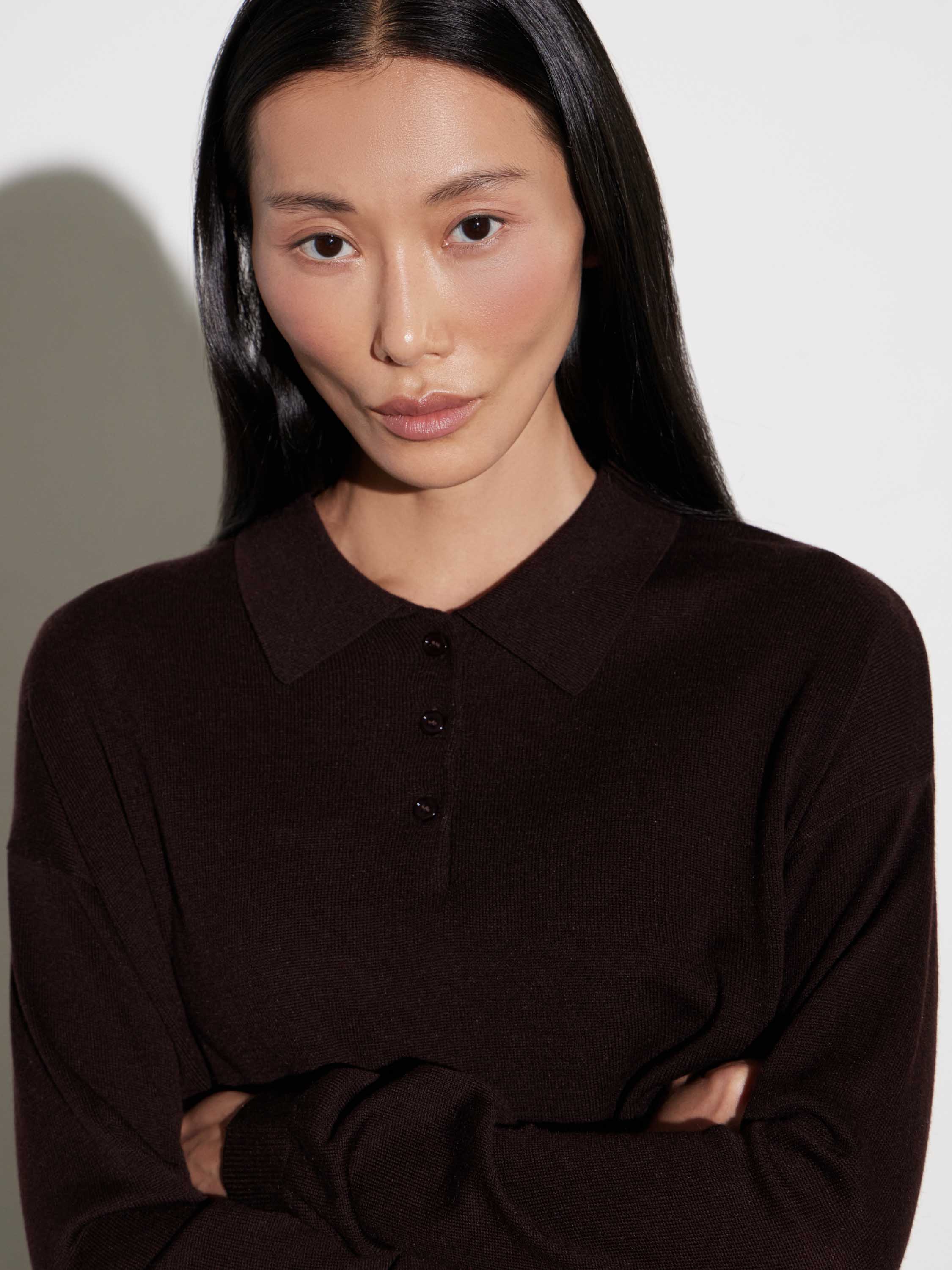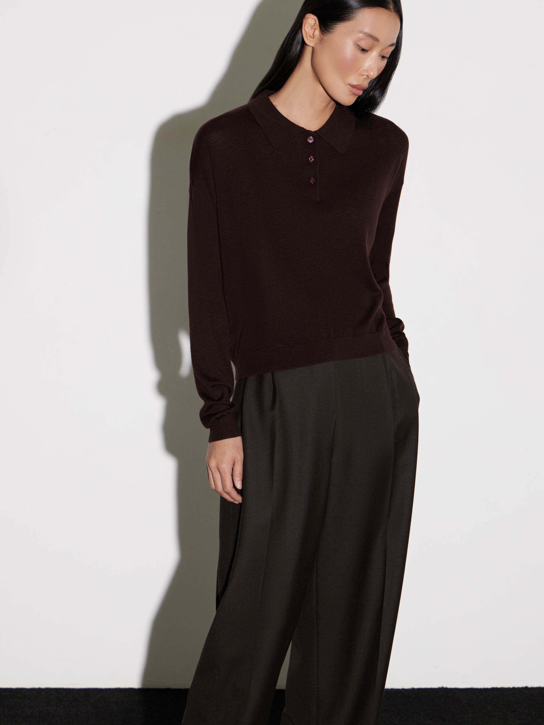 Джемпер поло с длинным рукавом выполнен из мягкого смесового полотна с добавлением шерсти. Чистый силуэт с отложным воротником и планкой на пуговицах подчеркивает лаконичность модели. Трикотаж пластичный и комфортный, хорошо держит форму и подходит для повседневного ношения. Манжеты и низ оформлены аккуратной резинкой, создающей завершенность. Универсальная база, которая вписывается как в расслабленные, так и в более собранные образы — работает с брюками, юбками и многослойными комплектами.