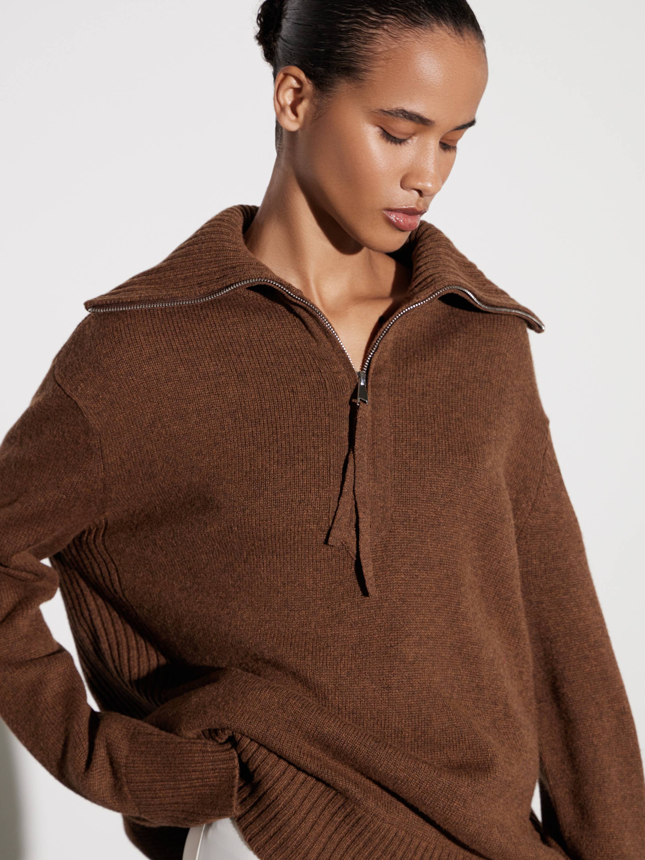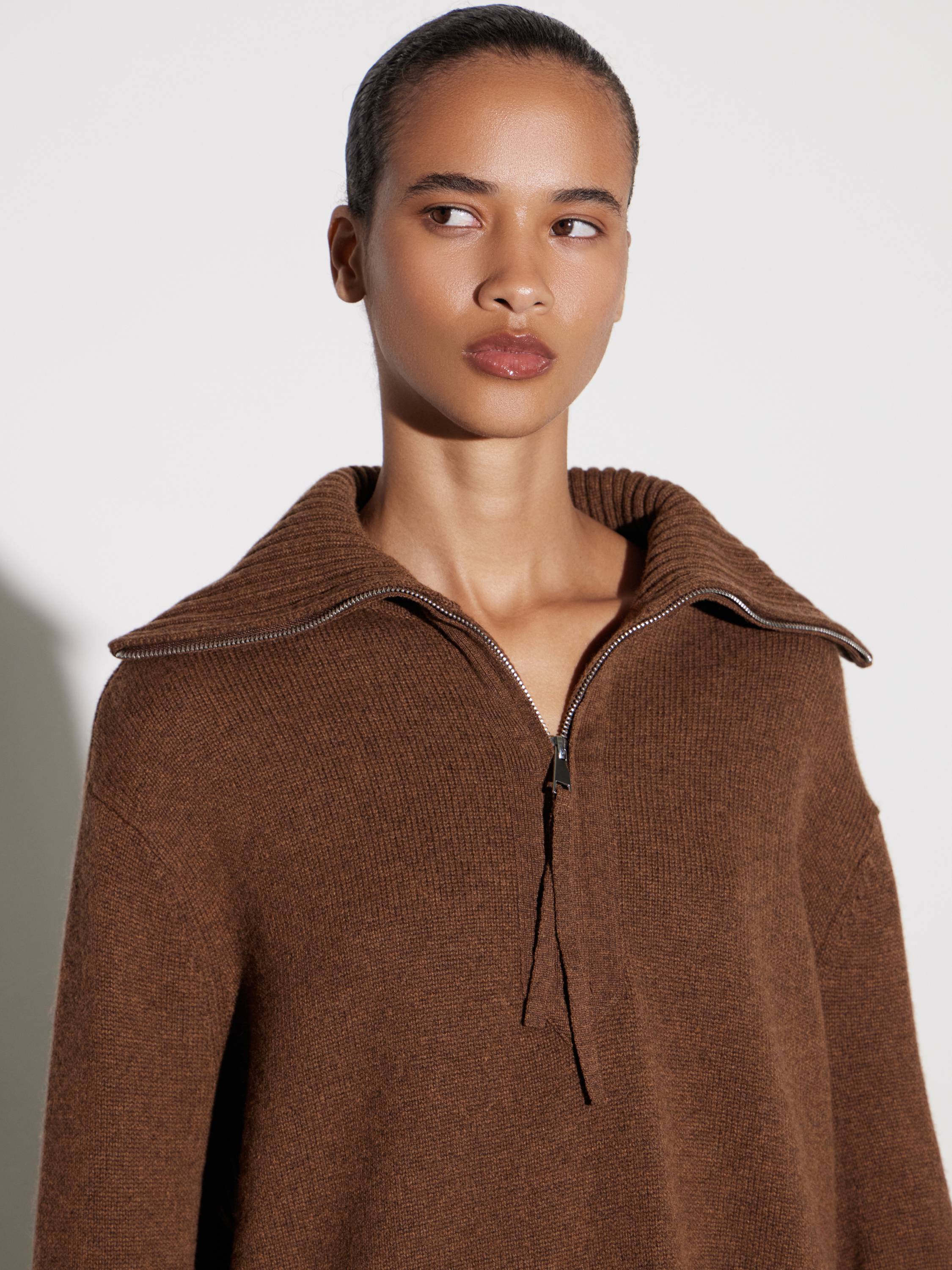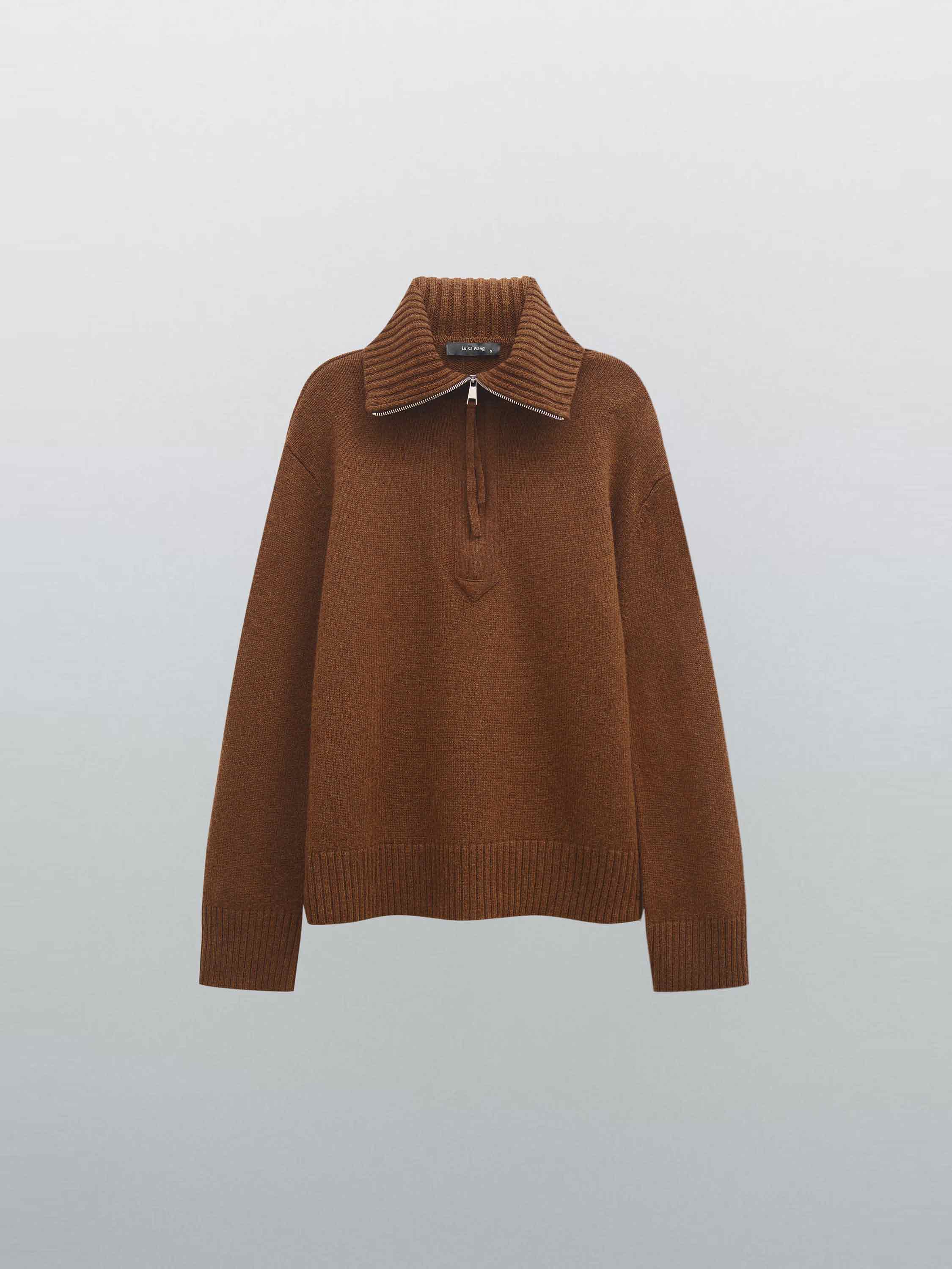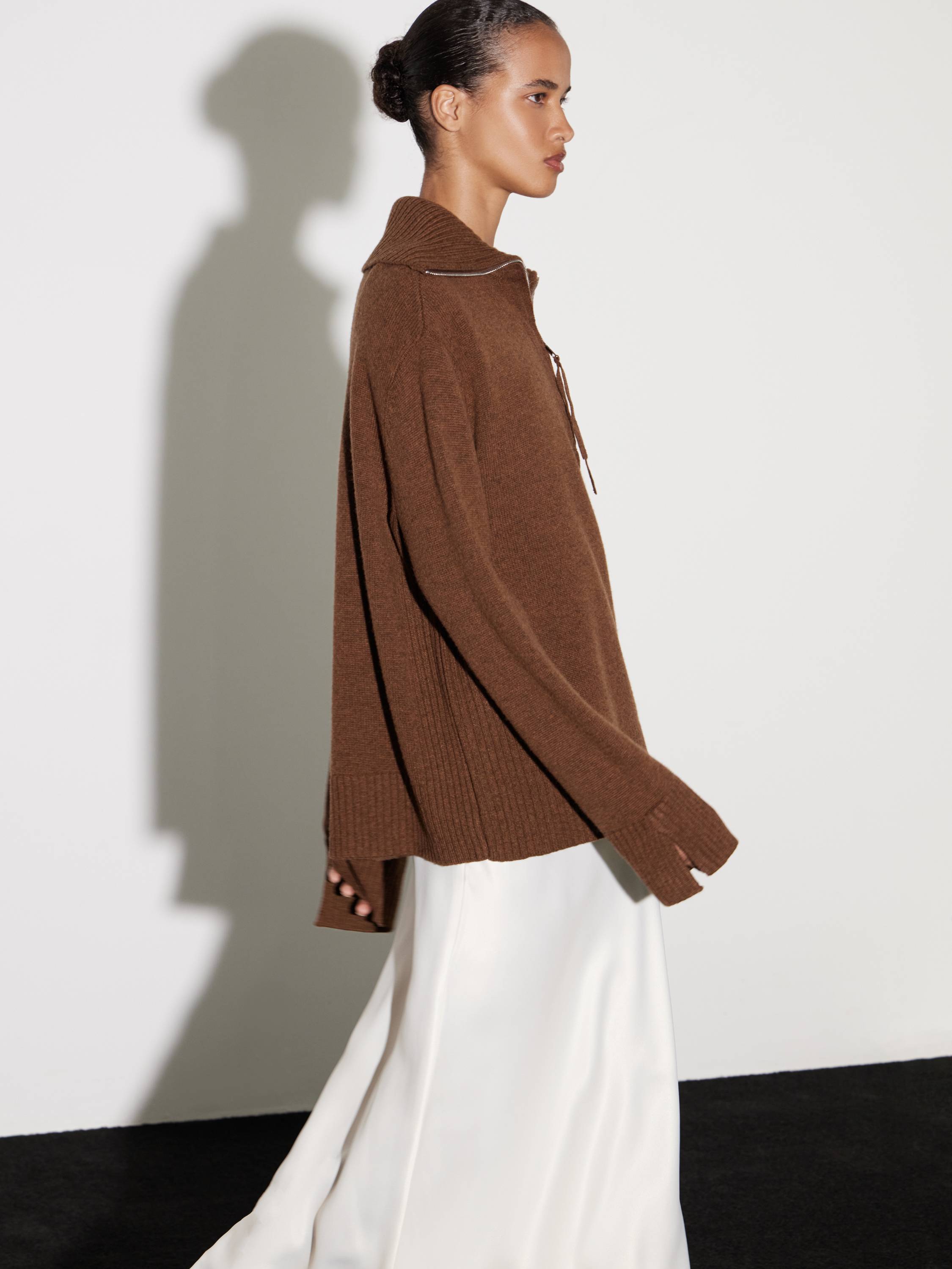 Удлиненный джемпер свободного силуэта, выполненный из мягкой шерсти с добавлением кашемира и шелка. Плотная вязка держит форму, а широкий воротник-поло с молнией позволяет менять конфигурацию выреза. Модель идеально ложится в многослойные комплекты — например, поверх лаконичных платьев из района, добавляя тепла и объема без утяжеления образа. Низ и манжеты оформлены эластичной резинкой, подчеркивающей объемный крой.