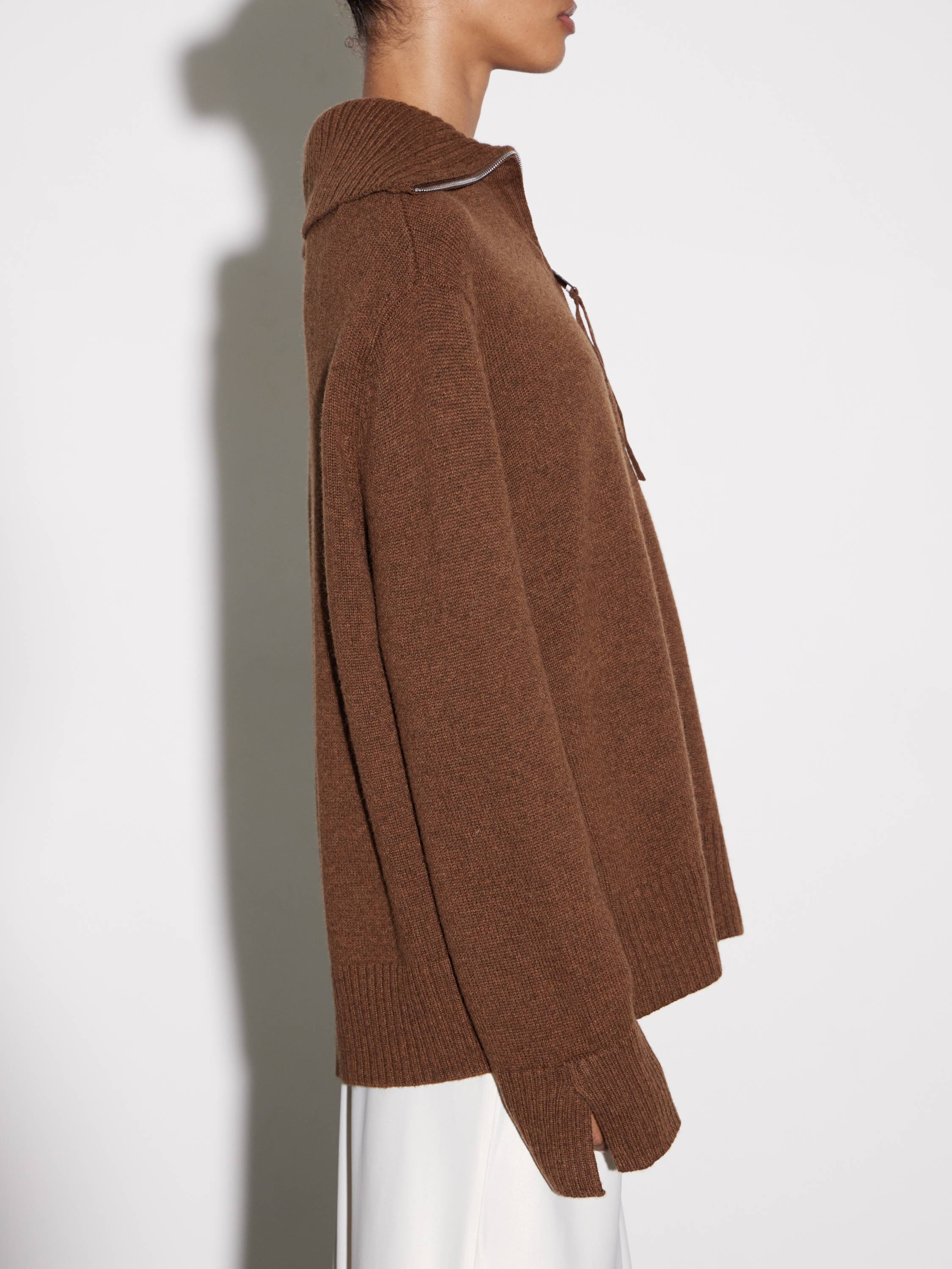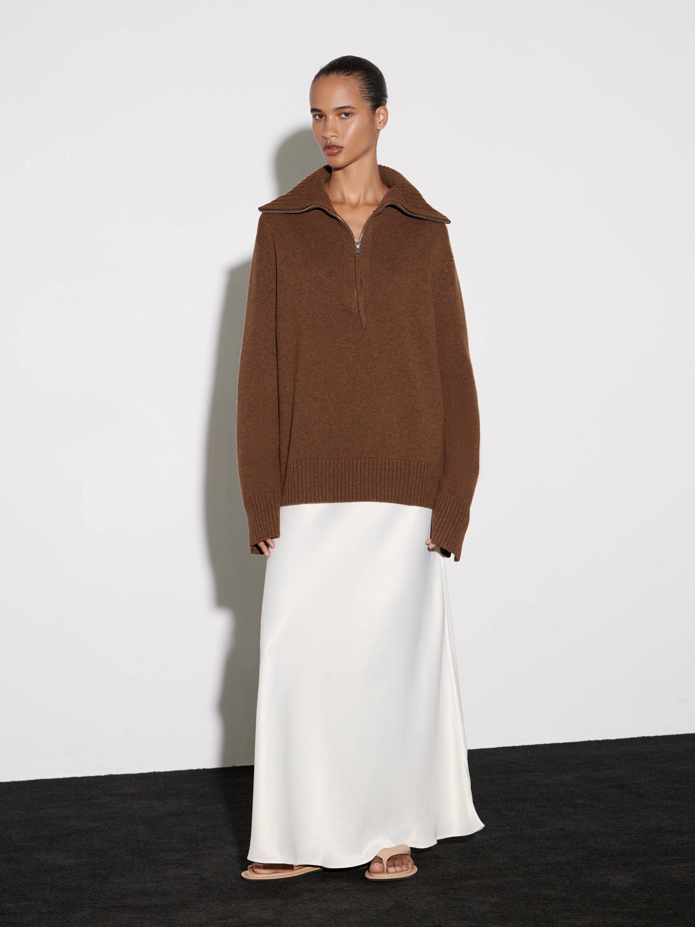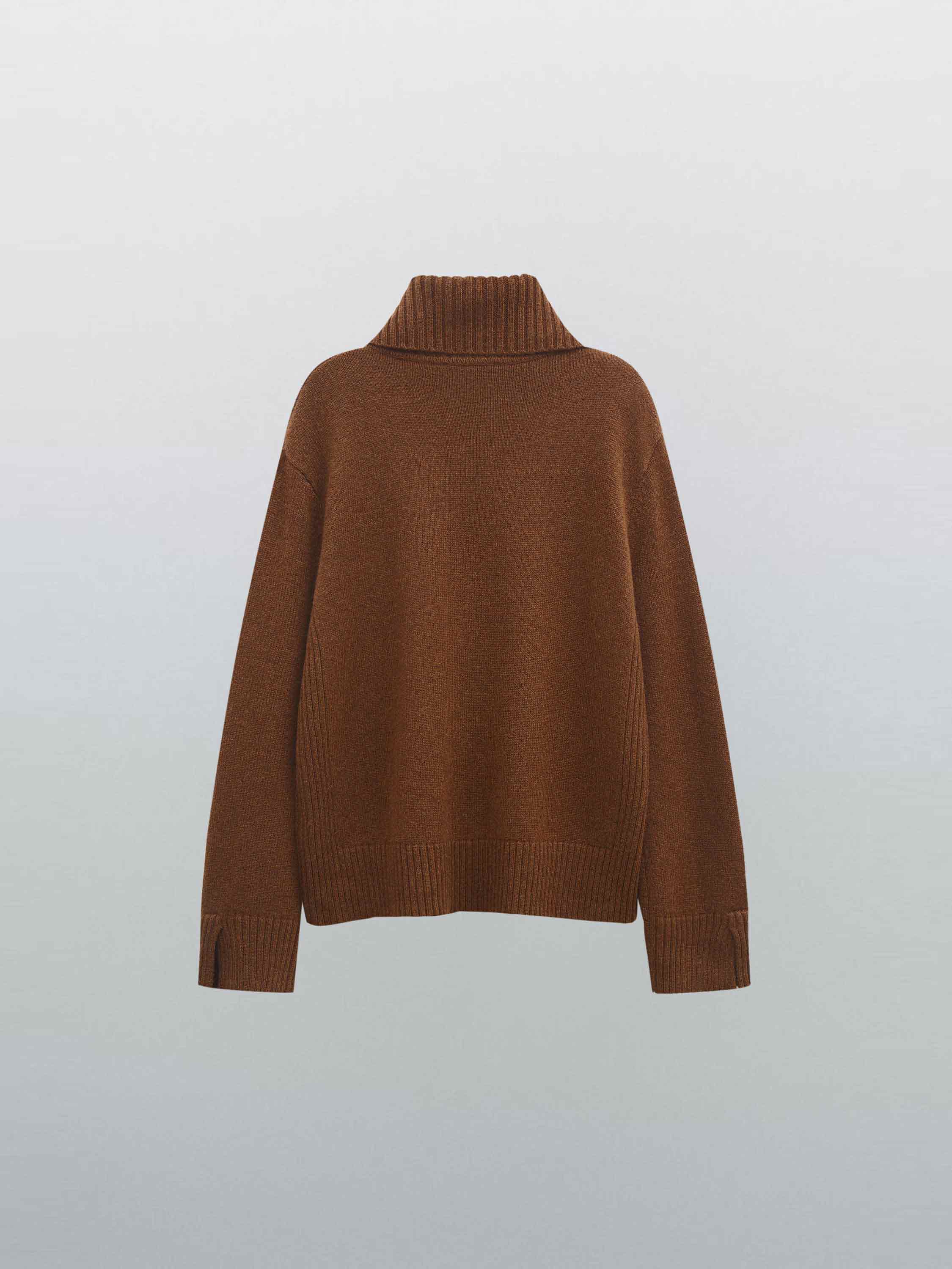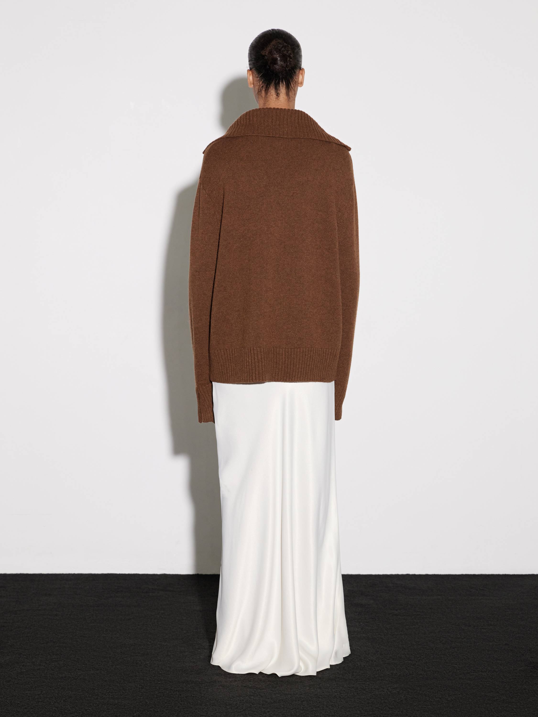 Удлиненный джемпер свободного силуэта, выполненный из мягкой шерсти с добавлением кашемира и шелка. Плотная вязка держит форму, а широкий воротник-поло с молнией позволяет менять конфигурацию выреза. Модель идеально ложится в многослойные комплекты — например, поверх лаконичных платьев из района, добавляя тепла и объема без утяжеления образа. Низ и манжеты оформлены эластичной резинкой, подчеркивающей объемный крой.