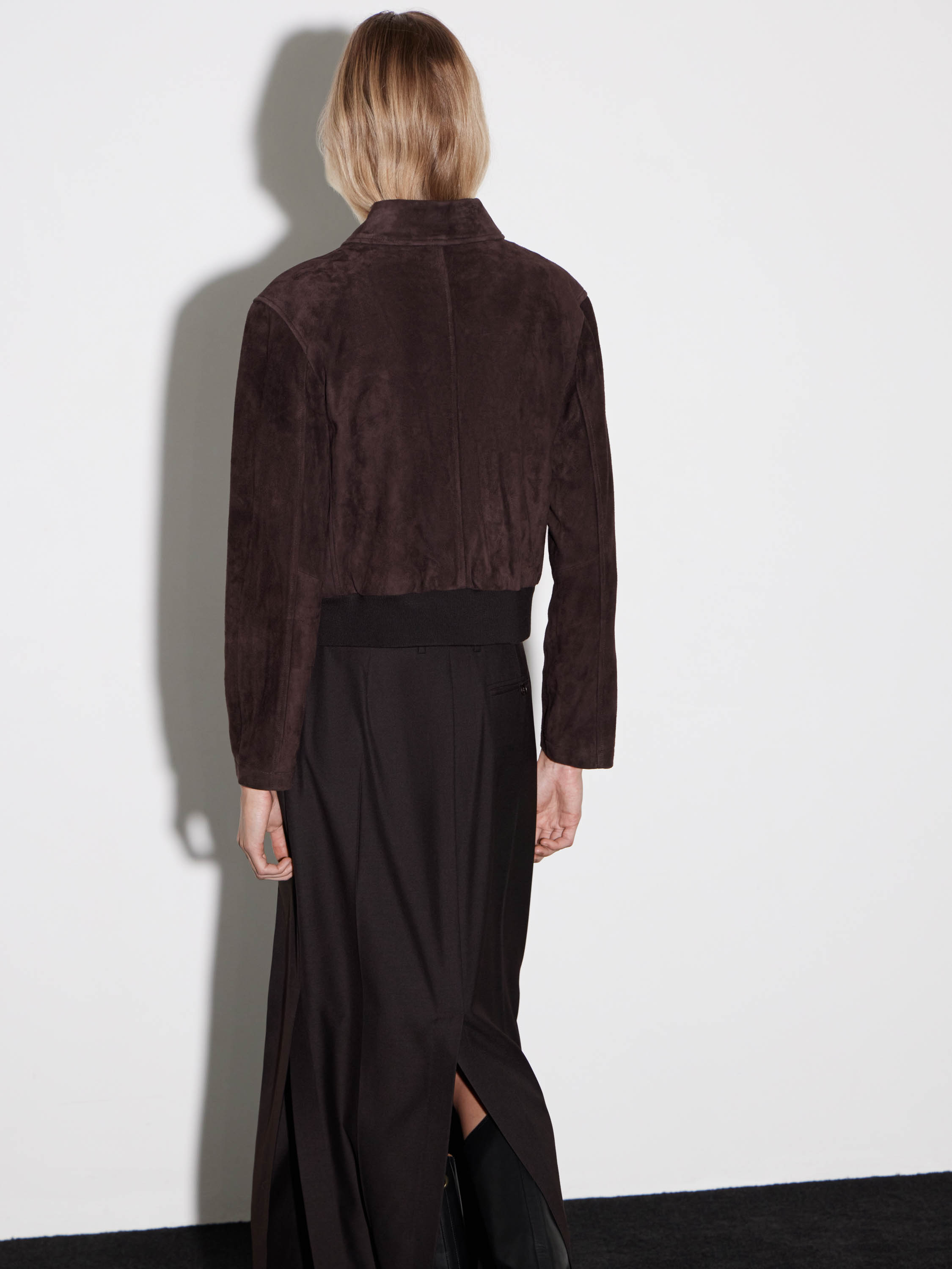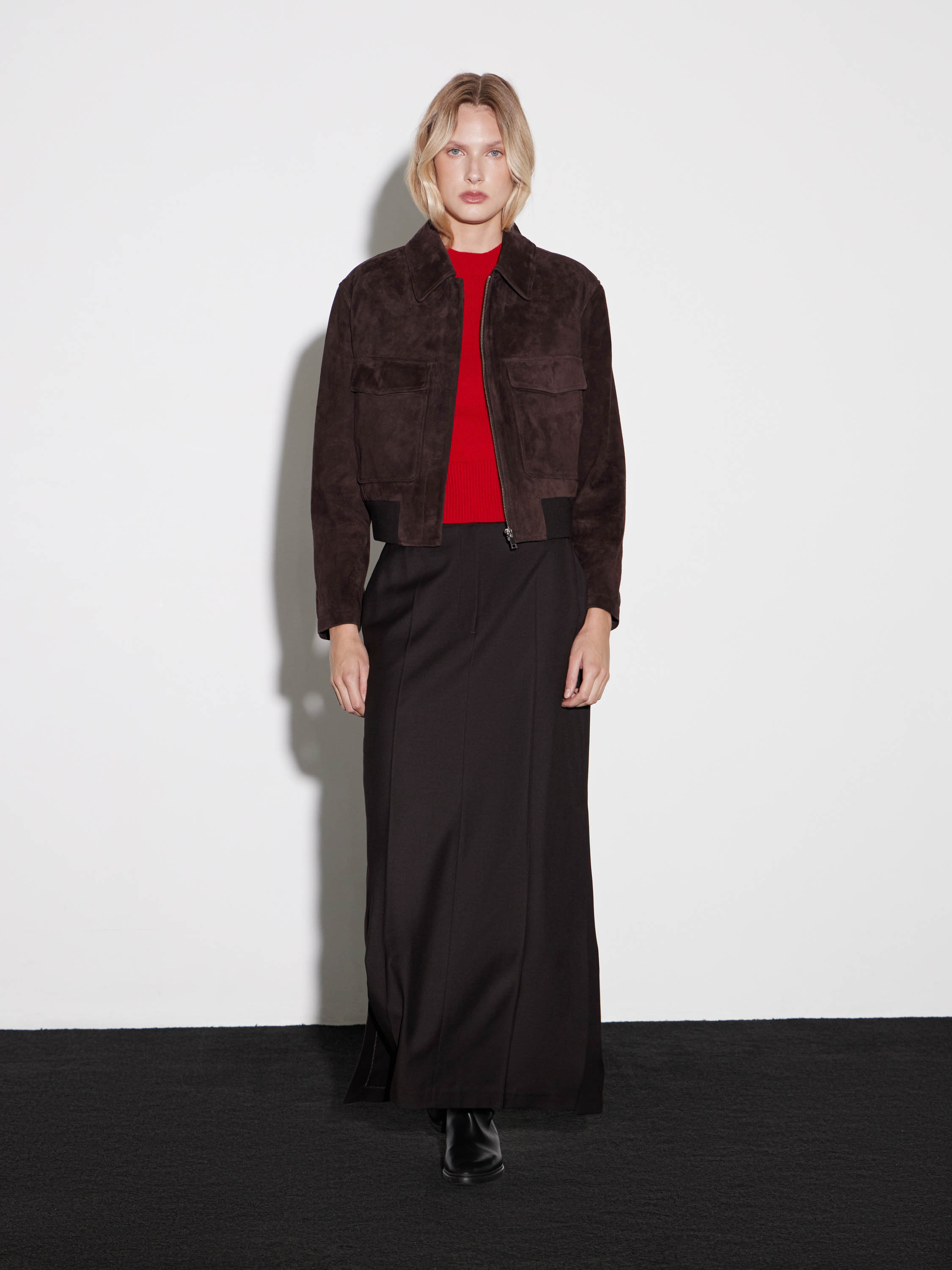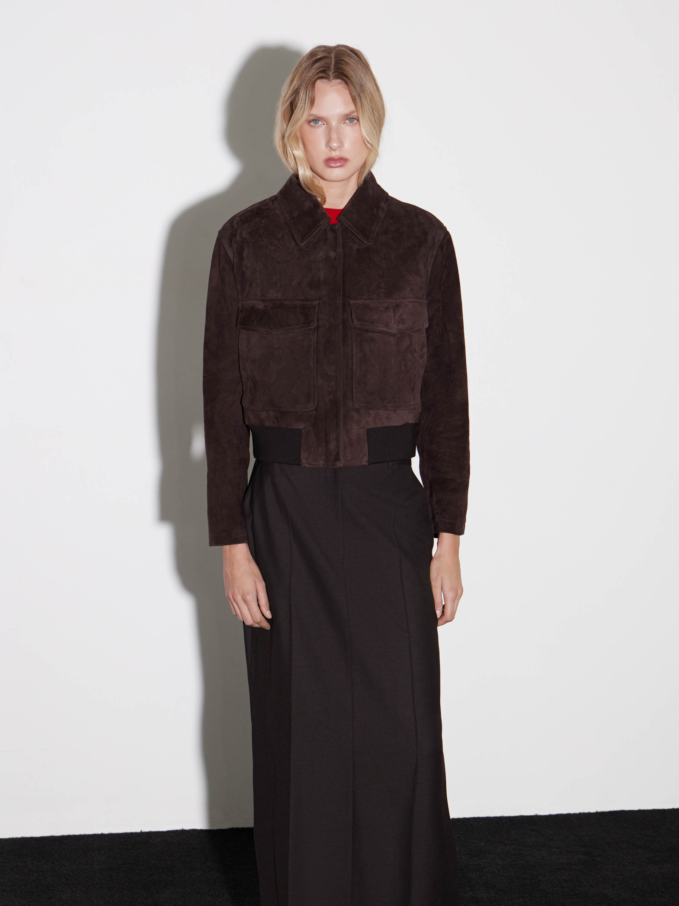 Куртка из натуральной замши из козьей кожи в современном прочтении классического бомбера. Мягкая фактура материала подчеркивает глубину цвета, а укороченный силуэт с акцентом на широком поясе и крупные накладные карманы придает вещи графичность. Застежка на молнию делает модель практичной, сохраняя при этом минималистичный характер. Замша из козьей кожи отличается бархатистой поверхностью, пластичностью и особой мягкостью, благодаря чему изделие комфортно в носке и со временем становится еще выразительнее. Куртка легко вписывается в базовый гардероб и открывает простор для многослойных сочетаний.