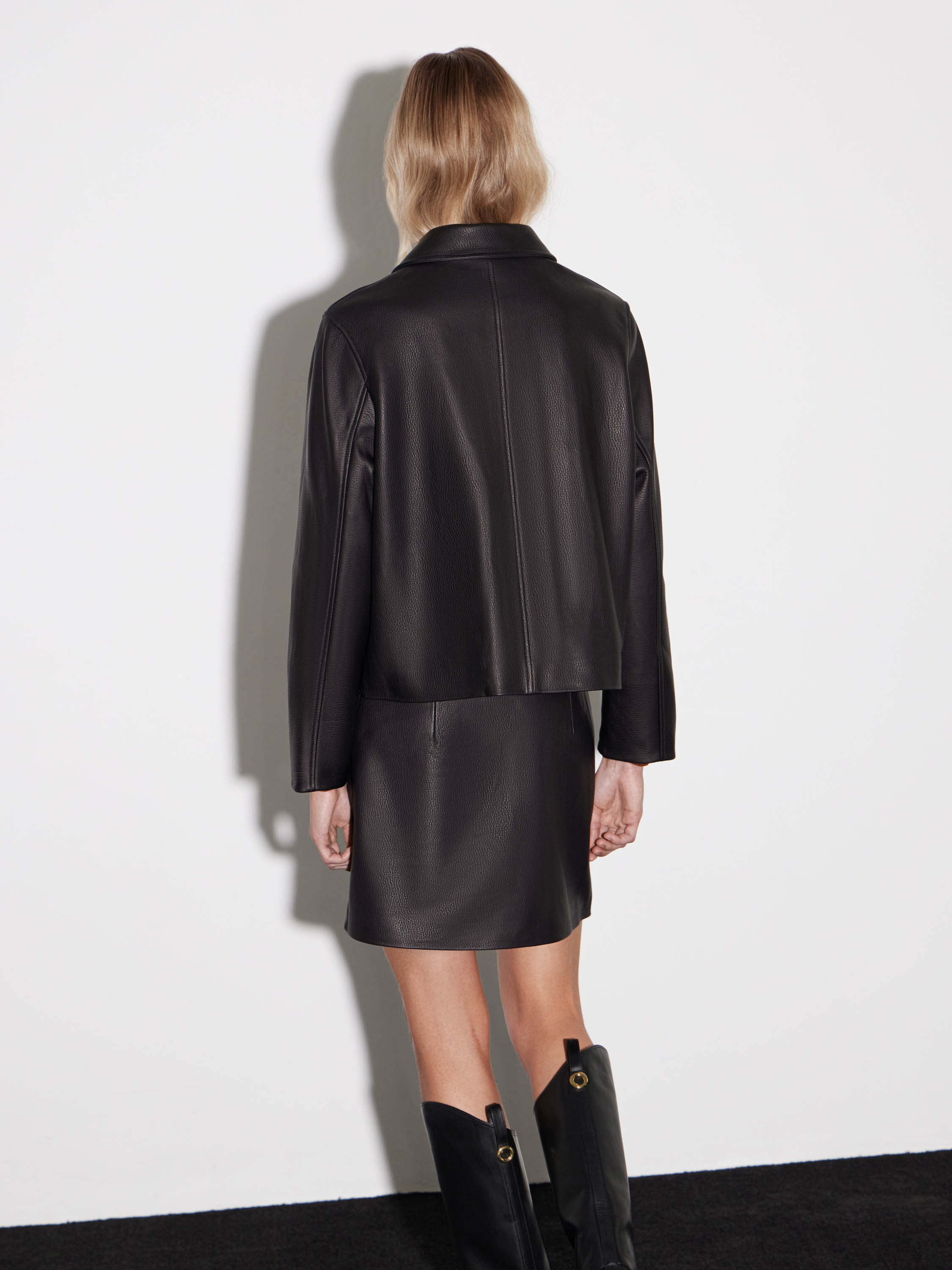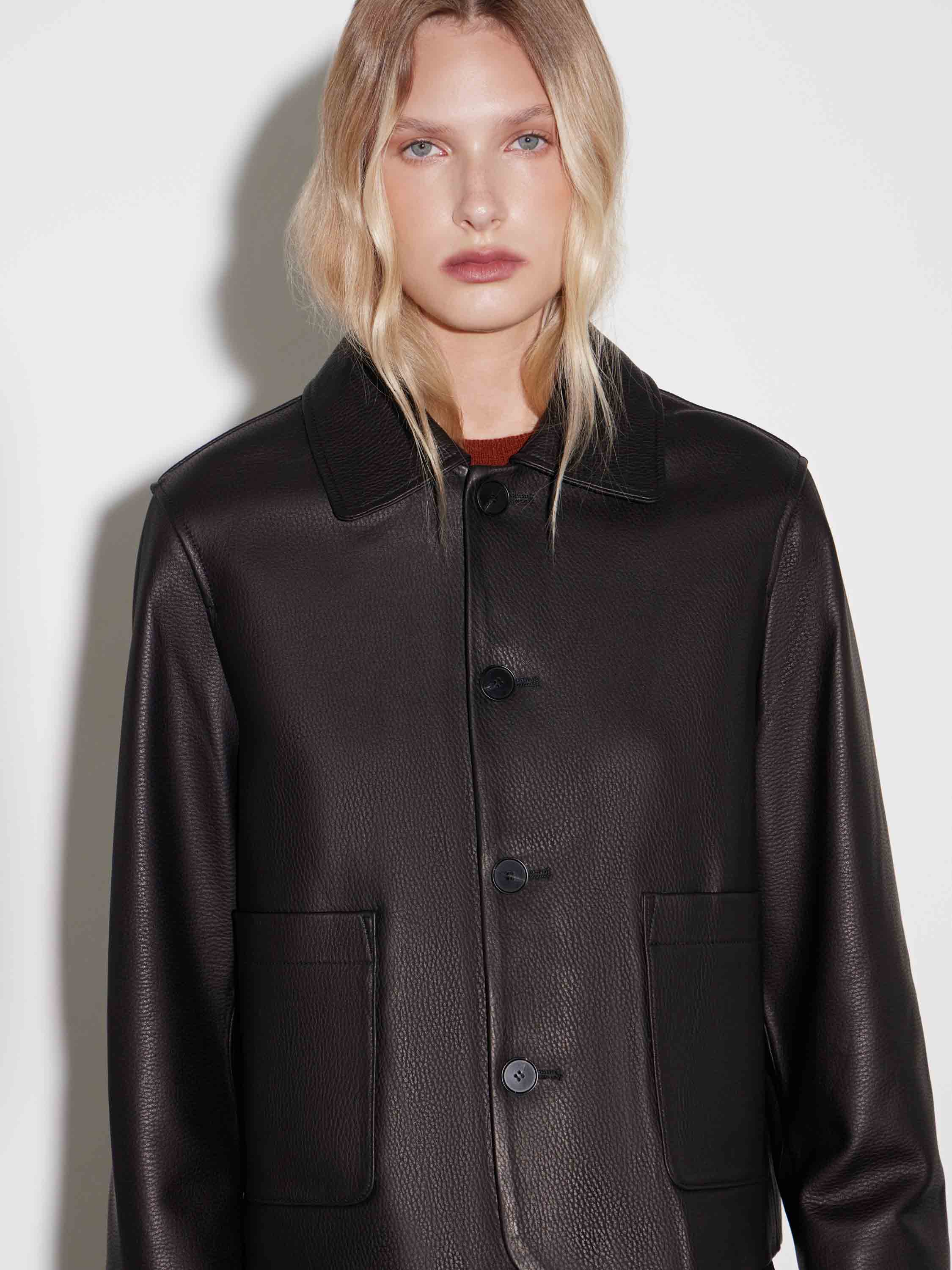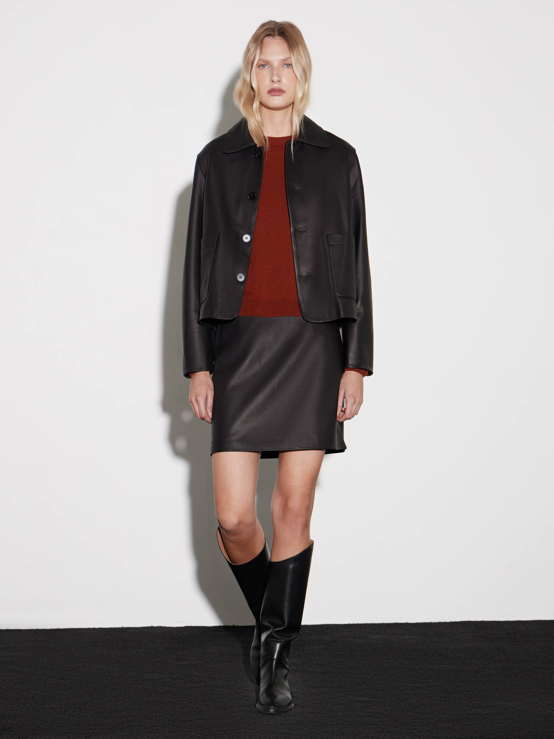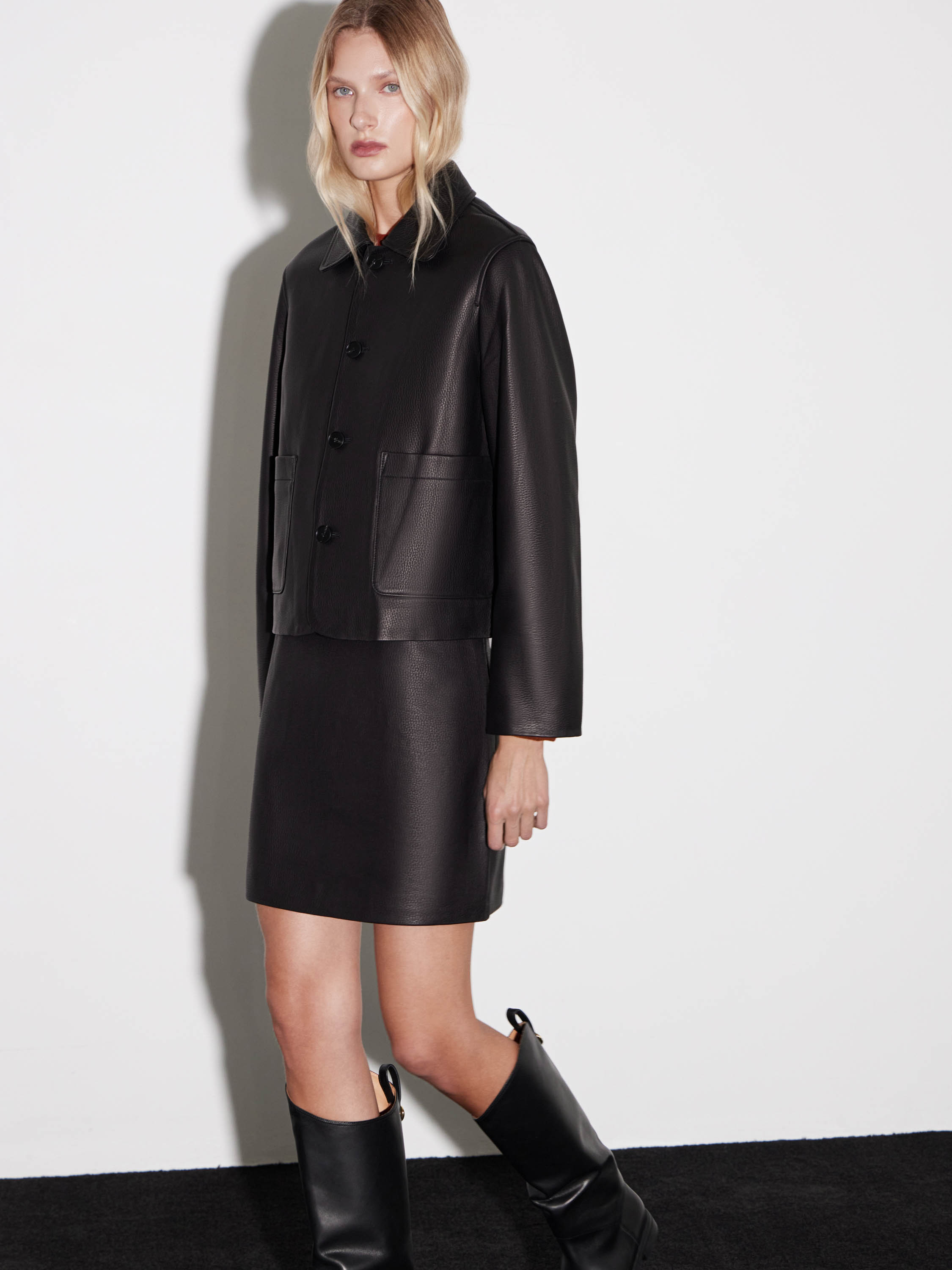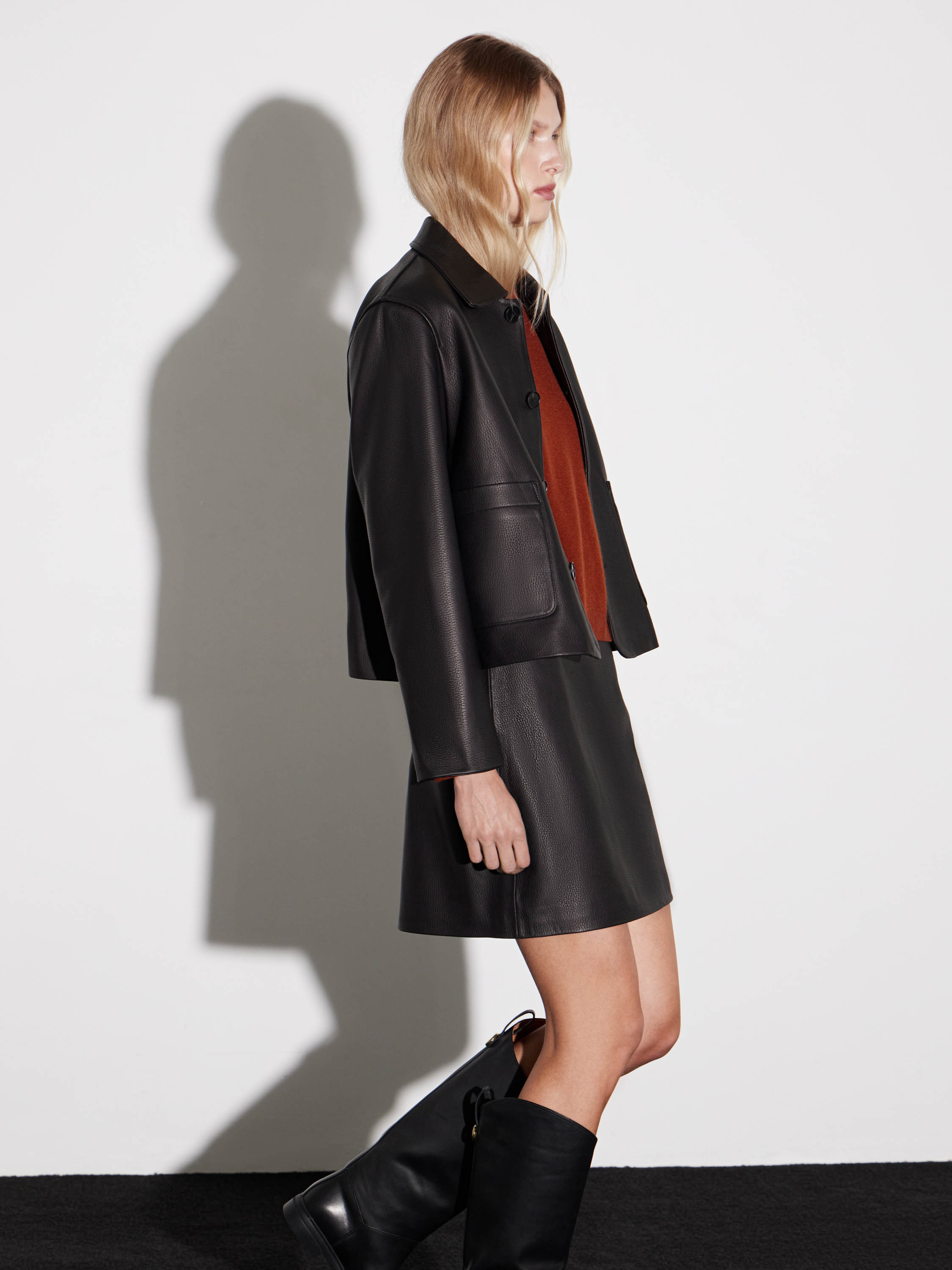 Куртка из натуральной кожи овцы в прямом крое с четкой геометрией. Лаконичный воротник и застежка на пуговицы создают классический силуэт, фактура кожи с легким зернением подчеркивает плотность и выразительность материала. Накладные карманы добавляют функциональности и делают дизайн более структурным. Кожа овцы отличается мягкостью, податливостью и комфортом в носке, оставаясь при этом прочной и долговечной. Универсальная длина позволяет носить куртку как с брюками, так и с юбками, сохраняя цельность образа.