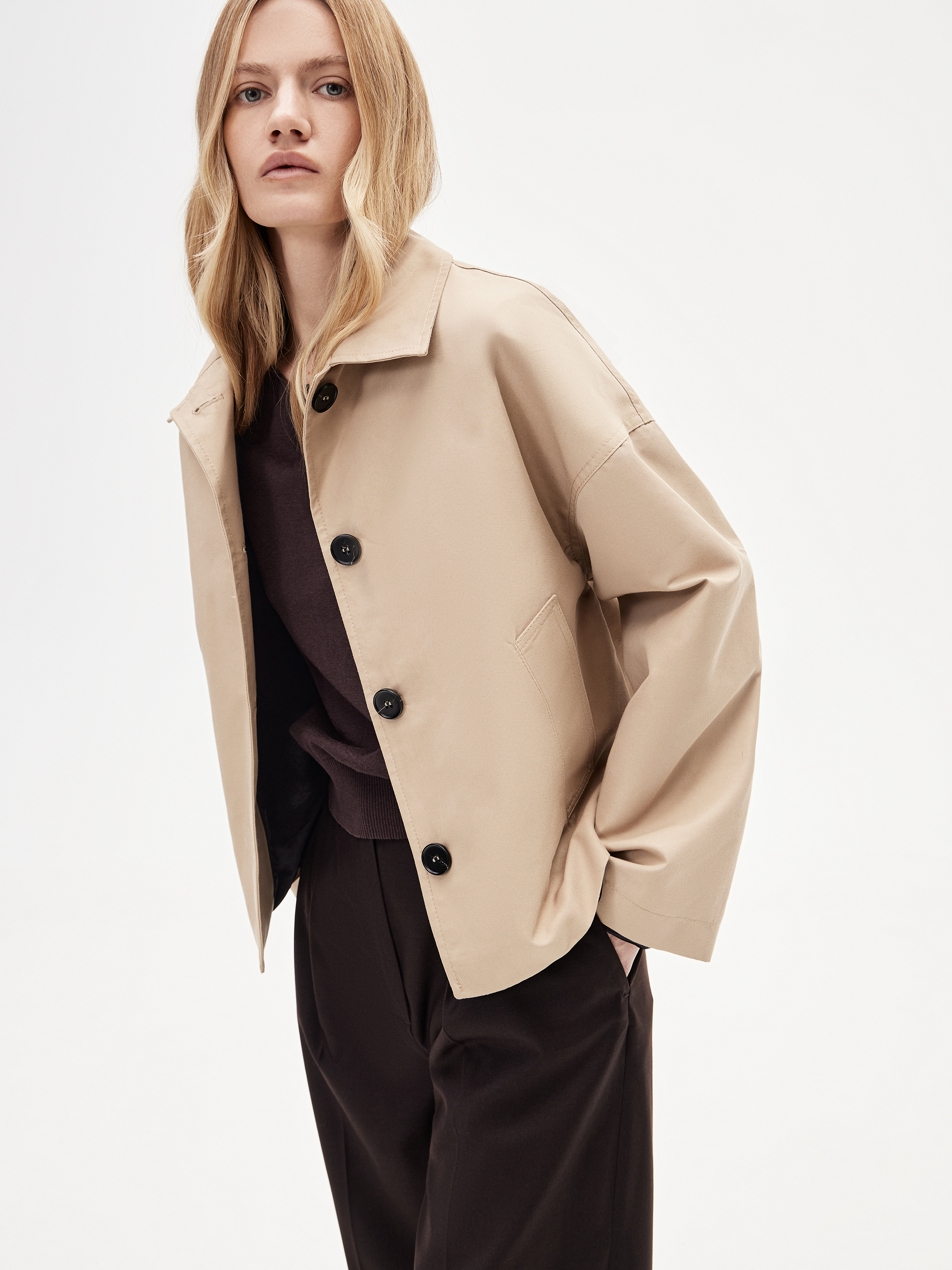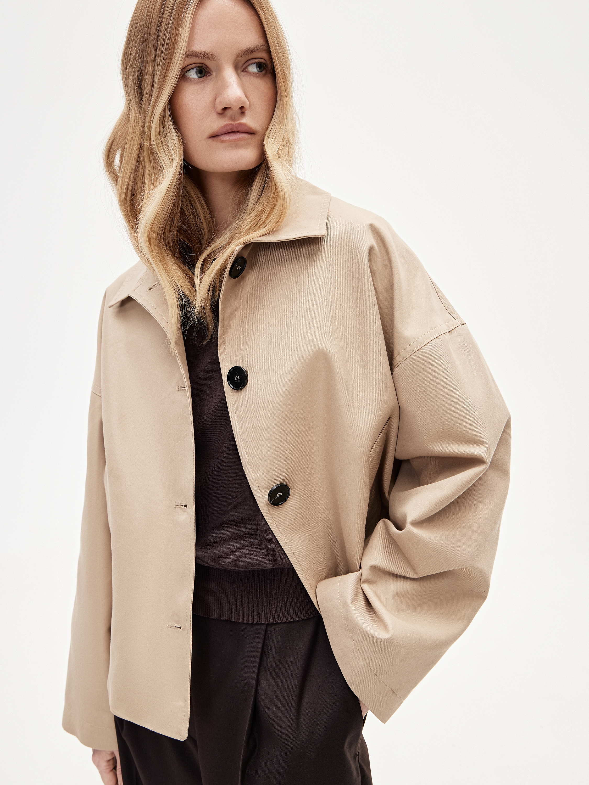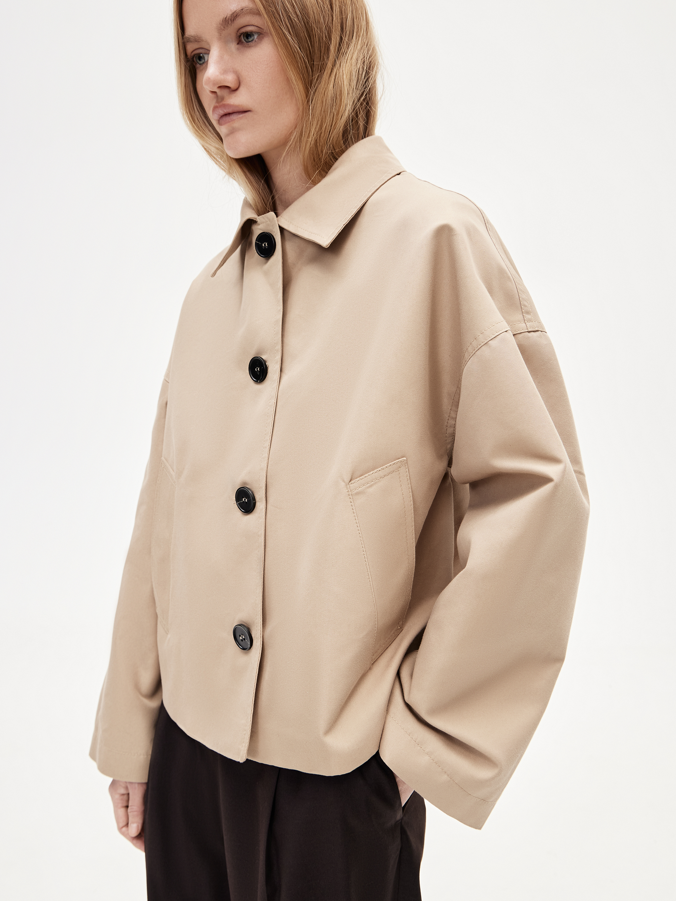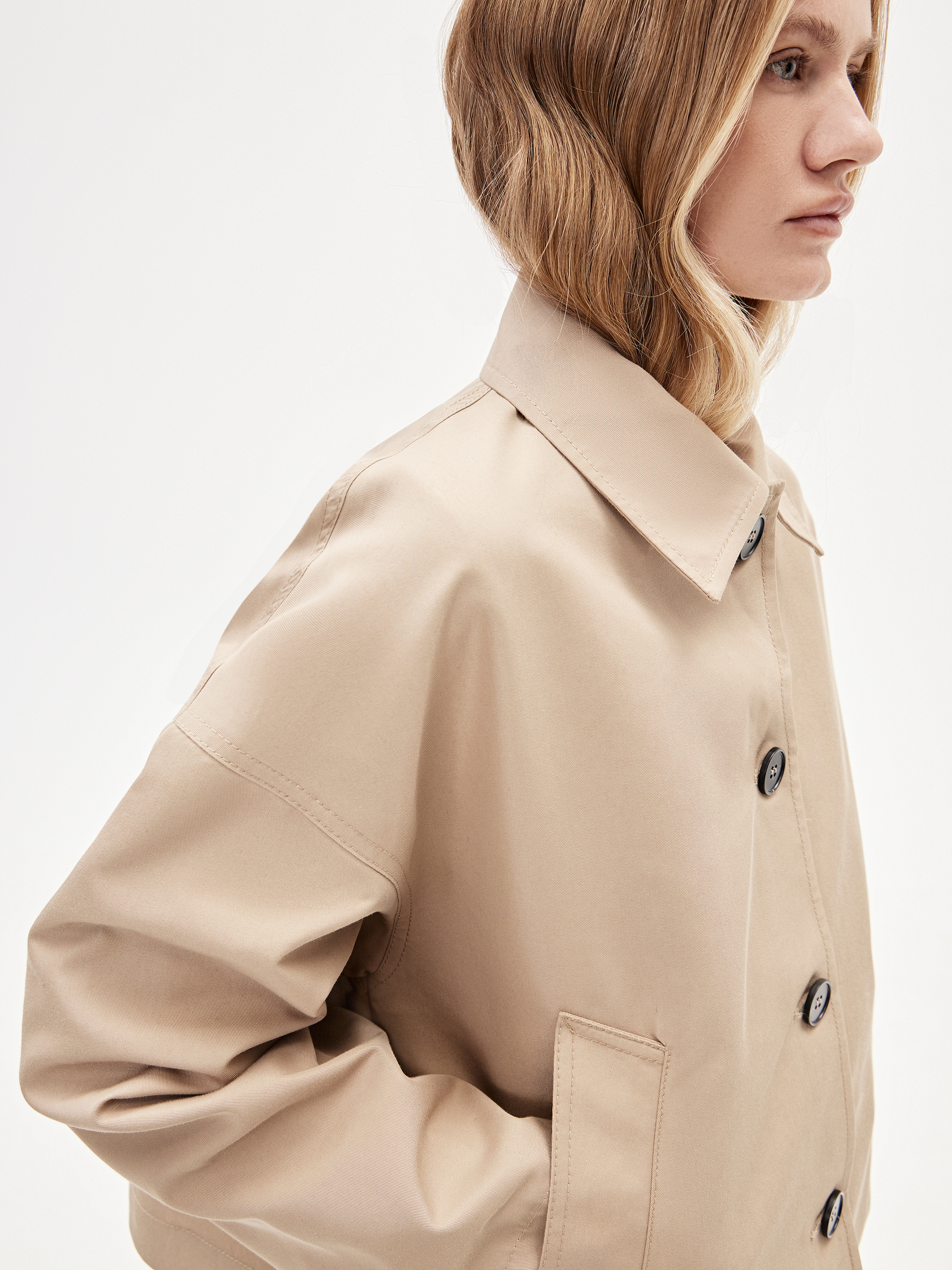 Тренч выполнен из плотного матового полотна в светлом нейтральном оттенке. Силуэт прямой, укороченный, с мягкой линией плеч и умеренным объемом, который не утяжеляет фигуру. Высокий воротник-стойка с застежкой на пуговицы защищает от ветра и формирует собранный верх. Модель дополнена капюшоном, аккуратно встроенным в конструкцию, и функциональными накладными карманами с клапанами. Рукава прямые, с манжетами на пуговицах, что позволяет регулировать посадку. Внутри предусмотрена подкладка, благодаря которой куртка комфортна в носке и хорошо держит форму. Универсальная длина делает модель подходящей для повседневных городских образов и межсезонья.