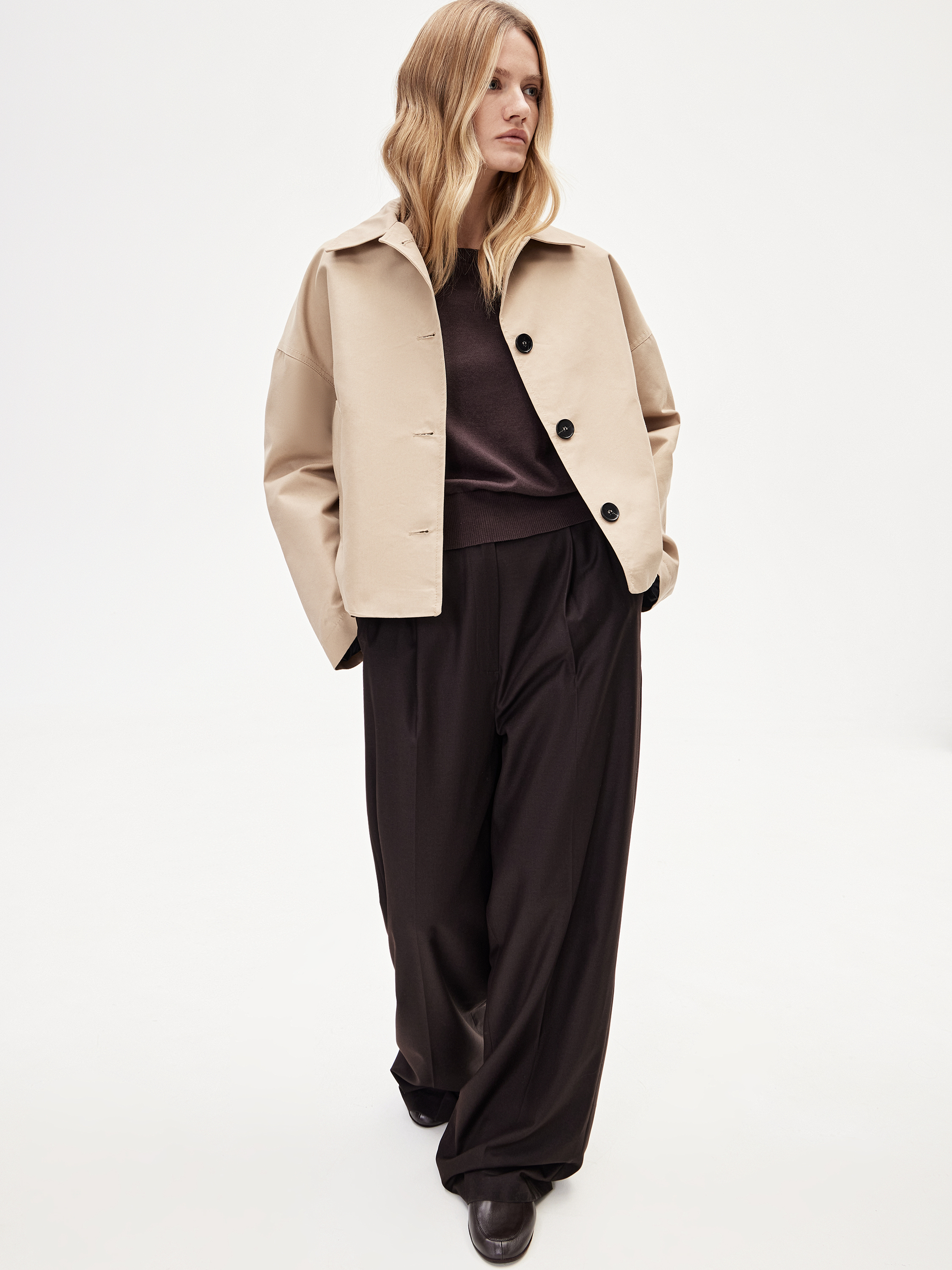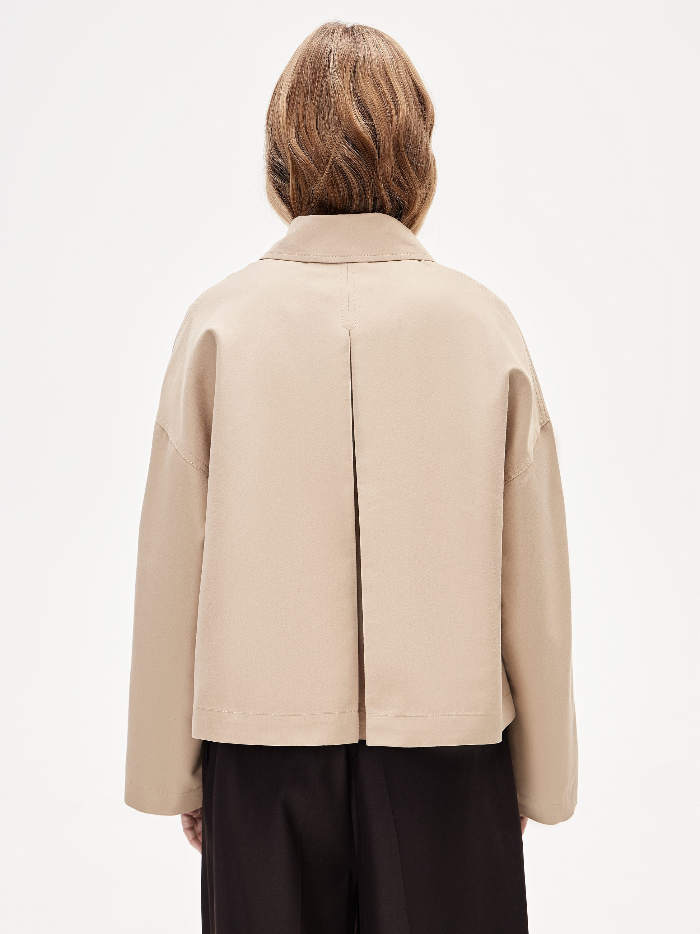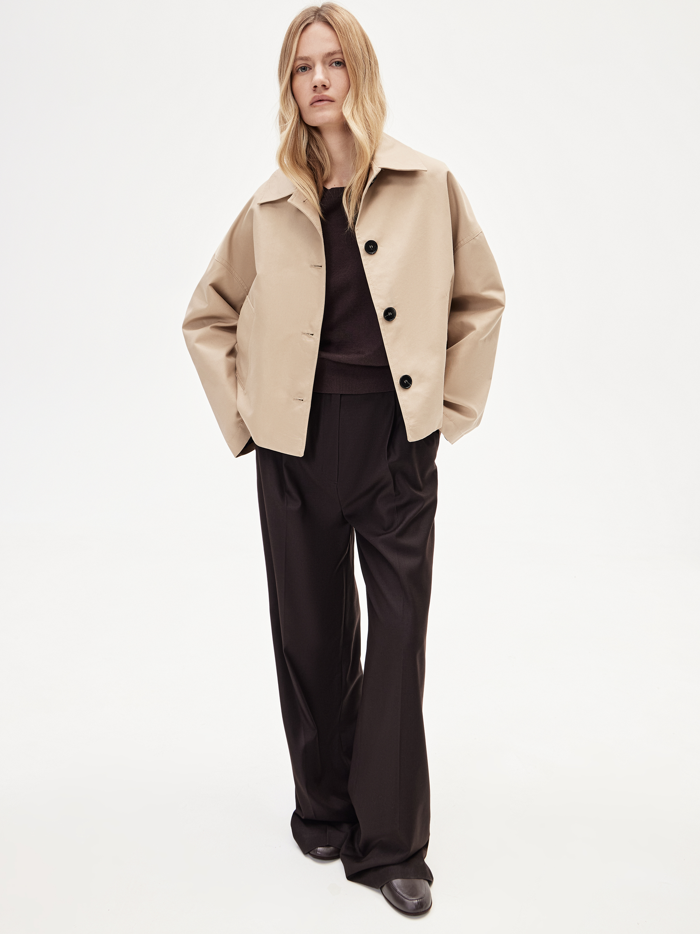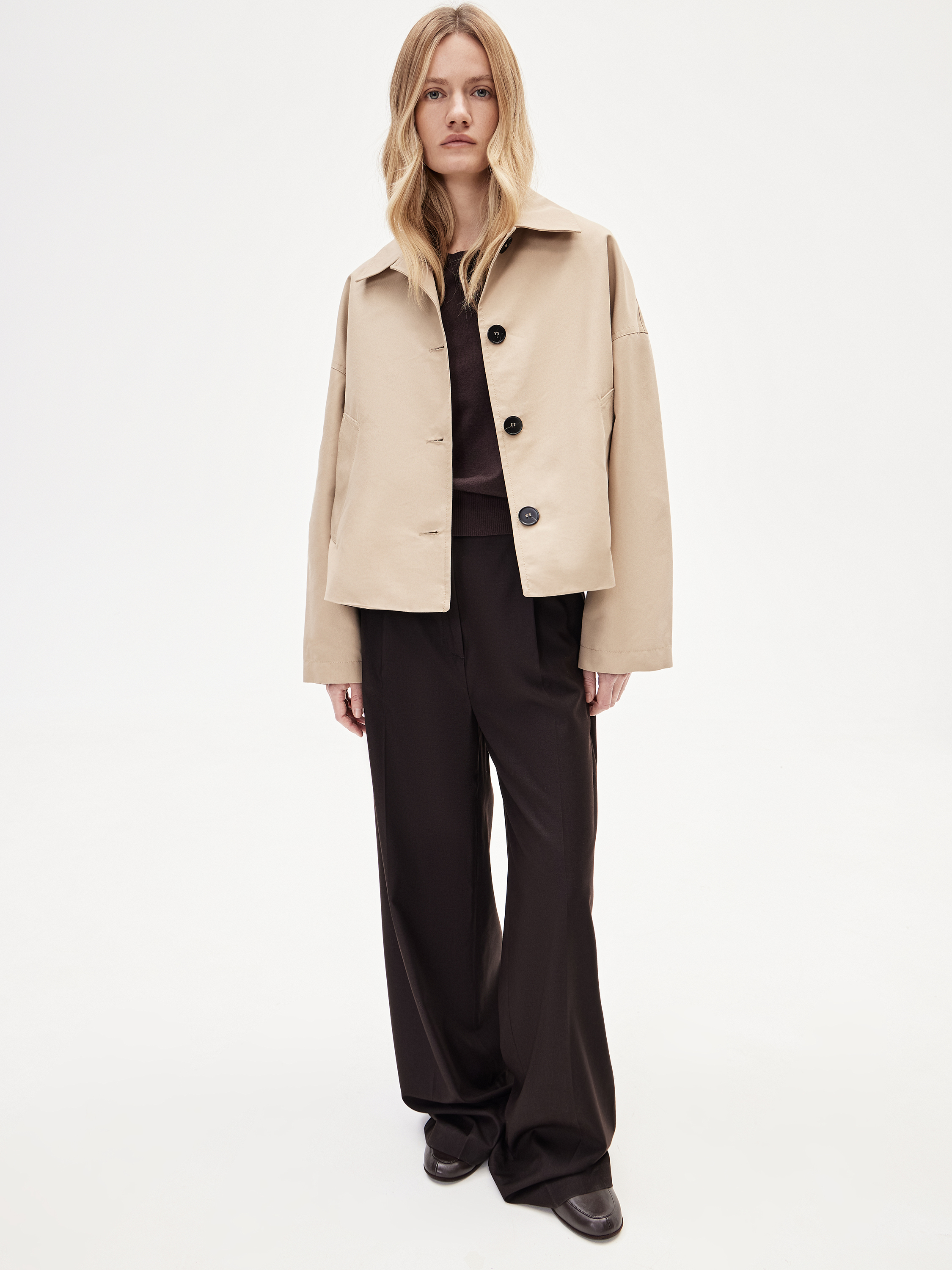 Тренч выполнен из плотного матового полотна в светлом нейтральном оттенке. Силуэт прямой, укороченный, с мягкой линией плеч и умеренным объемом, который не утяжеляет фигуру. Высокий воротник-стойка с застежкой на пуговицы защищает от ветра и формирует собранный верх. Модель дополнена капюшоном, аккуратно встроенным в конструкцию, и функциональными накладными карманами с клапанами. Рукава прямые, с манжетами на пуговицах, что позволяет регулировать посадку. Внутри предусмотрена подкладка, благодаря которой куртка комфортна в носке и хорошо держит форму. Универсальная длина делает модель подходящей для повседневных городских образов и межсезонья.