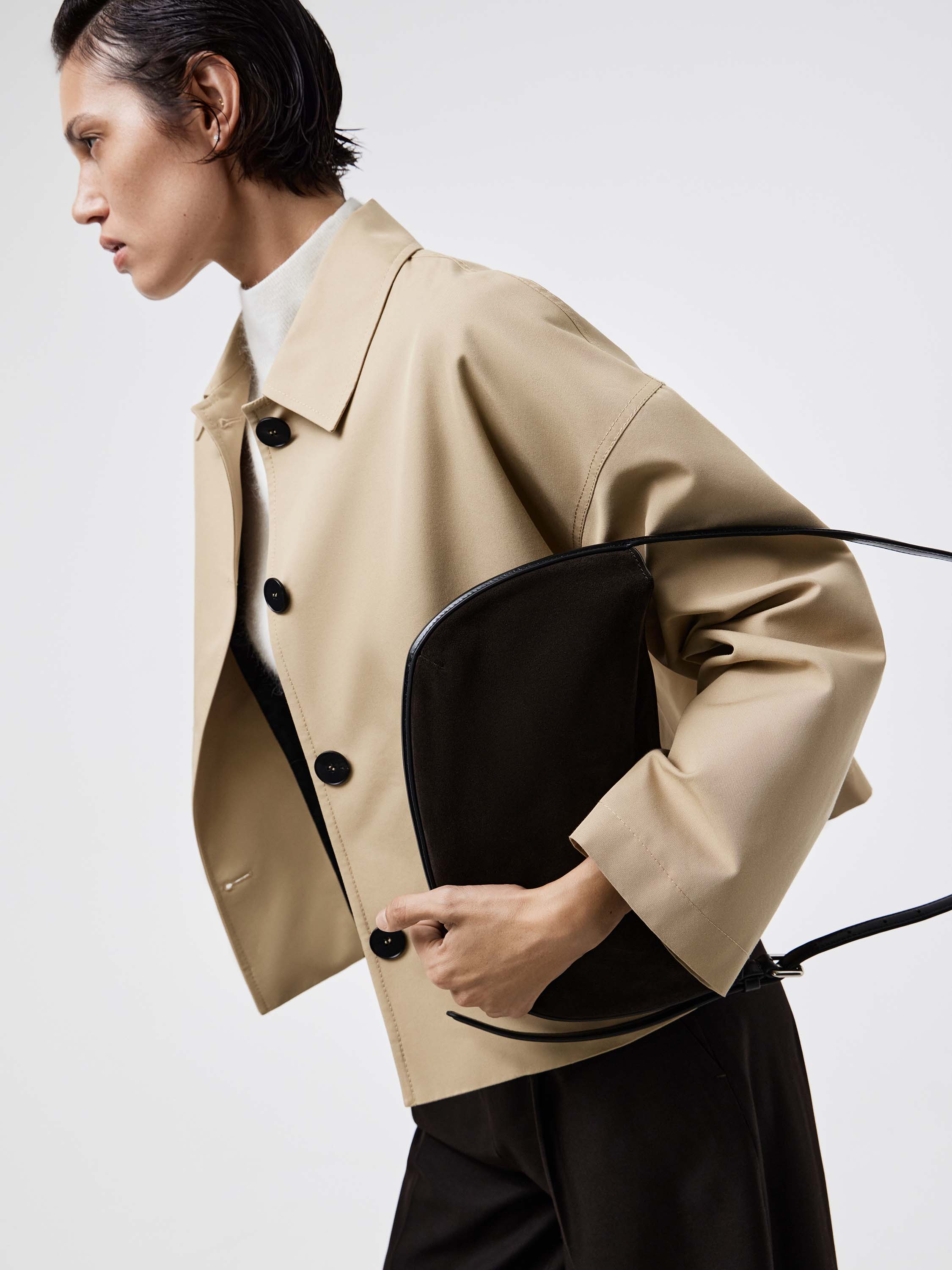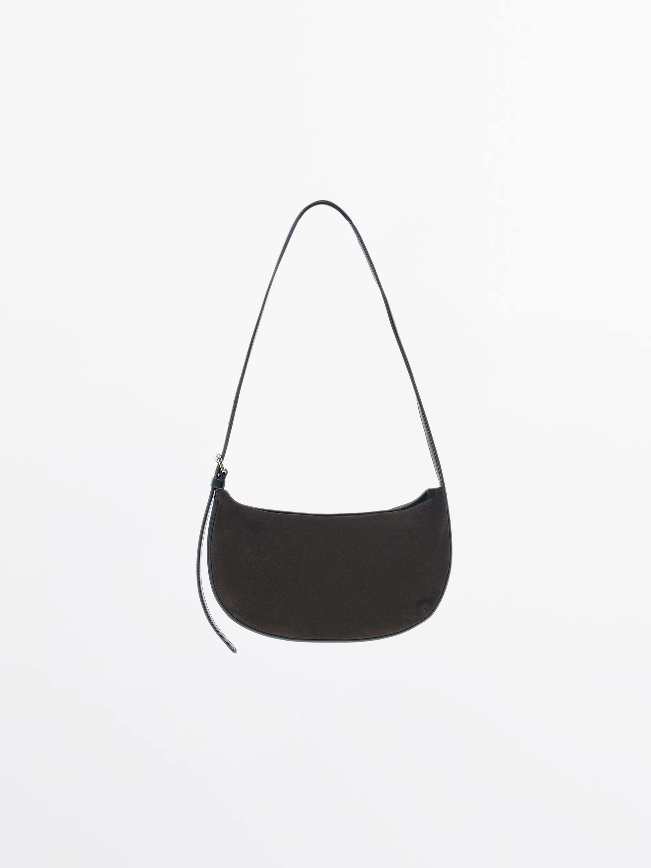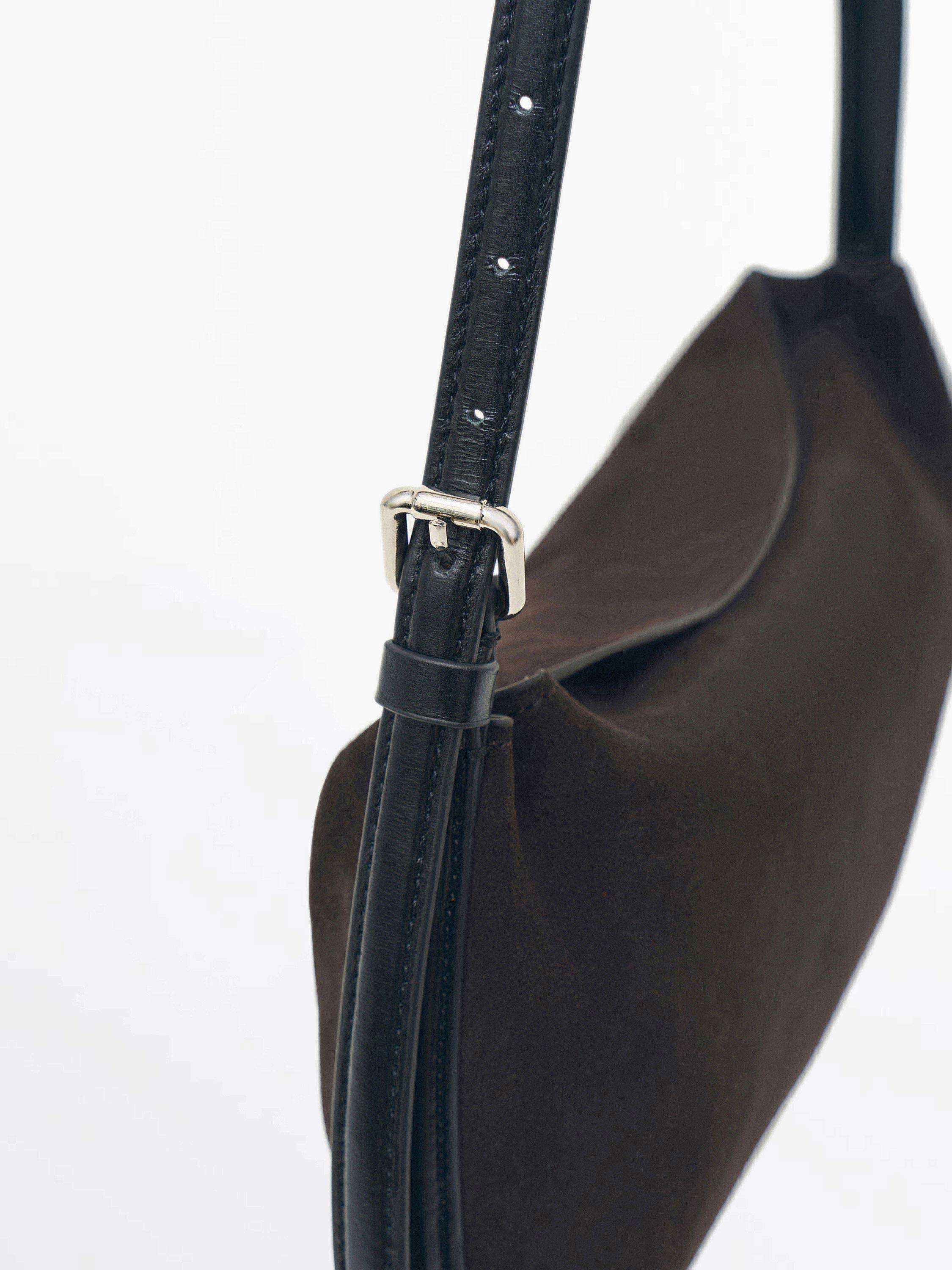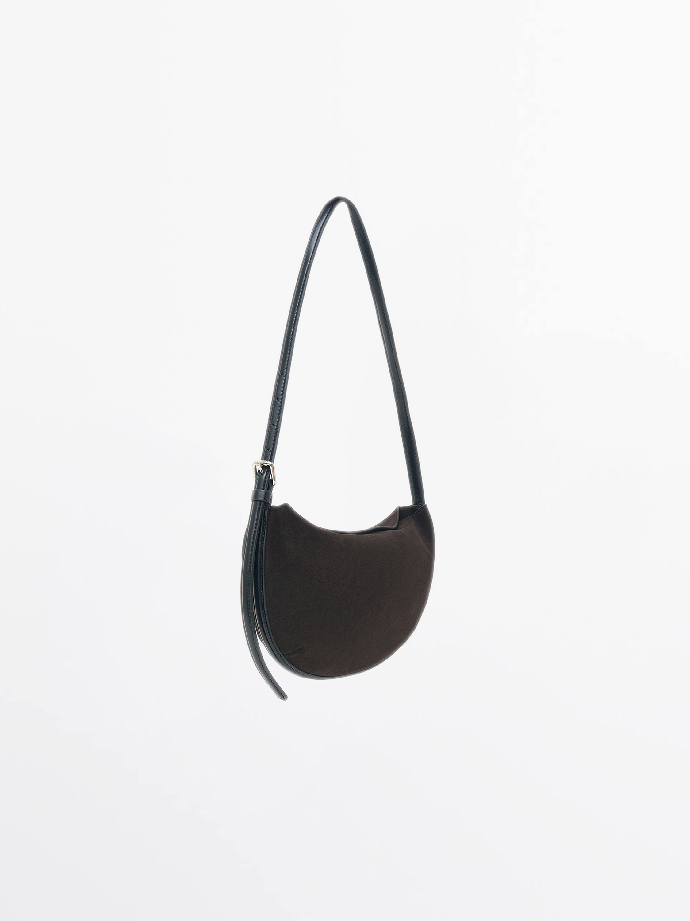 Сумка выполнена из мягкой замши с отделкой из гладкой кожи, которая формирует регулируемый плечевой ремень. Компактная форма полумесяца подчеркивает минималистичность силуэта, а текстурированный контраст материалов добавляет глубины. Фурнитура в лаконичном серебристом тоне сохраняет общий сдержанный характер модели. Внутри — аккуратное отделение, рассчитанное на базовые повседневные вещи. Лаконичная и удобная, эта сумка становится универсальным акцентом как в дневных, так и в вечерних образах.