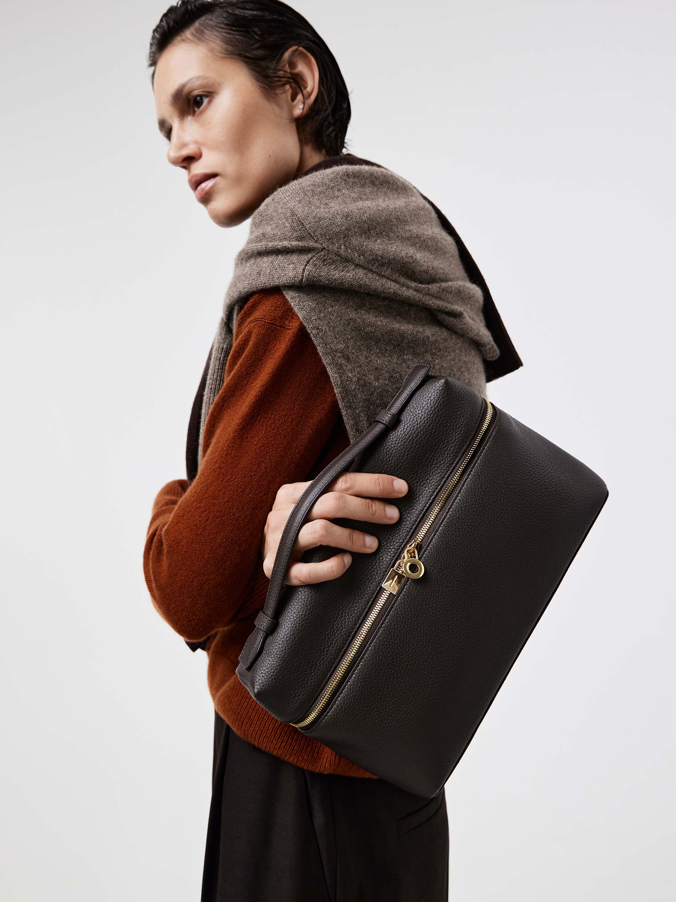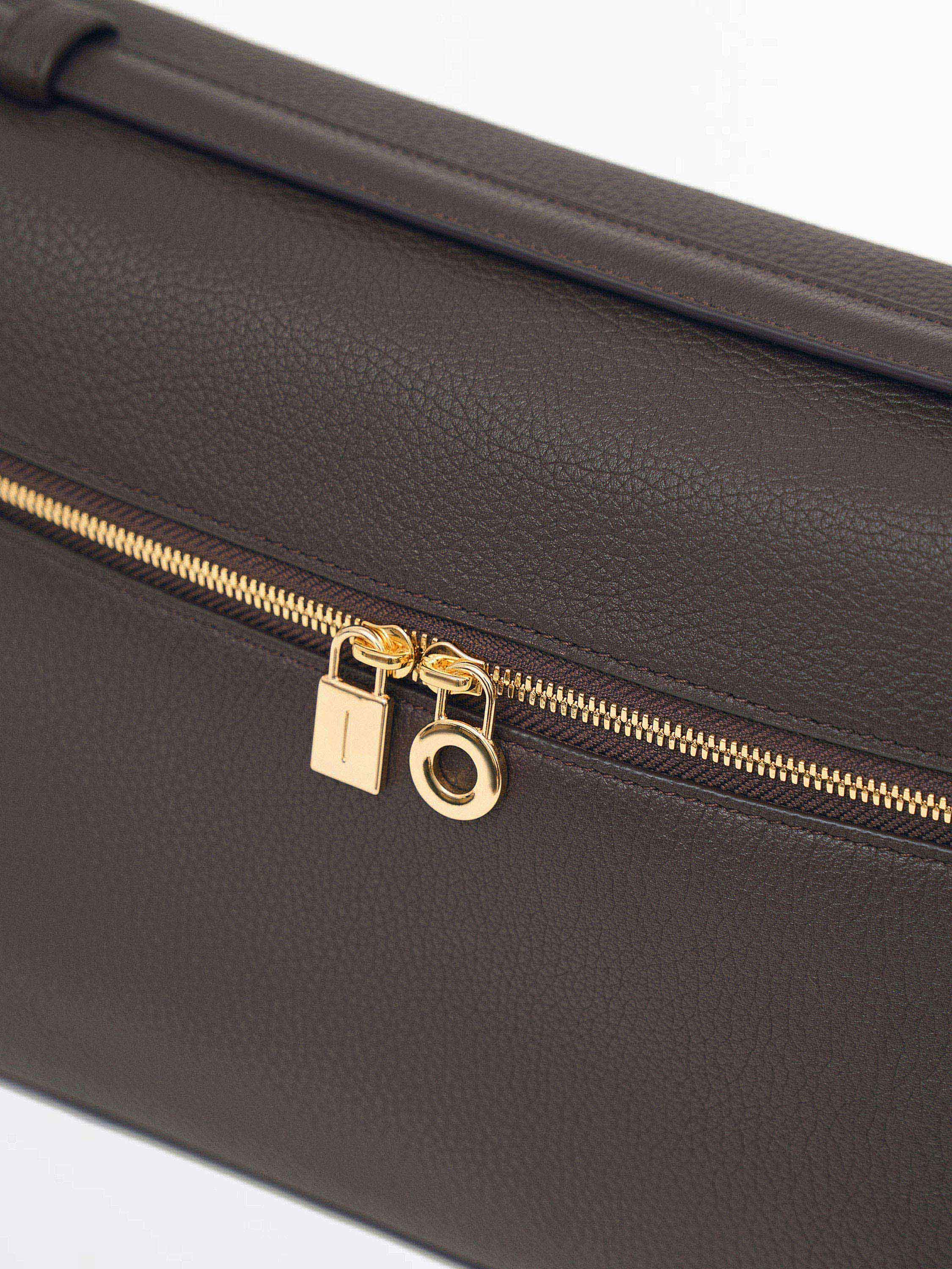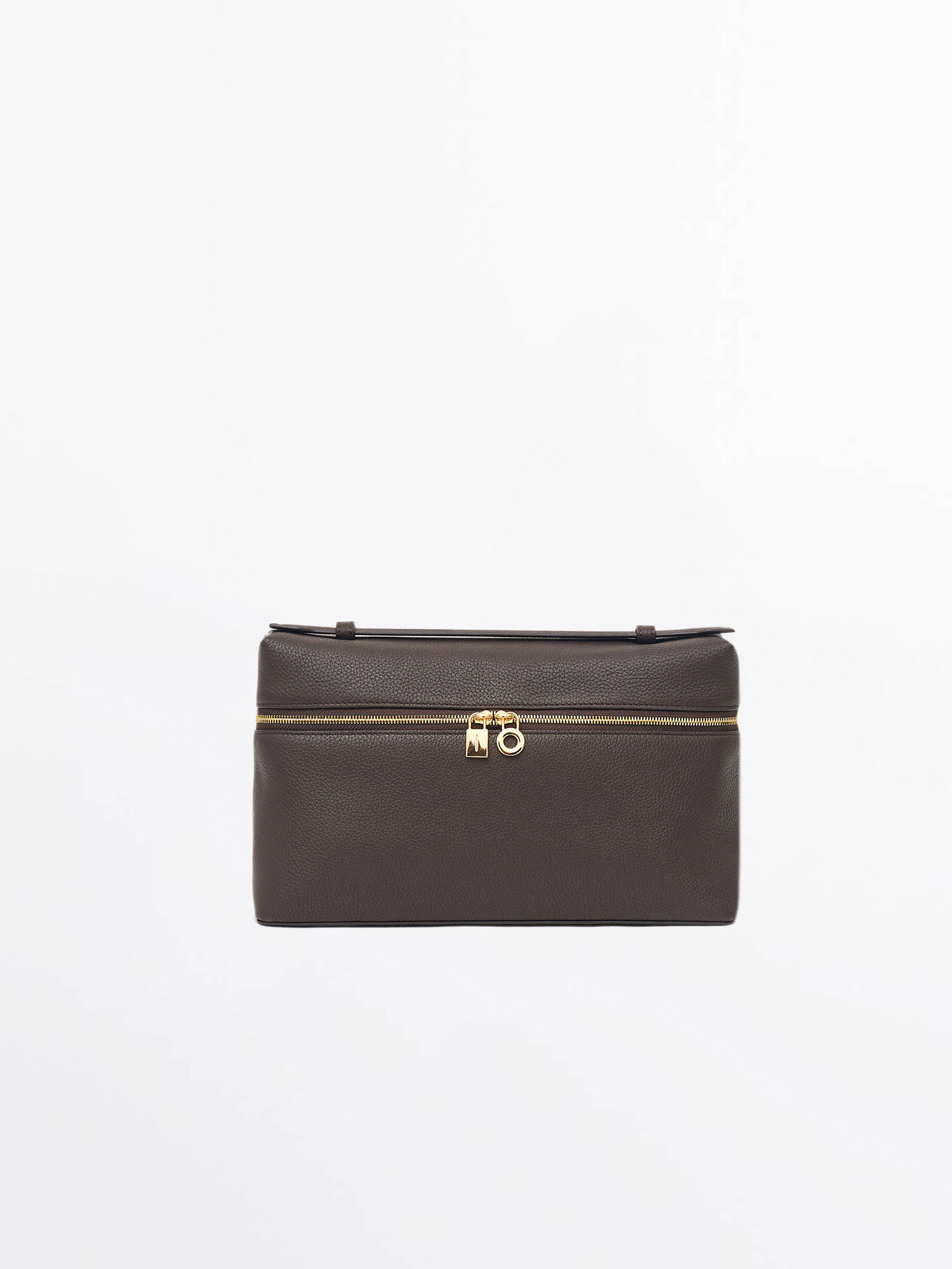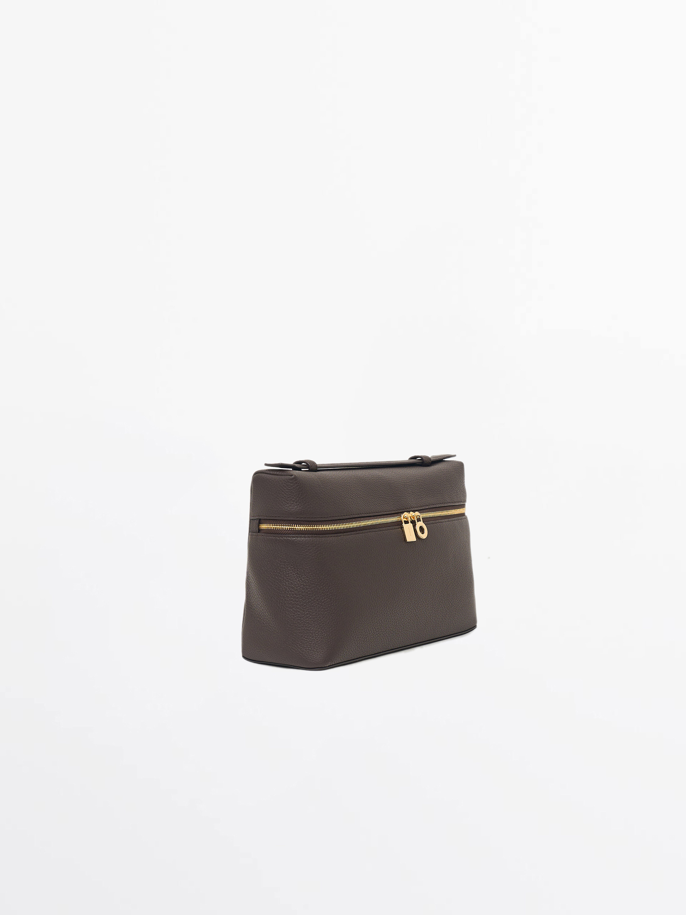 Сумка из натуральной кожи с плотной, зернистой фактурой и устойчивой формой. Конструкция жесткая, с четкой геометрией и откидной крышкой на молнии по периметру. Короткая верхняя ручка позволяет носить модель в руке, формат компактный, с организованным внутренним пространством. Фурнитура лаконичная, с акцентом на функциональность. Стиль — структурированный, с отсылкой к дорожным форматам и винтажным бьюти-кейсам. Оттенок — светлый бежевый.