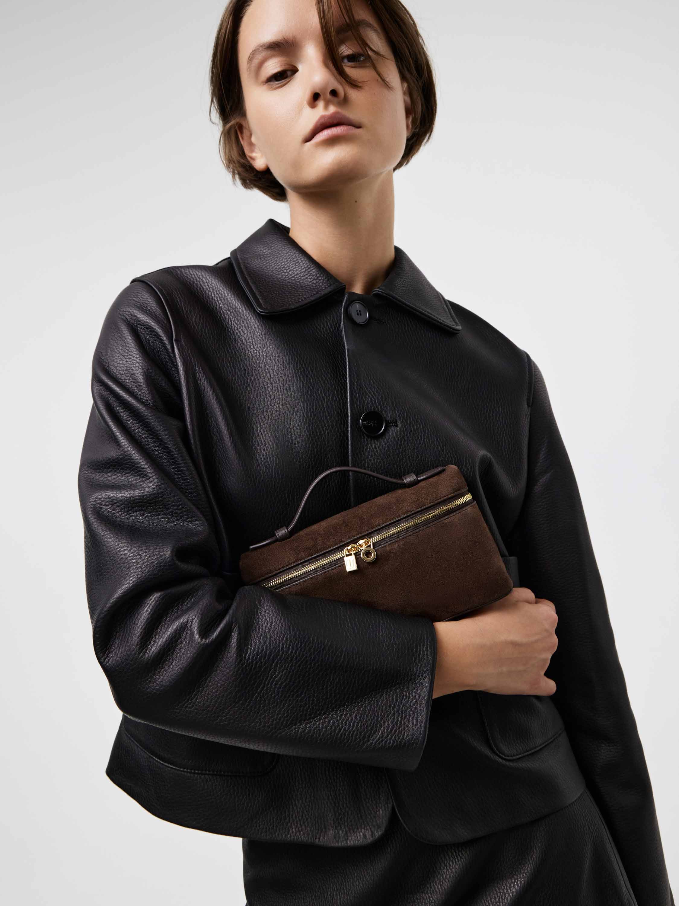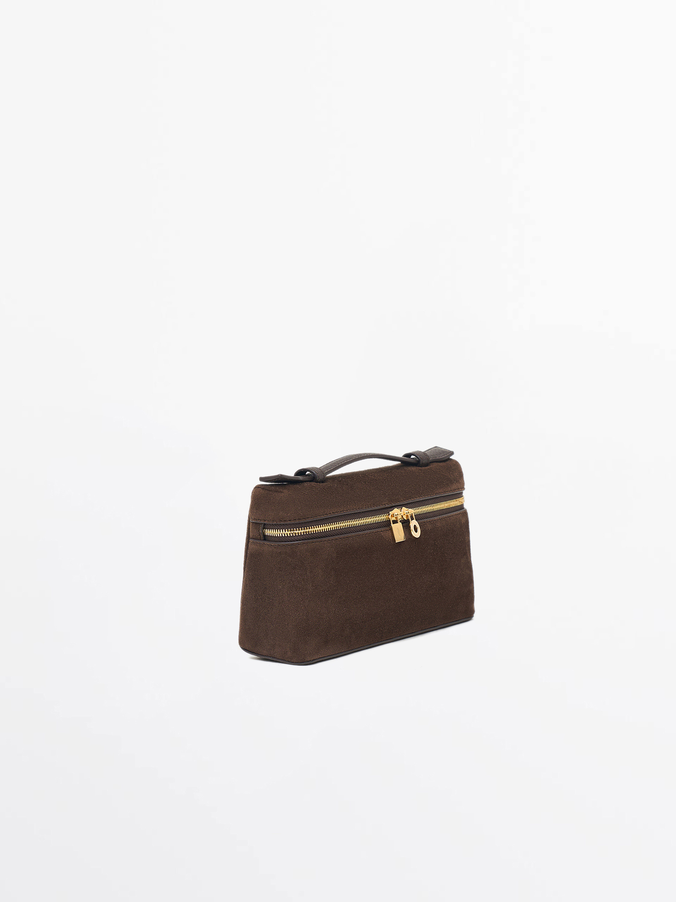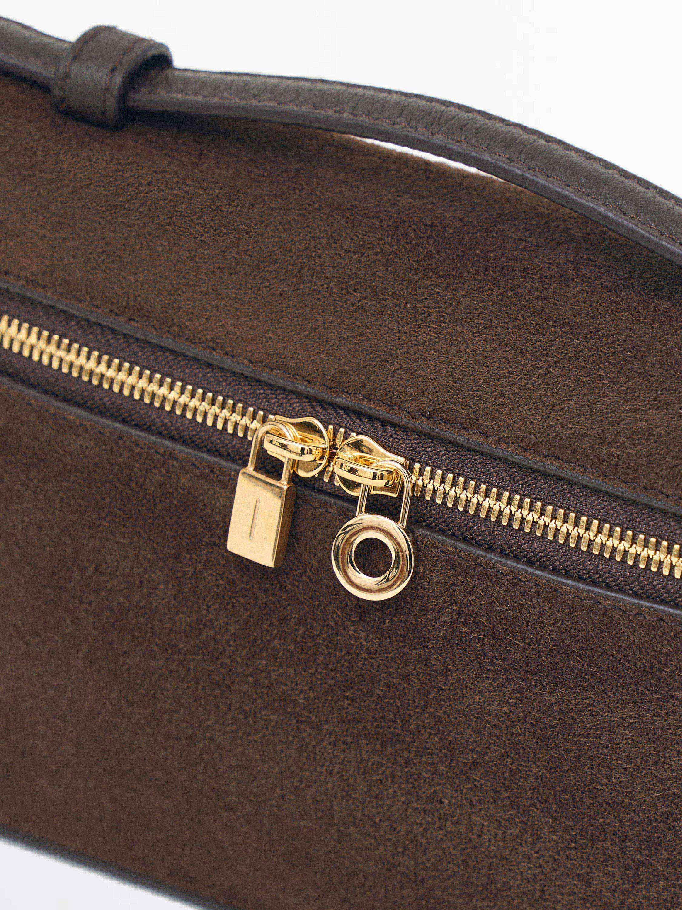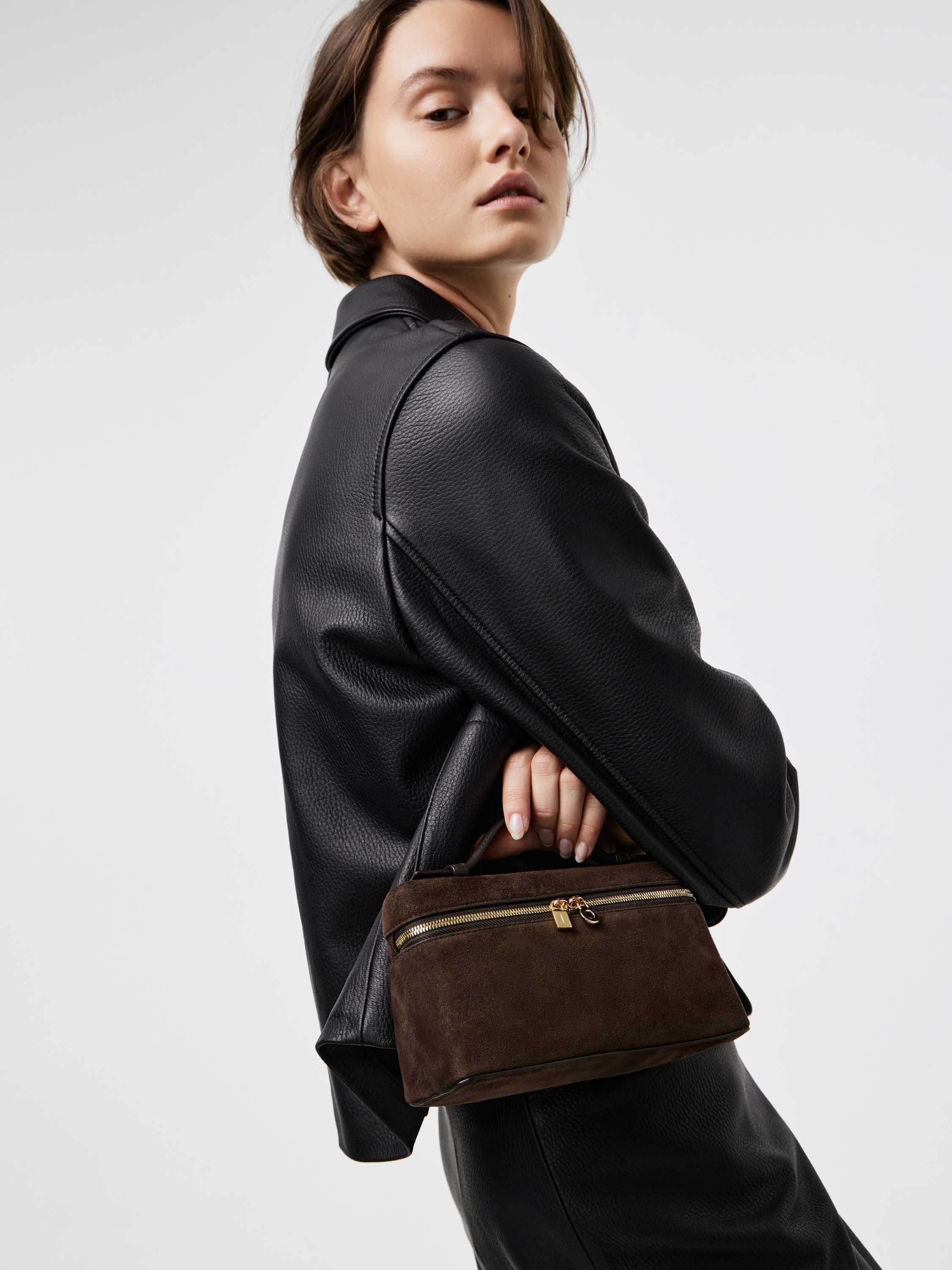 Сумка из мягкой замши с лаконичным прямоугольным силуэтом. Компактная форма дополнена верхней ручкой и металлической молнией с миниатюрным замком в качестве акцента. Замша матовая, с деликатной бархатистой фактурой, придающей изделию глубину и выразительность. Благодаря минималистичному дизайну сумка универсальна: она органично вписывается как в повседневные образы, так и в более собранные комплекты.