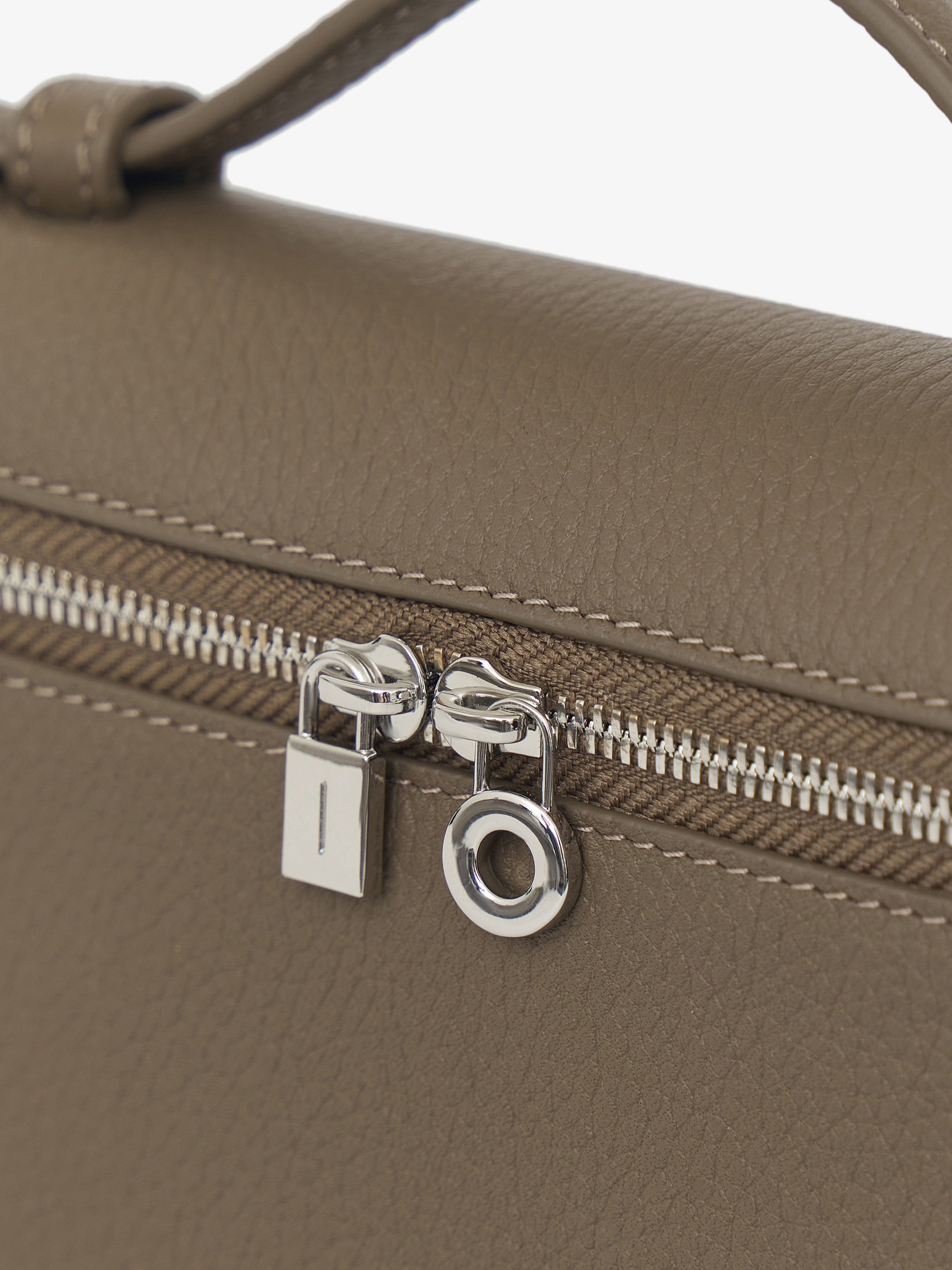 Сумка из натуральной кожи с плотной, зернистой фактурой и устойчивой формой. Конструкция жесткая, с четкой геометрией и откидной крышкой на молнии по периметру. Короткая верхняя ручка позволяет носить модель в руке, формат компактный, с организованным внутренним пространством. Фурнитура лаконичная, с акцентом на функциональность. Стиль — структурированный, с отсылкой к дорожным форматам и винтажным бьюти-кейсам. Оттенок — глубокий бордовый.
