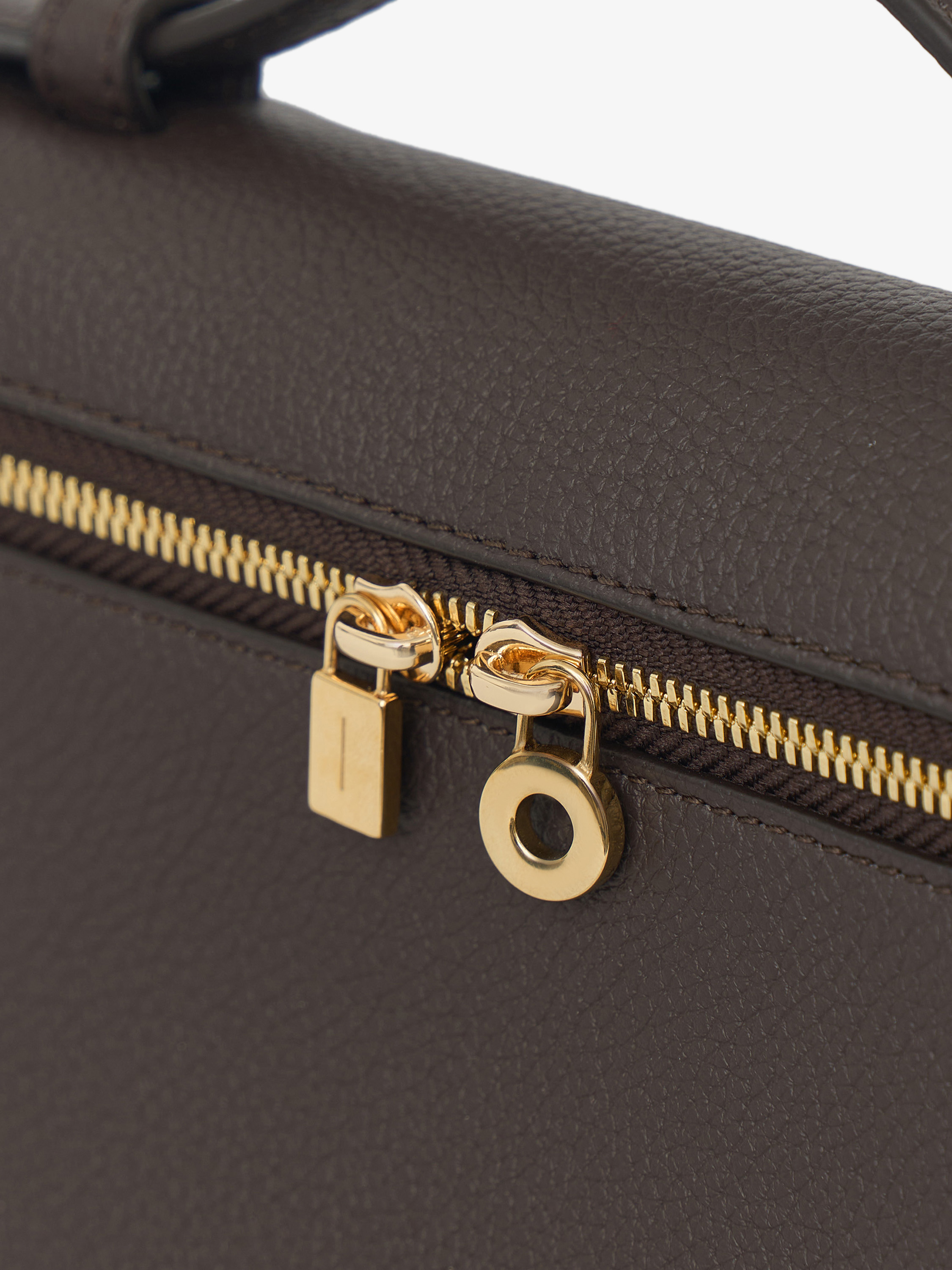 Сумка из натуральной кожи с плотной, зернистой фактурой и устойчивой формой. Конструкция жесткая, с четкой геометрией и откидной крышкой на молнии по периметру. Короткая верхняя ручка позволяет носить модель в руке, формат компактный, с организованным внутренним пространством. Фурнитура лаконичная, с акцентом на функциональность. Стиль — структурированный, с отсылкой к дорожным форматам и винтажным бьюти-кейсам. Оттенок — глубокий бордовый.