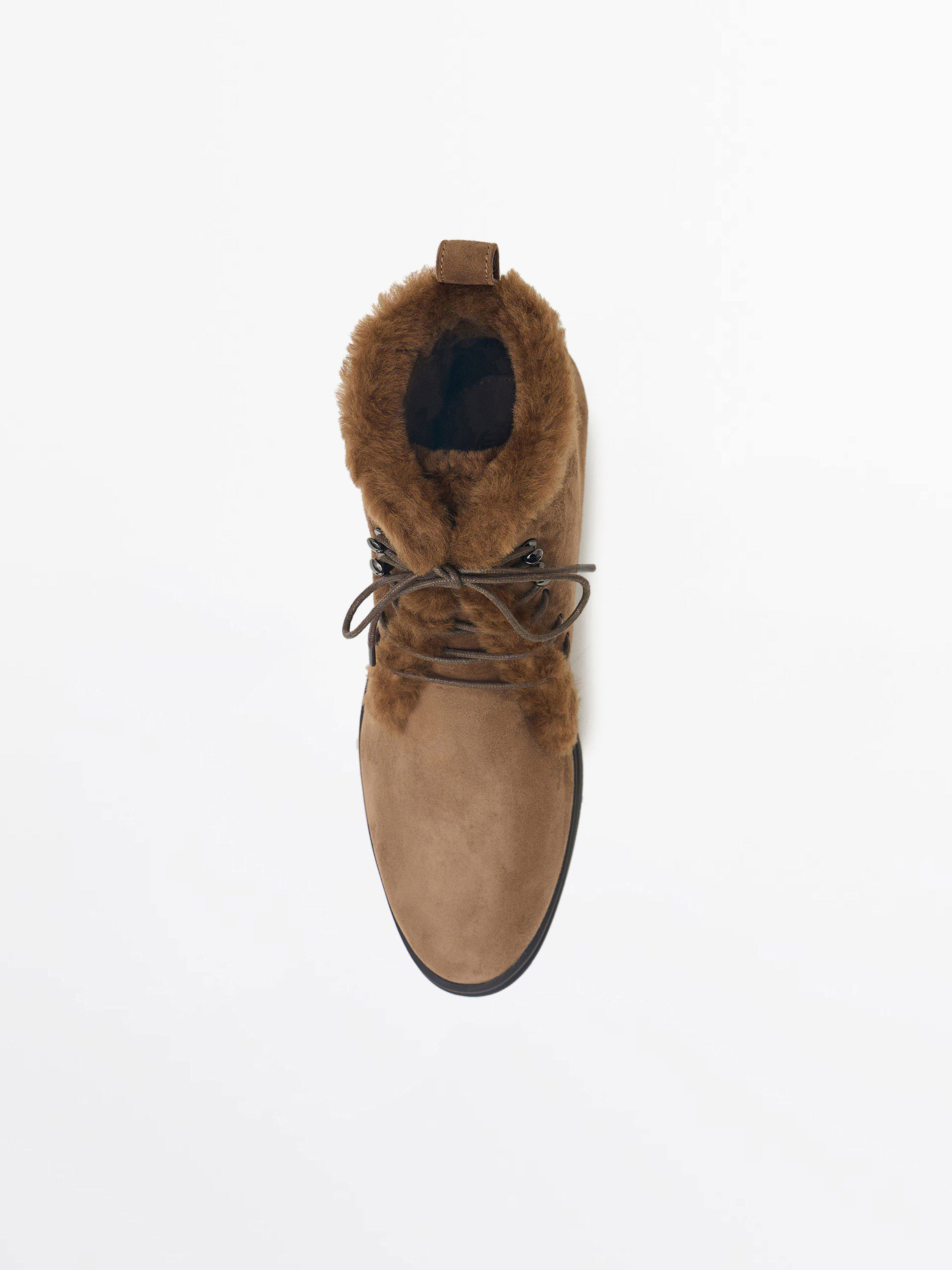 Ботинки из натуральной замши с мягкой отделкой из овчины. Высокий силуэт обеспечивает дополнительное тепло и комфорт в холодный сезон, а шнуровка позволяет регулировать посадку. Плотная подошва добавляет практичности, делая модель подходящей для прогулок и повседневного ношения. Сочетание замши и овчины подчеркивает баланс между эстетикой и функциональностью.