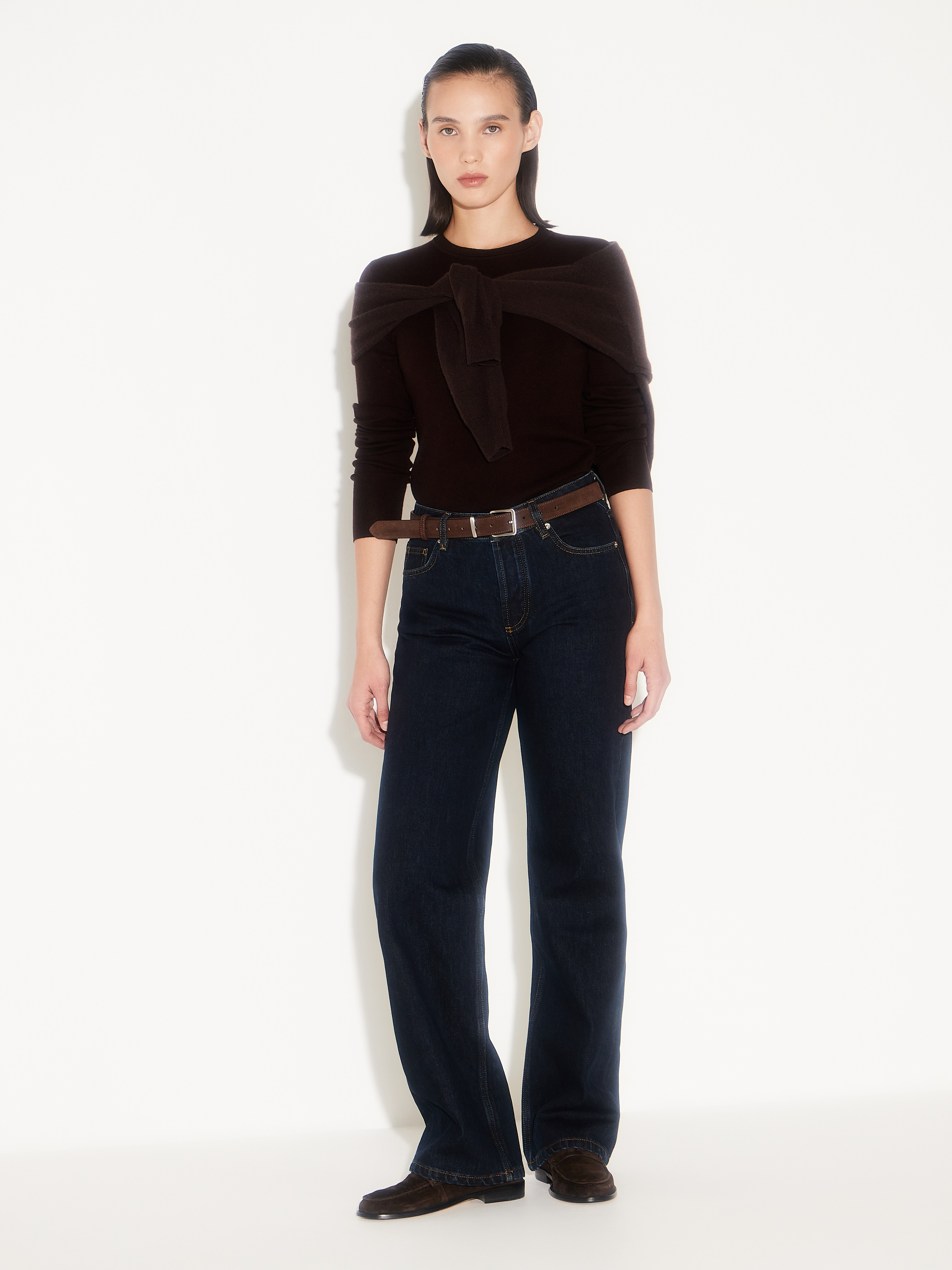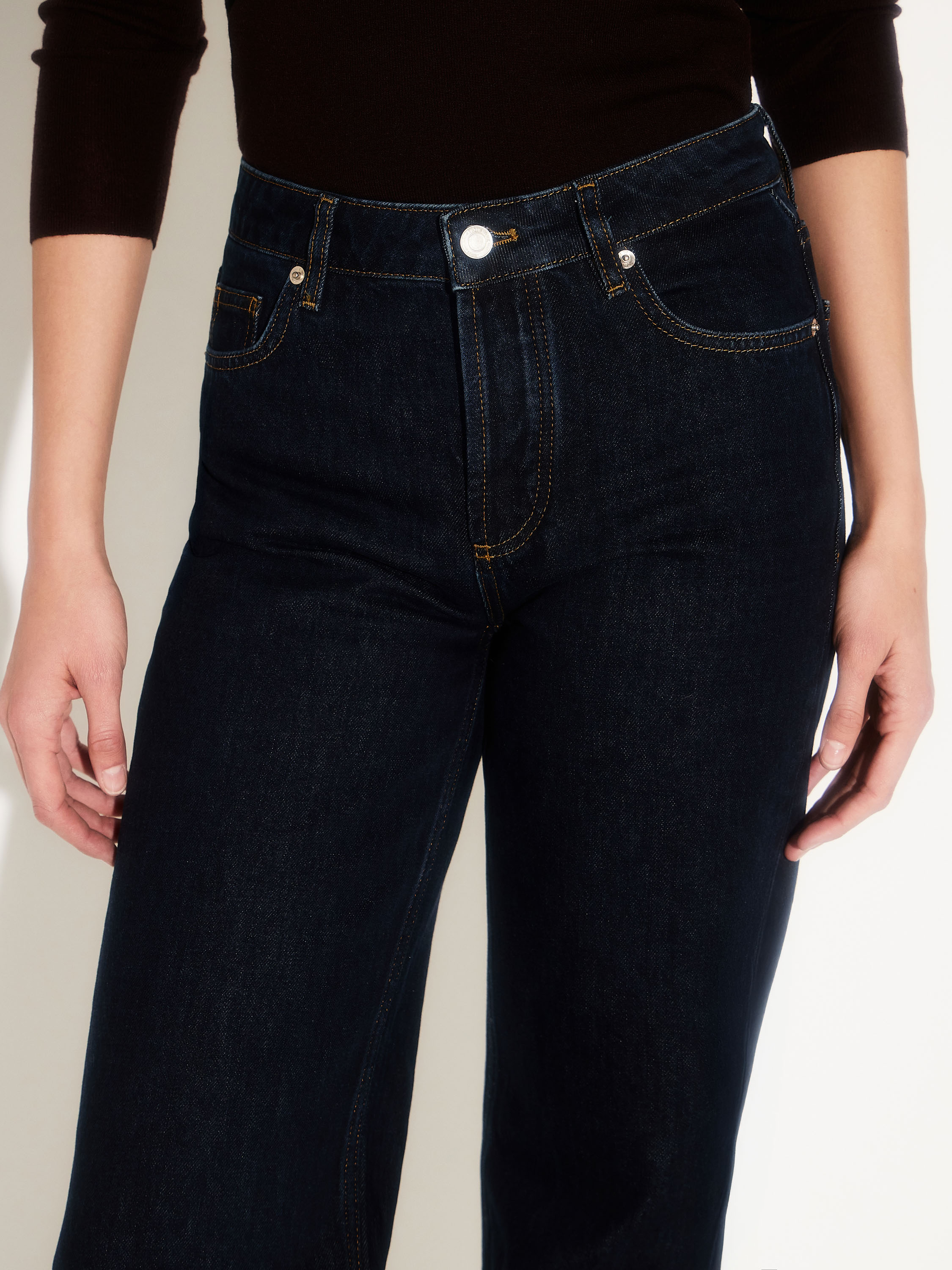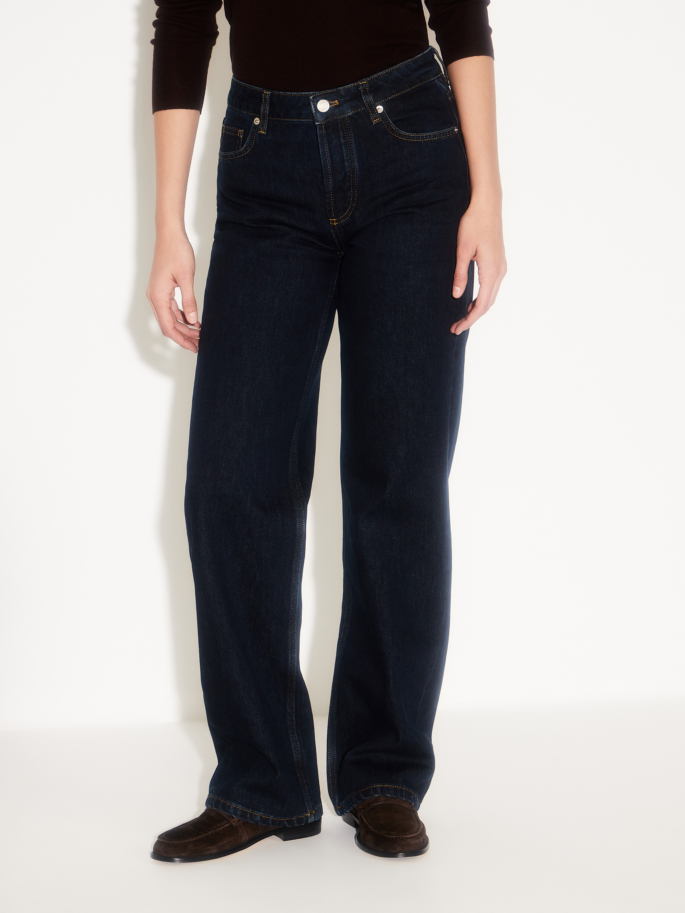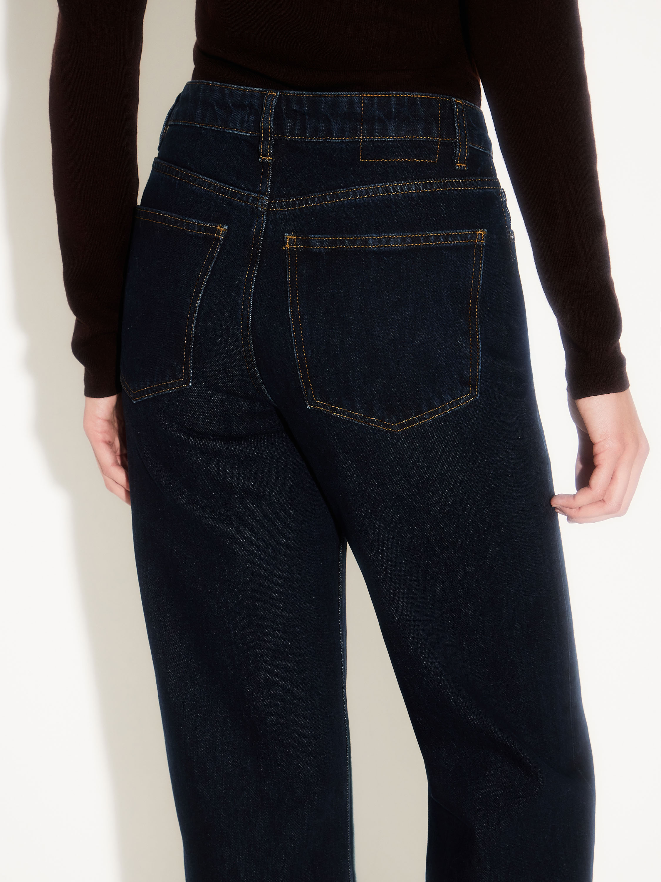 Джинсы из плотного 100% хлопка с чистой текстурой денима и насыщенным индиго-оттенком. Прямой крой и высокая посадка визуально вытягивают силуэт, подчеркивая линию талии. Классическая конструкция с пятью карманами и контрастной отстрочкой придает модели лаконичный, структурный вид. Натуральный хлопок сохраняет форму, обеспечивает комфорт и устойчивость к износу. Универсальная база гардероба — одинаково уместна с рубашками, свитерами, жакетами и лаконичной обувью.
