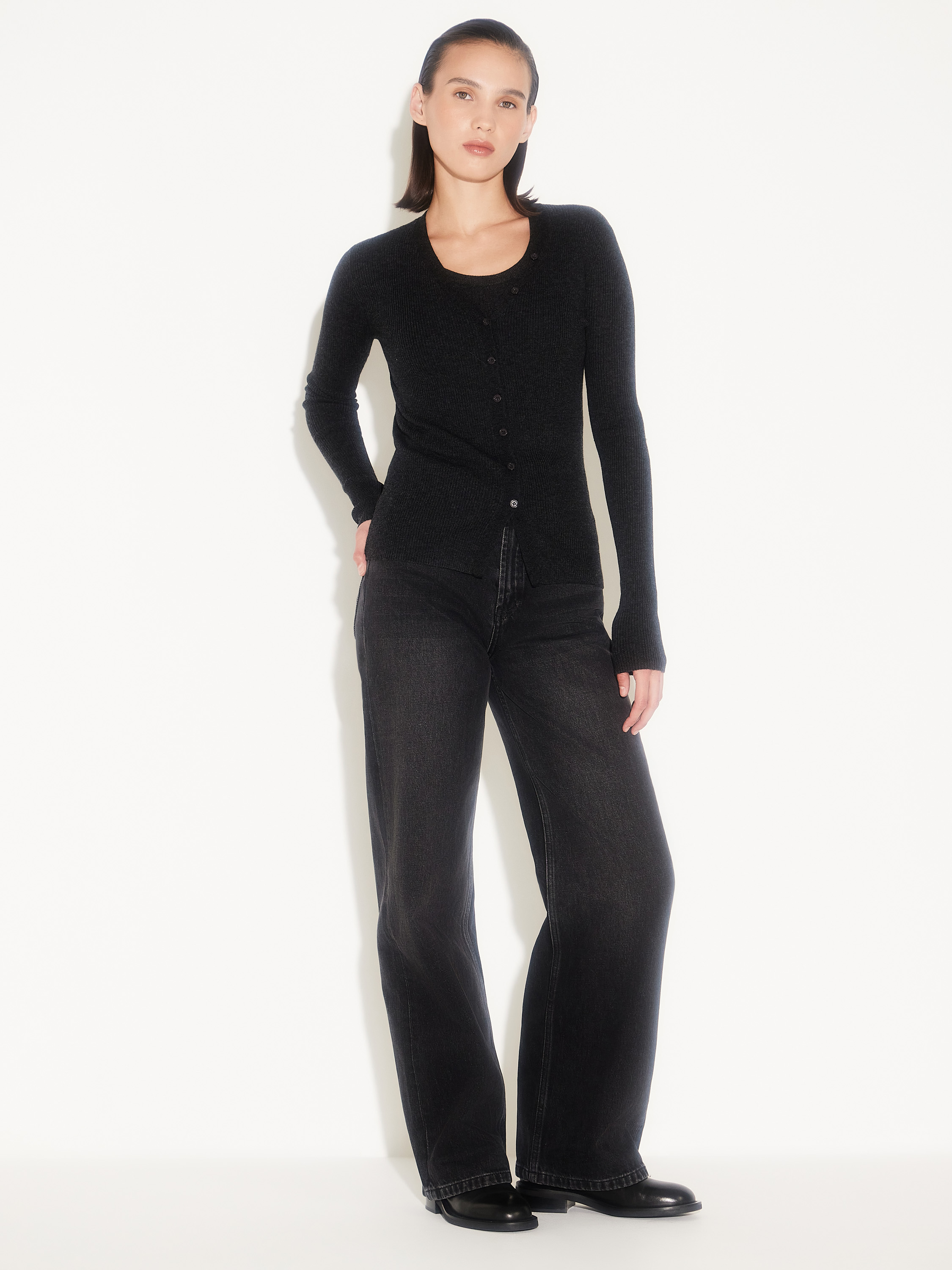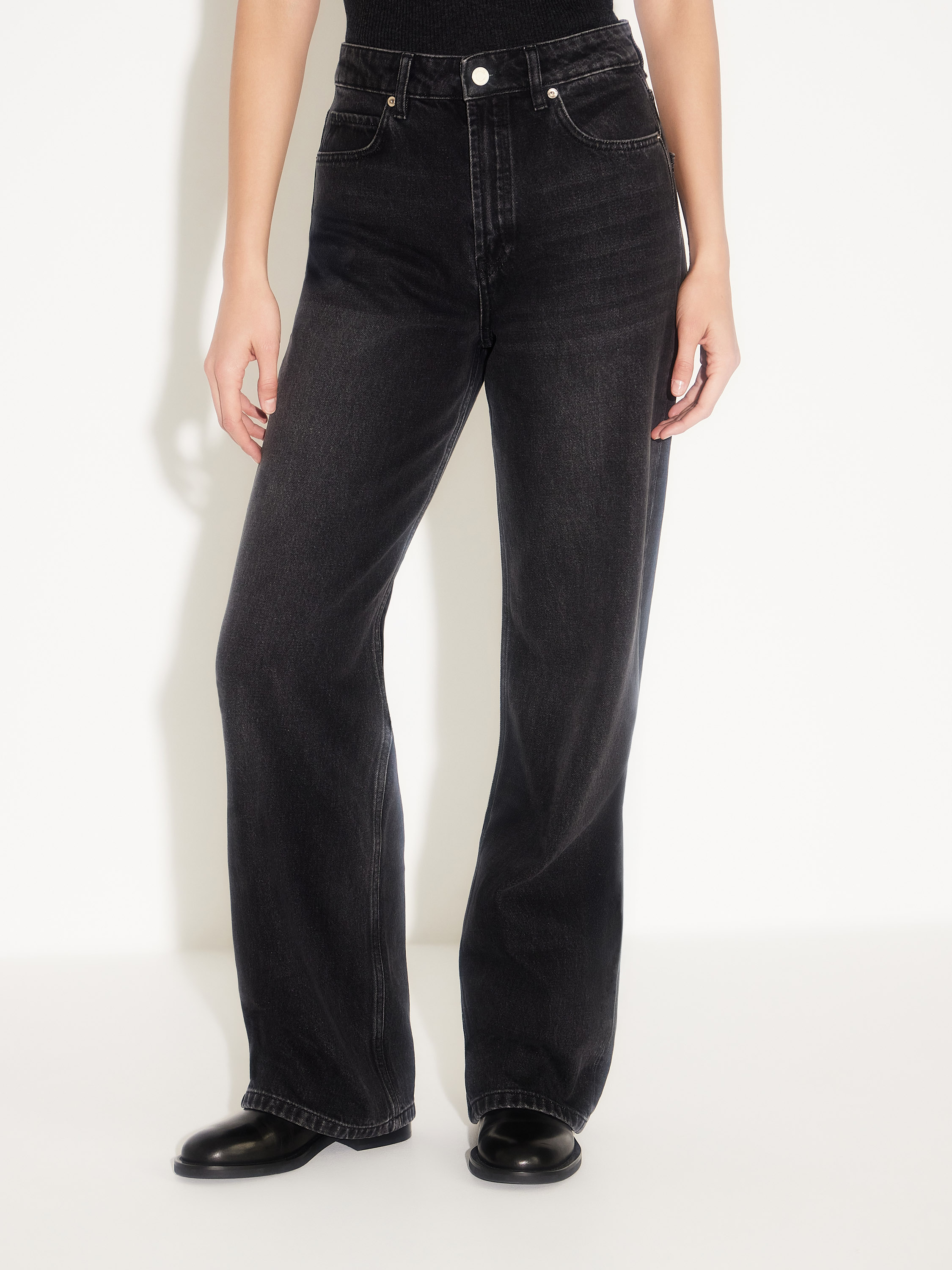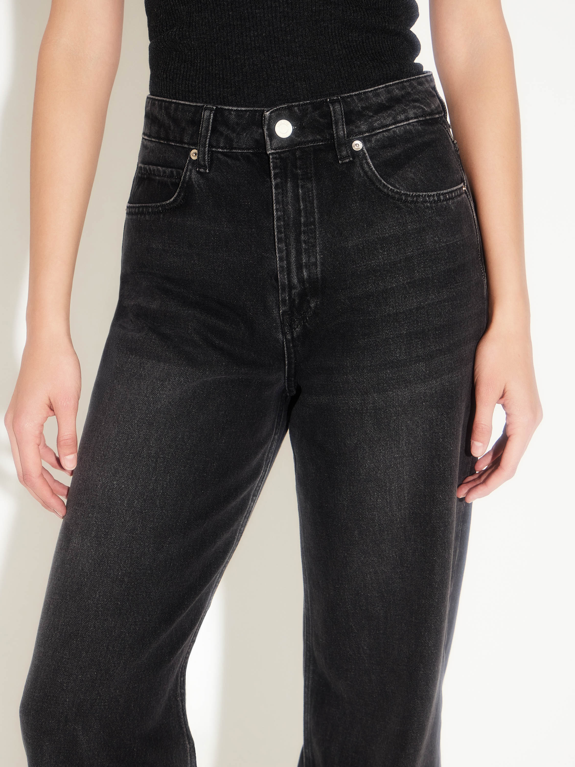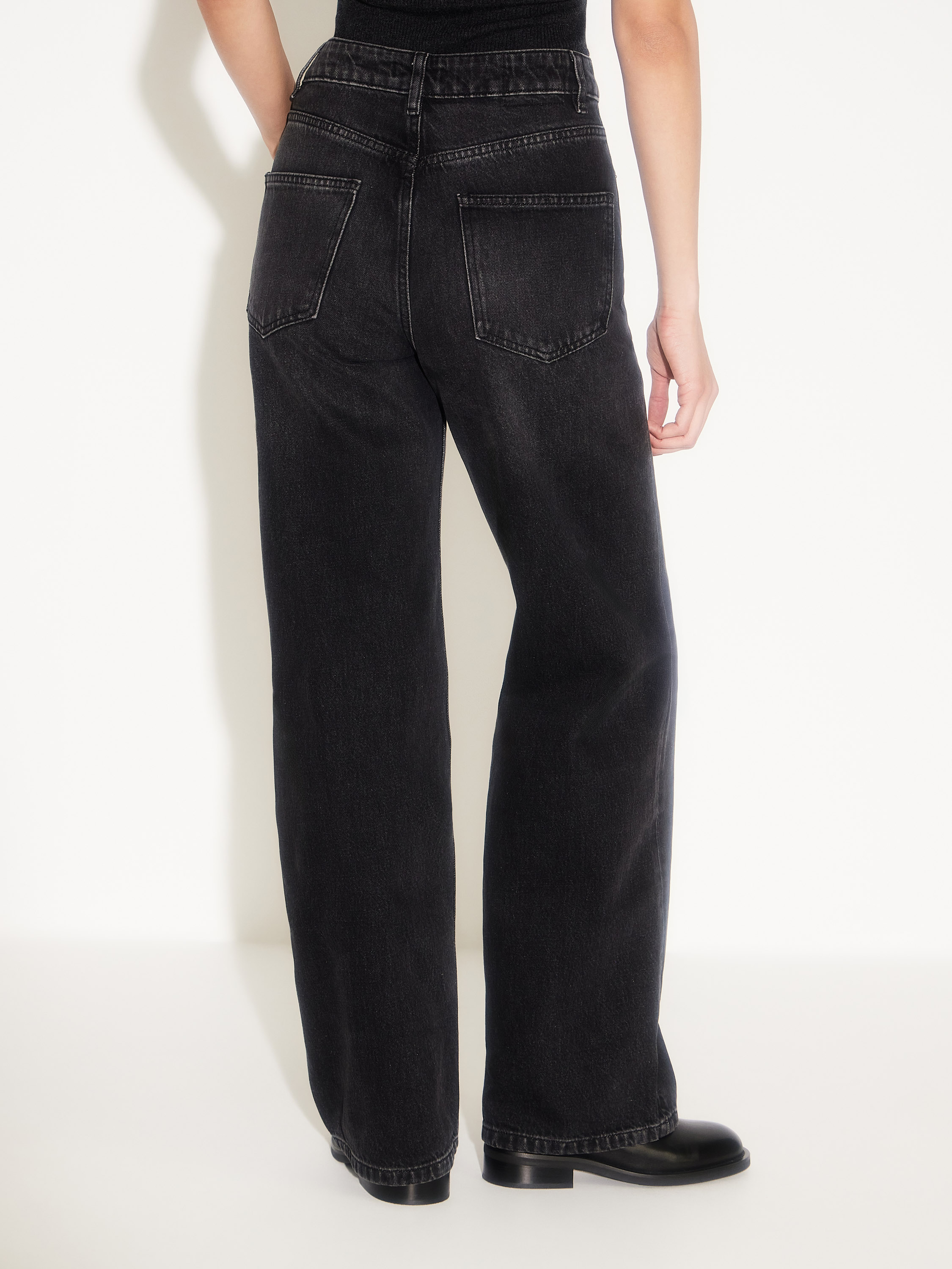 Джинсы прямого кроя из 100% хлопка с выразительной фактурой денима и легким винтажным эффектом тона. Модель с высокой посадкой и классической пятью карманами подчеркивает талию и создает чистый, вытянутый силуэт. Плотная, но дышащая ткань держит форму и становится мягче с каждым ношением. Универсальный черный оттенок делает джинсы базовым элементом гардероба — они одинаково органичны в повседневных и собранных образах, с рубашками, жакетами, трикотажем или обувью на плоском ходу.