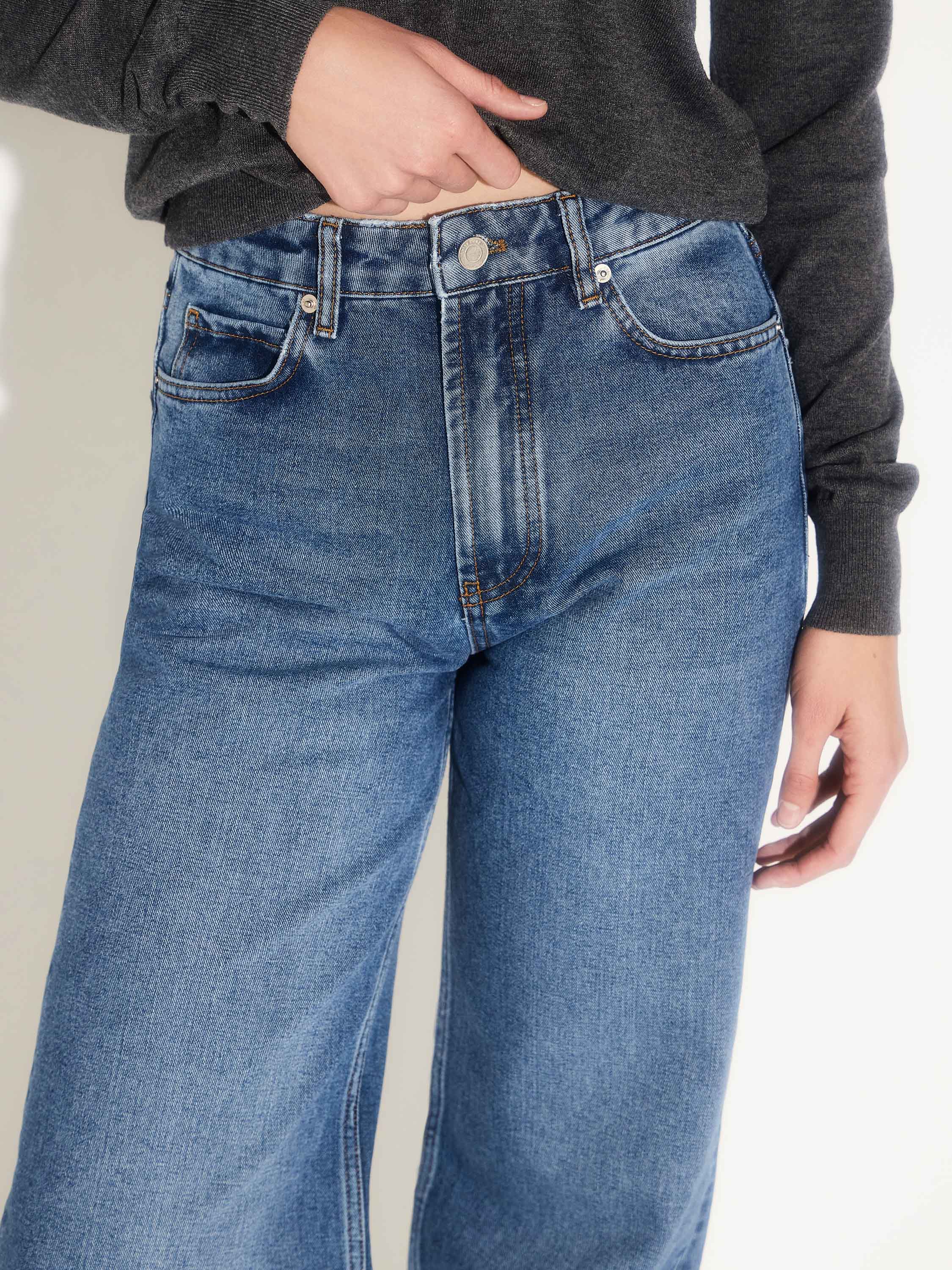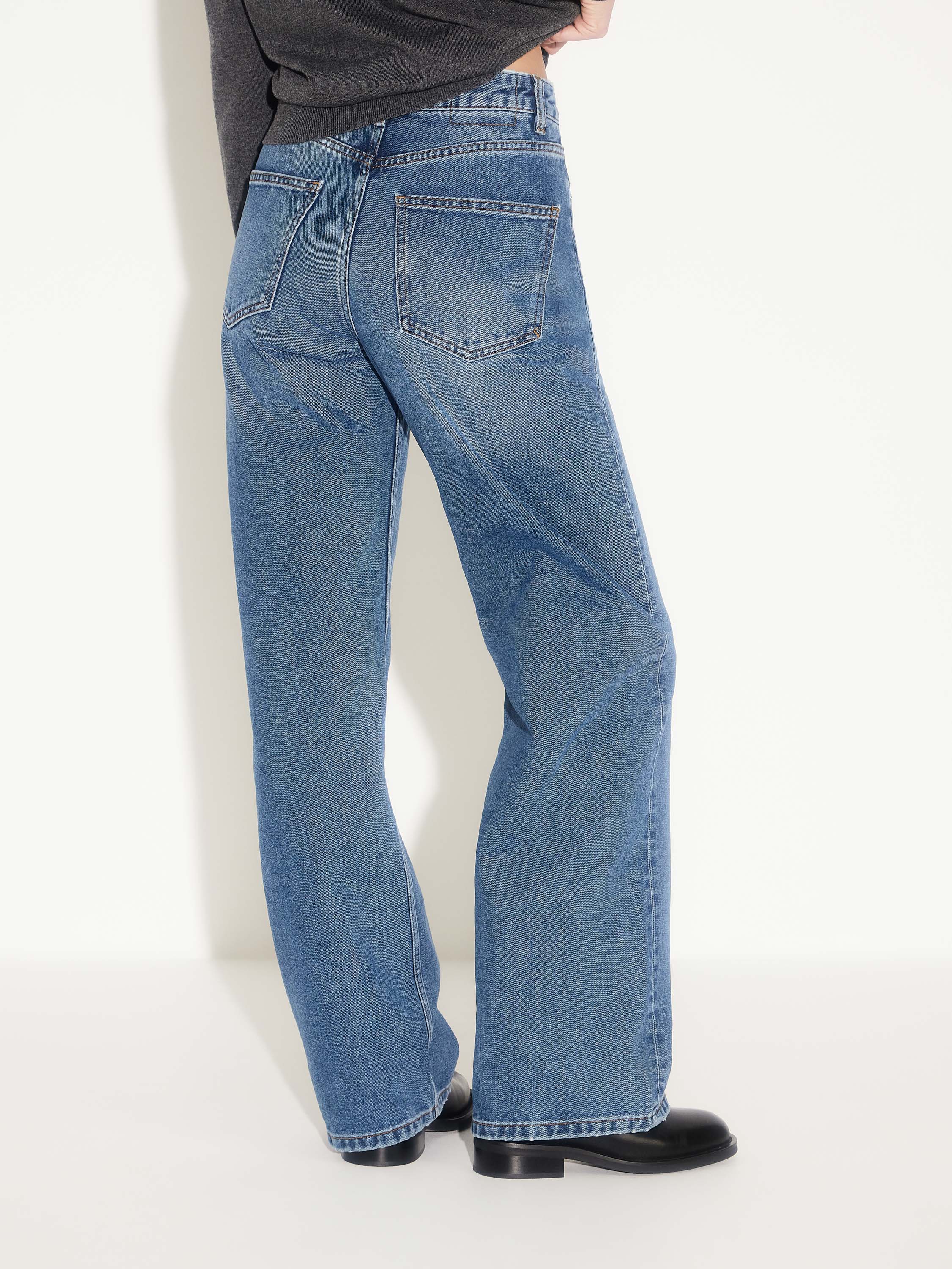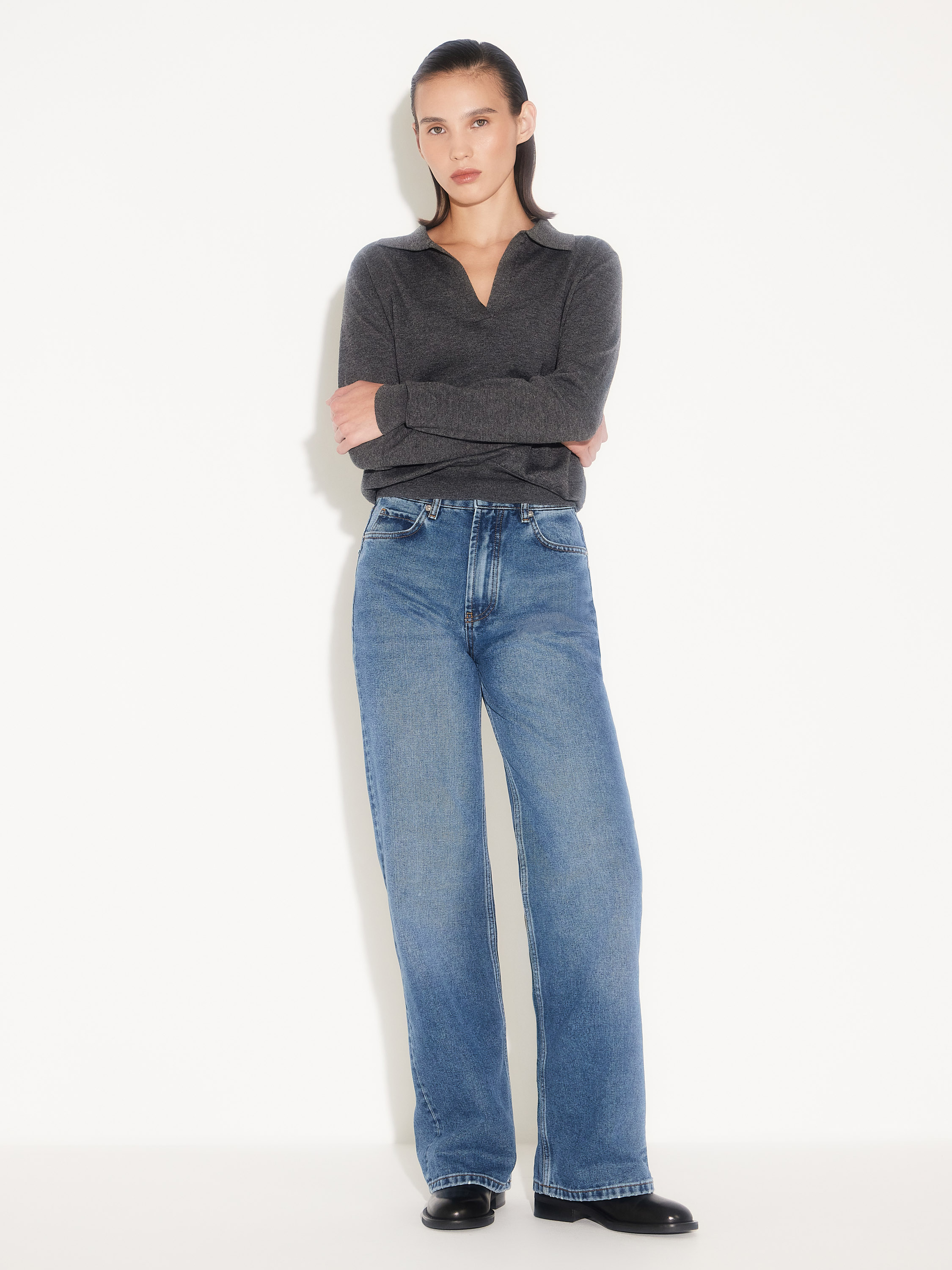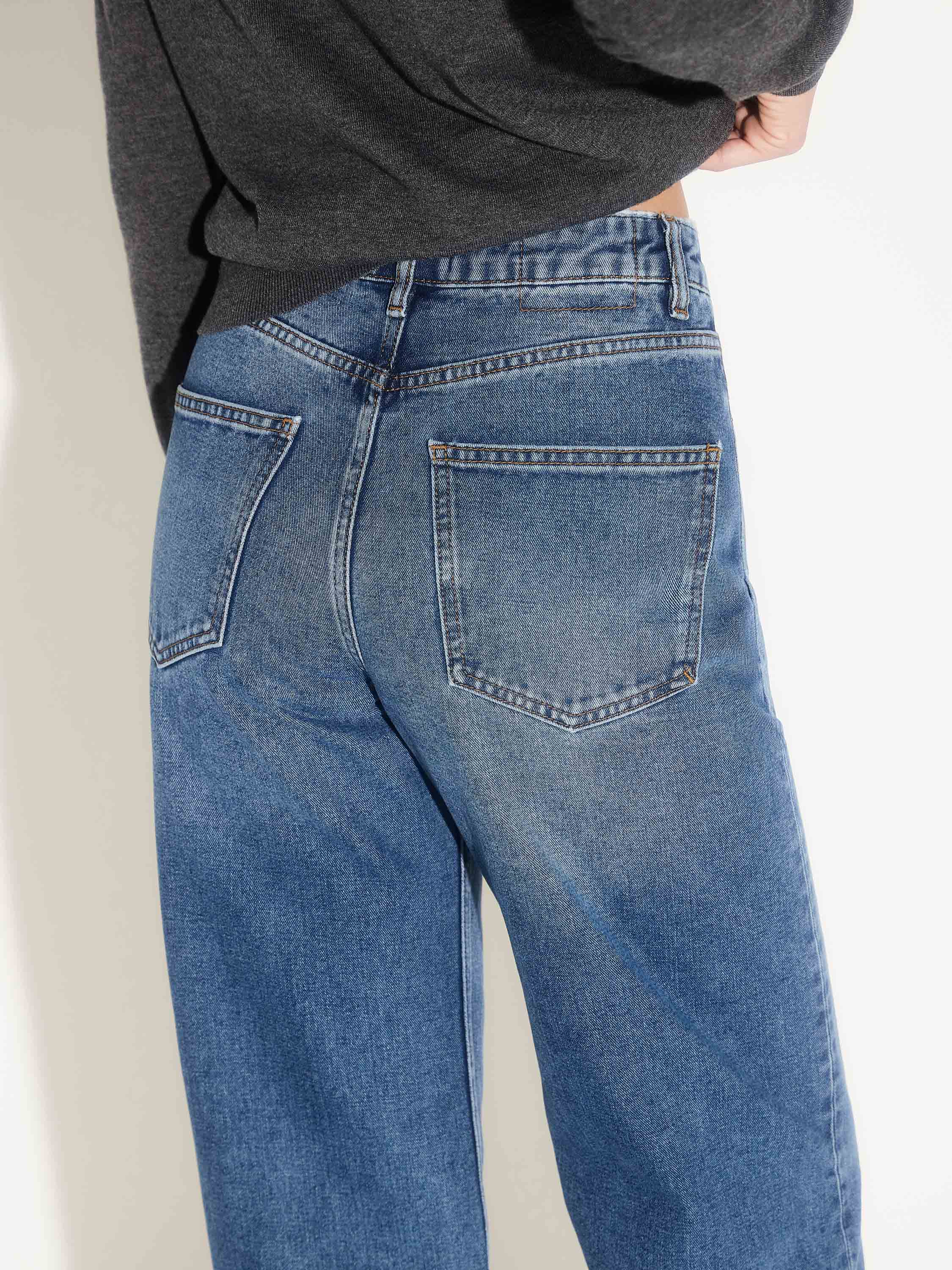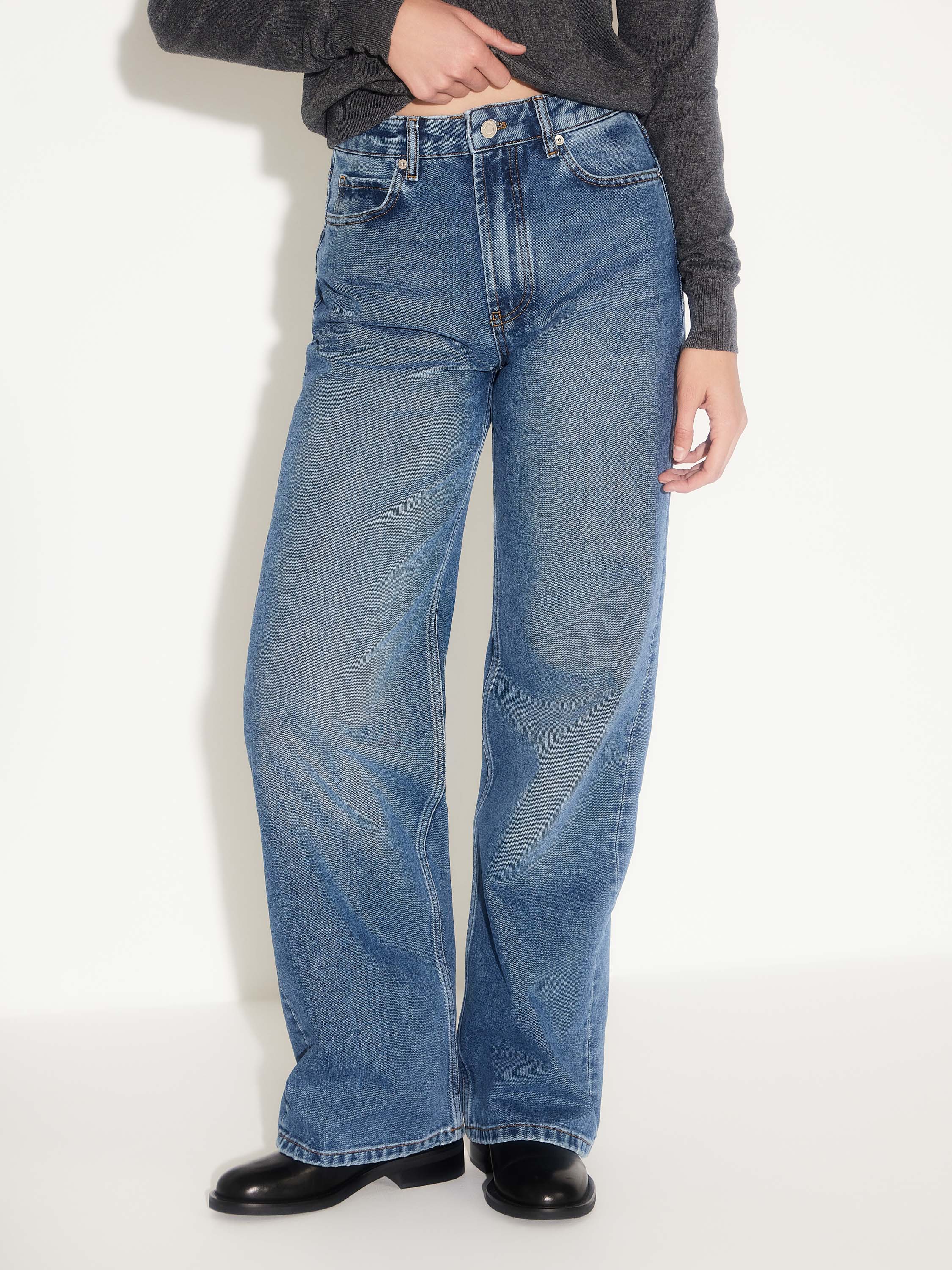 Джинсы свободного кроя с высокой посадкой, выполненные из плотного денима на основе хлопка. Смесовая ткань с добавлением полиэстера и района сочетает устойчивость формы и приятную мягкость, благодаря чему изделие комфортно в носке и сохраняет аккуратный вид. Классический синий деним, чистые линии и минимальная отделка делают модель универсальной — она легко впишется и в повседневный гардероб, и в более собранные образы с рубашкой, жакетом или кашемировым джемпером.
