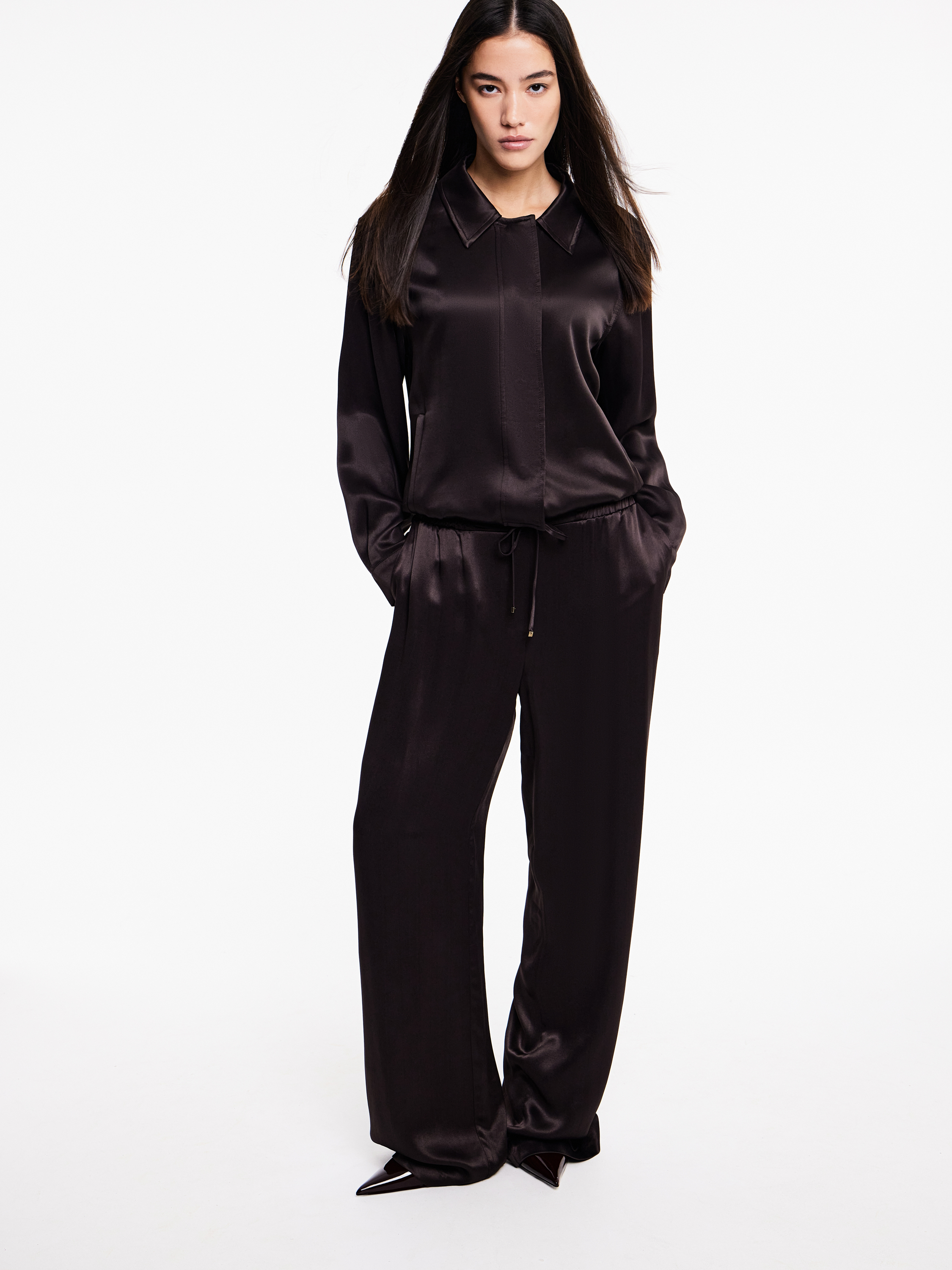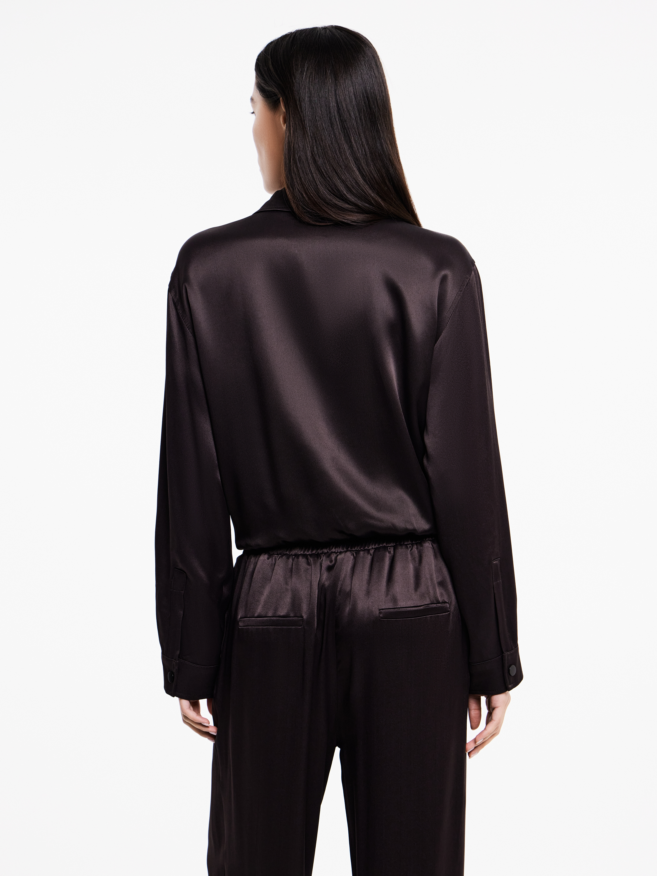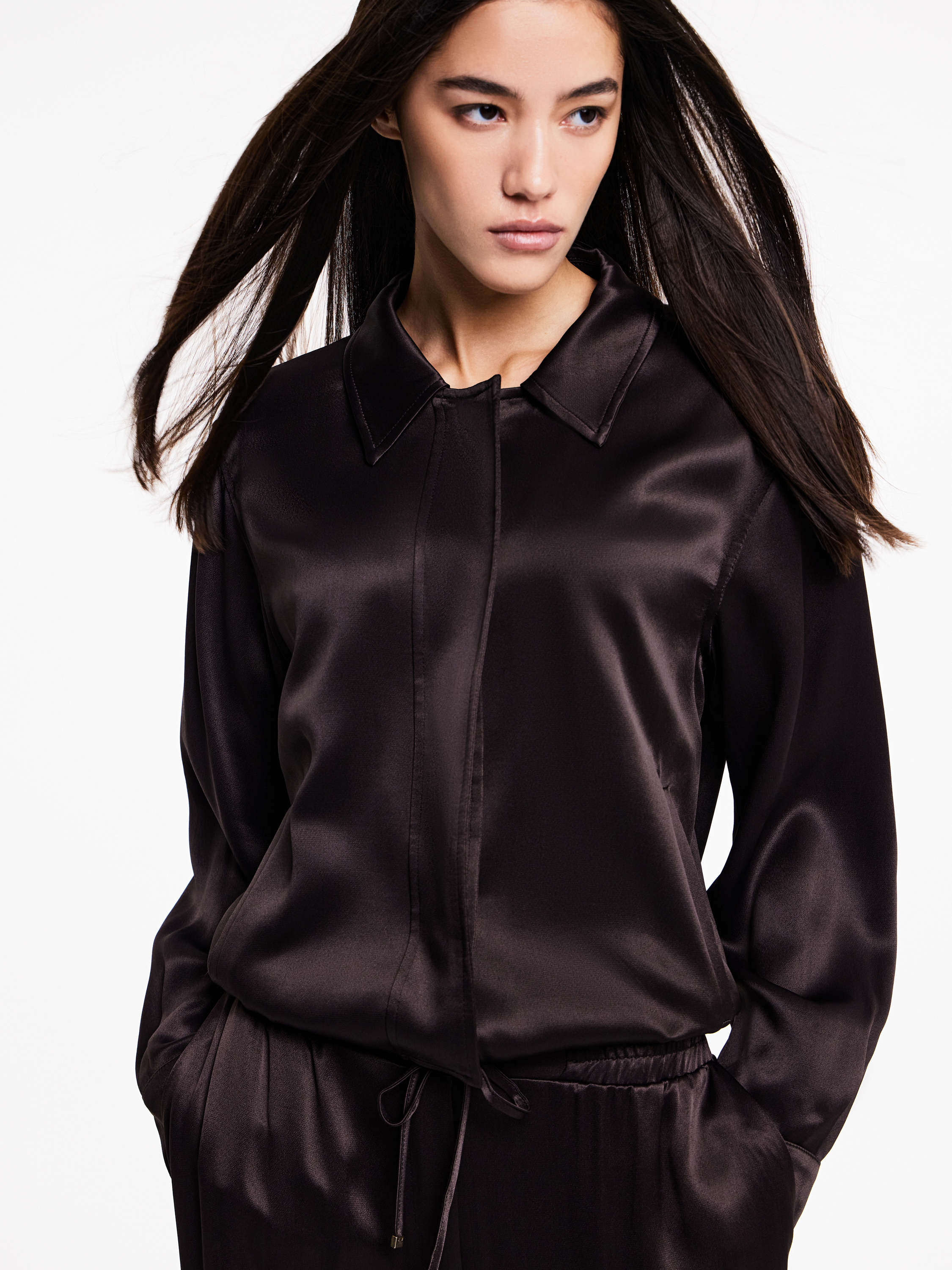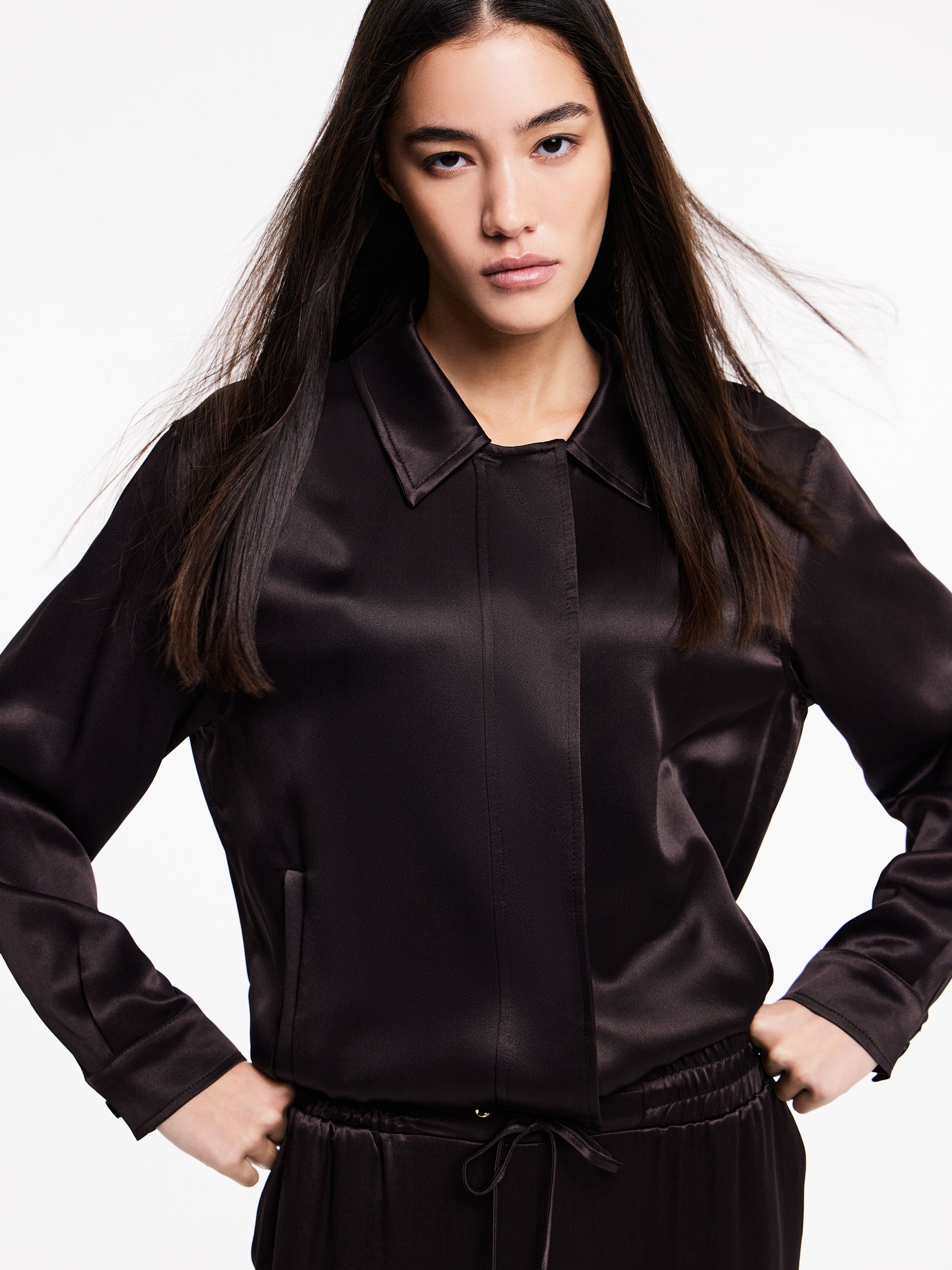 Бомбер из гладкого атласного района с мягким, благородным отливом. Материал прохладный на ощупь, пластичный, красиво скользит и держит аккуратную драпировку. Отложной воротник и потайная планка на пуговицах поддерживают чистую геометрию модели, а длинные рукава завершены узкими манжетами с застежкой на пуговицу в тон. Лаконичная обработка швов и выверенные пропорции делают бомбер универсальным: он одинаково хорошо работает с юбками из текучих тканей и широкими брюками. Представлен в двух оттенках — глубокий коричневый и благородный сливовый.