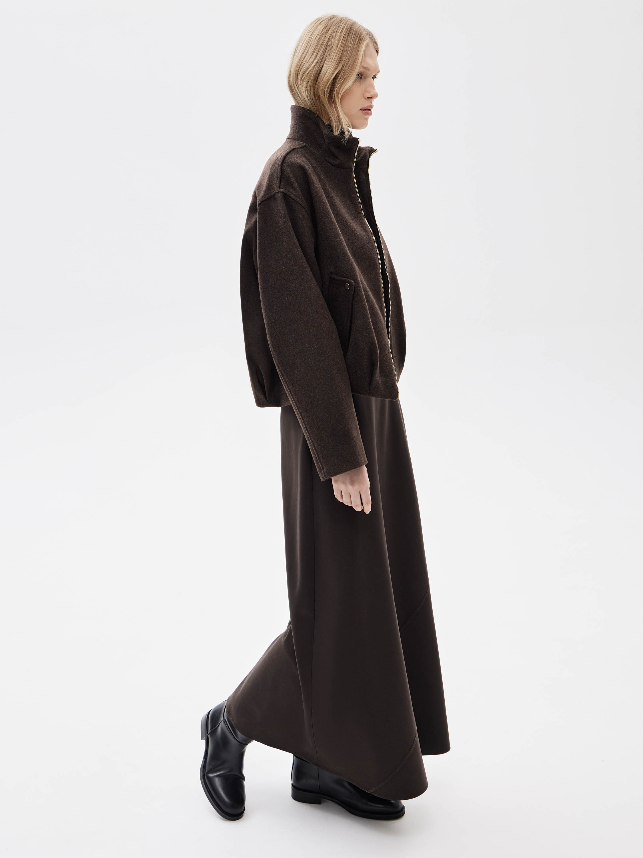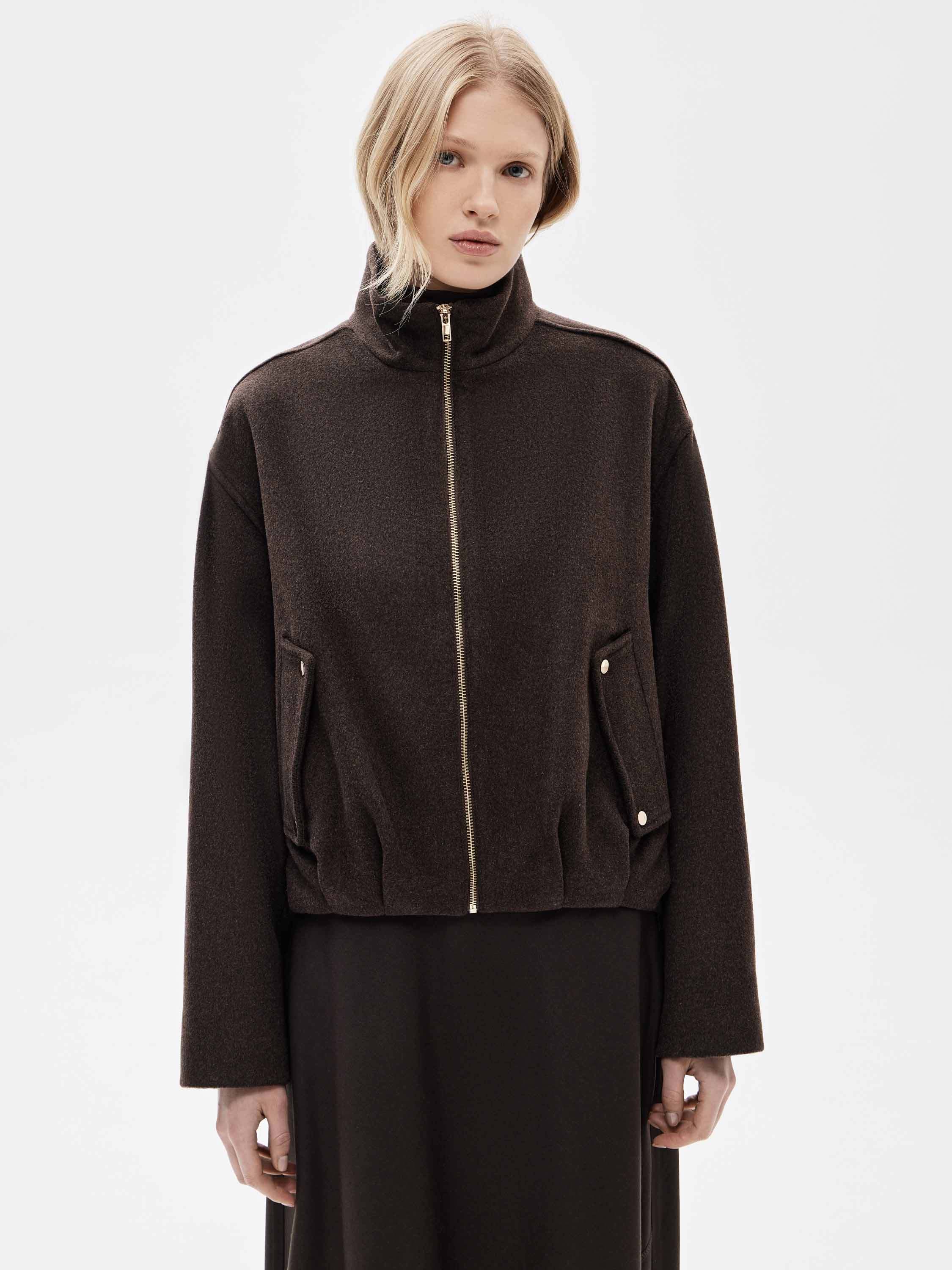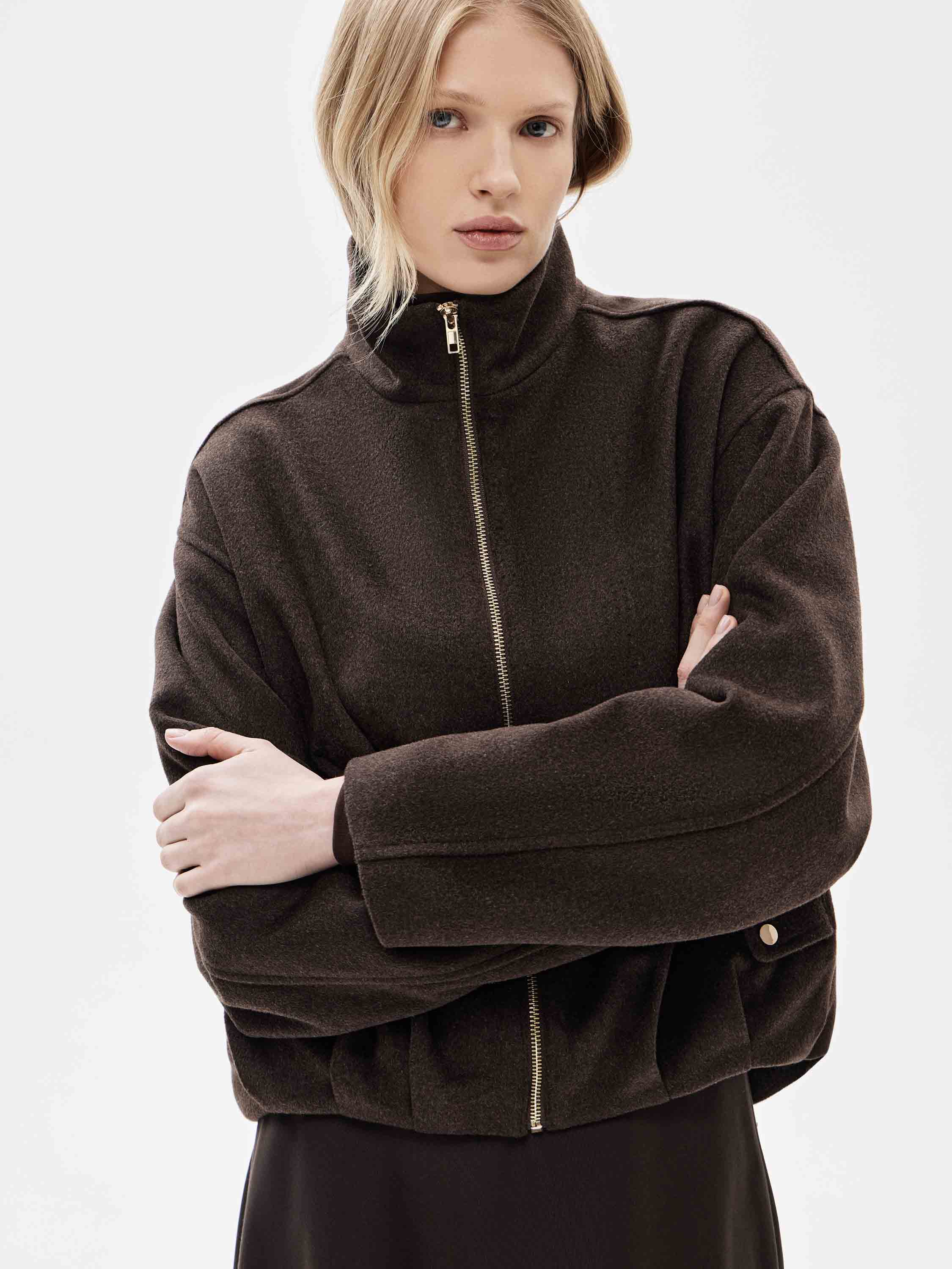 Бомбер выполнен из плотного полотна из смесовой шерсти со сбалансированной структурой, которое хорошо держит форму и сохраняет аккуратный внешний вид в носке. Материал ощущается плотным, без излишней жесткости. Модель прямого кроя, с мягкой линией плеч и оформленным низом на притачном поясе, который аккуратно собирает объем и формирует четкую линию по низу. Высокий воротник-стойка и центральная застежка на молнию выстраивают чистую вертикаль и задают сдержанный характер модели. Карманы с клапанами добавляют функциональность и поддерживают архитектуру кроя. Бомбер сочетается с юбками, костюмными и широкими брюками, а также тонким трикотажем, органично вписываясь в современный городской гардероб.