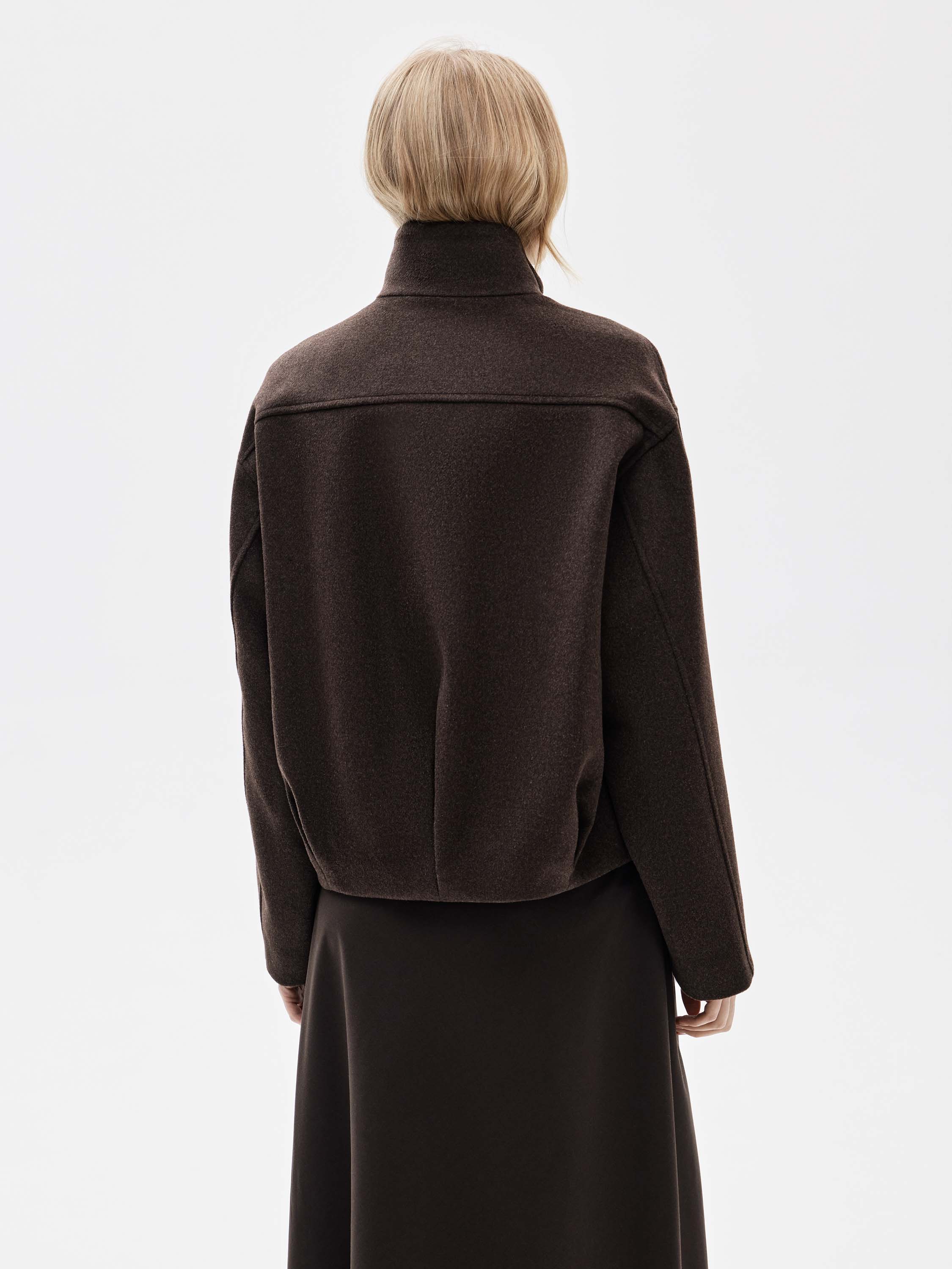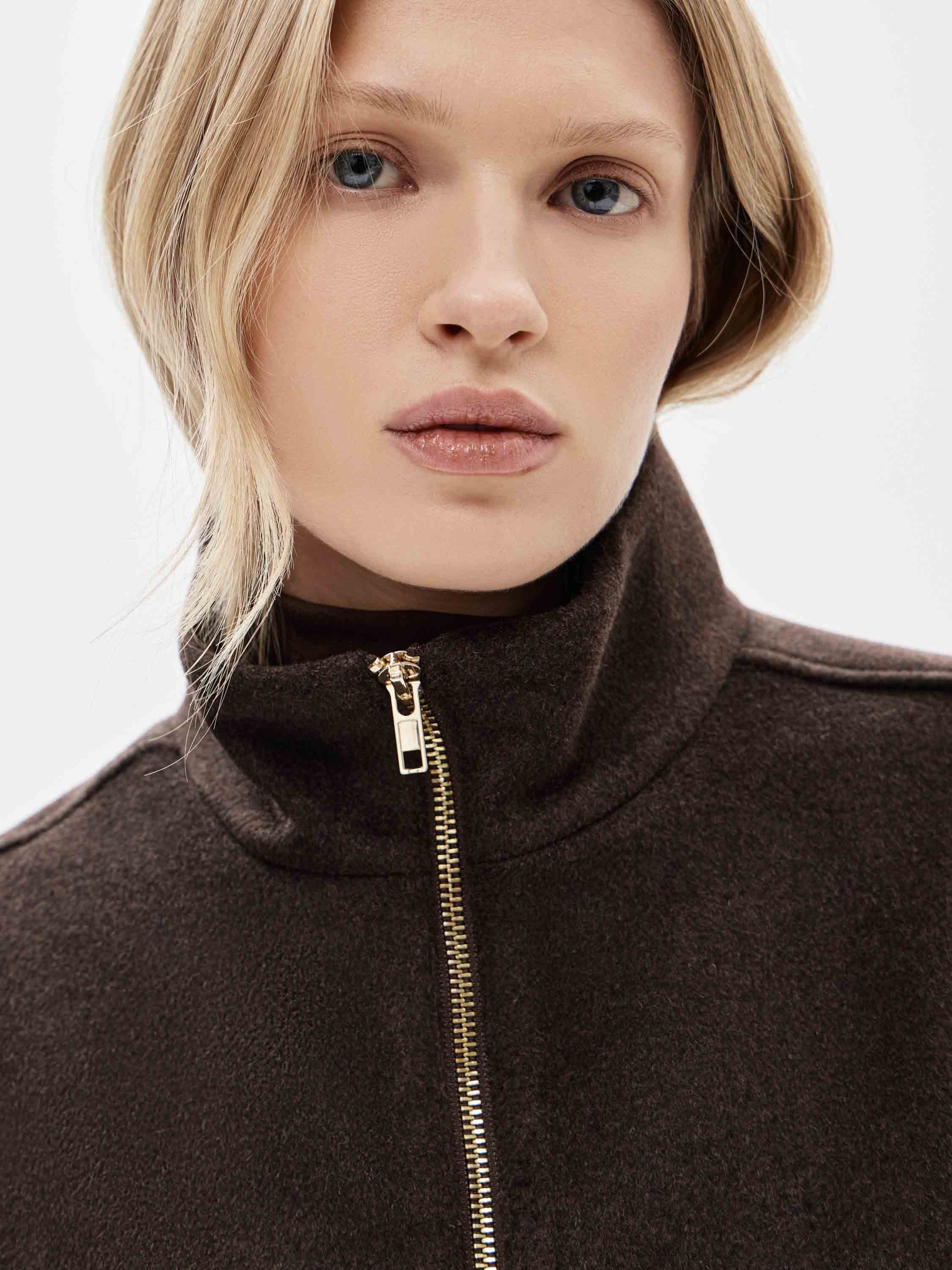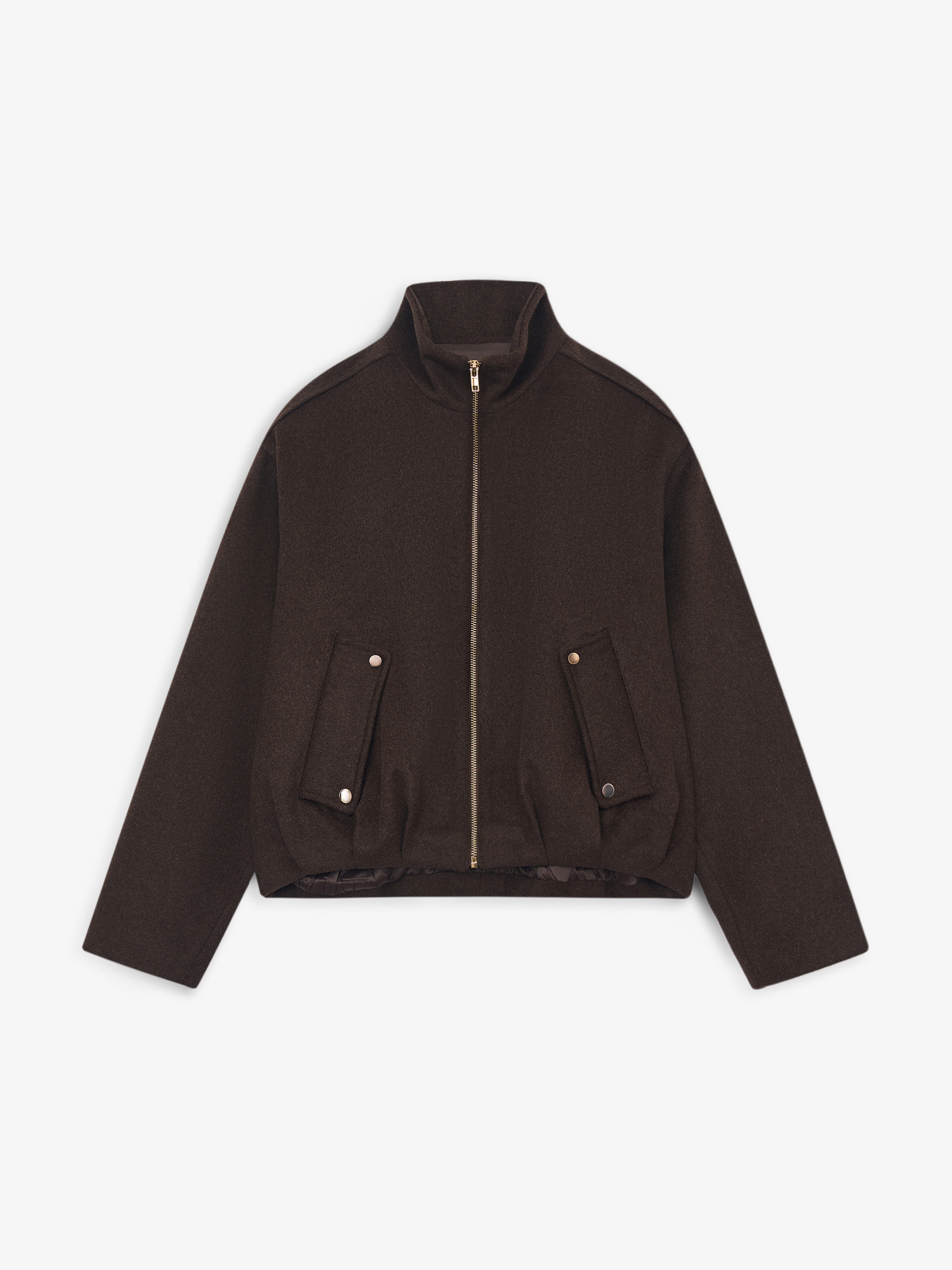 Бомбер выполнен из плотного полотна из смесовой шерсти со сбалансированной структурой, которое хорошо держит форму и сохраняет аккуратный внешний вид в носке. Материал ощущается плотным, без излишней жесткости. Модель прямого кроя, с мягкой линией плеч и оформленным низом на притачном поясе, который аккуратно собирает объем и формирует четкую линию по низу. Высокий воротник-стойка и центральная застежка на молнию выстраивают чистую вертикаль и задают сдержанный характер модели. Карманы с клапанами добавляют функциональность и поддерживают архитектуру кроя. Бомбер сочетается с юбками, костюмными и широкими брюками, а также тонким трикотажем, органично вписываясь в современный городской гардероб.