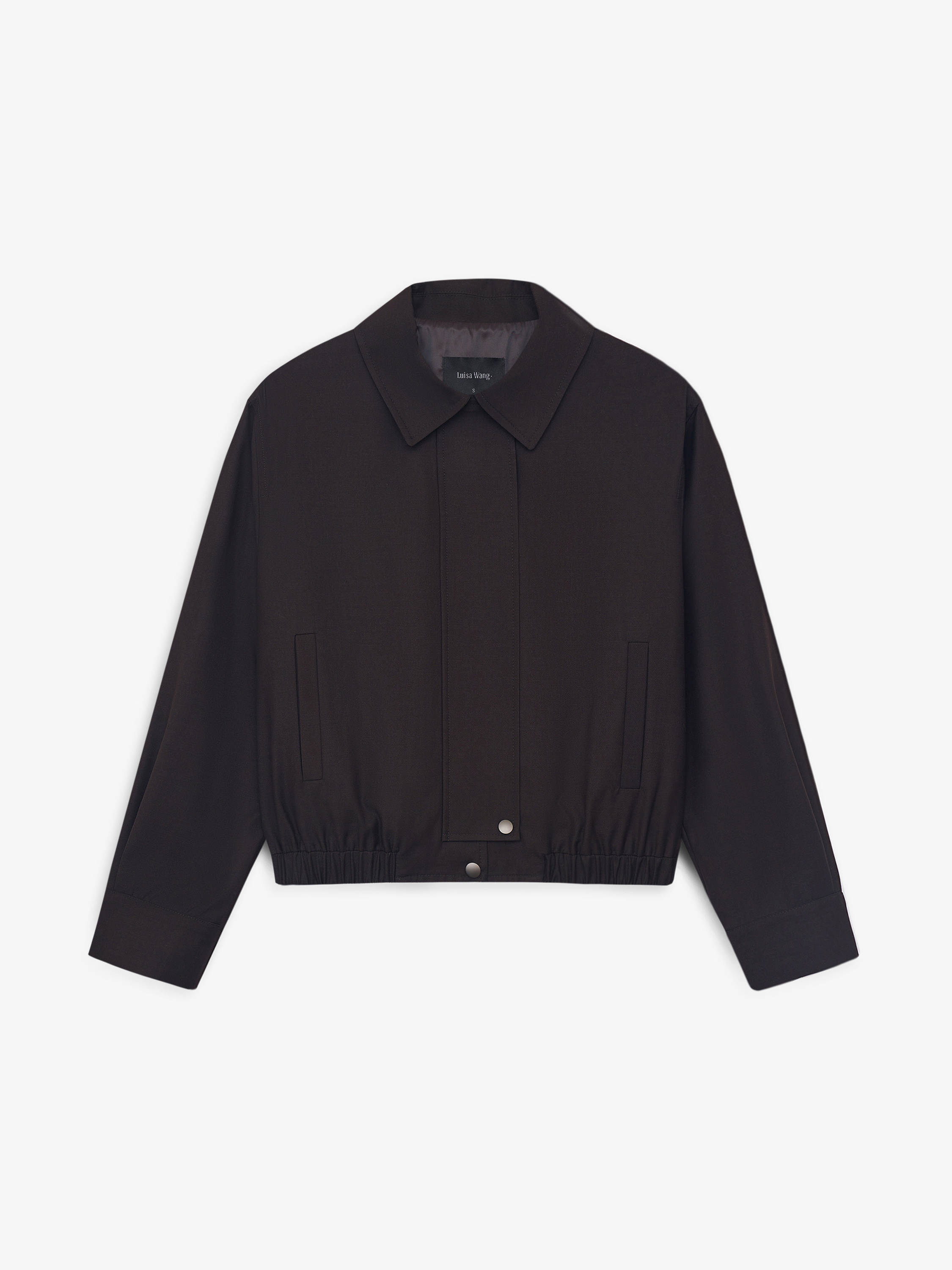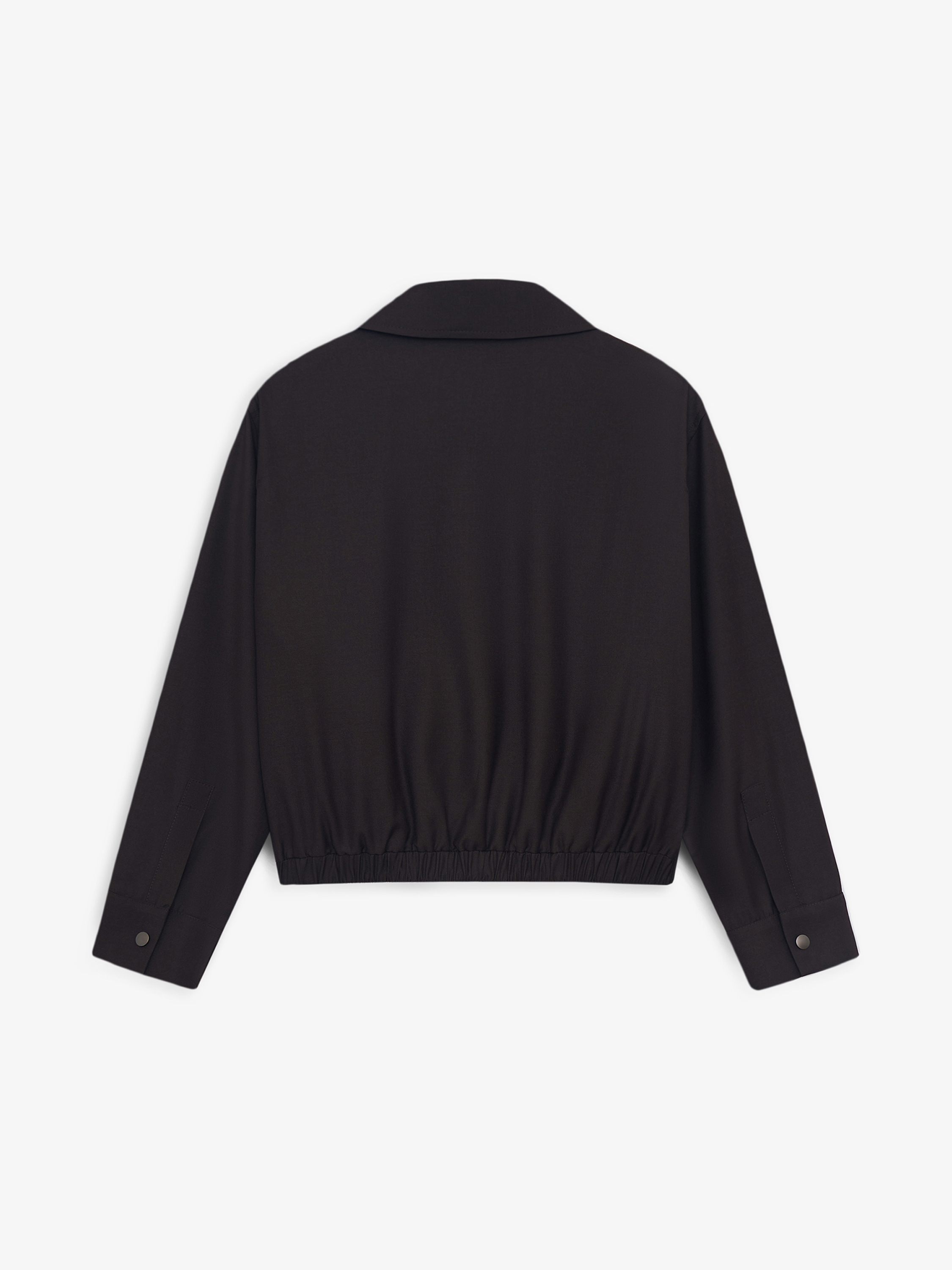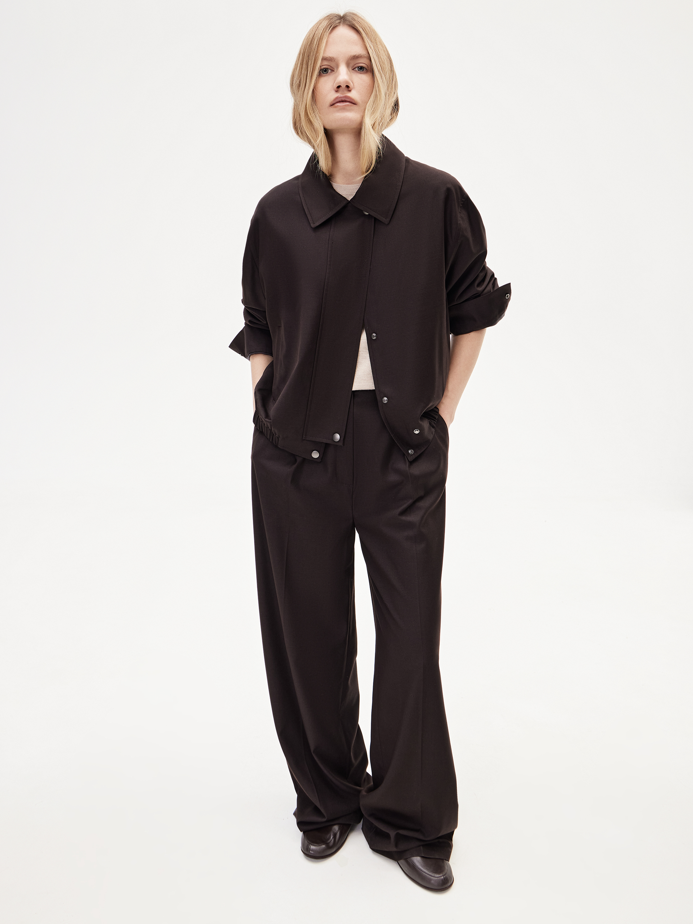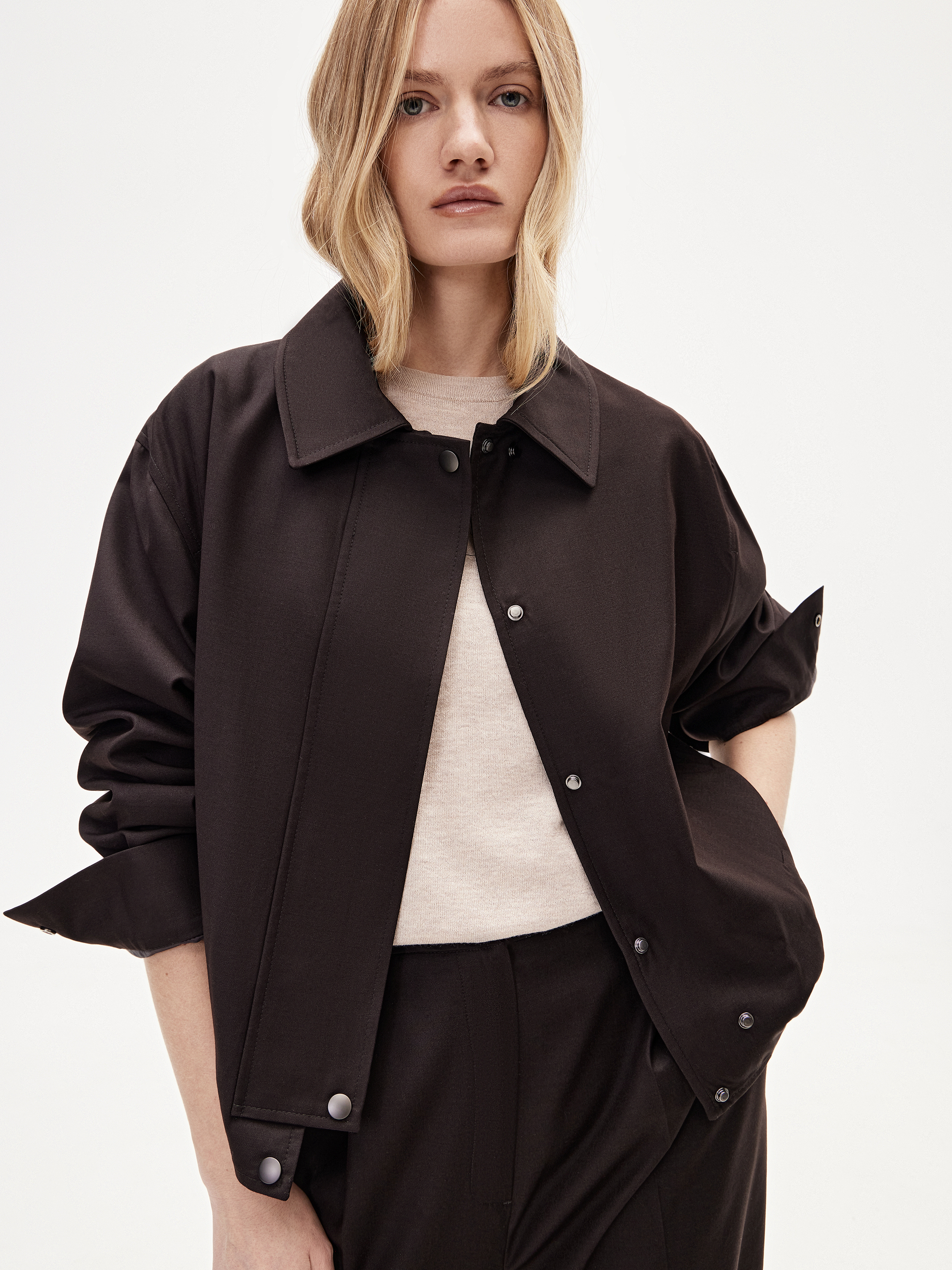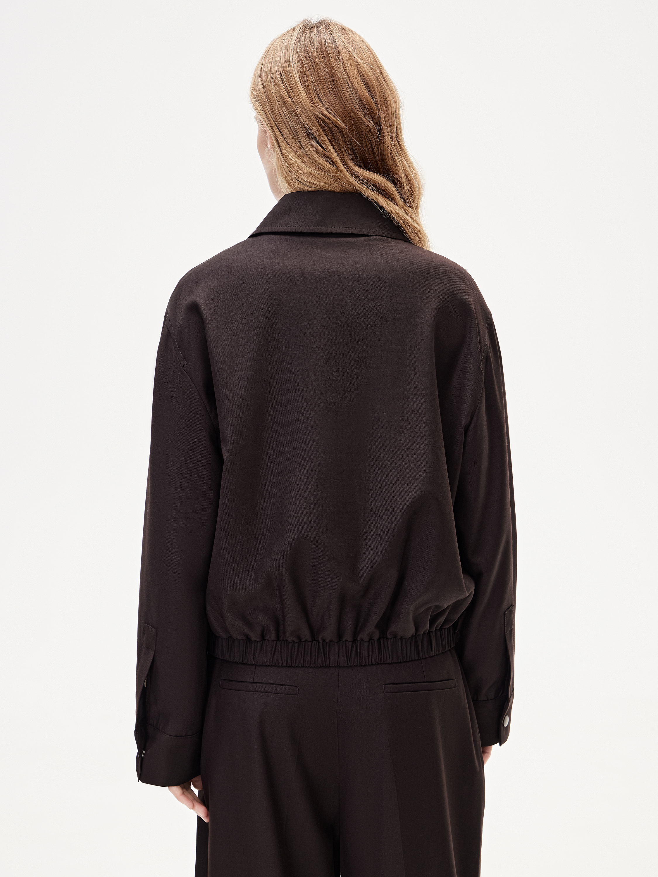 Бомбер укороченного кроя с мягкой линией плеча и объемным рукавом формирует современный силуэт с акцентом на верхнюю часть. Посадка свободная, за счет эластичной линии низа модель аккуратно собирается и сохраняет четкость формы. Смесовое полотно с добавлением вискозы и шерсти отличается плотностью и пластичностью, хорошо держит форму и комфортно в течение дня. Вискоза придает ткани мягкость и гладкость, шерсть добавляет глубину фактуры. Материал выглядит благородно и долго сохраняет аккуратный внешний вид. Глубокий темно-коричневый оттенок универсален и легко сочетается с базовой палитрой. Модель выполнена с отложным воротником, застежкой на кнопки и боковыми карманами. Носите с брюками из комплекта, денимом или лаконичным трикотажем.