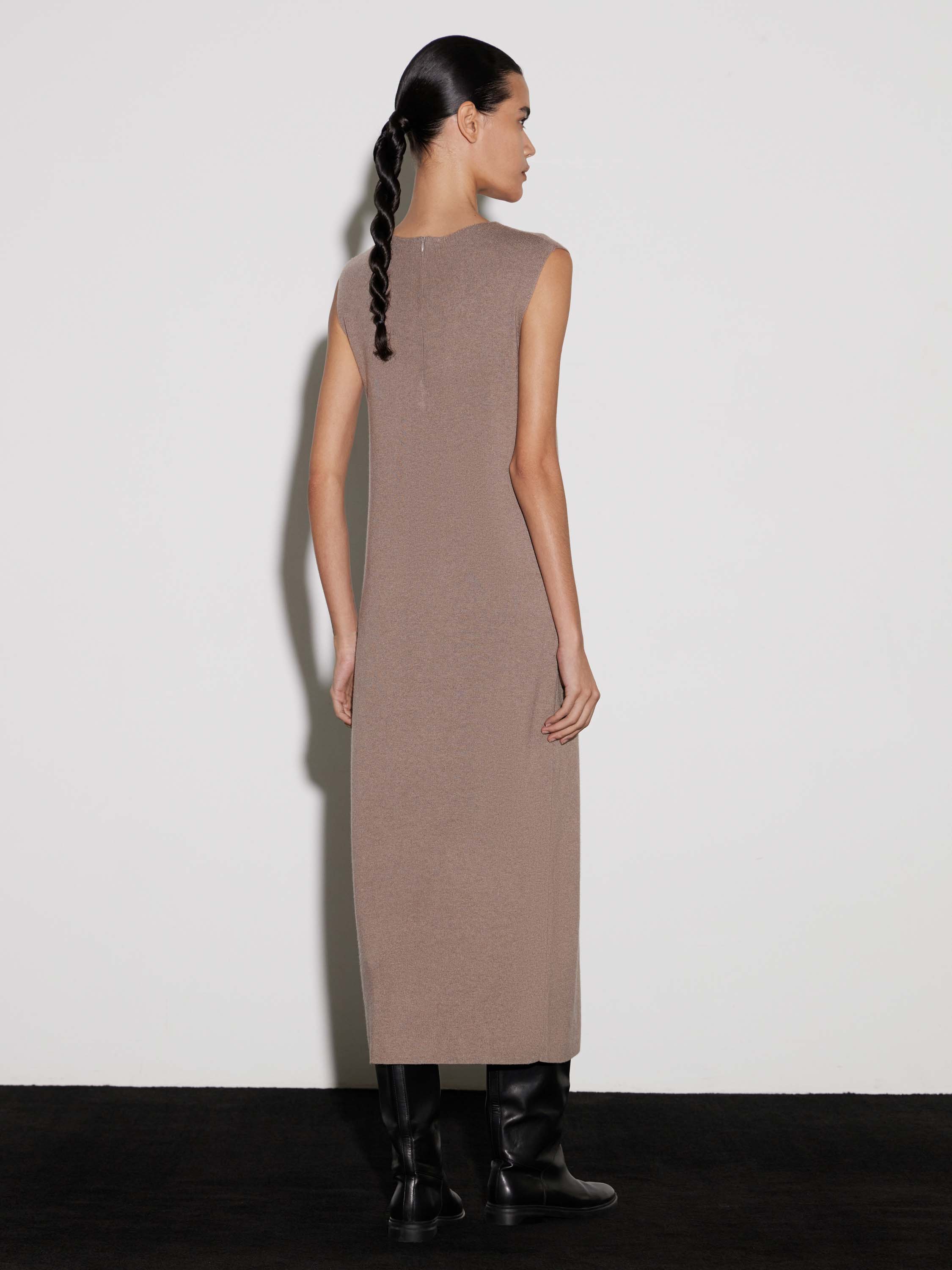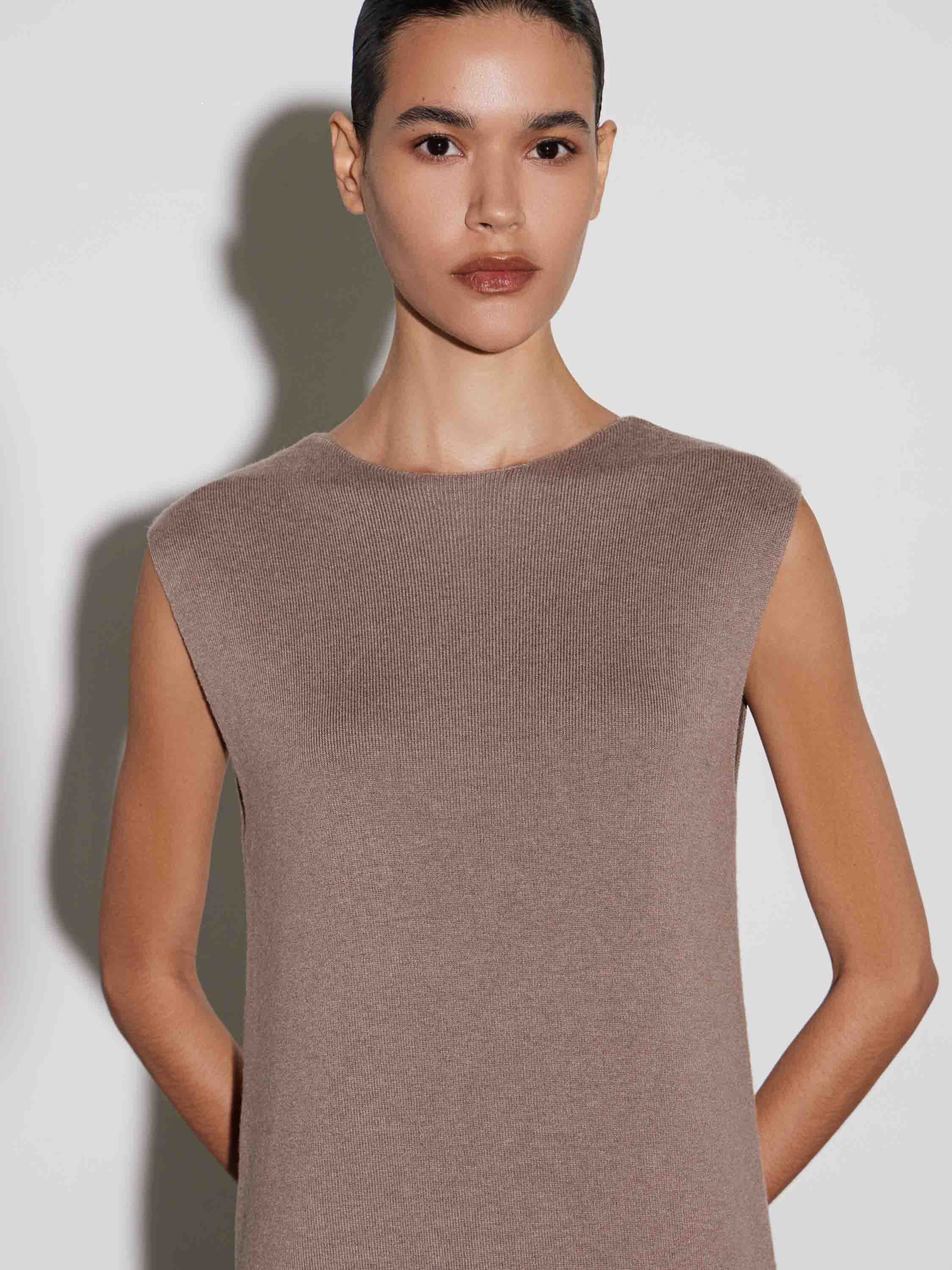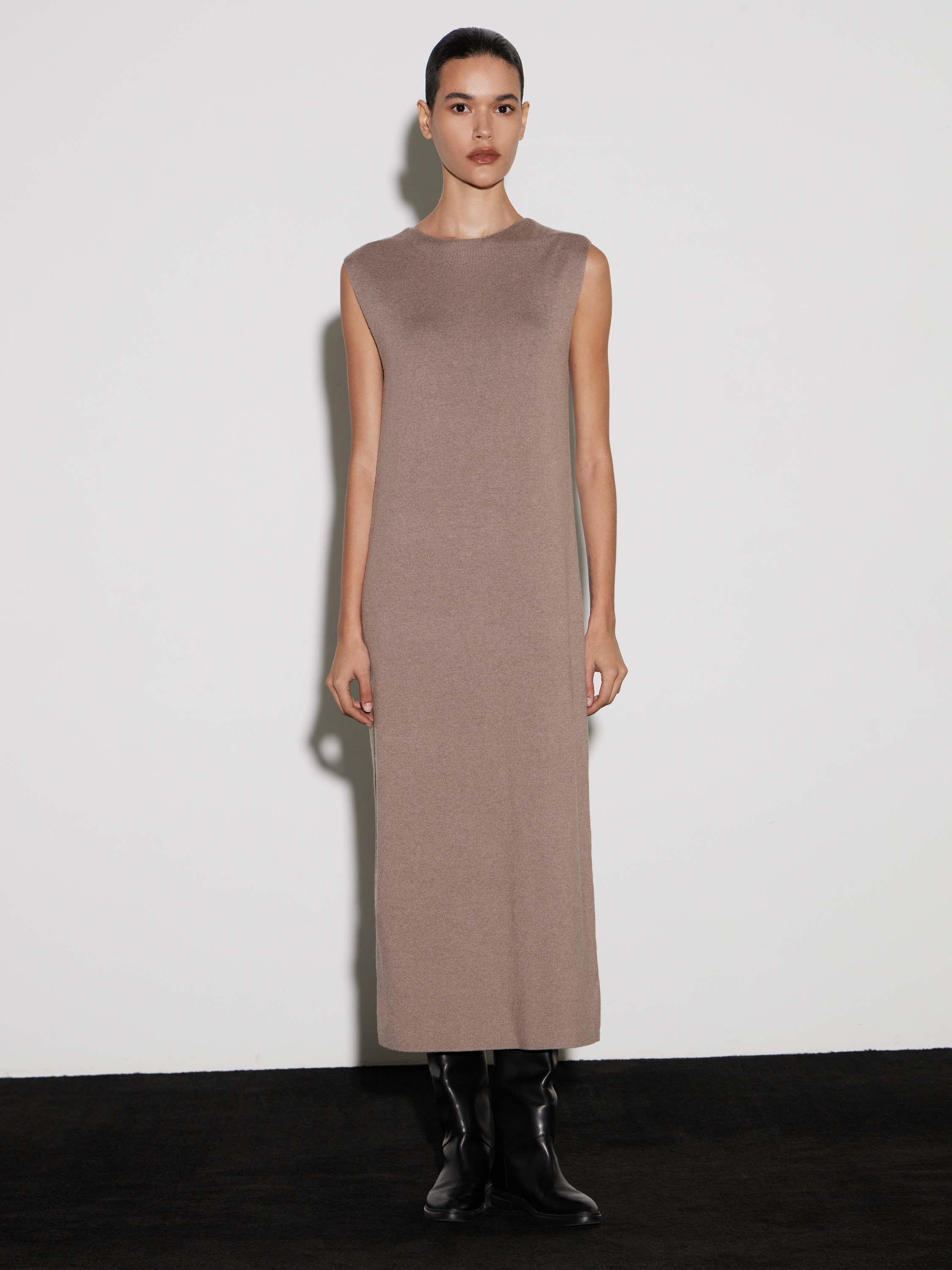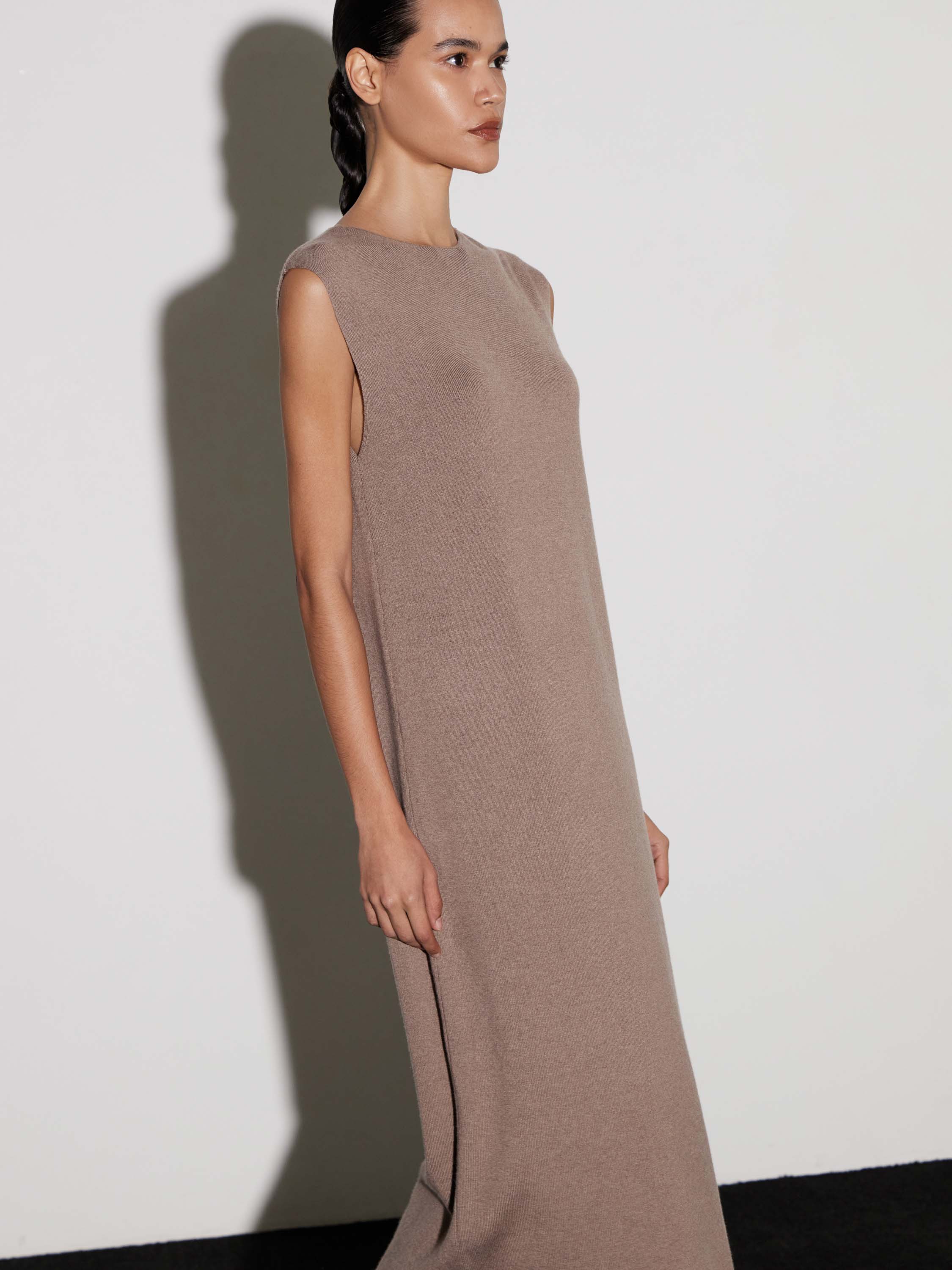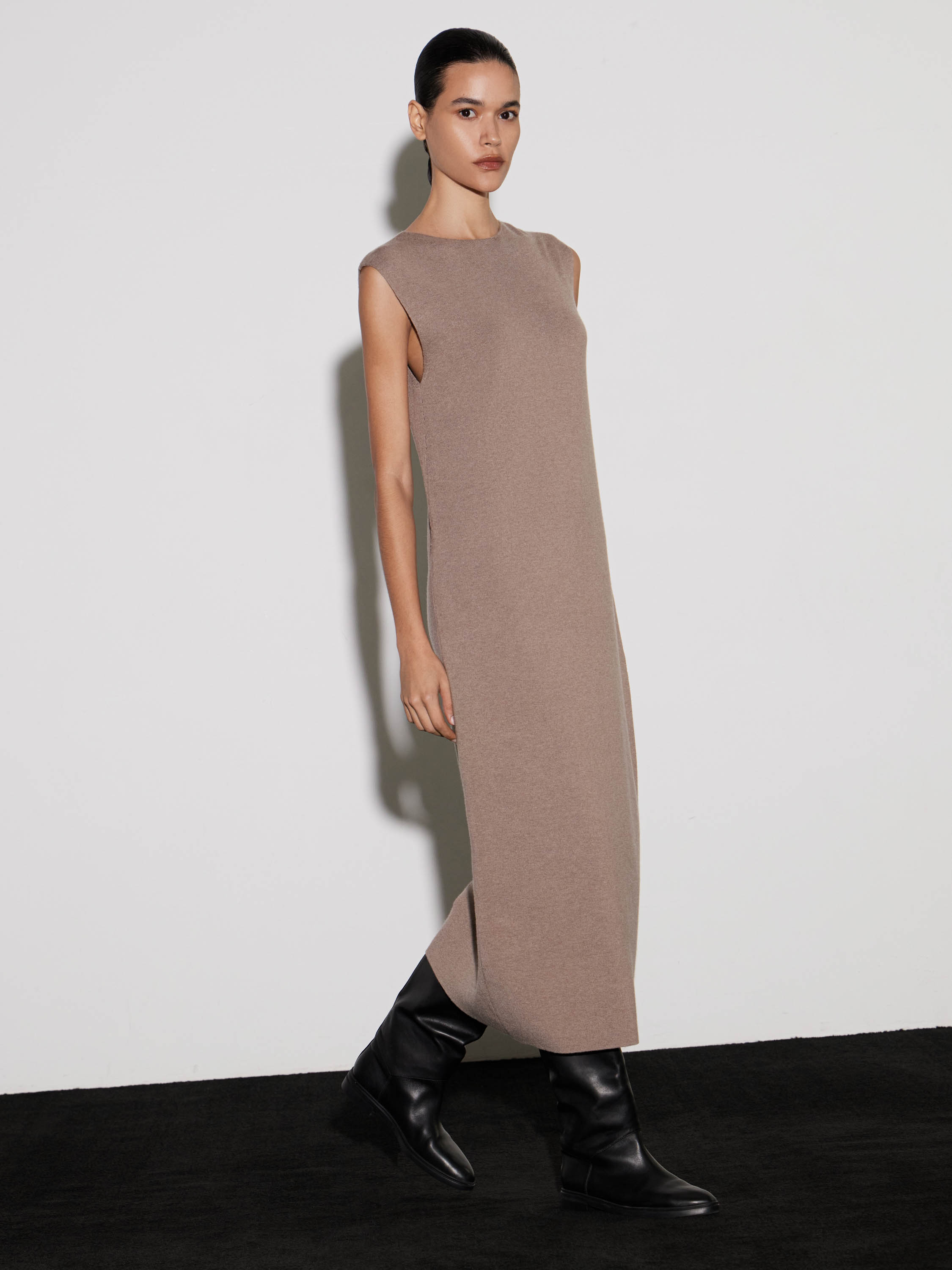 Платье миди длины из мягкого смесового трикотажа с добавлением кашемира и шерсти. Чистый прямой силуэт без рукавов создает вытянутую вертикаль и подчеркивает минимализм формы. Полотно пластично драпируется и приятно ощущается на коже, сохраняя тепло и комфорт. Лаконичная отделка и отсутствие лишних деталей делают модель универсальной: платье можно носить соло или сочетать с кардиганами, жакетами и пальто, создавая цельные многослойные образы.