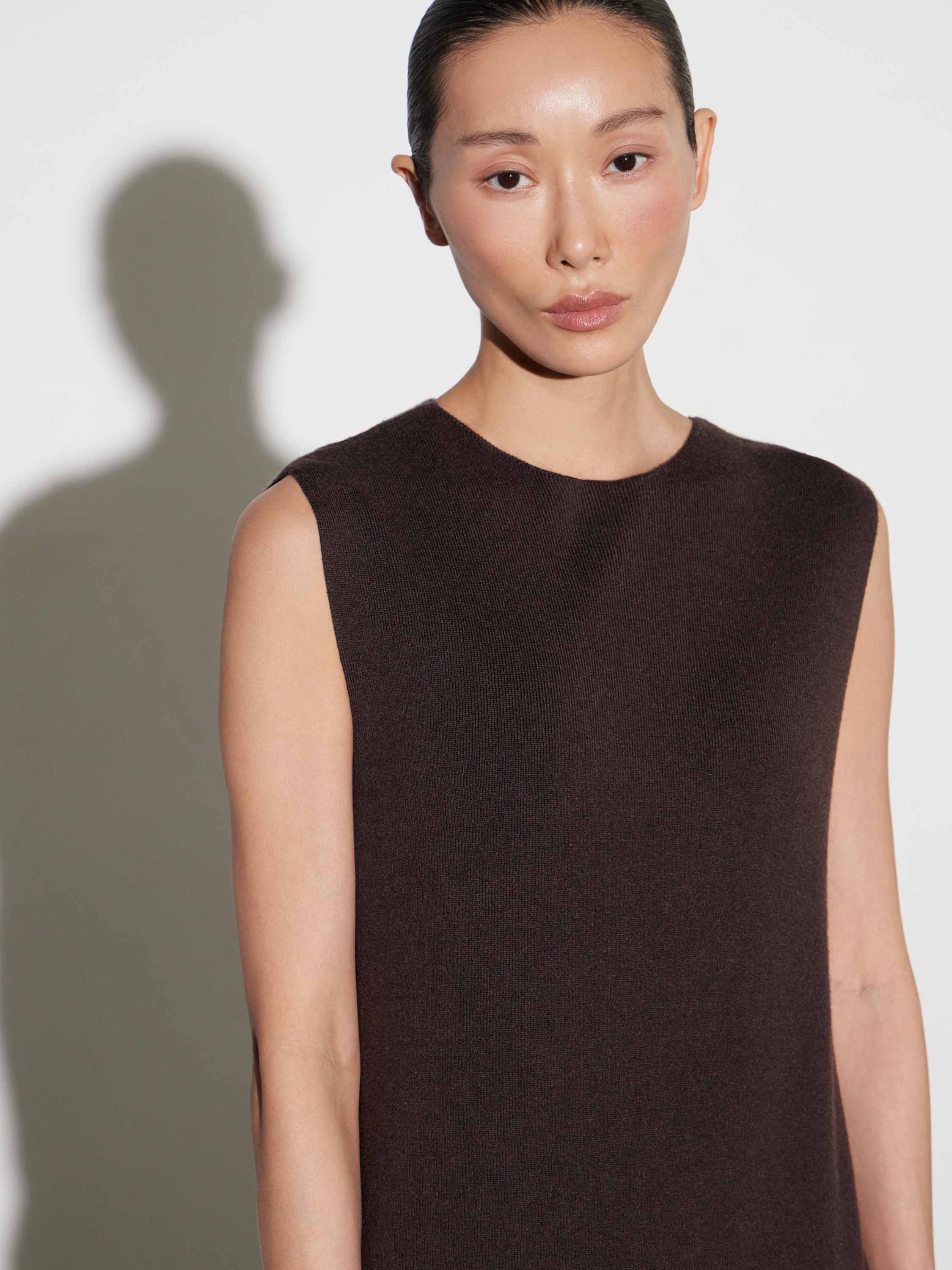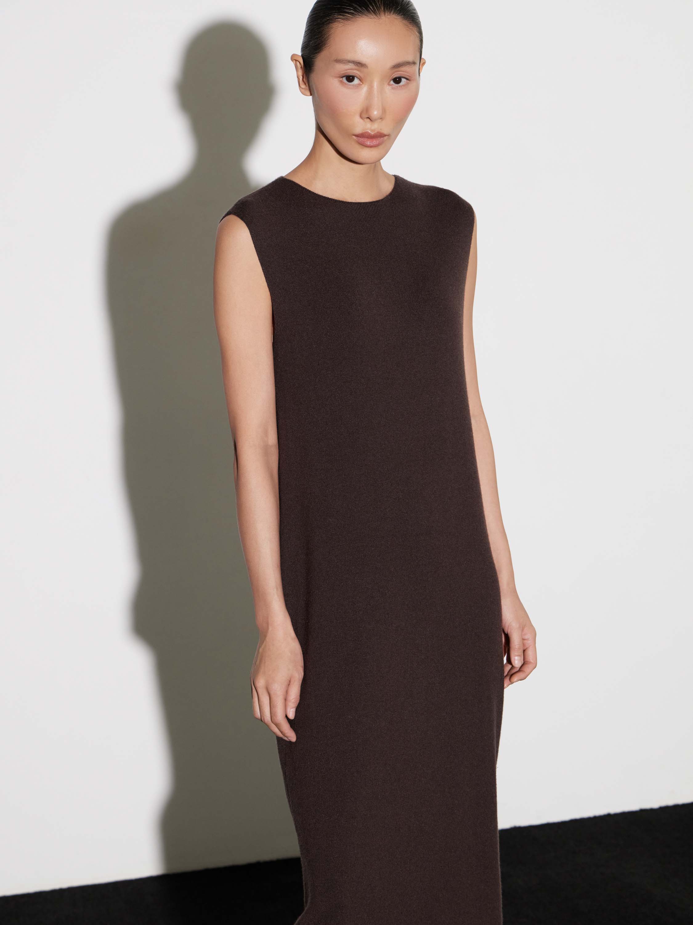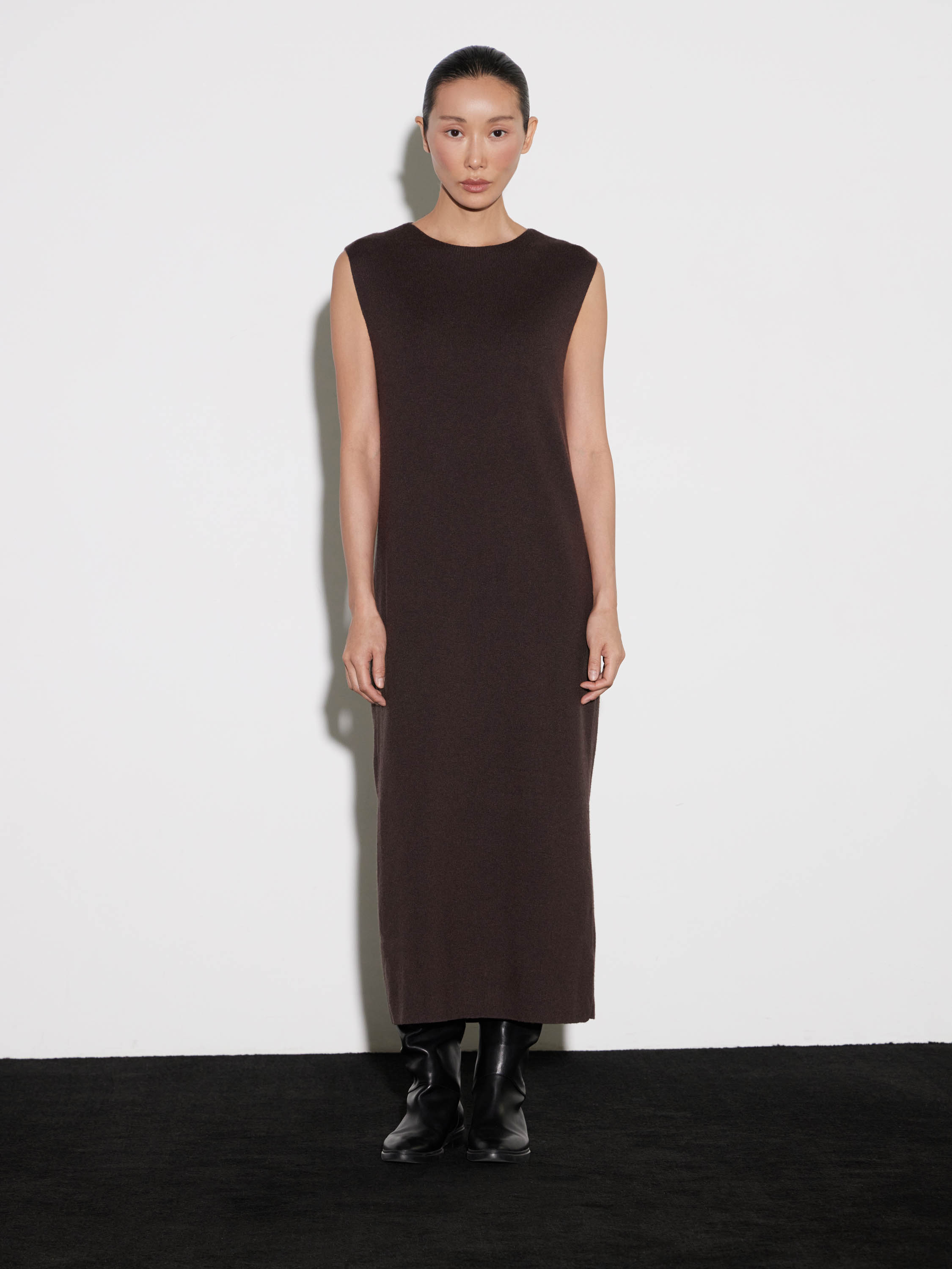Платье миди длины из мягкого смесового трикотажа с добавлением кашемира и шерсти. Чистый прямой силуэт без рукавов создает вытянутую вертикаль и подчеркивает минимализм формы. Полотно пластично драпируется и приятно ощущается на коже, сохраняя тепло и комфорт. Лаконичная отделка и отсутствие лишних деталей делают модель универсальной: платье можно носить соло или сочетать с кардиганами, жакетами и пальто, создавая цельные многослойные образы.