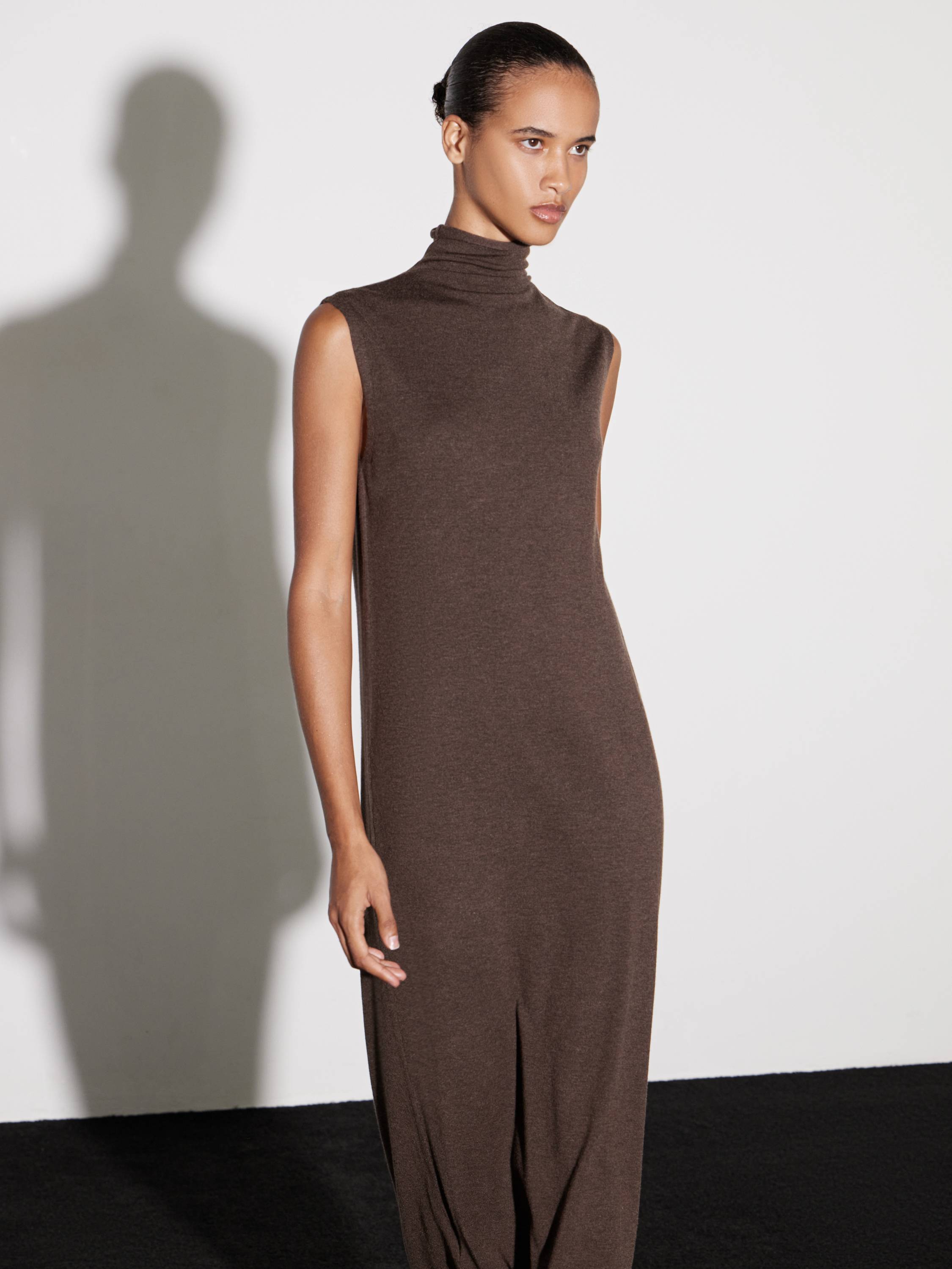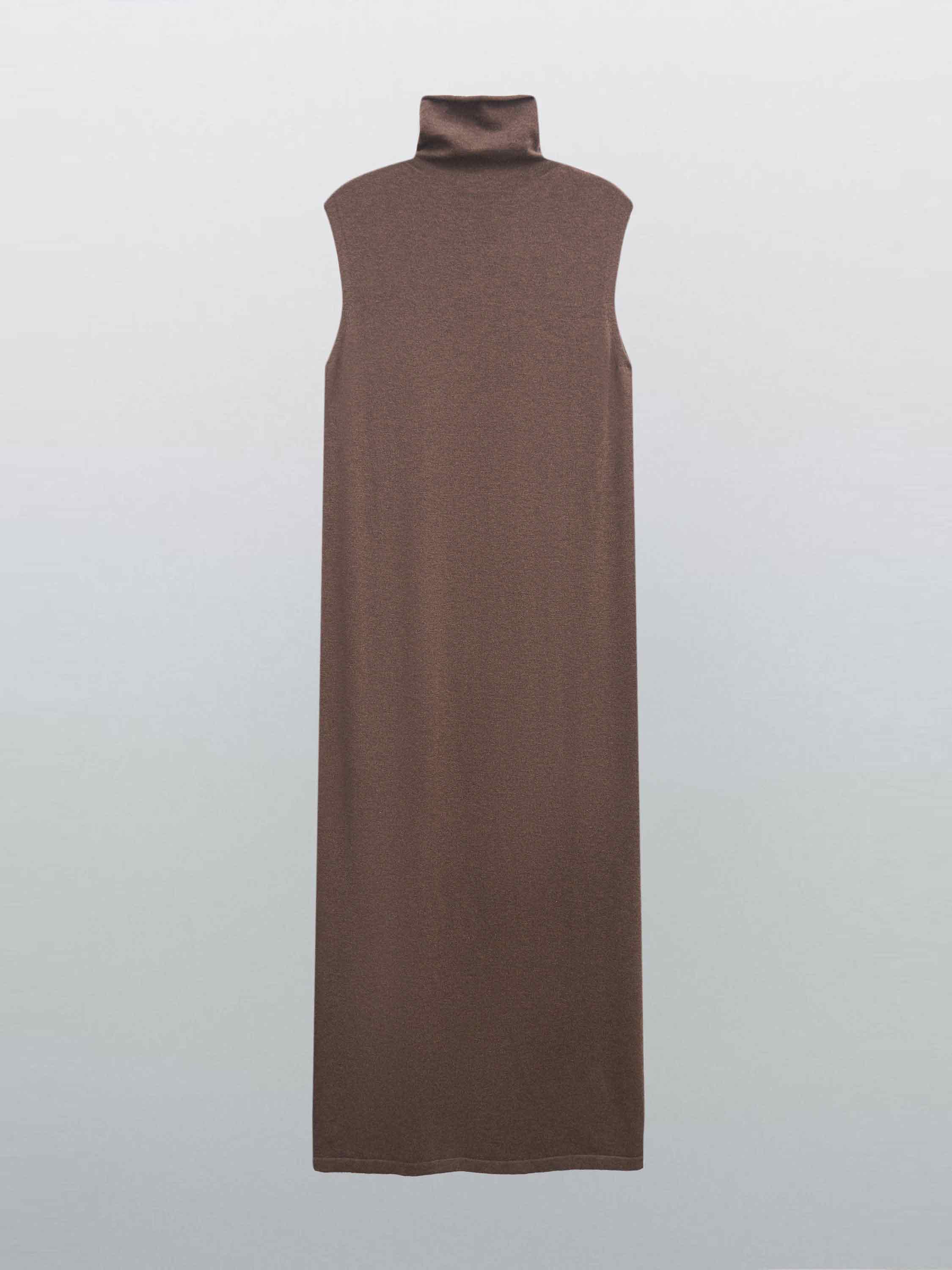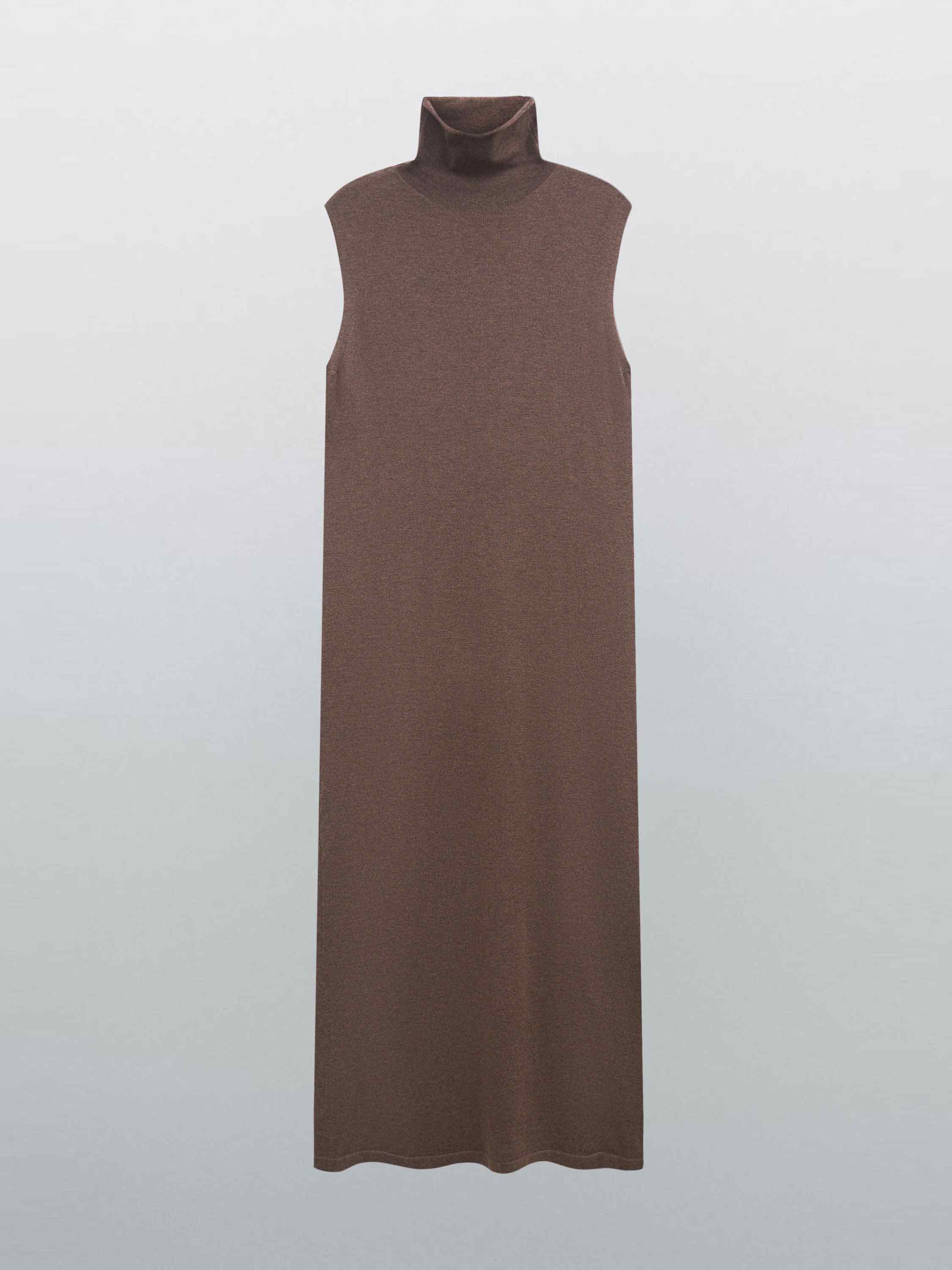 Платье миди без рукавов из мягкого трикотажа на основе шерсти мериноса. Материал легкий, эластичный, с гладкой поверхностью и комфортным прилеганием к телу. Крой прямой, с высоким воротником-гольф, который мягко держит форму и добавляет образу графичности. Проймы аккуратно обработаны, низ — с ровным подгибом. Универсальная длина макси и лаконичный силуэт позволяют носить платье как самостоятельный элемент или в многослойных комплектах с жакетами, кардиганами и пальто. Сдержанный глубокий оттенок подчеркивает минималистичный характер модели.