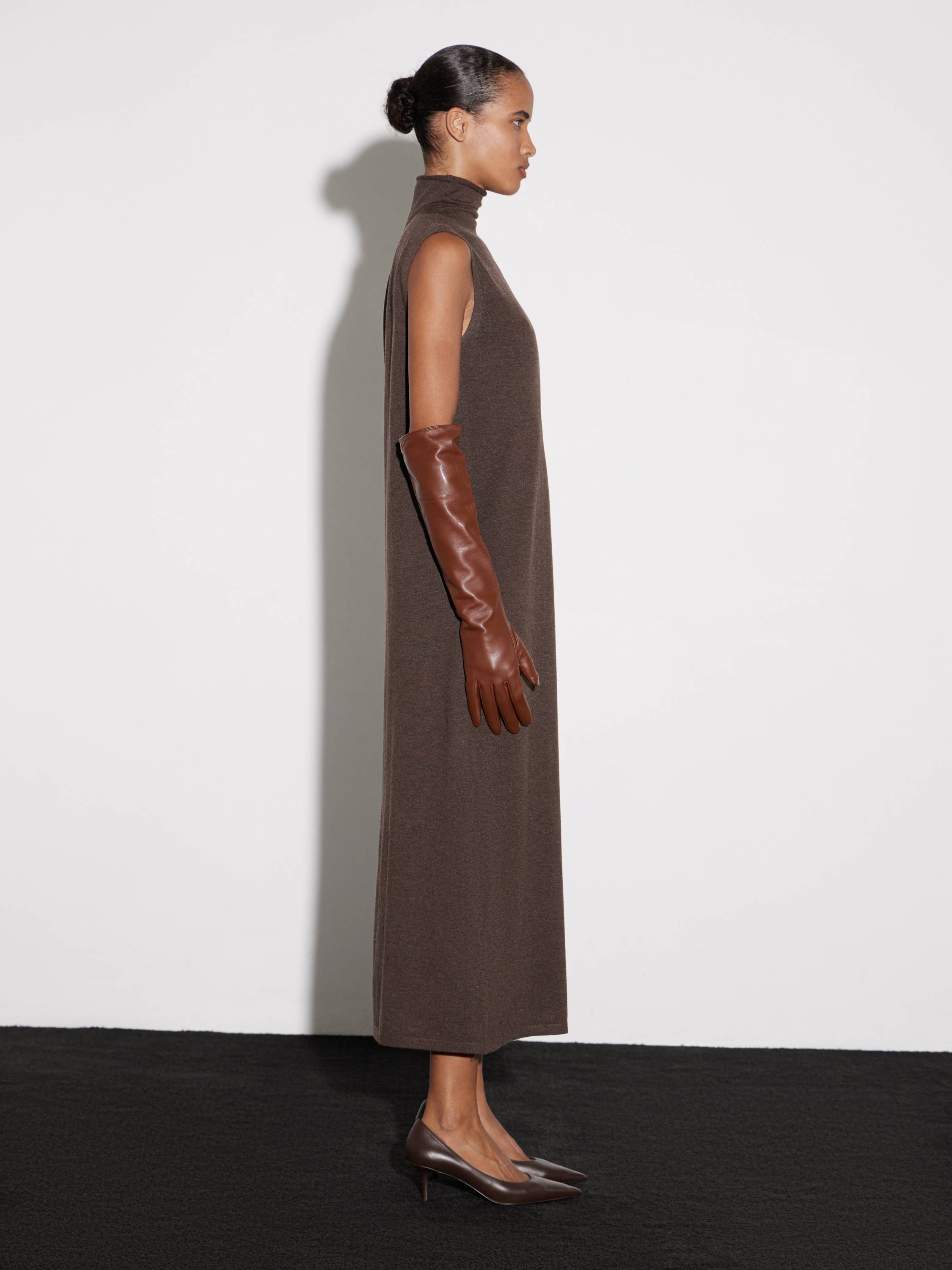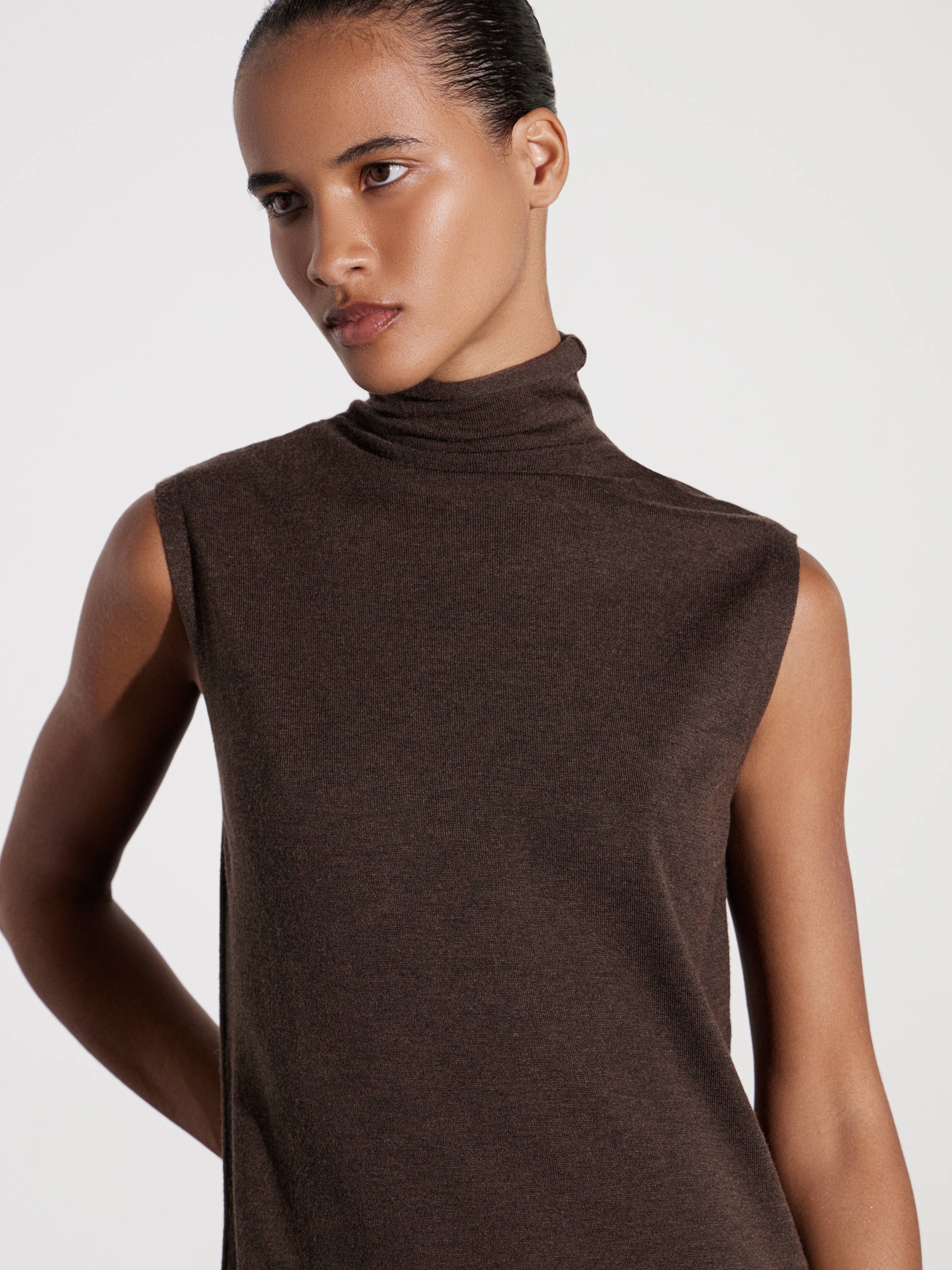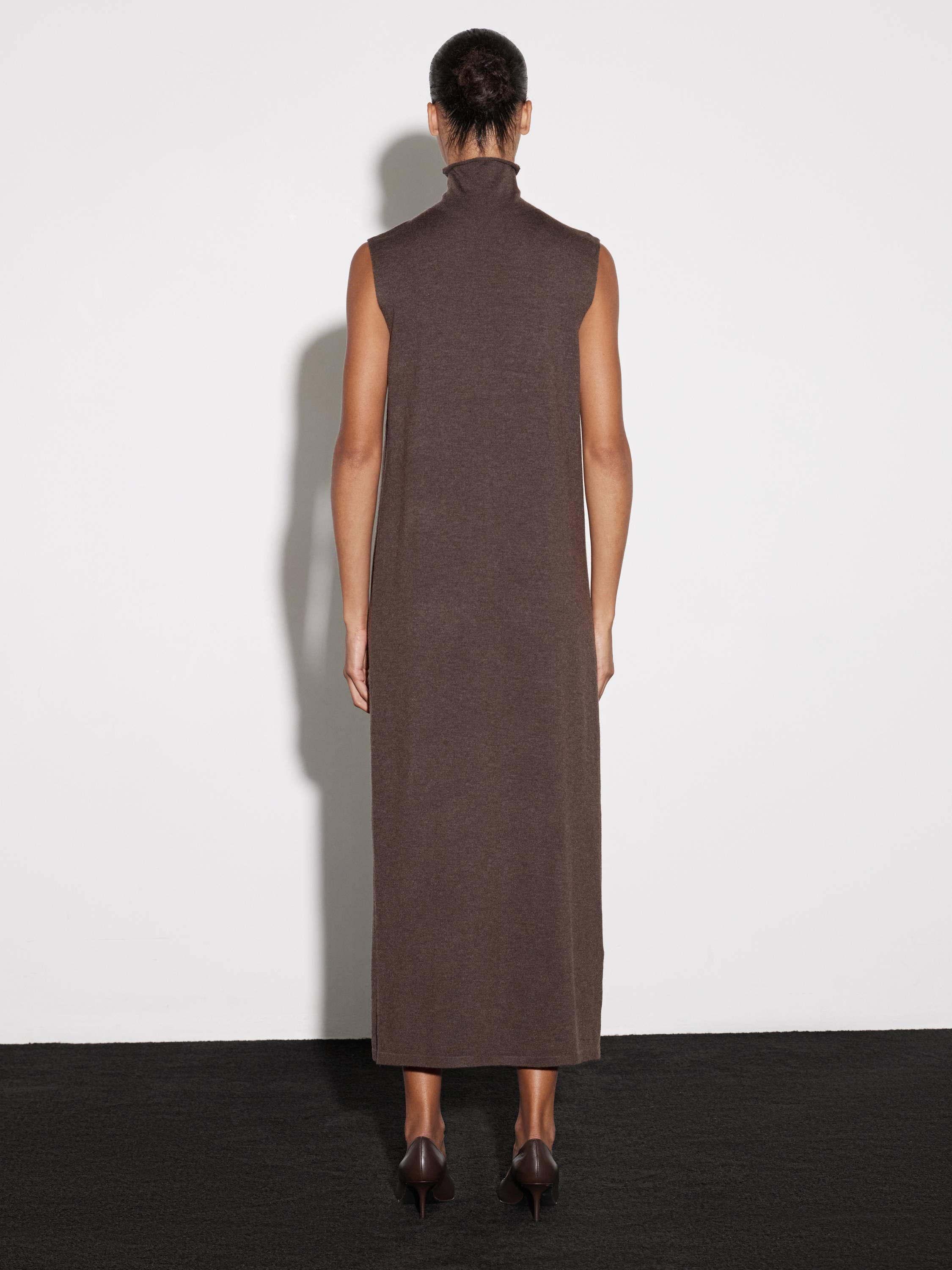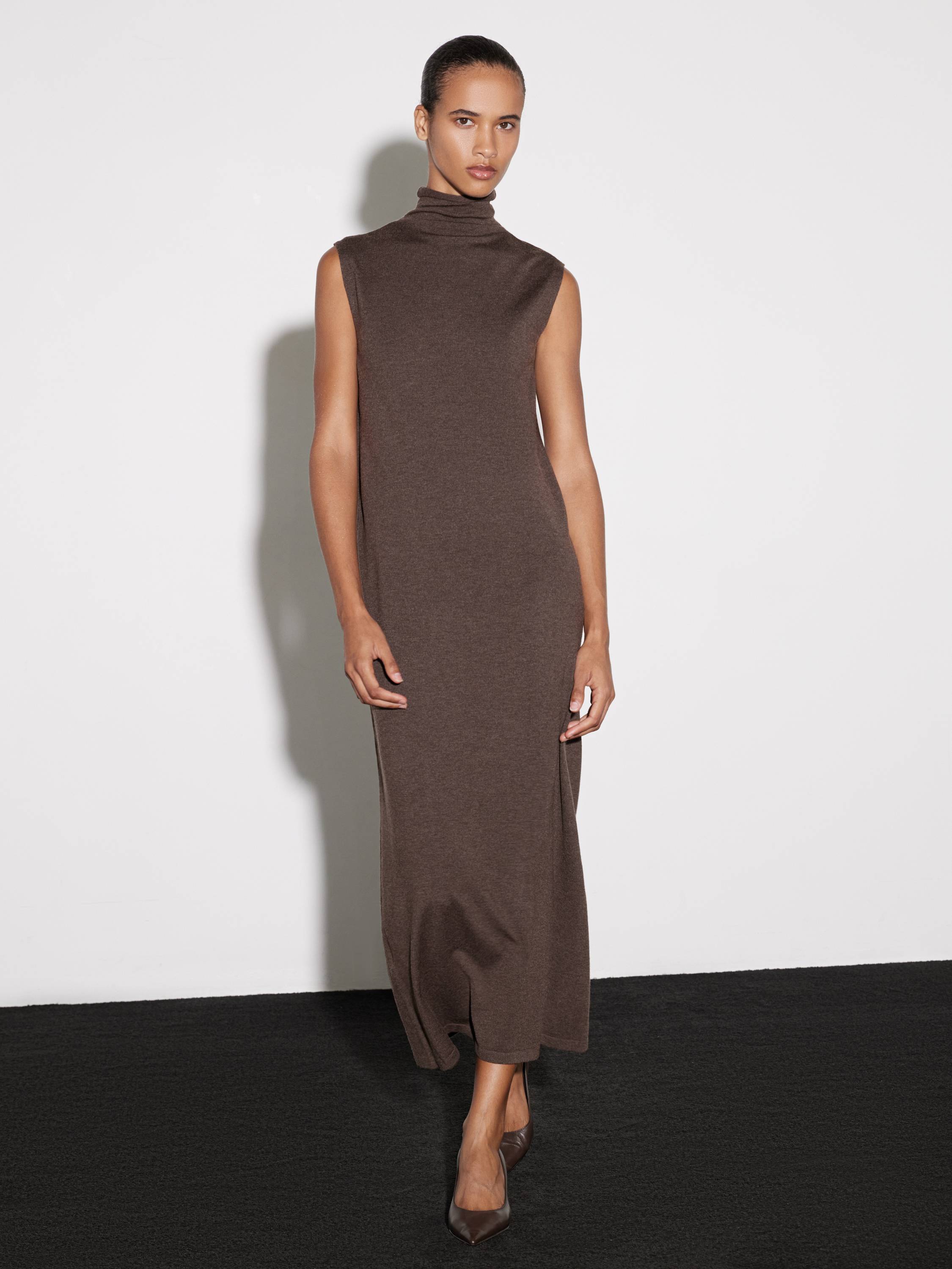 Платье миди без рукавов из мягкого трикотажа на основе шерсти мериноса. Материал легкий, эластичный, с гладкой поверхностью и комфортным прилеганием к телу. Крой прямой, с высоким воротником-гольф, который мягко держит форму и добавляет образу графичности. Проймы аккуратно обработаны, низ — с ровным подгибом. Универсальная длина макси и лаконичный силуэт позволяют носить платье как самостоятельный элемент или в многослойных комплектах с жакетами, кардиганами и пальто. Сдержанный глубокий оттенок подчеркивает минималистичный характер модели.
